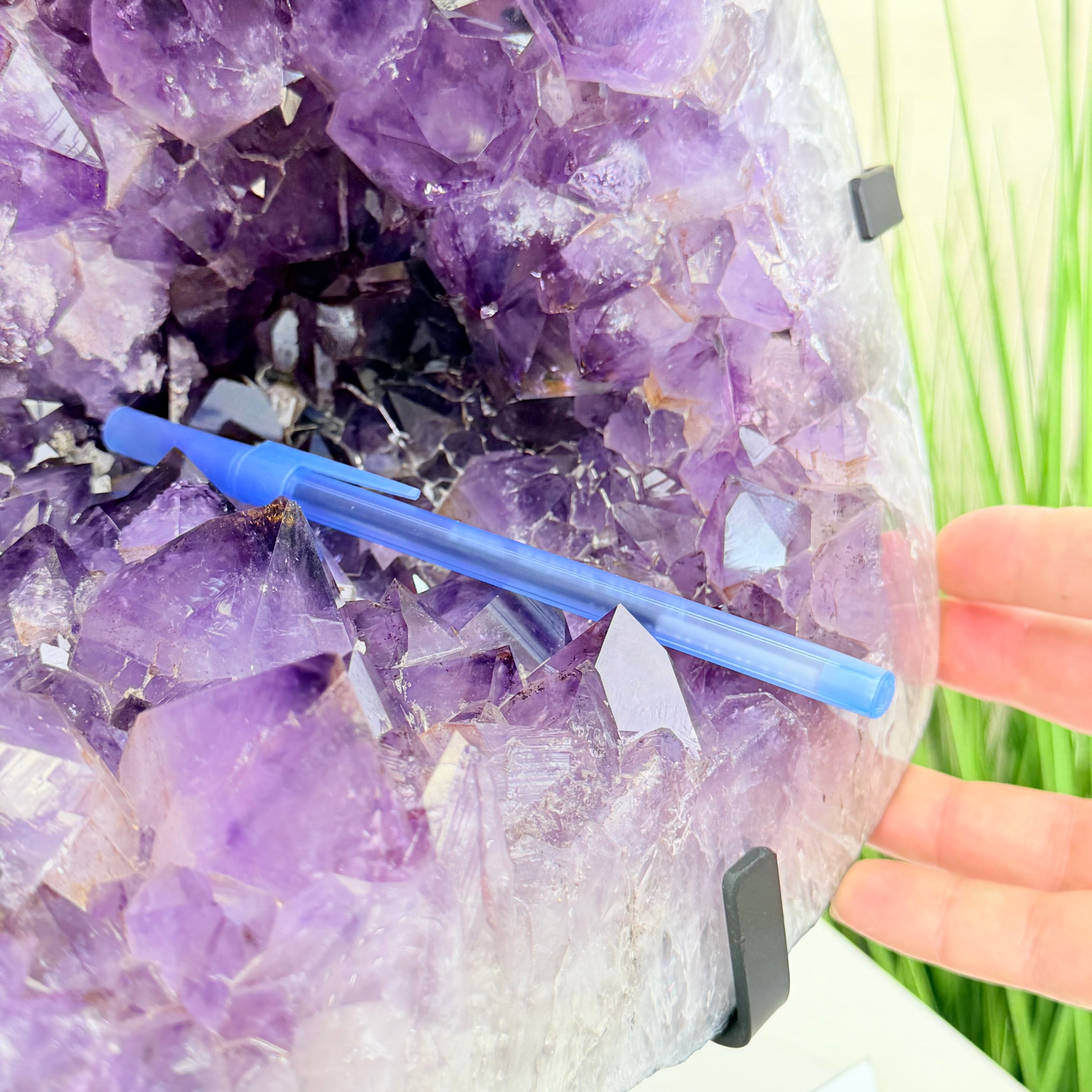 Most clusters are mounted on black metal stands but many have a flat bottom to sit directly on your desk or shelf.