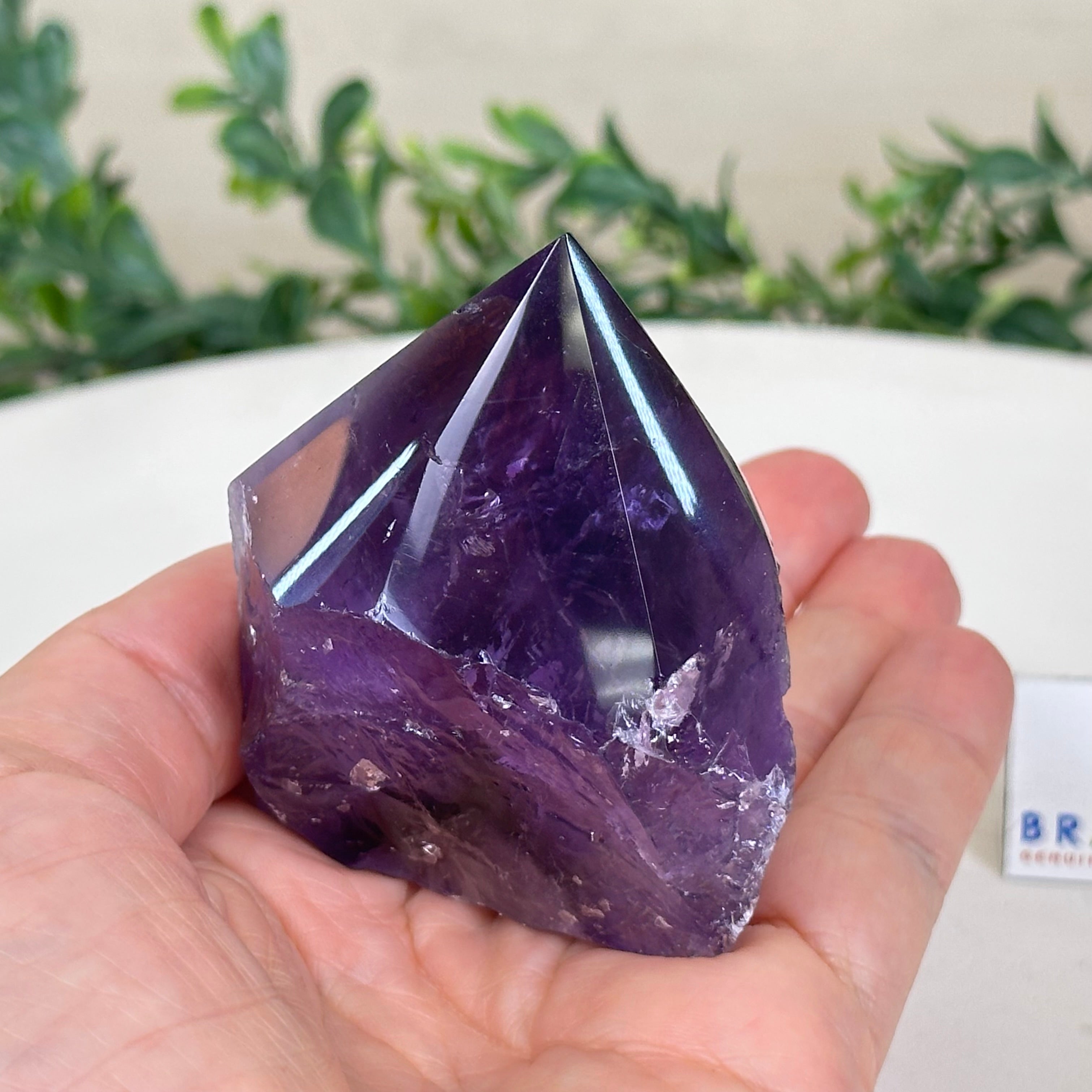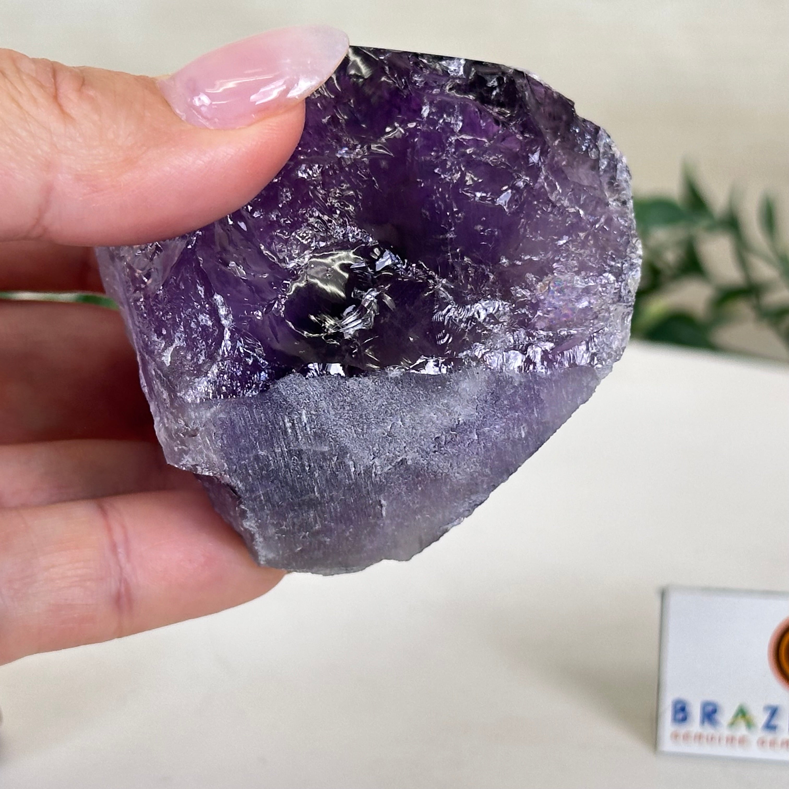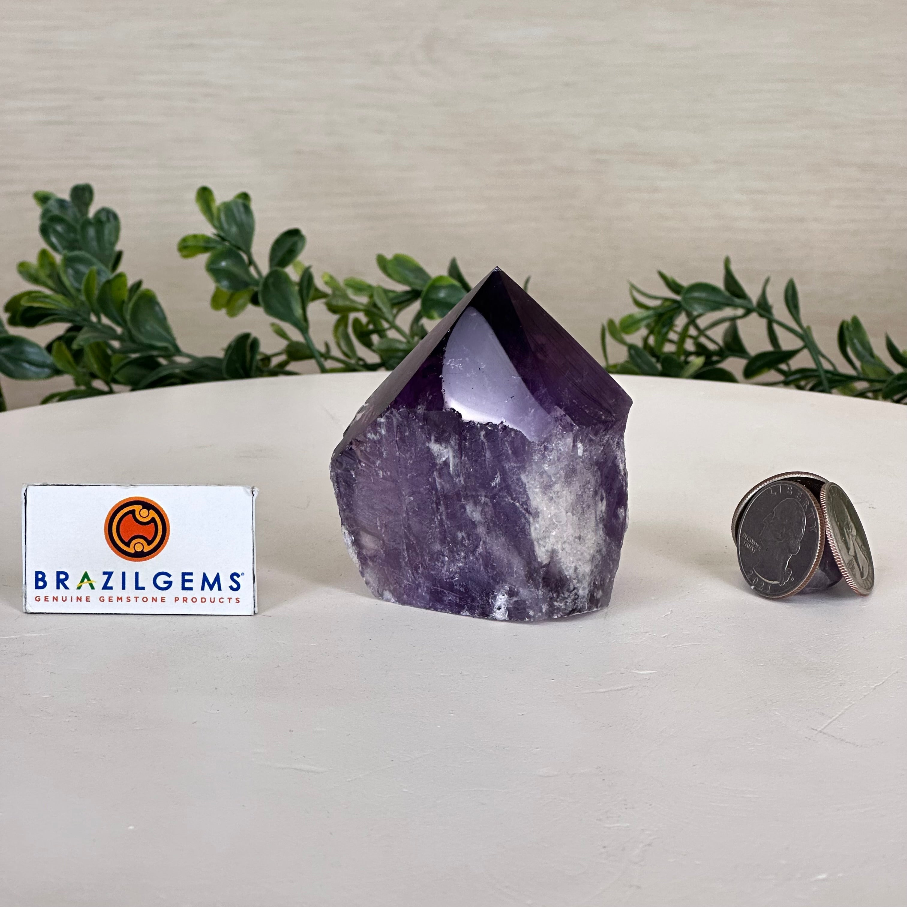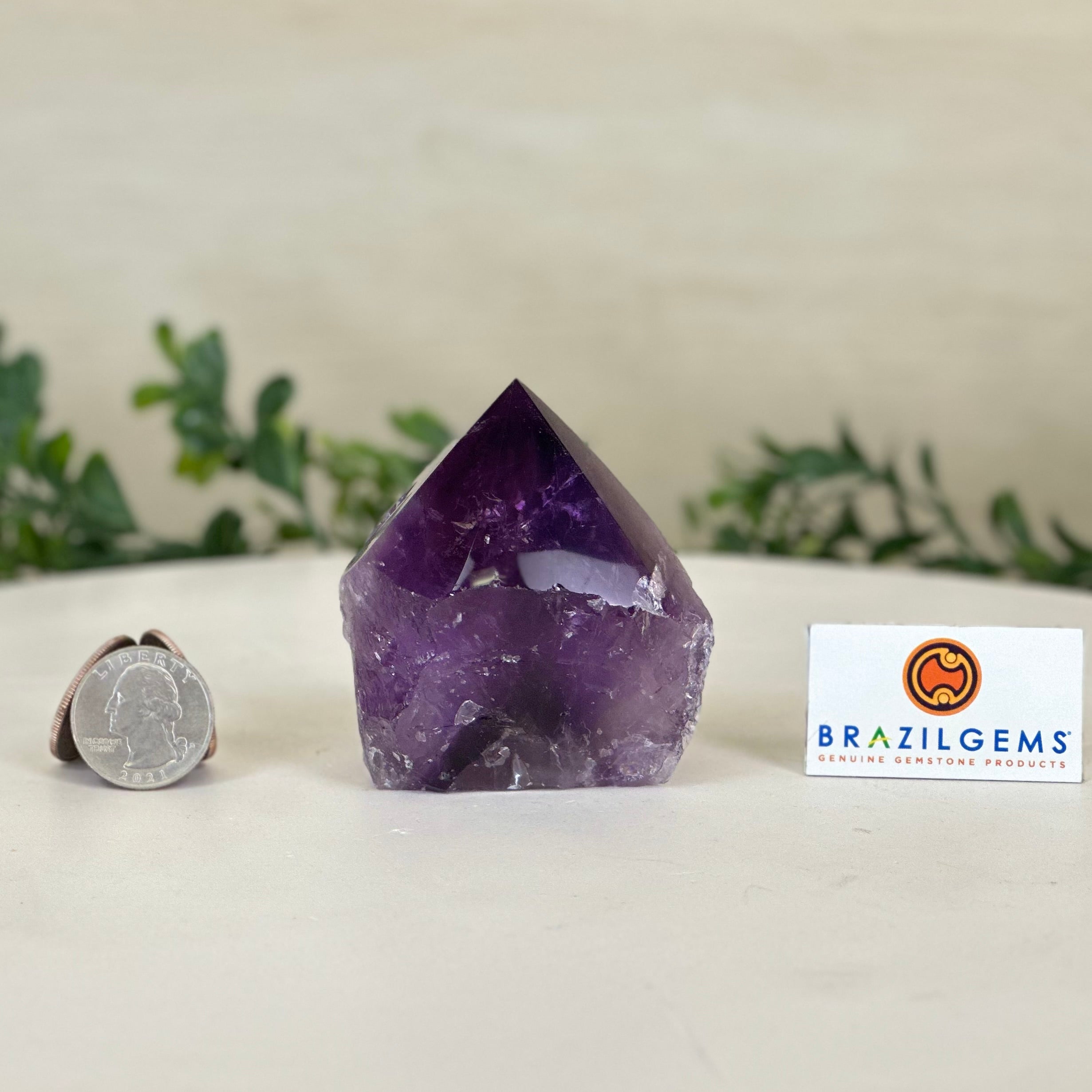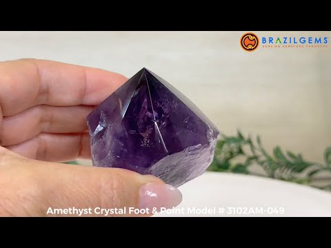 Elevate your spiritual rituals with Brazil Gems' Super Quality Polished Amethyst Crystal Foot & Point. Featuring deep purple tones, this exquisite crystal exudes incredible energy and exquisite artistry. Whether used in meditation or healing, it is a must-have for the refined crystal connoisseur. With its polished point, flat base, and raw side edges, this piece has a tactile and visual appeal, perfect to hold or display on a tabletop.
