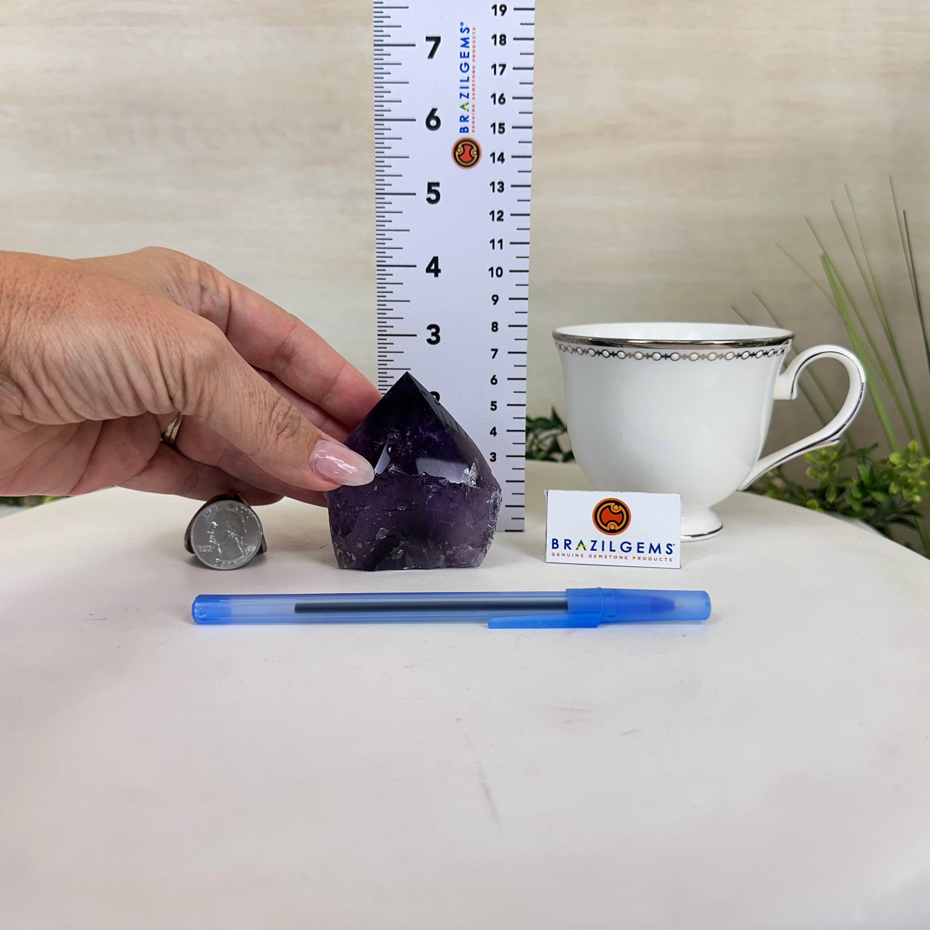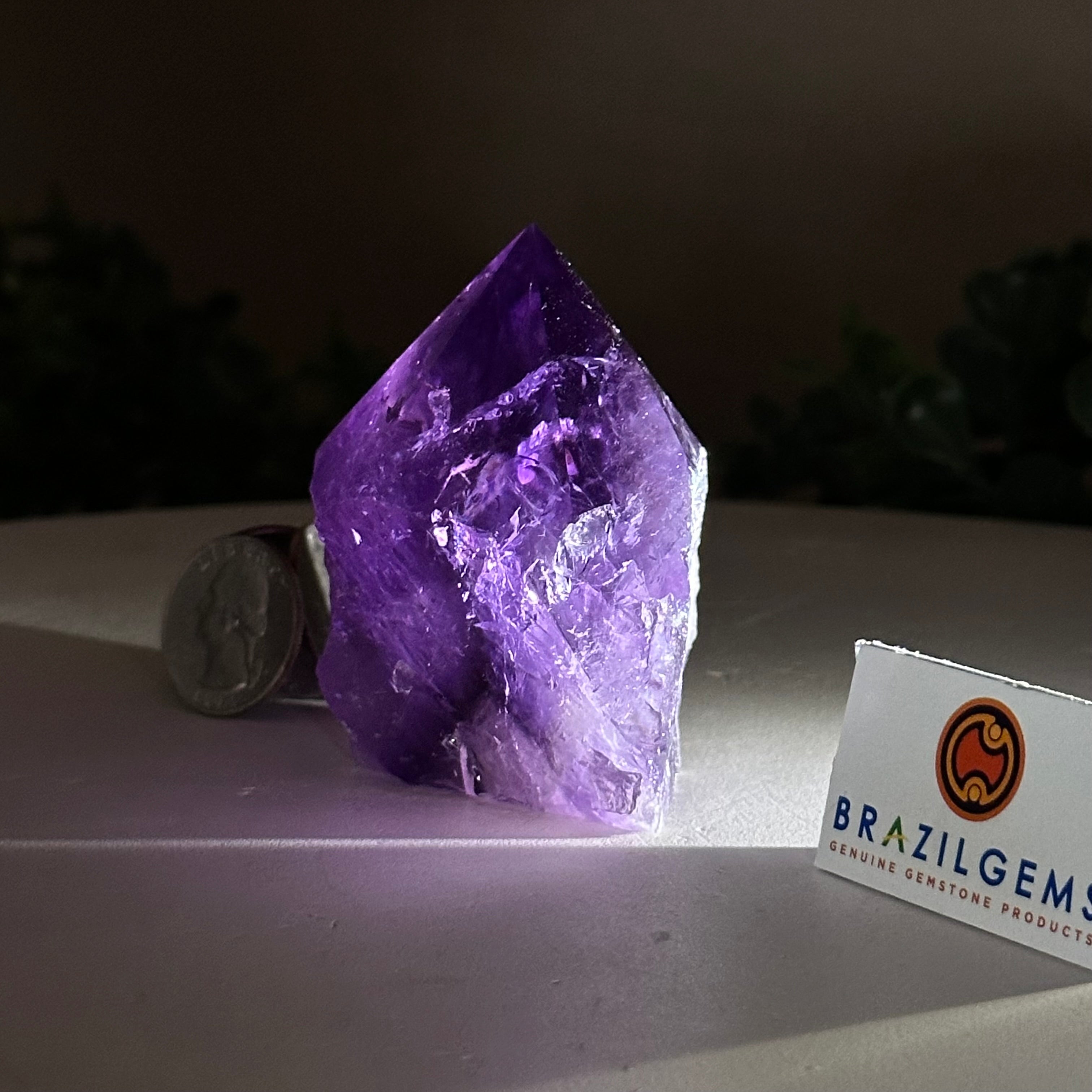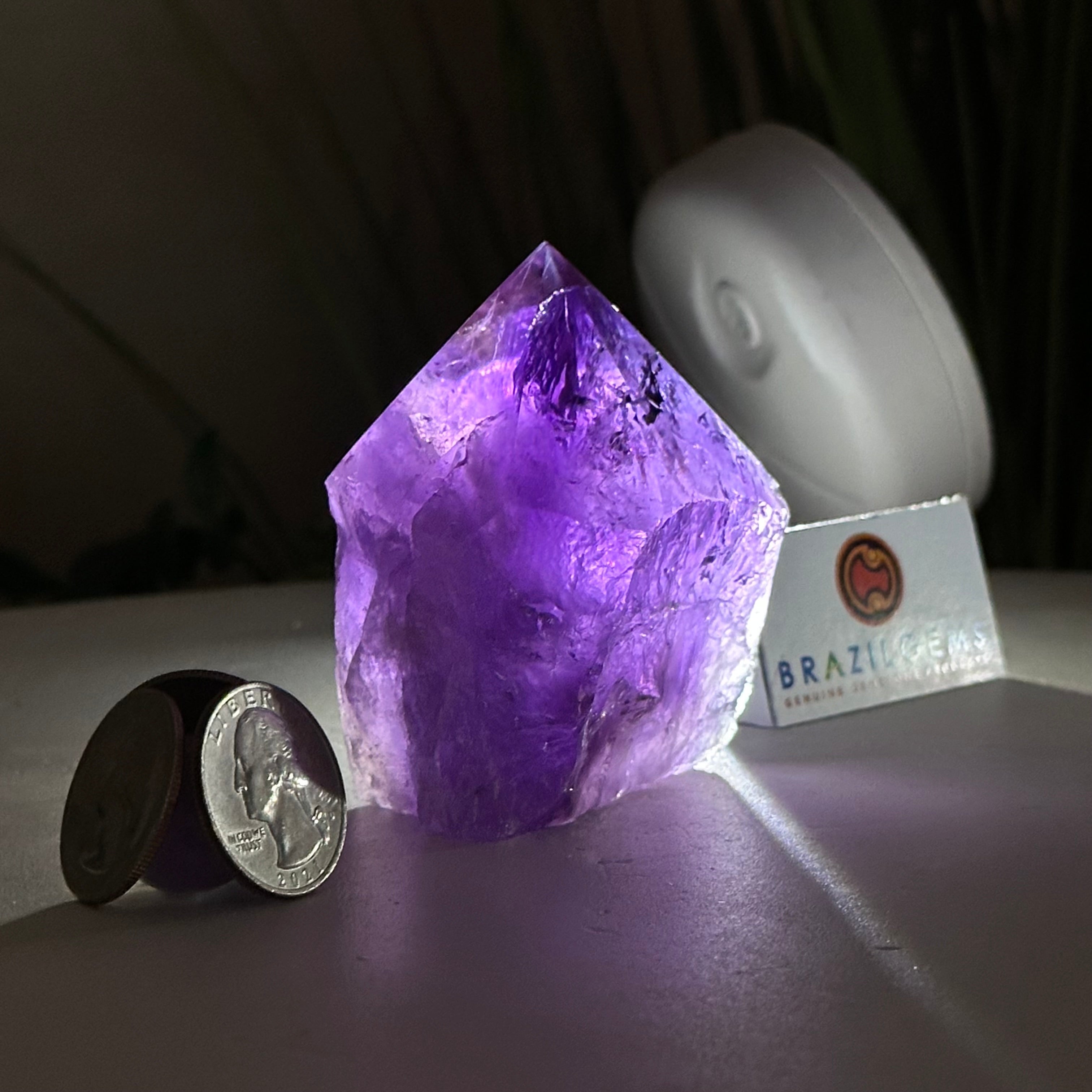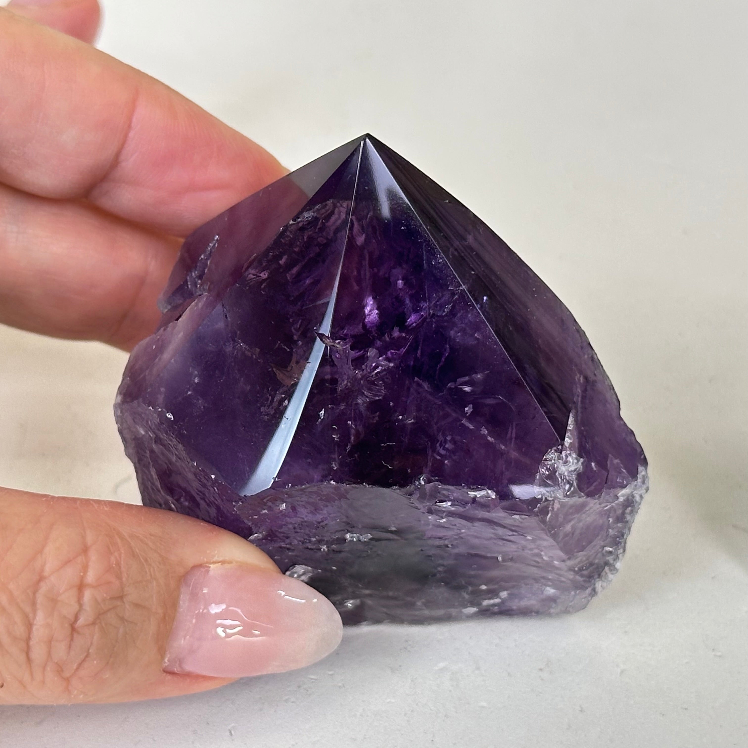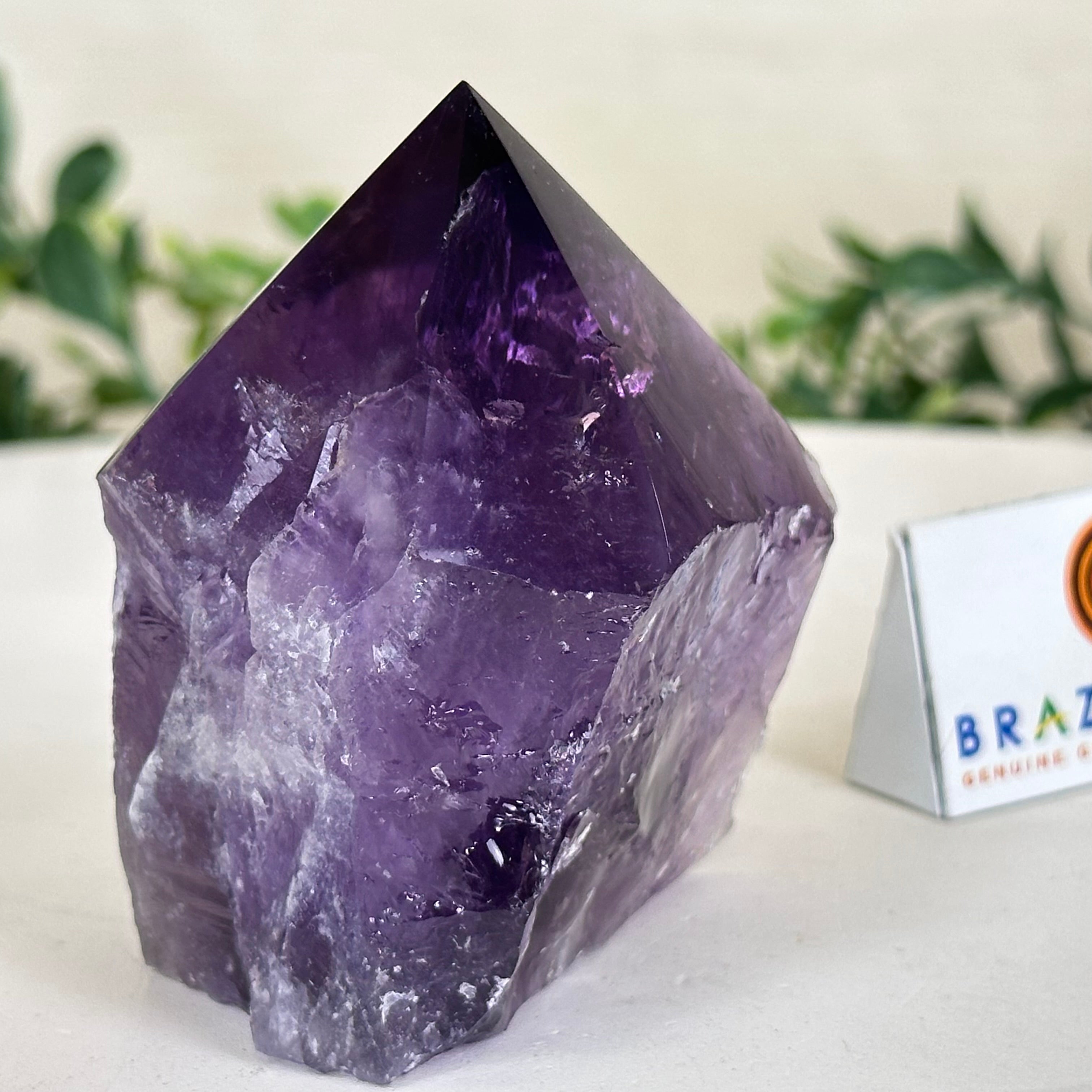 Elevate your spiritual rituals with Brazil Gems' Super Quality Polished Amethyst Crystal Foot & Point. Featuring deep purple tones, this exquisite crystal exudes incredible energy and exquisite artistry. Whether used in meditation or healing, it is a must-have for the refined crystal connoisseur. With its polished point, flat base, and raw side edges, this piece has a tactile and visual appeal, perfect to hold or display on a tabletop.
