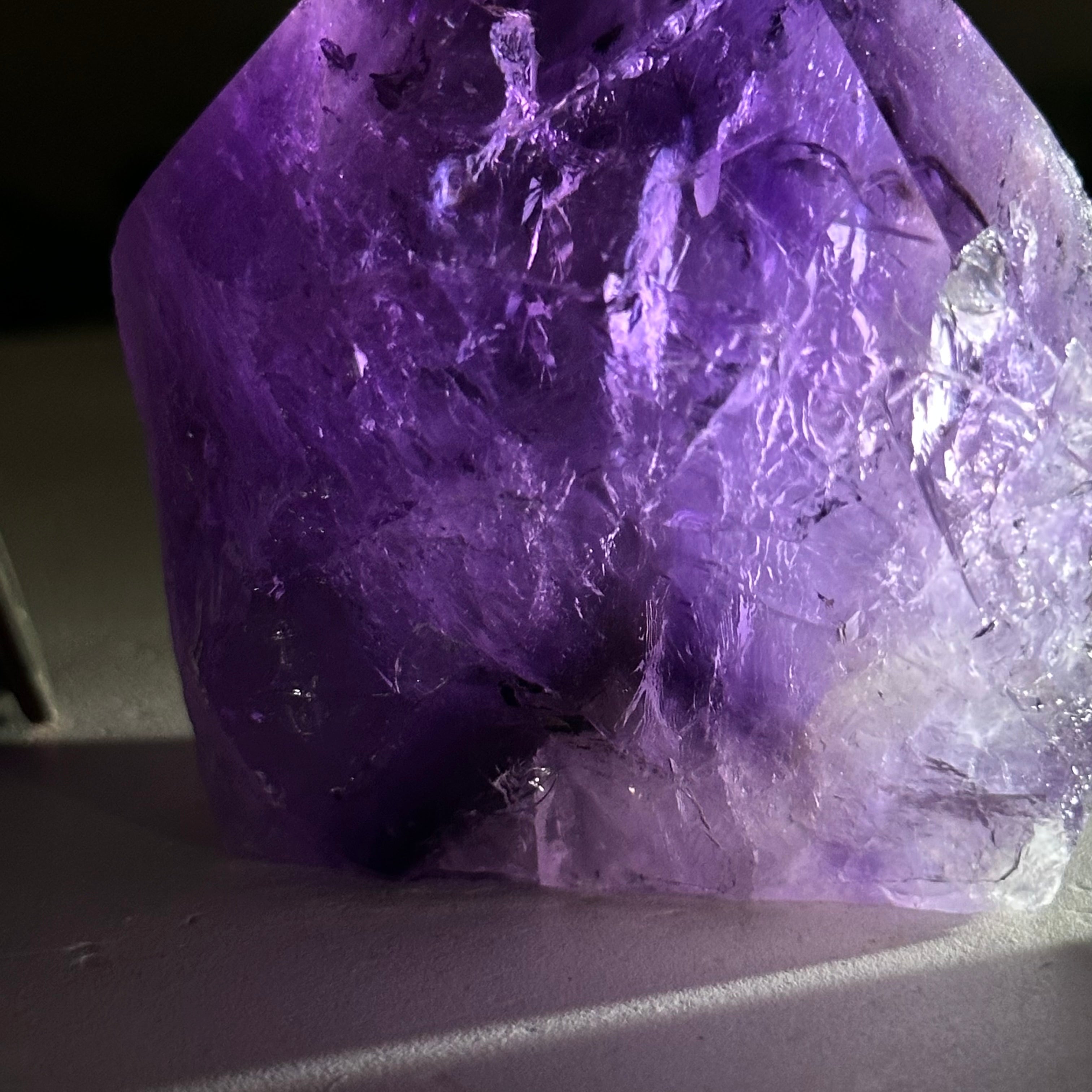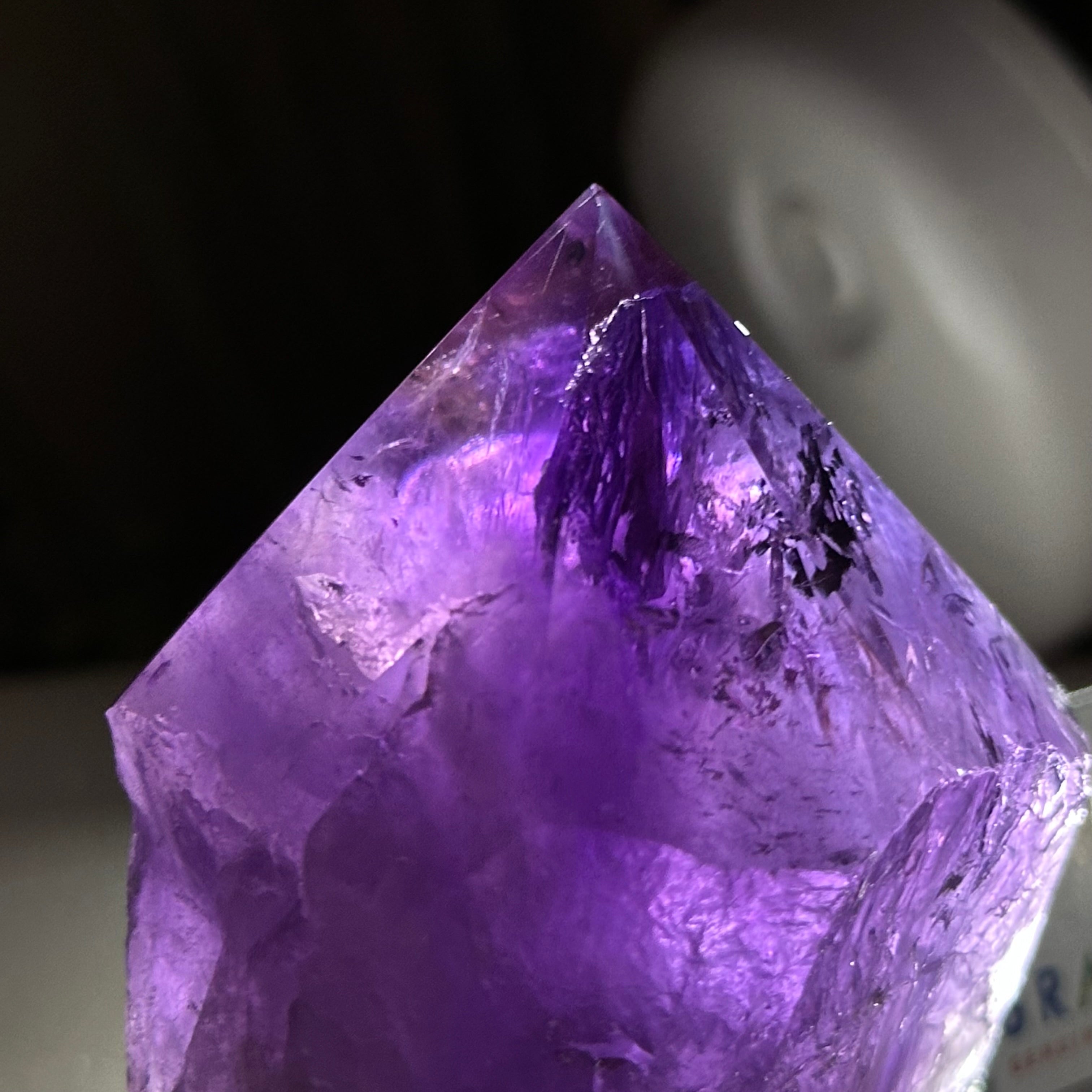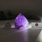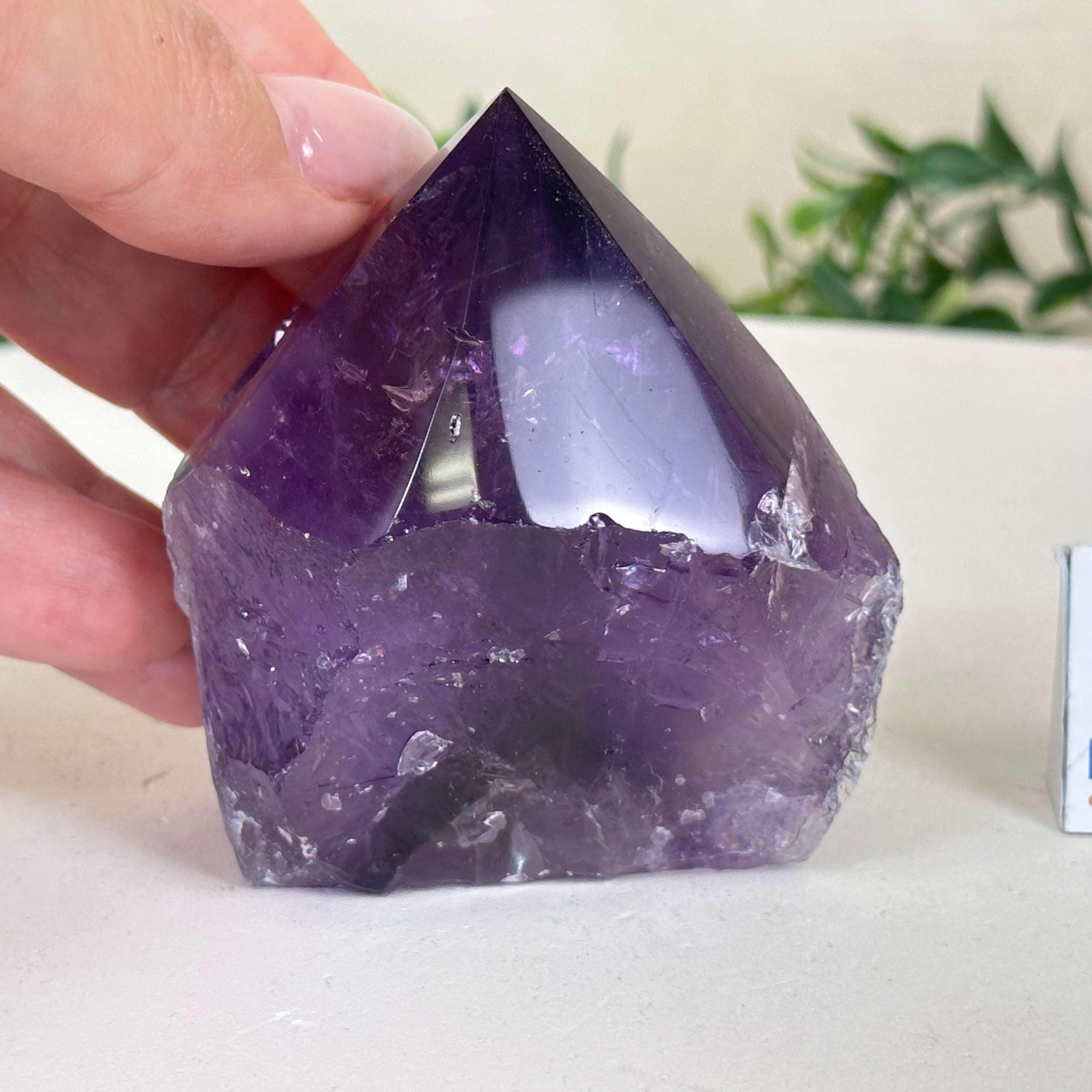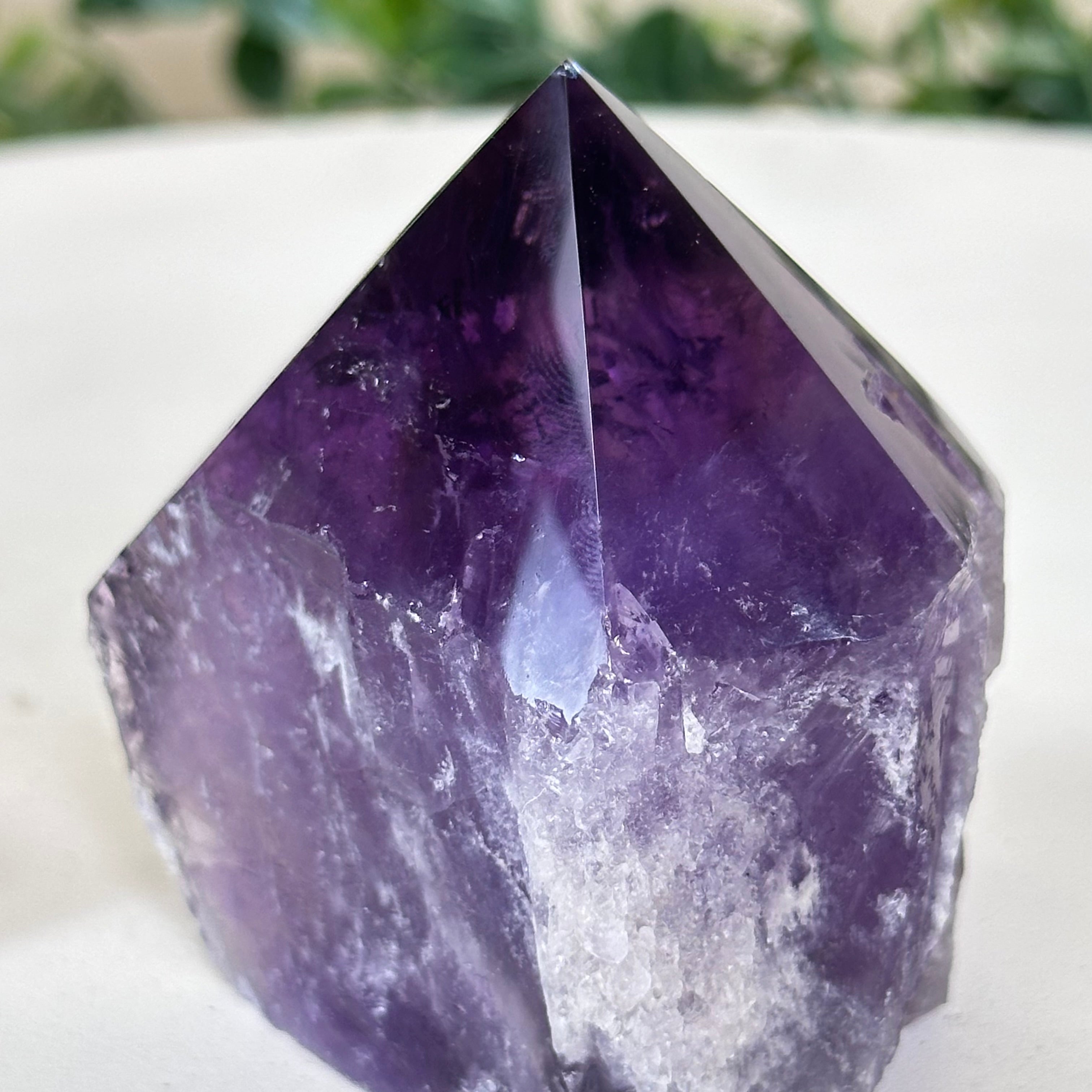 Elevate your spiritual rituals with Brazil Gems' Super Quality Polished Amethyst Crystal Foot & Point. Featuring deep purple tones, this exquisite crystal exudes incredible energy and exquisite artistry. Whether used in meditation or healing, it is a must-have for the refined crystal connoisseur. With its polished point, flat base, and raw side edges, this piece has a tactile and visual appeal, perfect to hold or display on a tabletop.