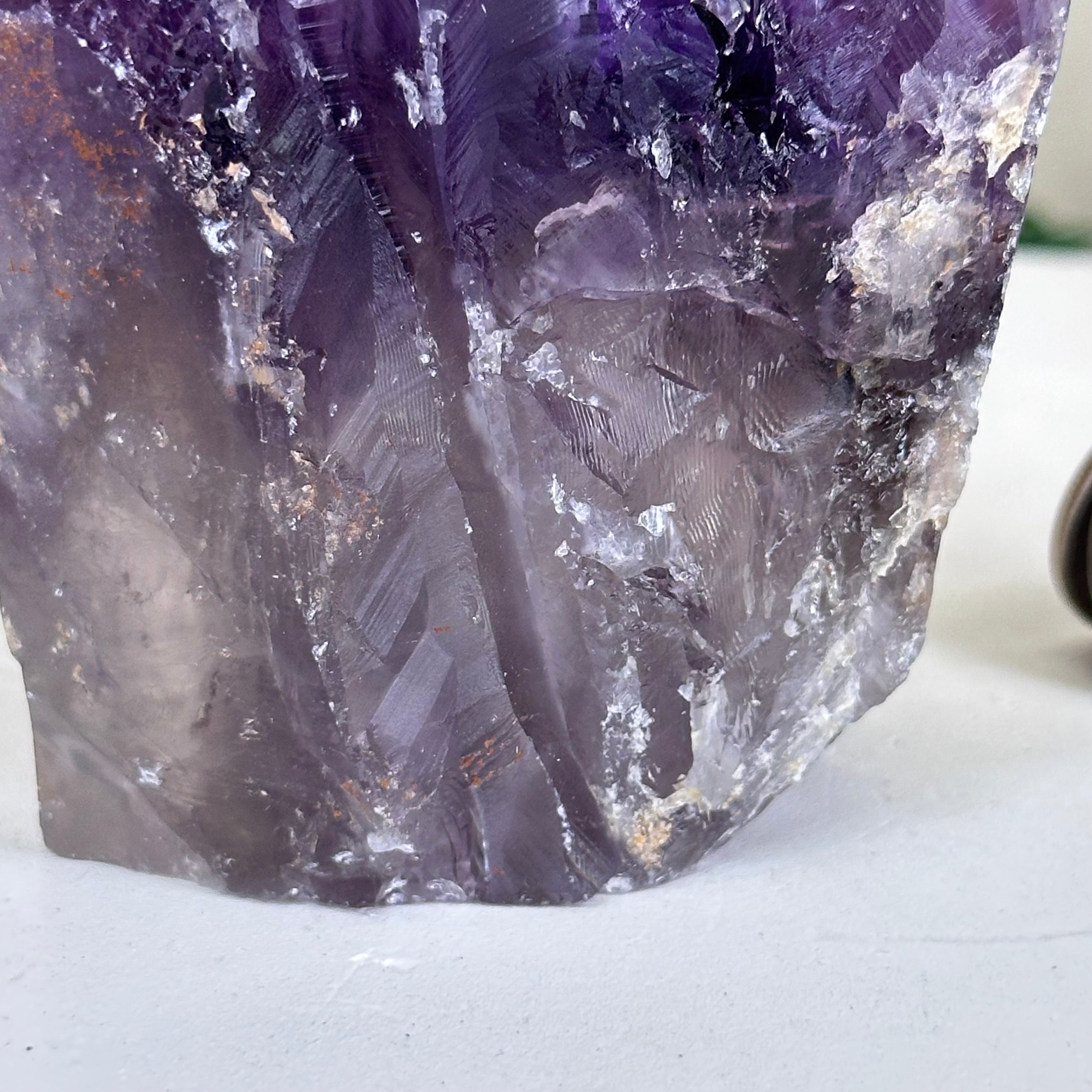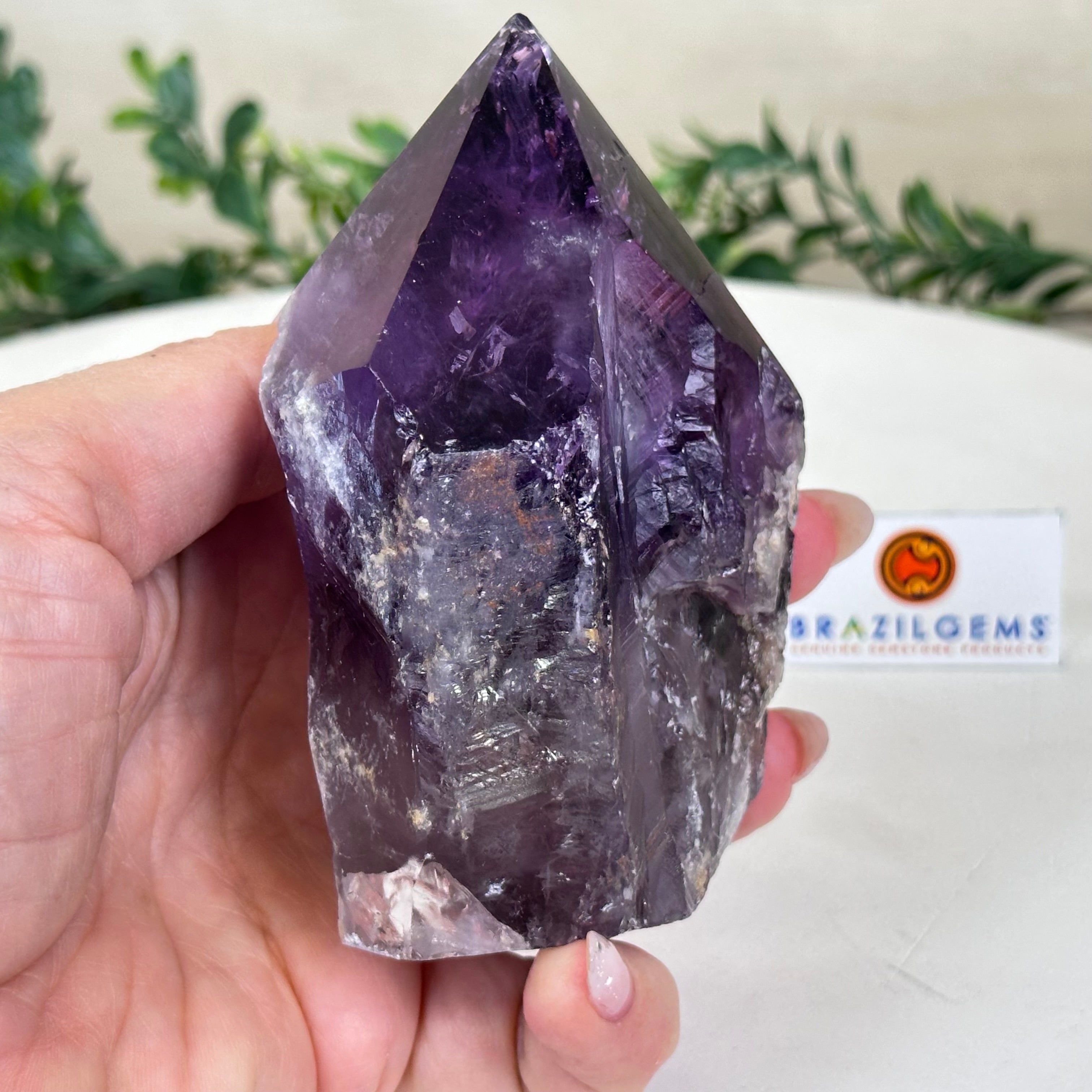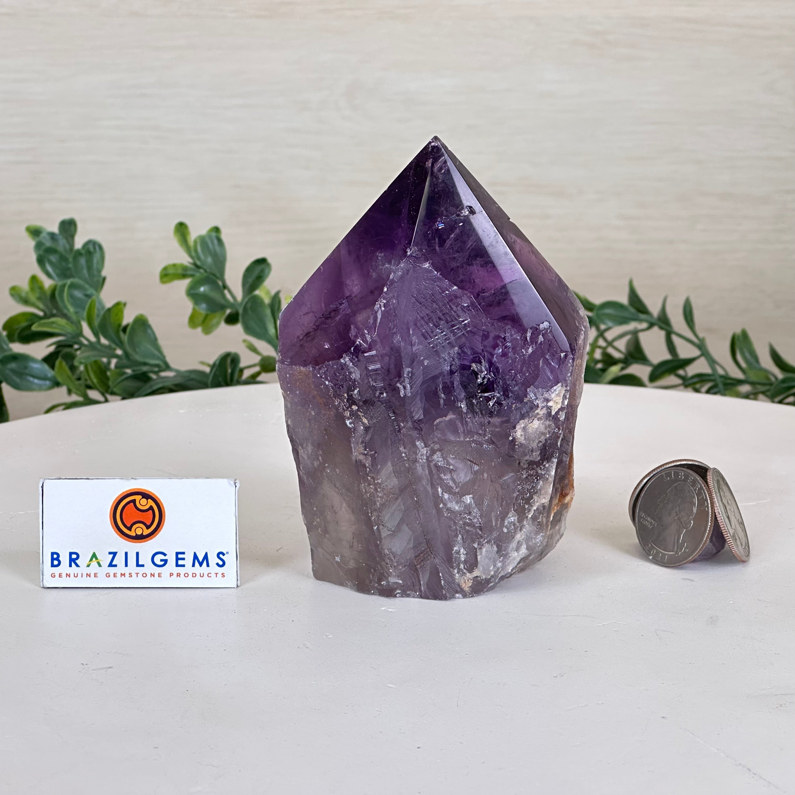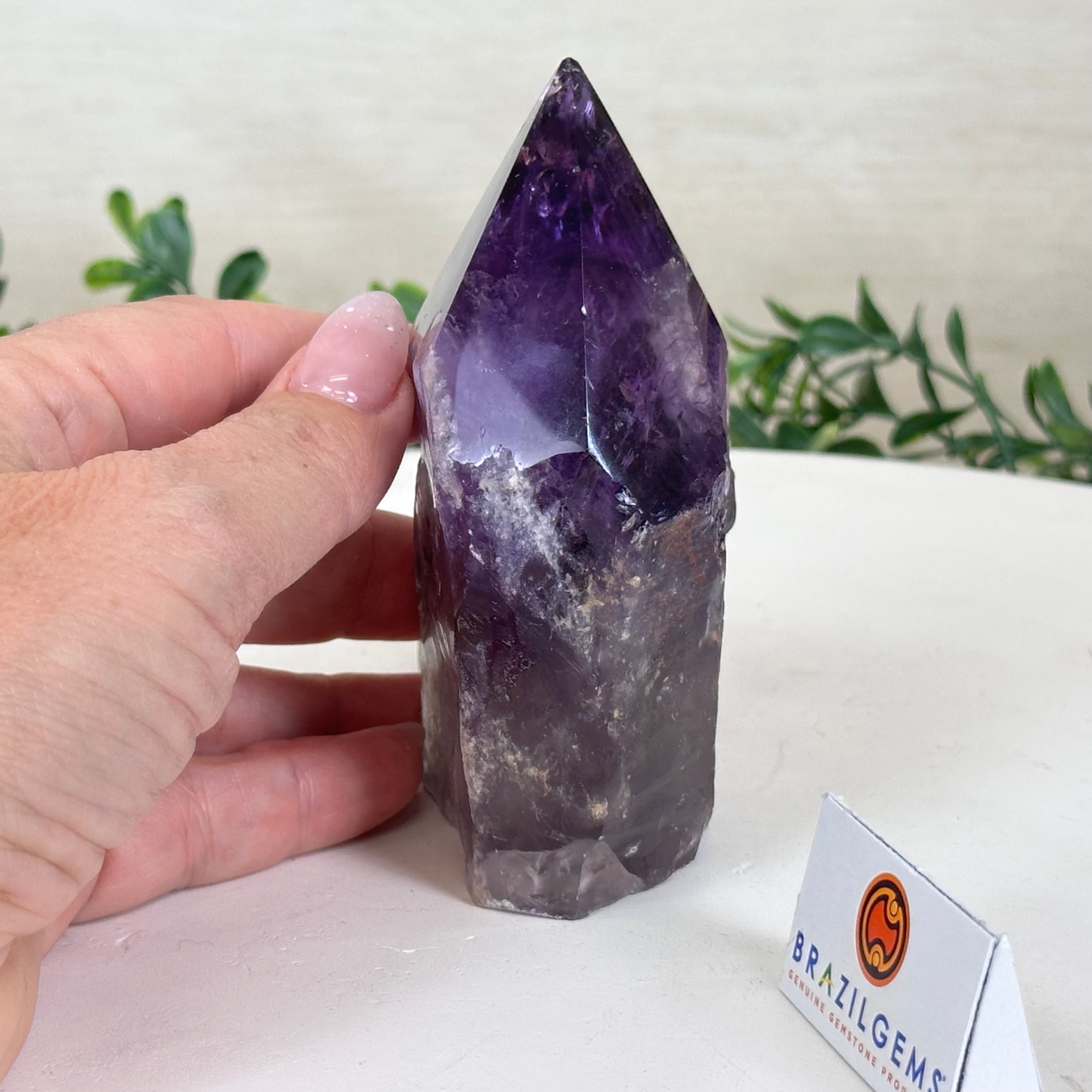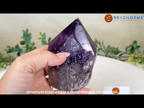Elevate your spiritual rituals with Brazil Gems' Super Quality Polished Amethyst Crystal Foot & Point. Featuring deep purple tones, this exquisite crystal exudes incredible energy and exquisite artistry. Whether used in meditation or healing, it is a must-have for the refined crystal connoisseur. With its polished point, flat base, and raw side edges, this piece has a tactile and visual appeal, perfect to hold or display on a tabletop.