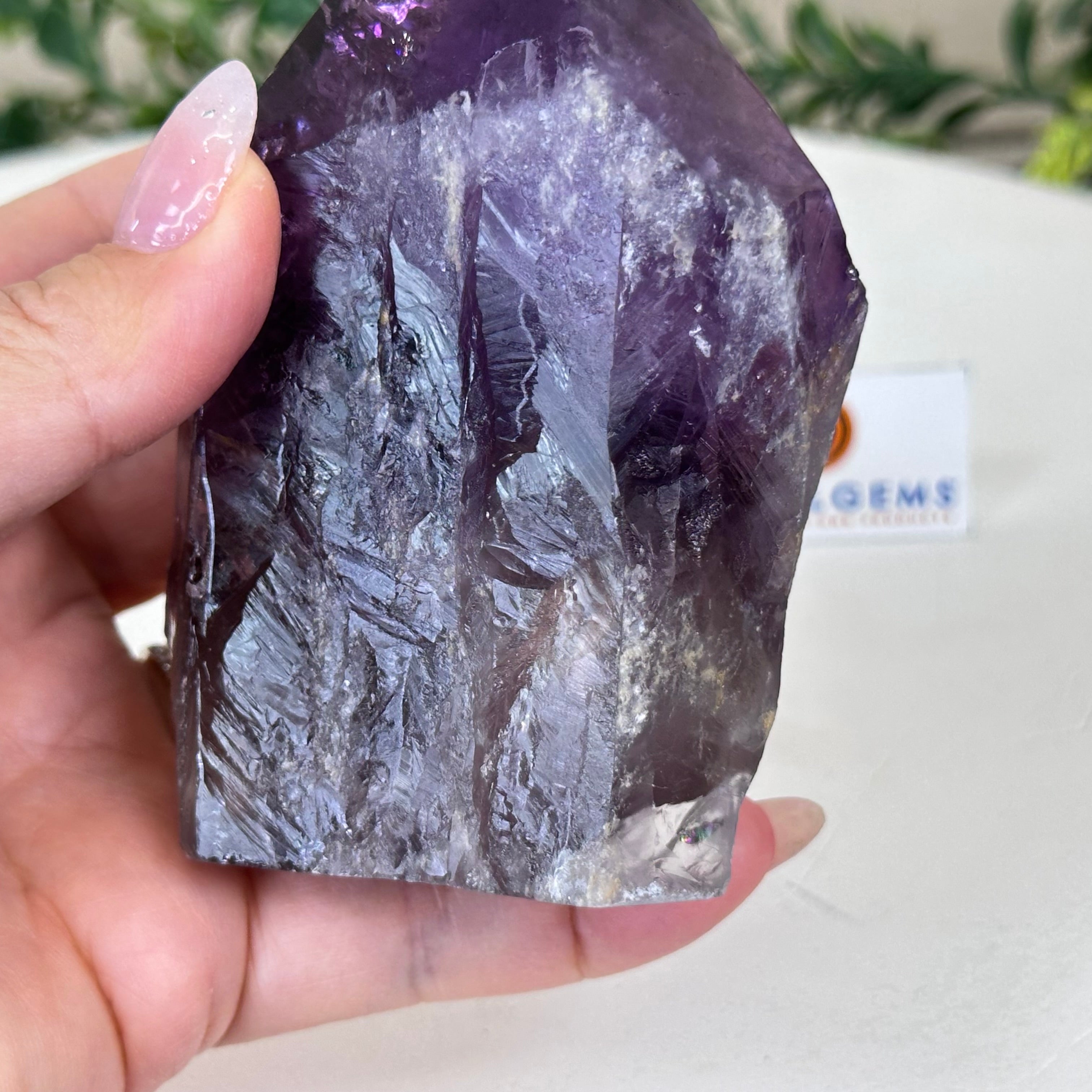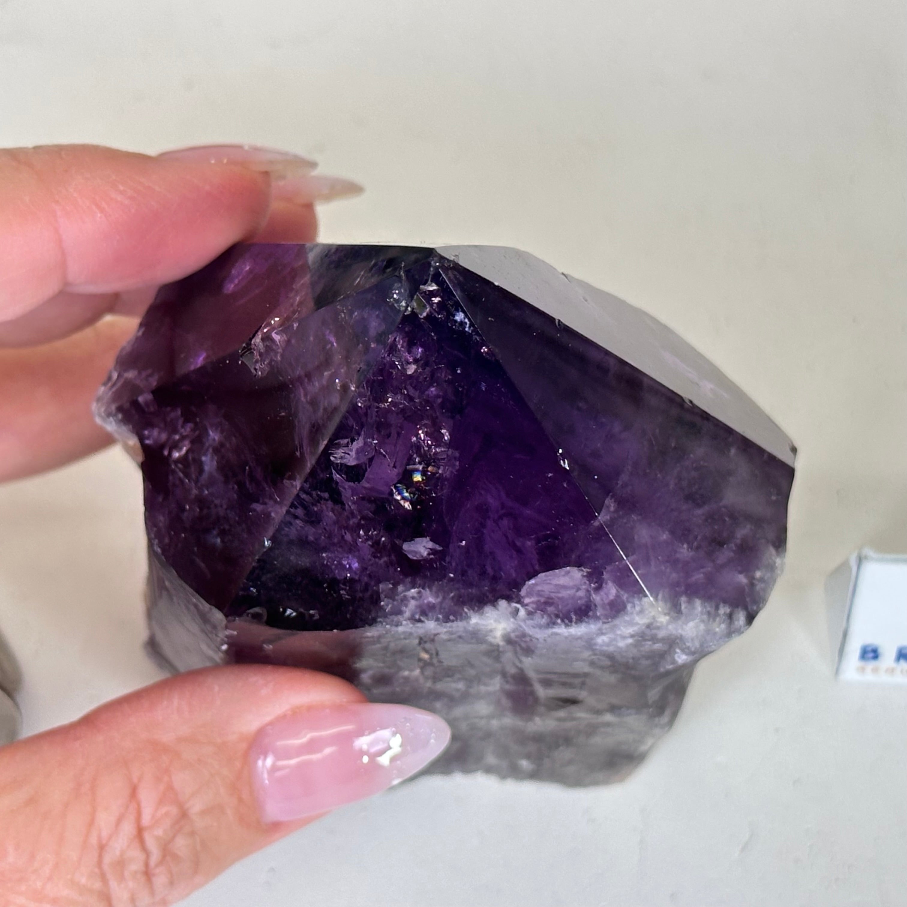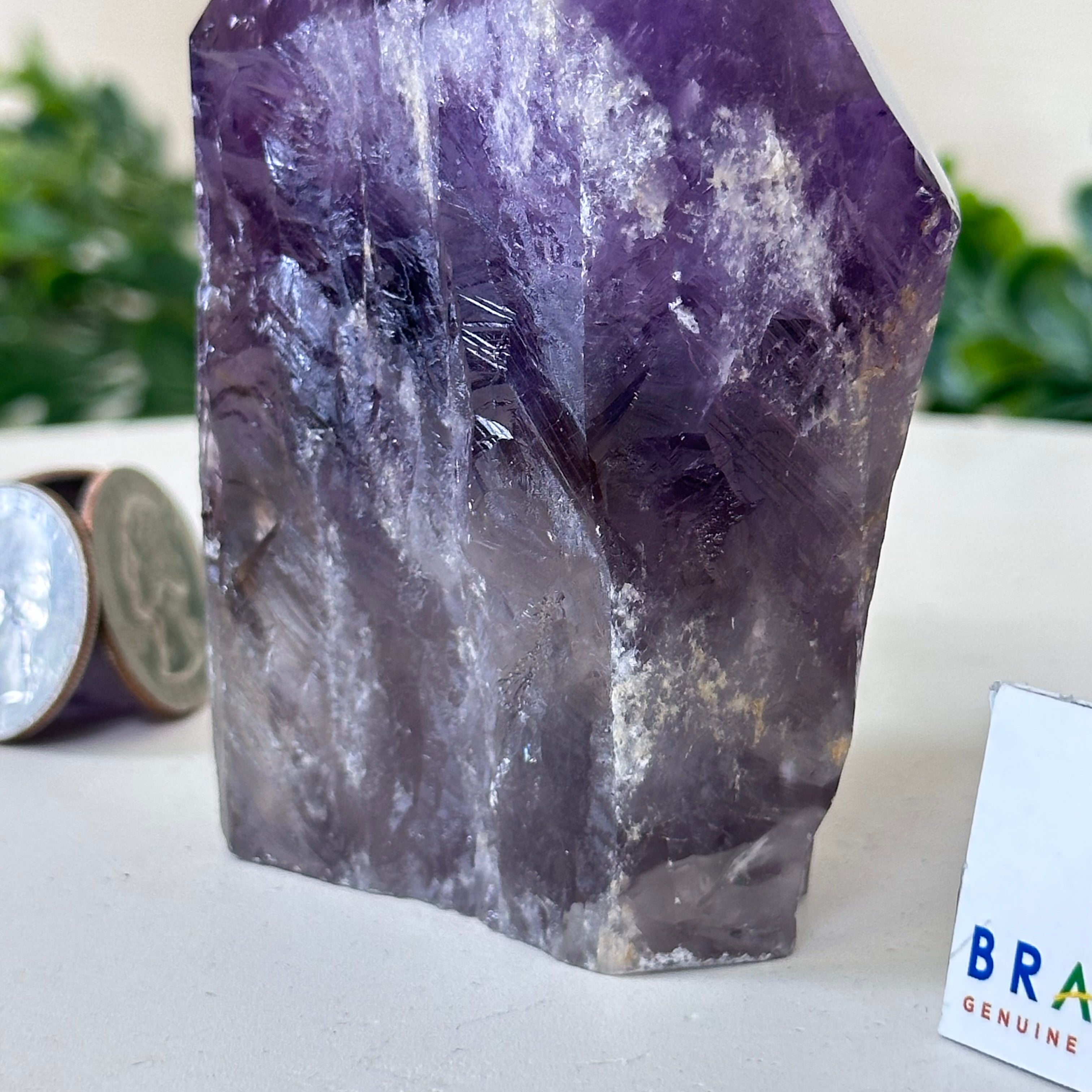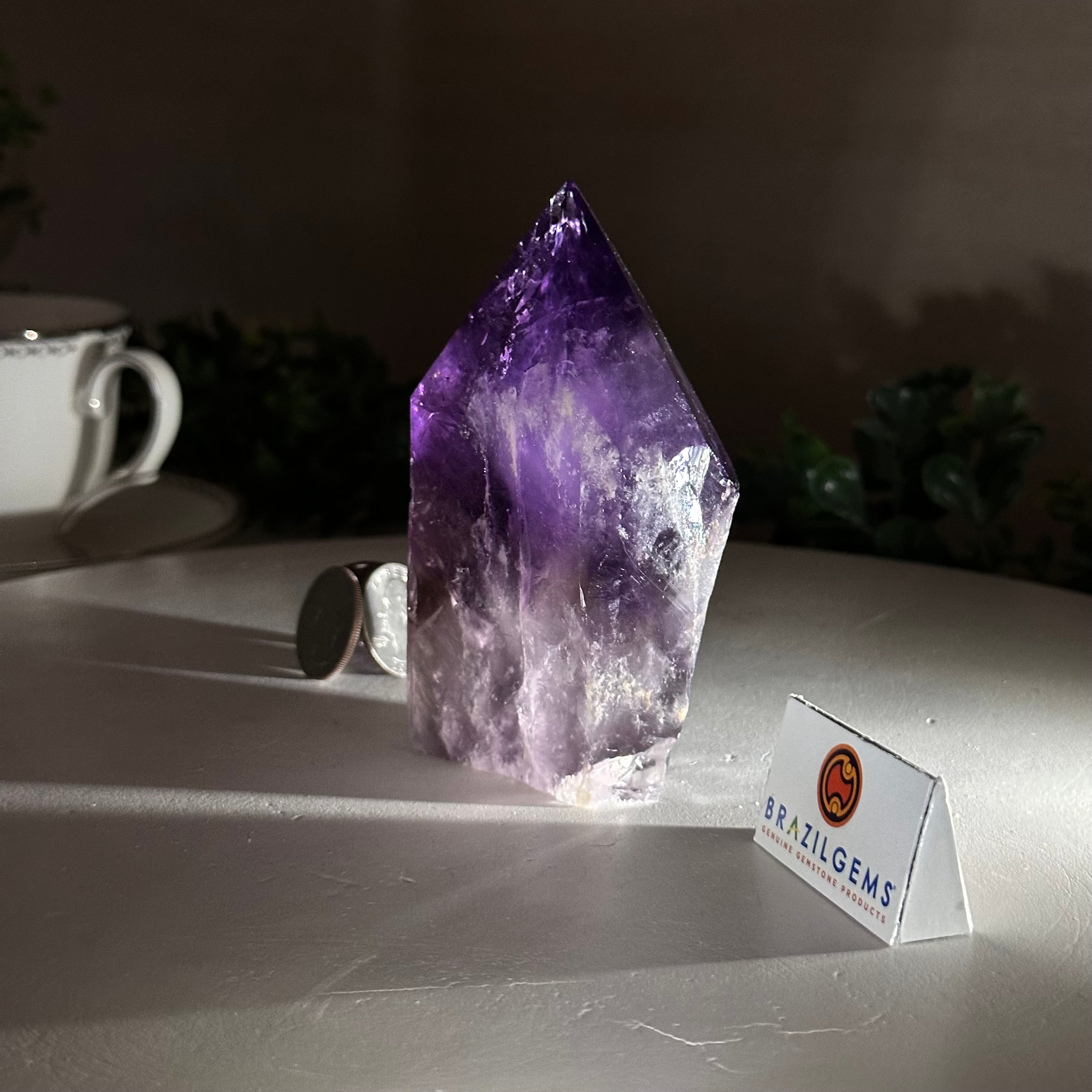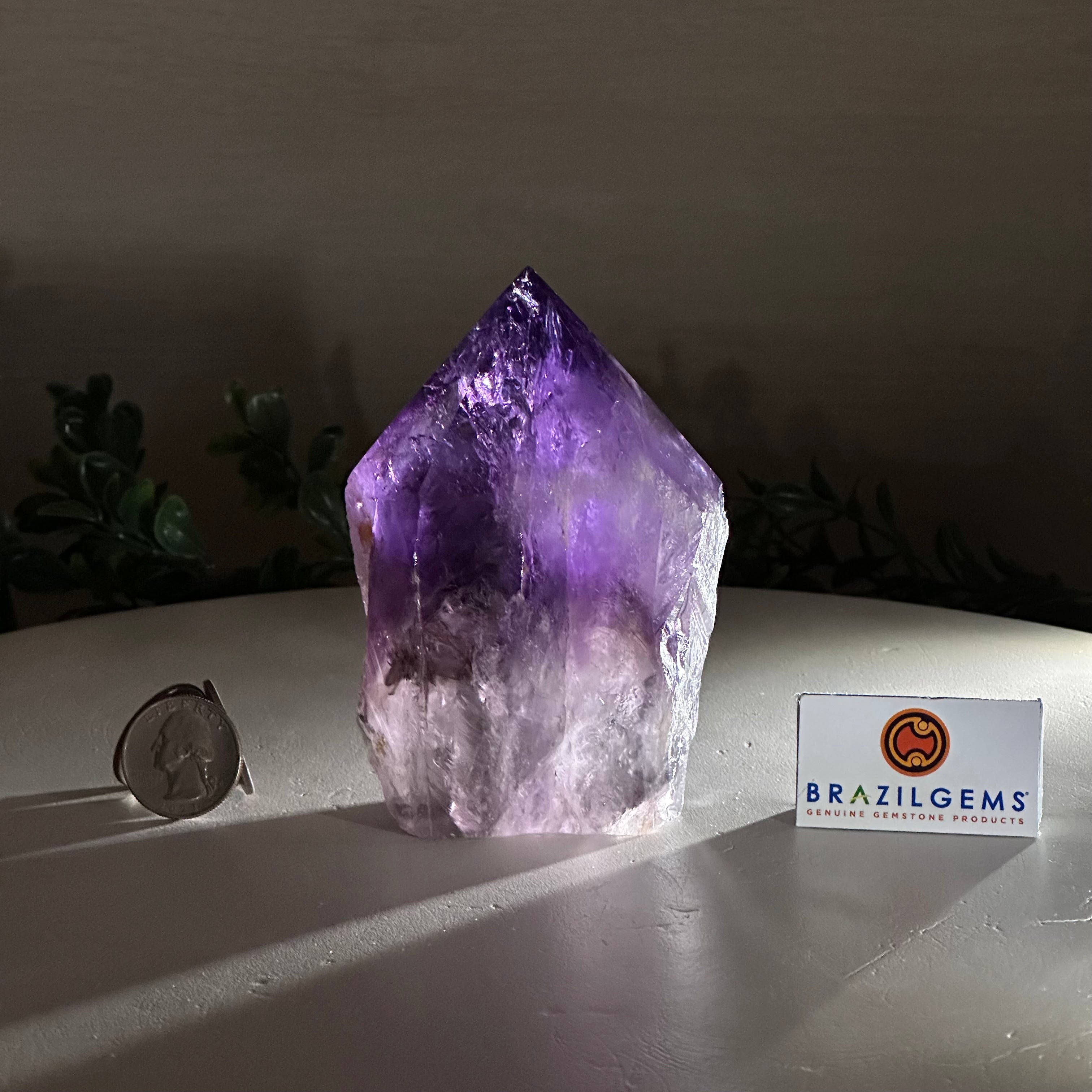 Elevate your spiritual rituals with Brazil Gems' Super Quality Polished Amethyst Crystal Foot & Point. Featuring deep purple tones, this exquisite crystal exudes incredible energy and exquisite artistry. Whether used in meditation or healing, it is a must-have for the refined crystal connoisseur. With its polished point, flat base, and raw side edges, this piece has a tactile and visual appeal, perfect to hold or display on a tabletop.