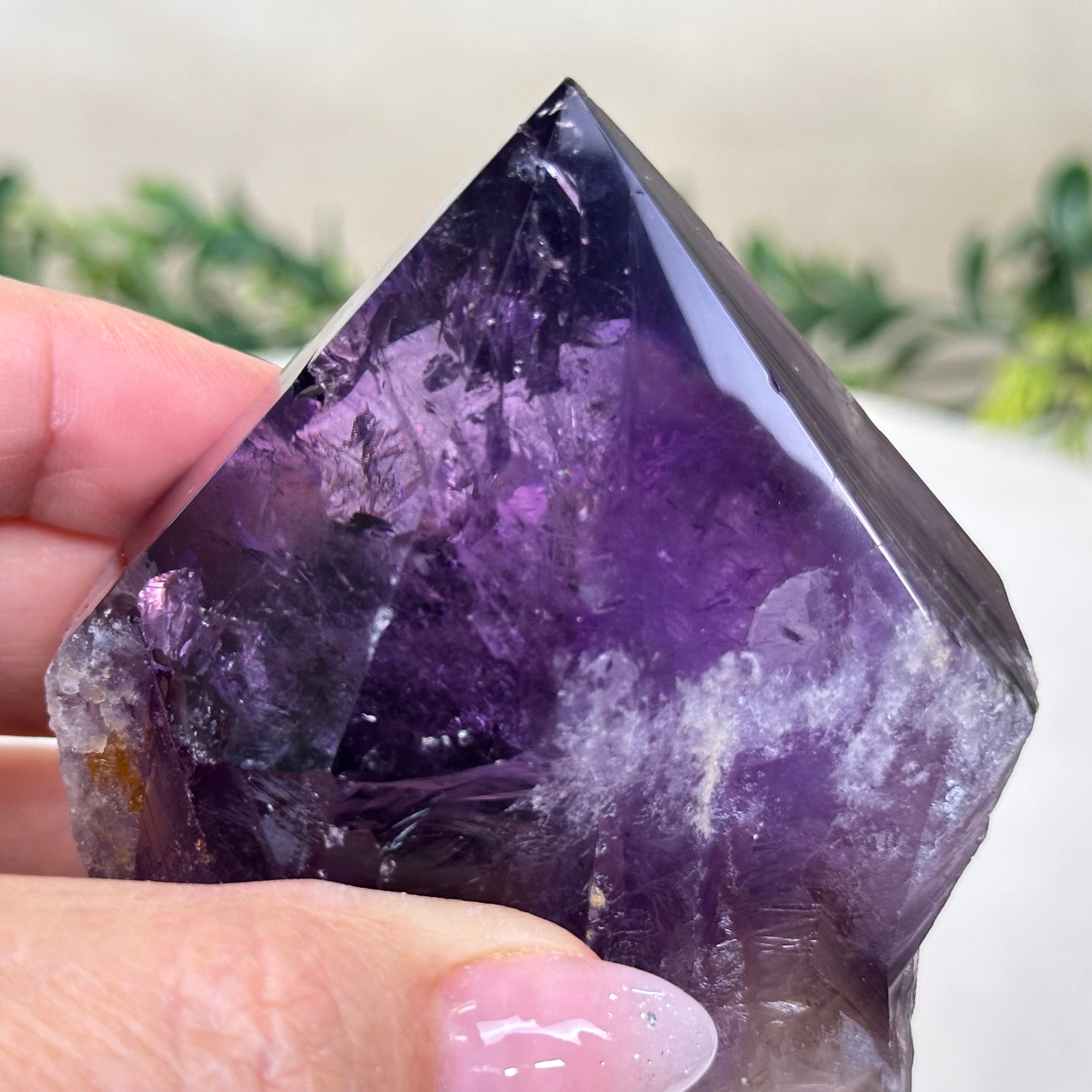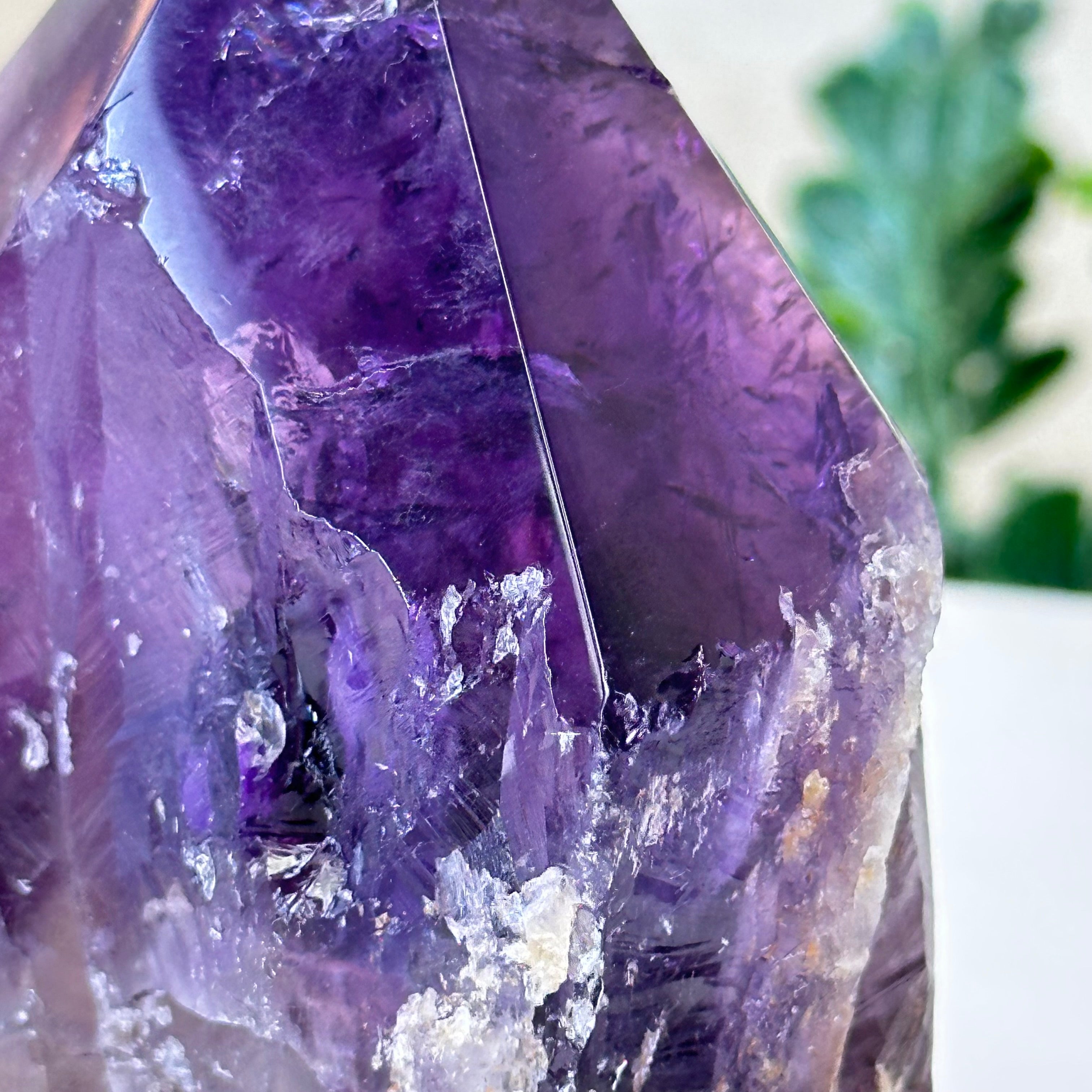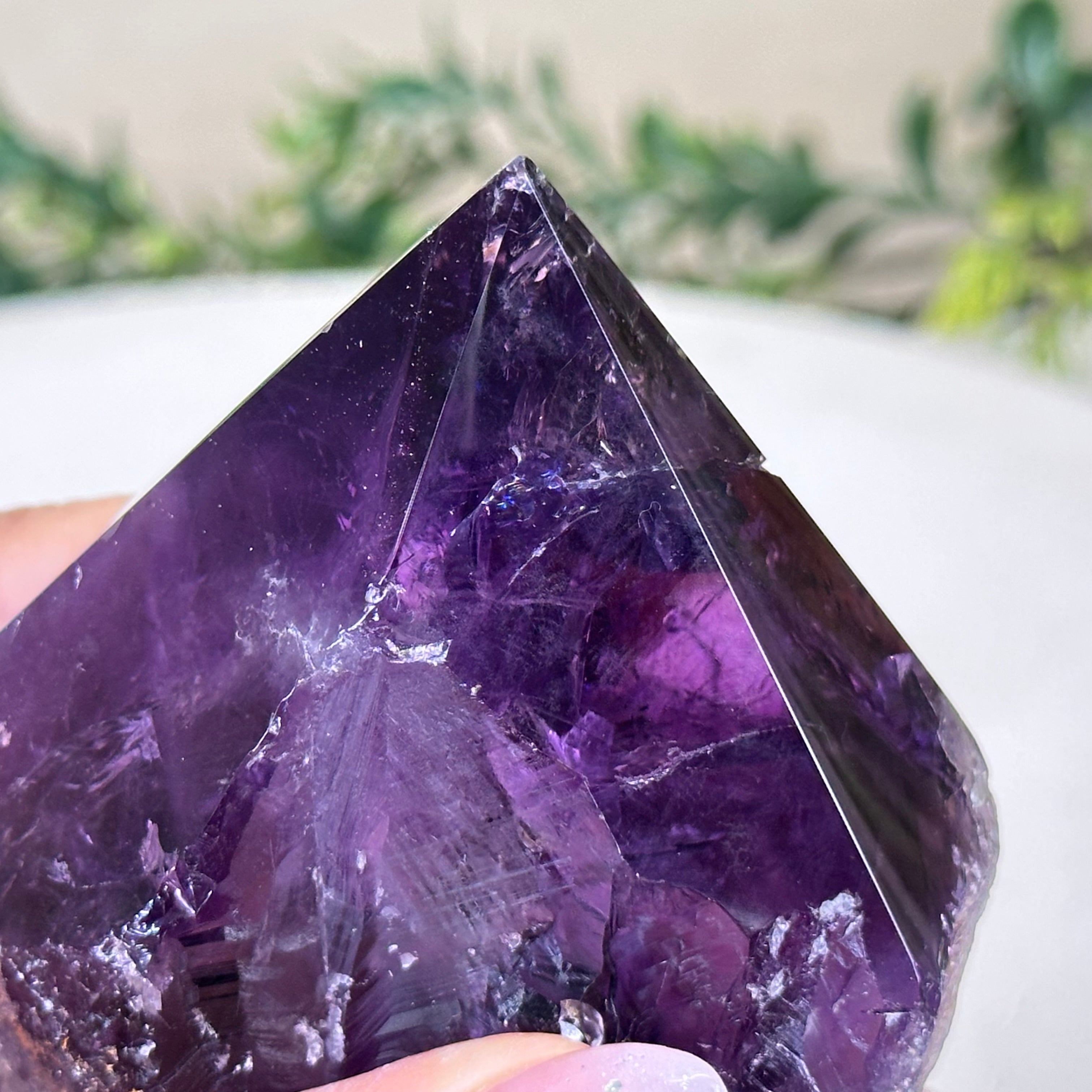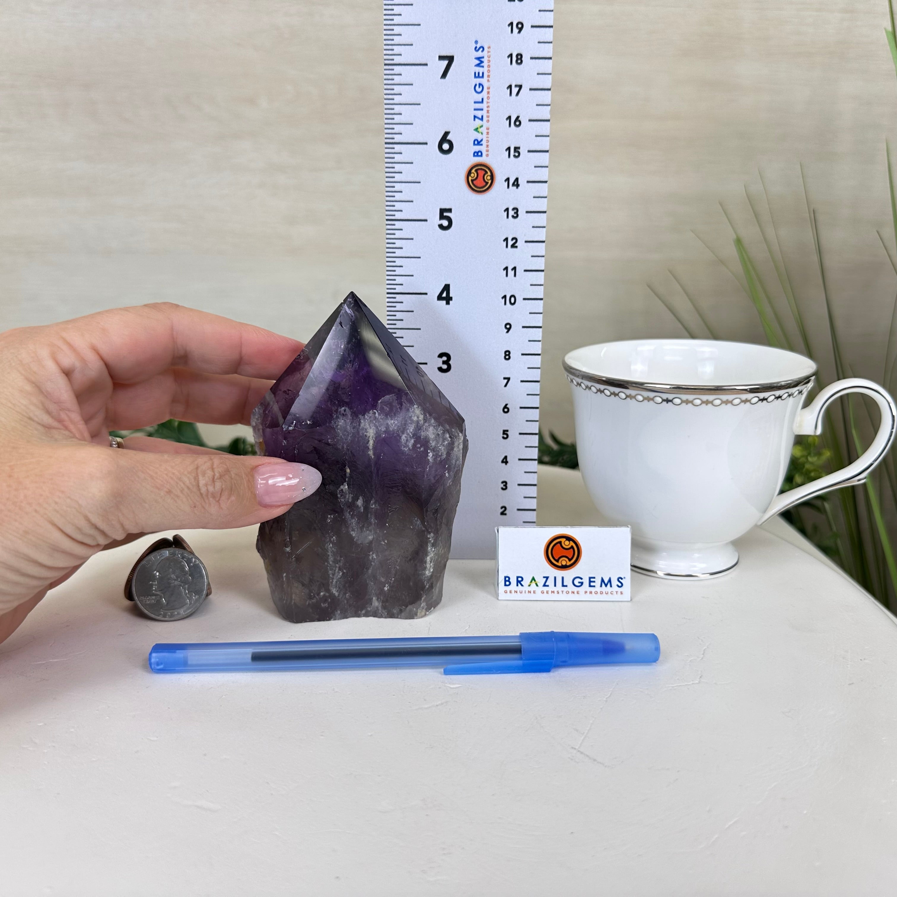 Elevate your spiritual rituals with Brazil Gems' Super Quality Polished Amethyst Crystal Foot & Point. Featuring deep purple tones, this exquisite crystal exudes incredible energy and exquisite artistry. Whether used in meditation or healing, it is a must-have for the refined crystal connoisseur. With its polished point, flat base, and raw side edges, this piece has a tactile and visual appeal, perfect to hold or display on a tabletop.
