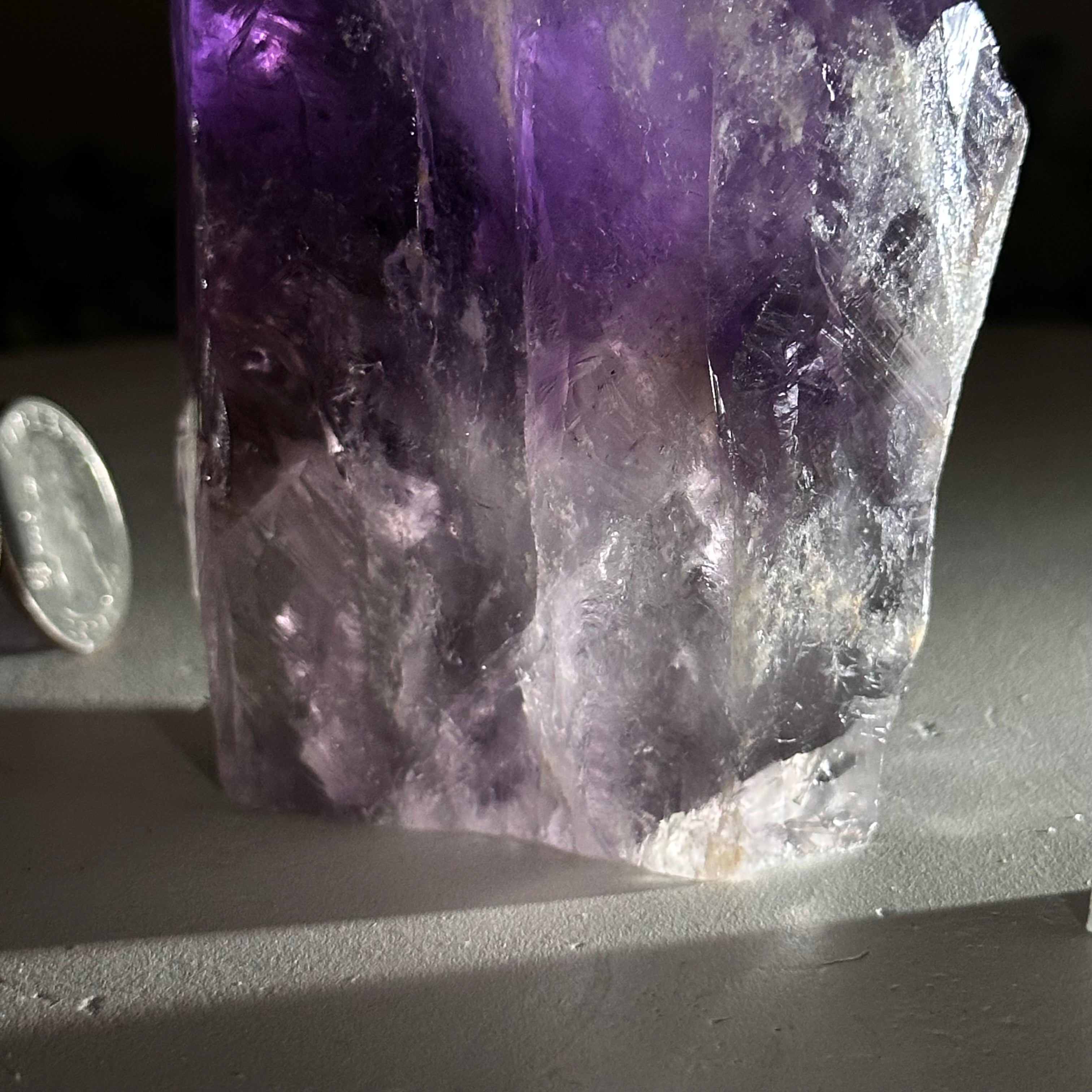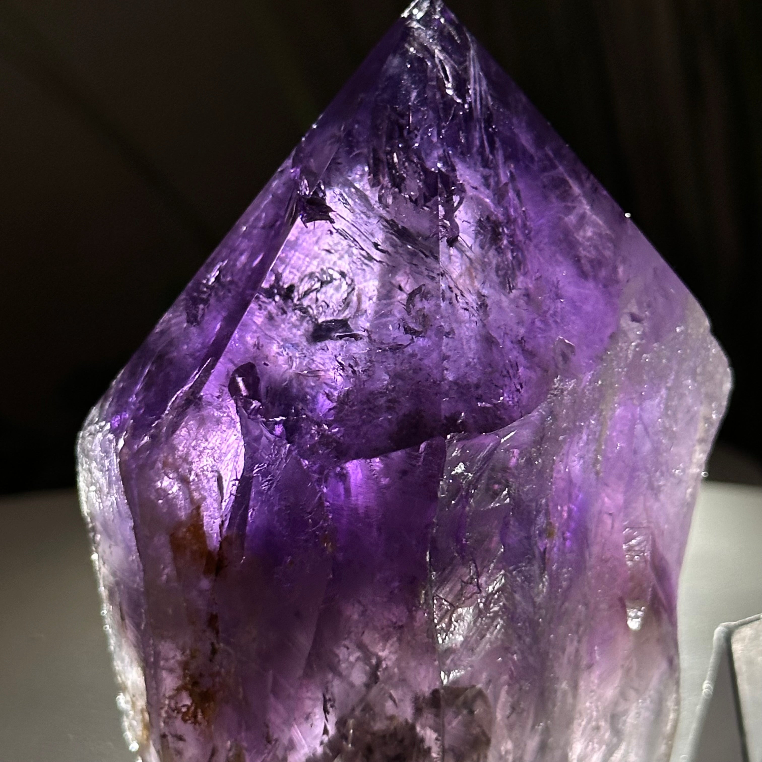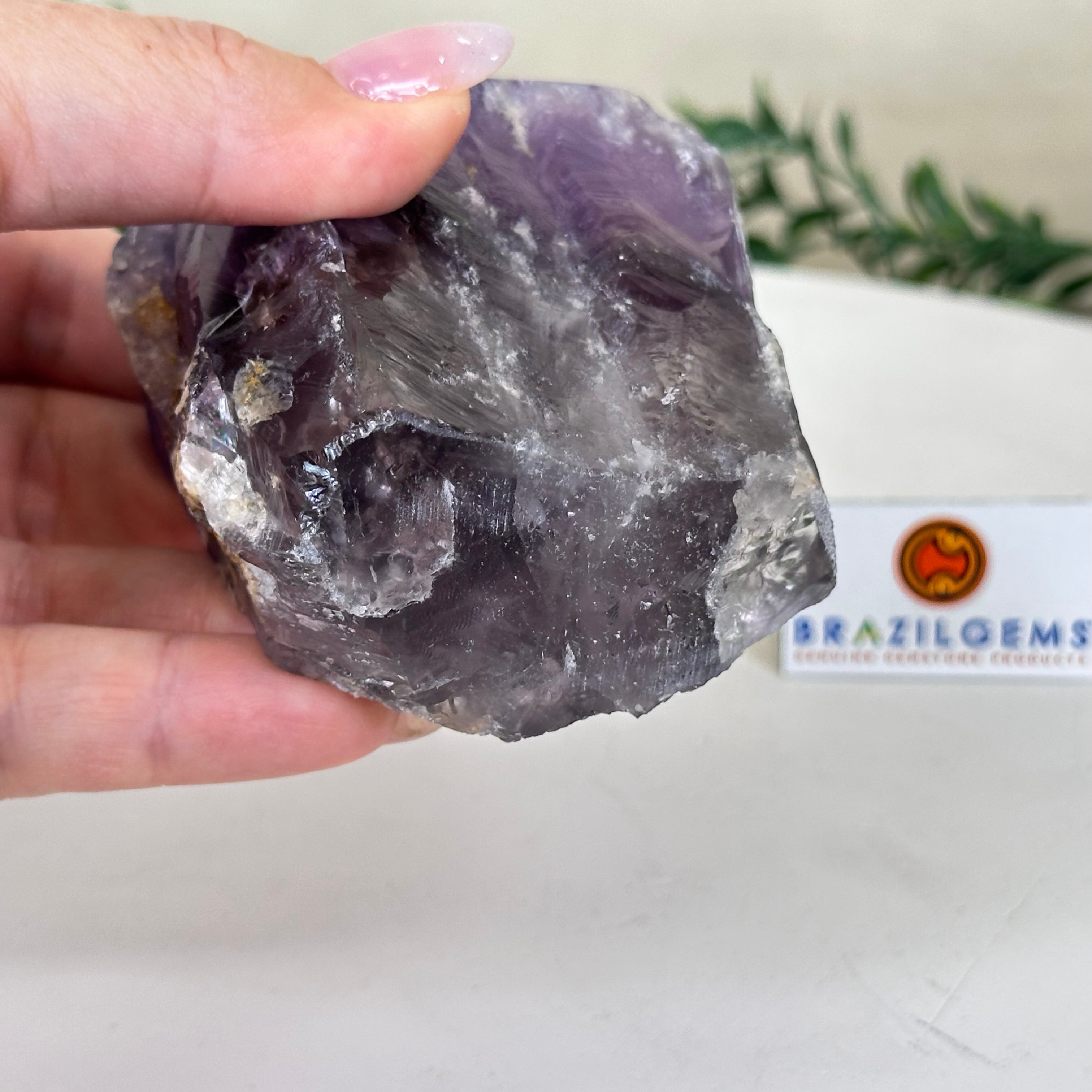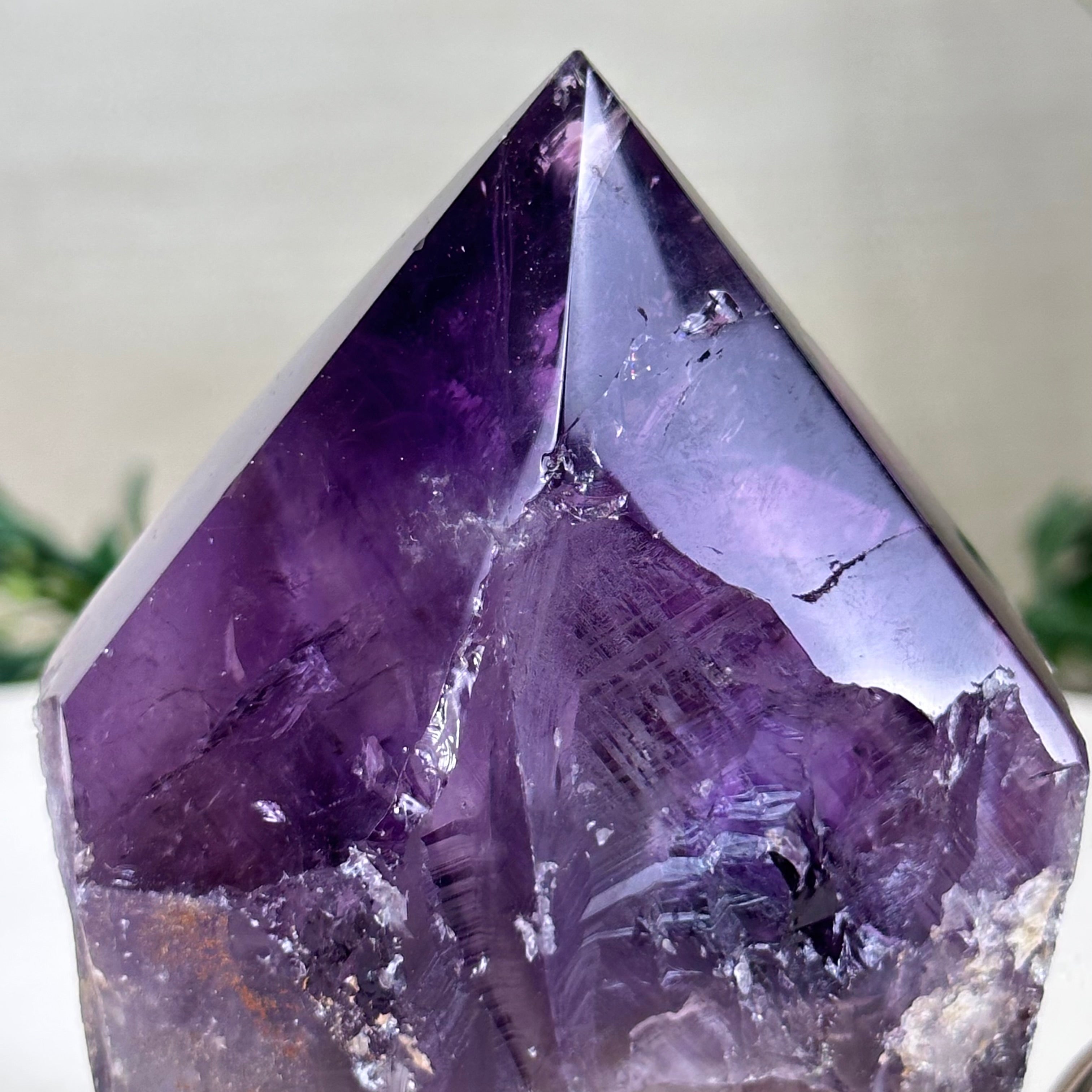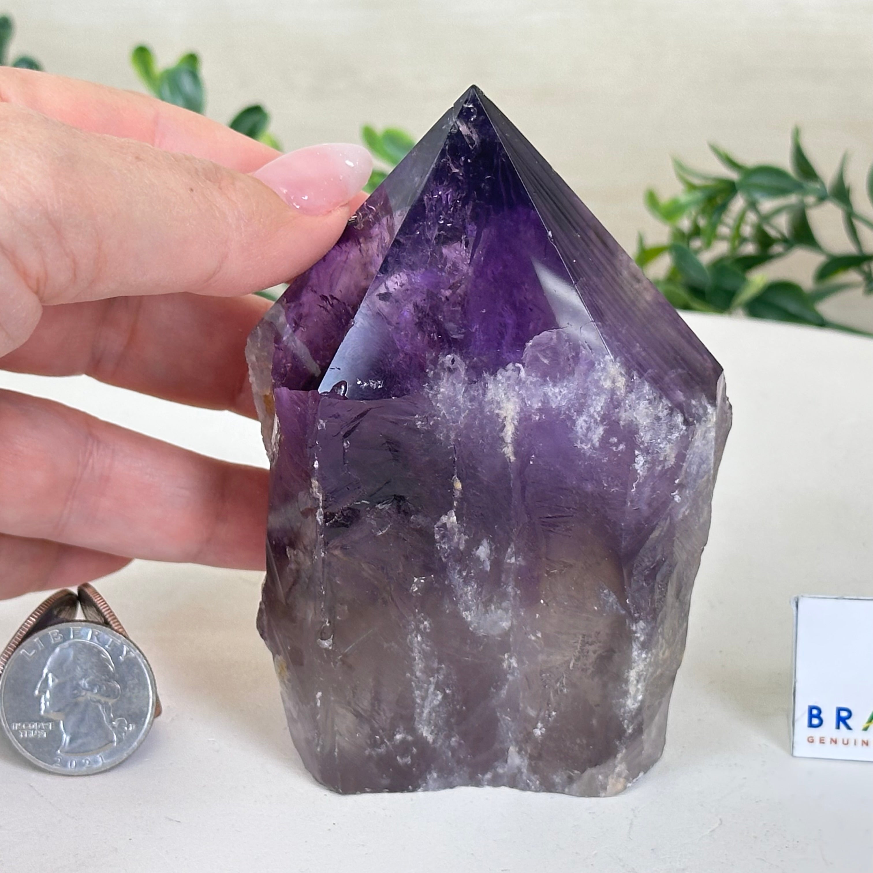 Elevate your spiritual rituals with Brazil Gems' Super Quality Polished Amethyst Crystal Foot & Point. Featuring deep purple tones, this exquisite crystal exudes incredible energy and exquisite artistry. Whether used in meditation or healing, it is a must-have for the refined crystal connoisseur. With its polished point, flat base, and raw side edges, this piece has a tactile and visual appeal, perfect to hold or display on a tabletop.