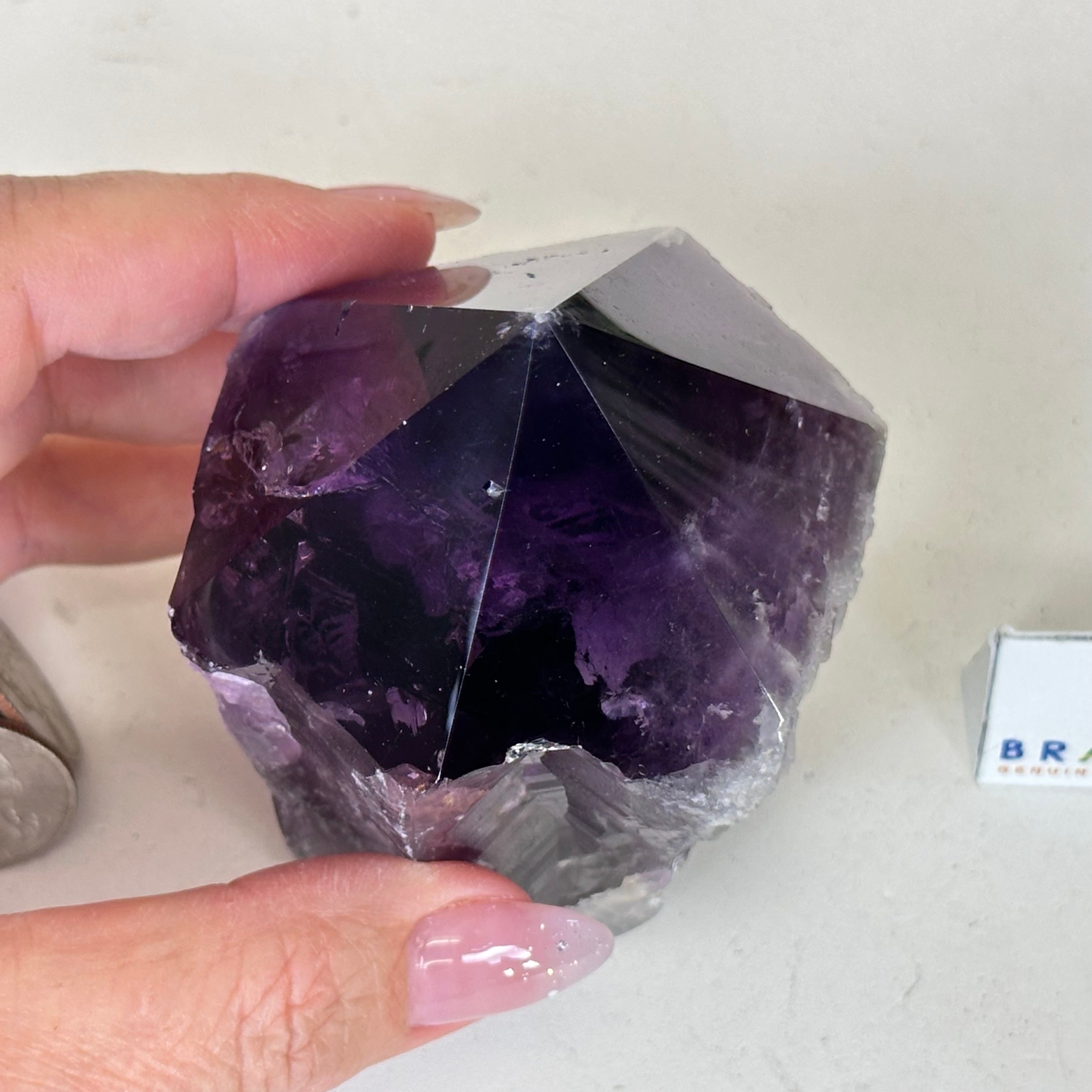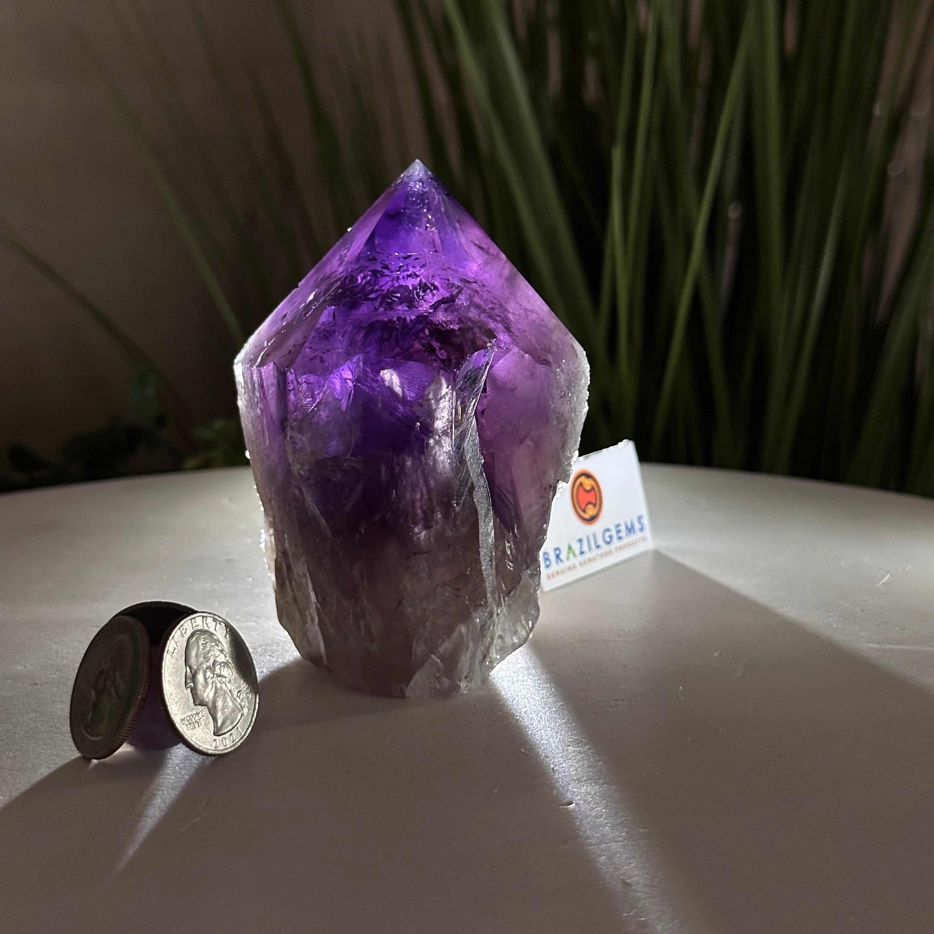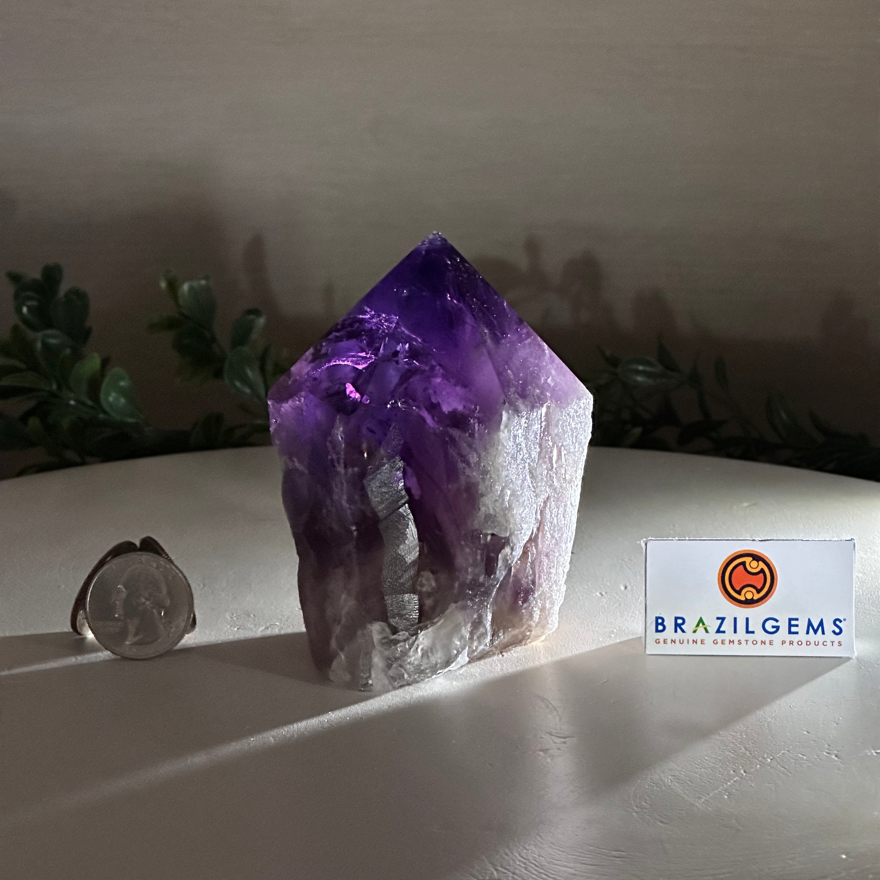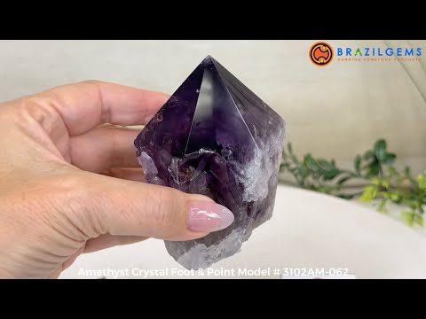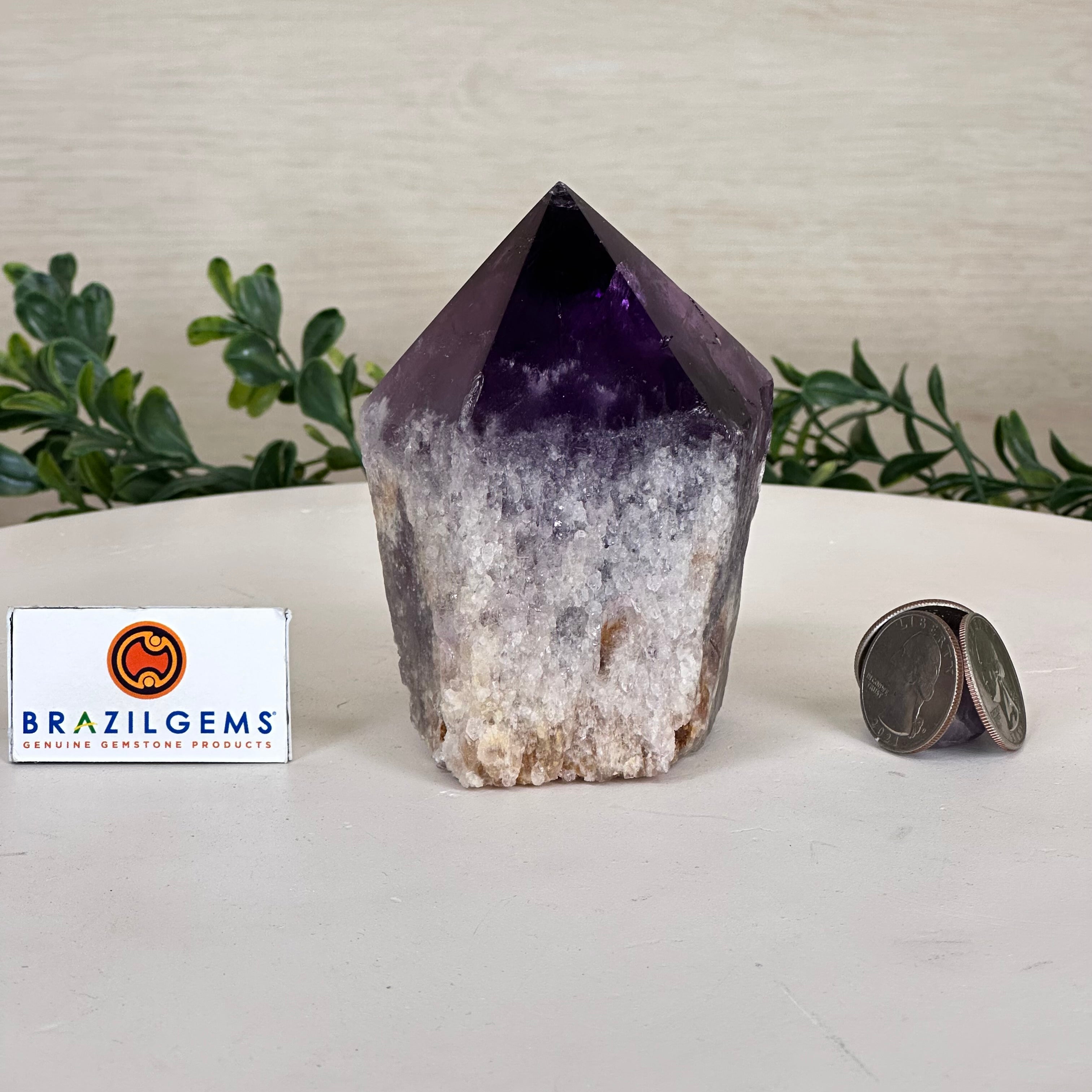Elevate your spiritual rituals with Brazil Gems' Super Quality Polished Amethyst Crystal Foot & Point. Featuring deep purple tones, this exquisite crystal exudes incredible energy and exquisite artistry. Whether used in meditation or healing, it is a must-have for the refined crystal connoisseur. With its polished point, flat base, and raw side edges, this piece has a tactile and visual appeal, perfect to hold or display on a tabletop.