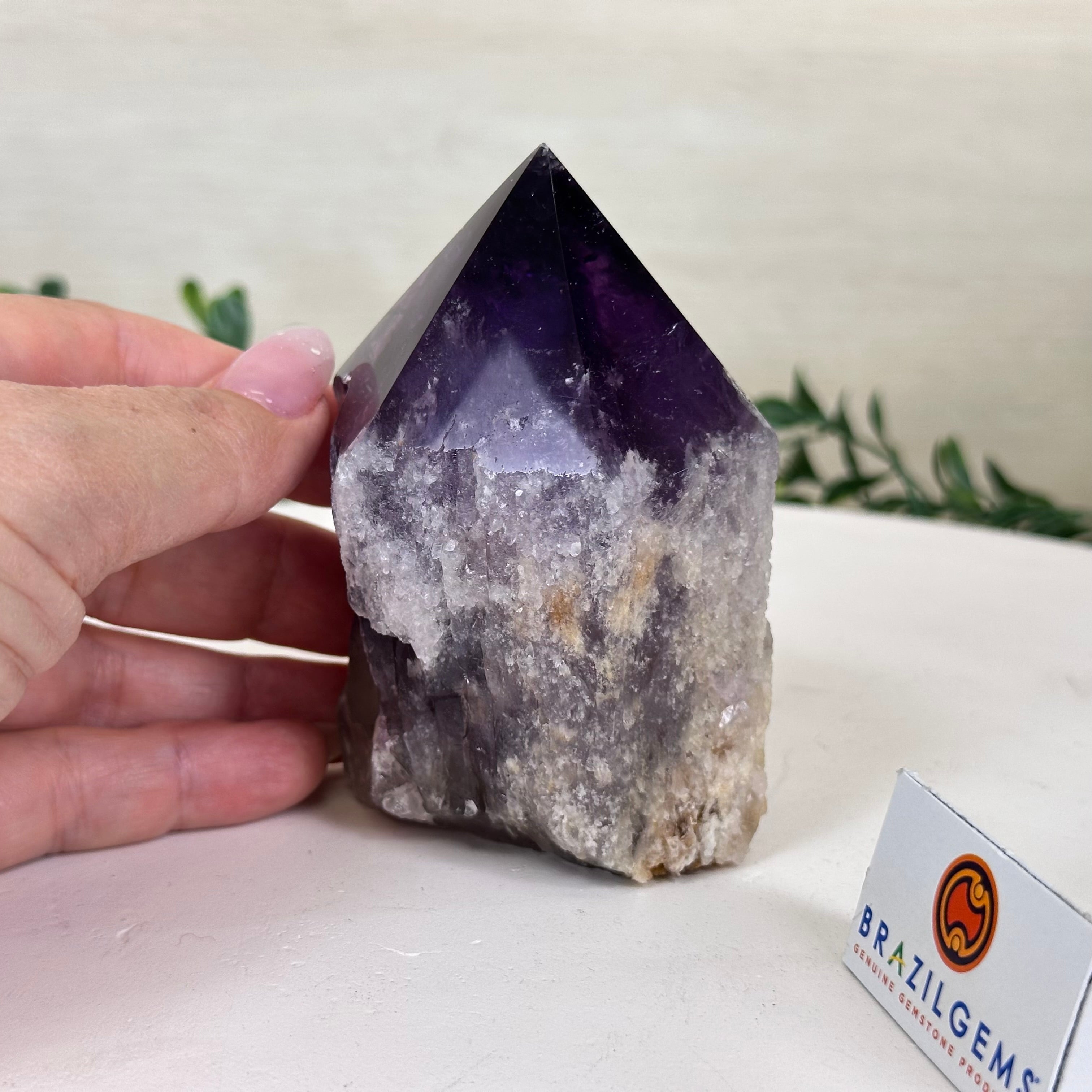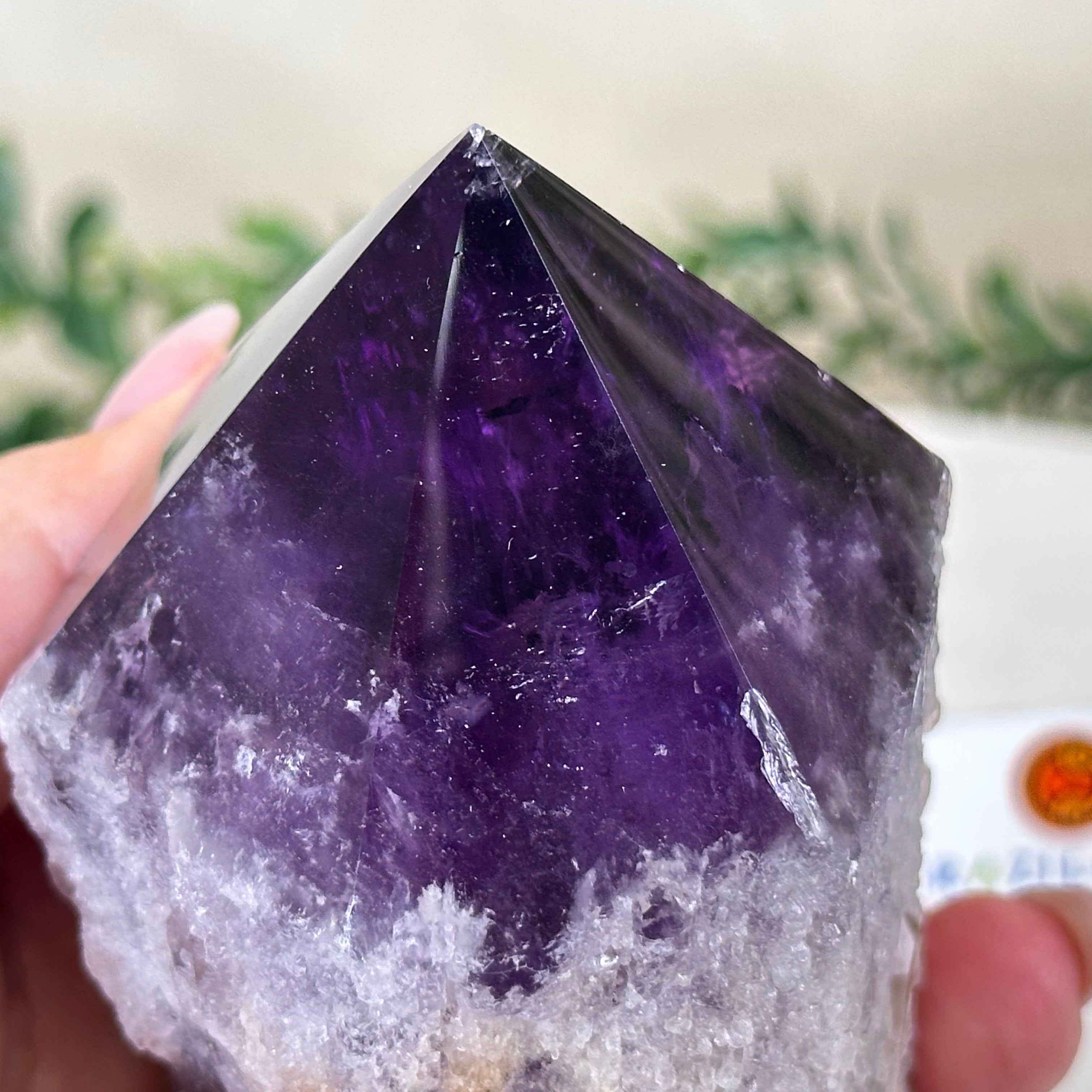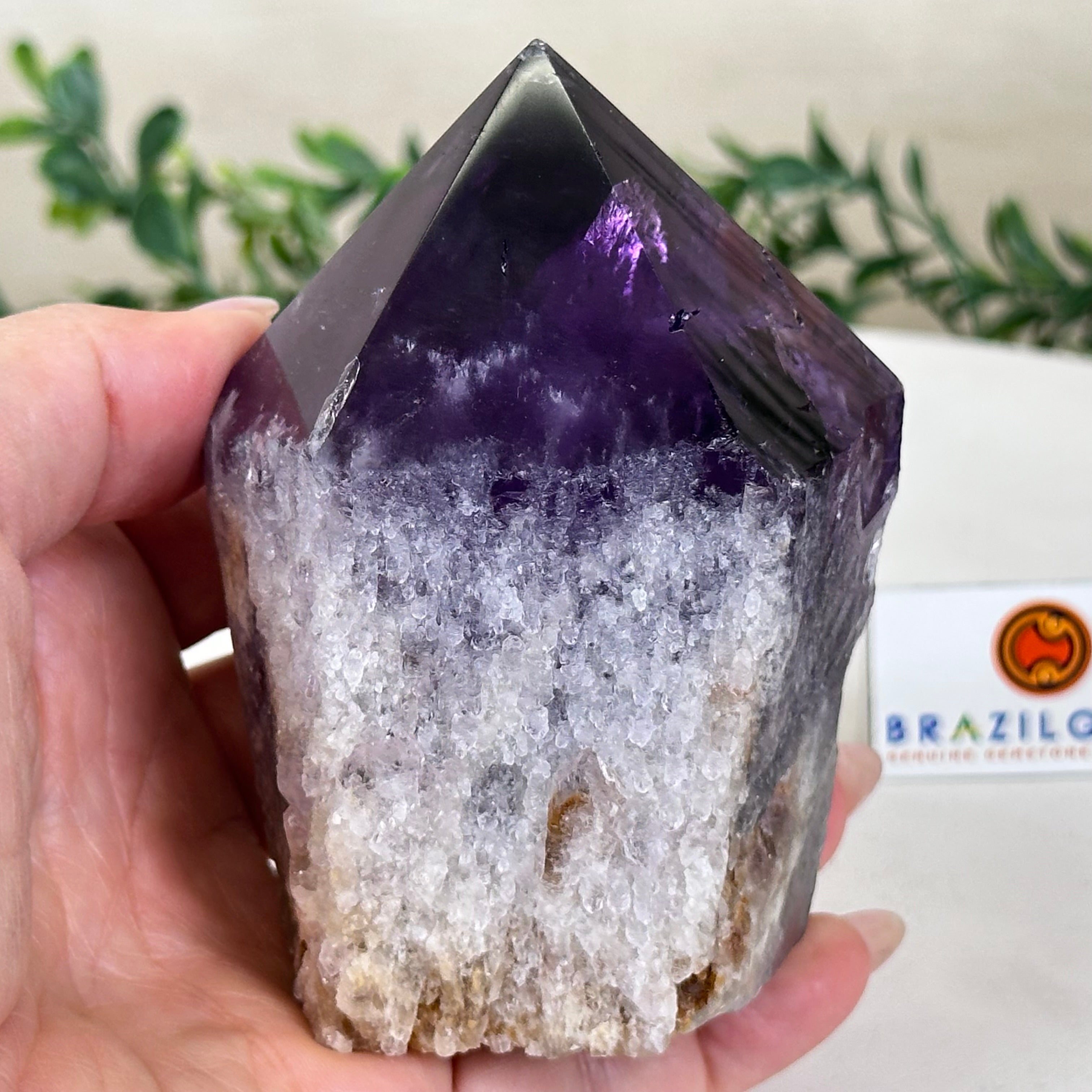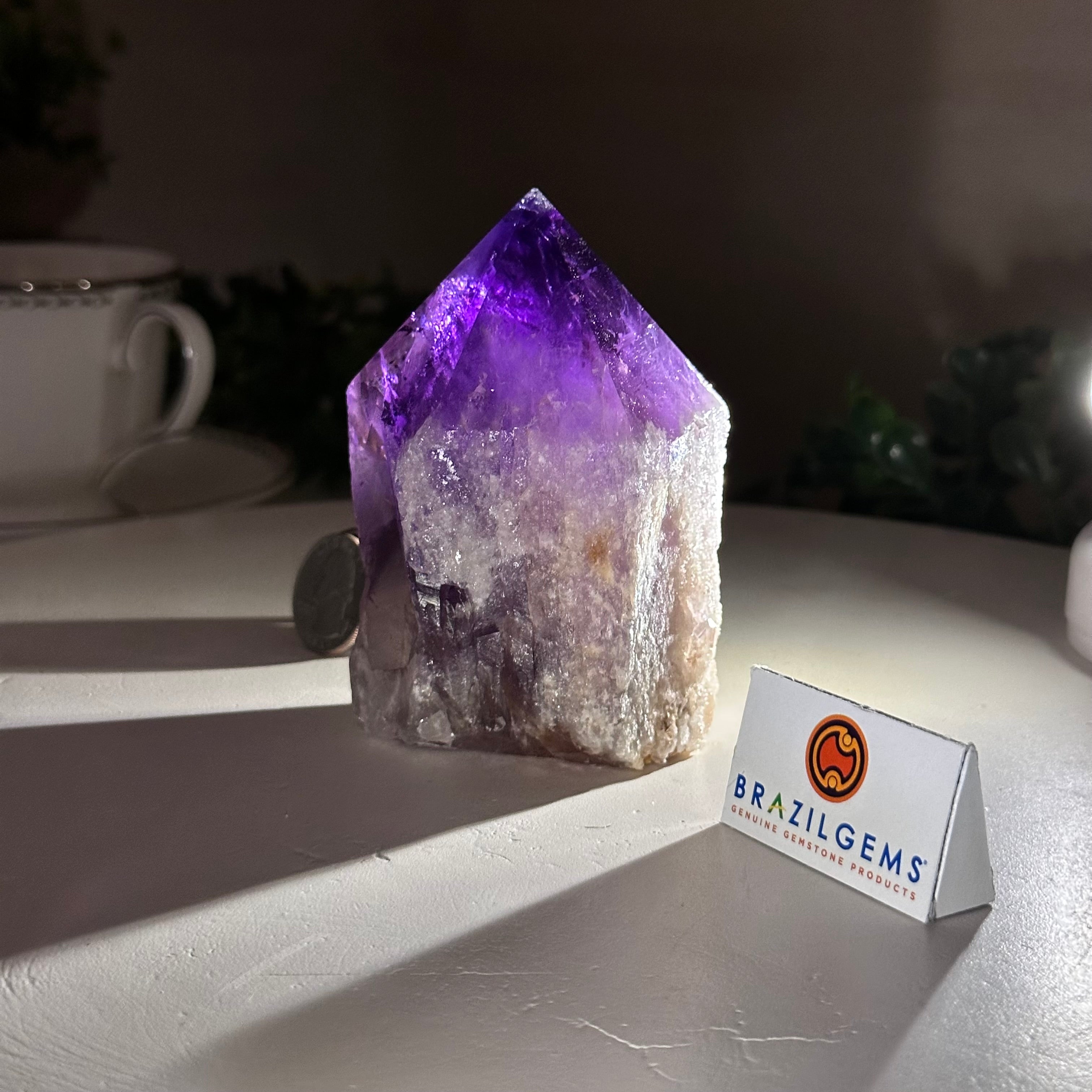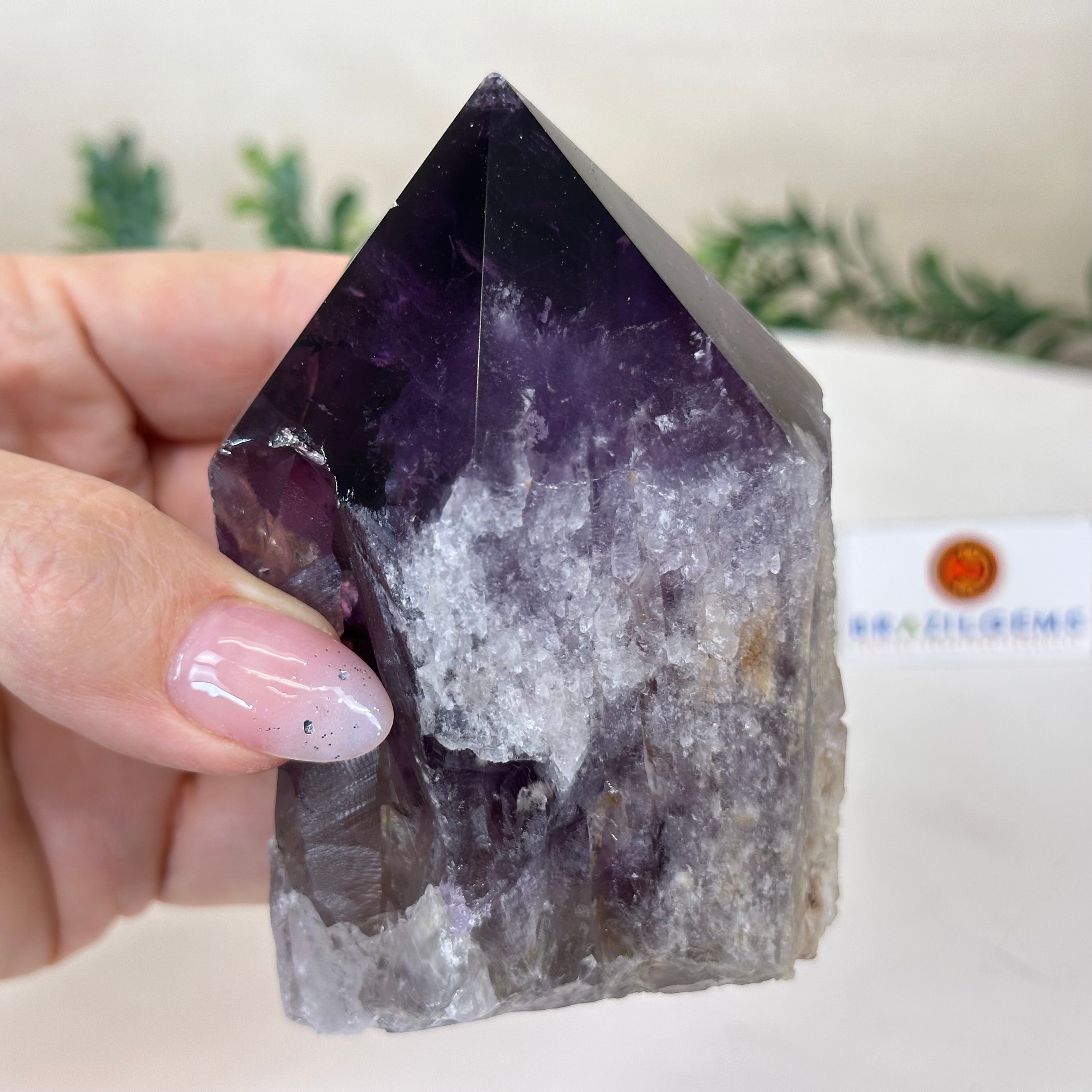 Elevate your spiritual rituals with Brazil Gems' Super Quality Polished Amethyst Crystal Foot & Point. Featuring deep purple tones, this exquisite crystal exudes incredible energy and exquisite artistry. Whether used in meditation or healing, it is a must-have for the refined crystal connoisseur. With its polished point, flat base, and raw side edges, this piece has a tactile and visual appeal, perfect to hold or display on a tabletop.