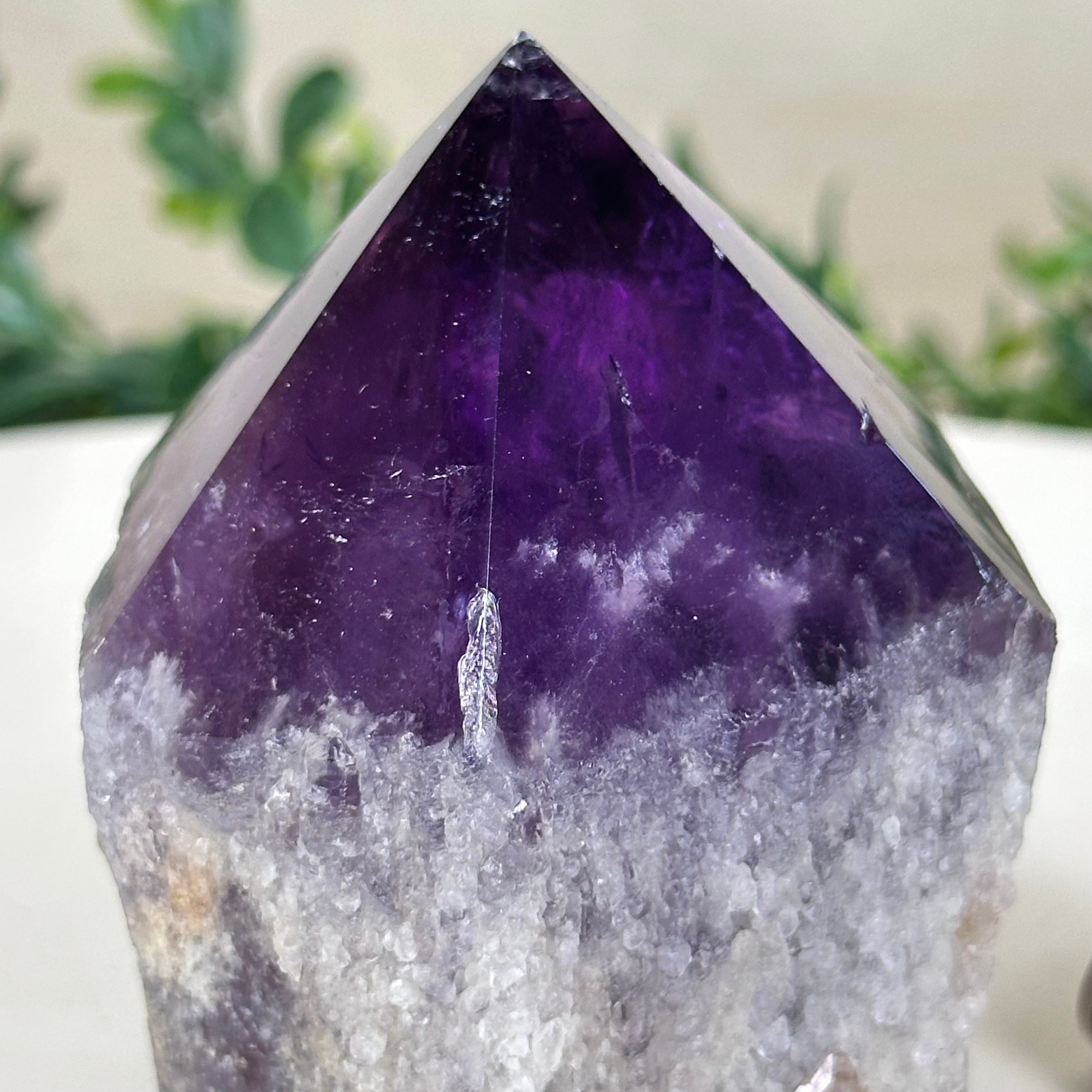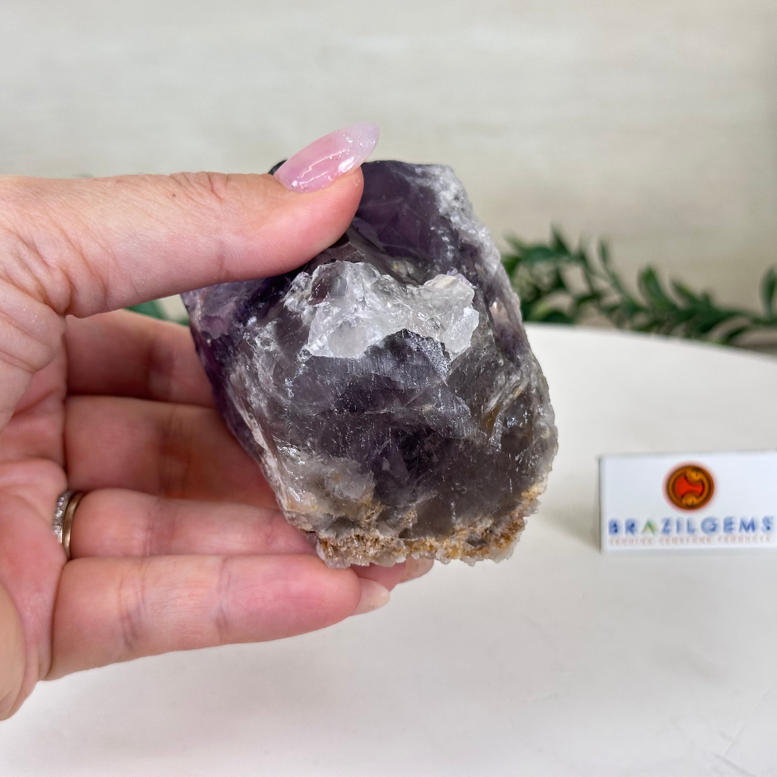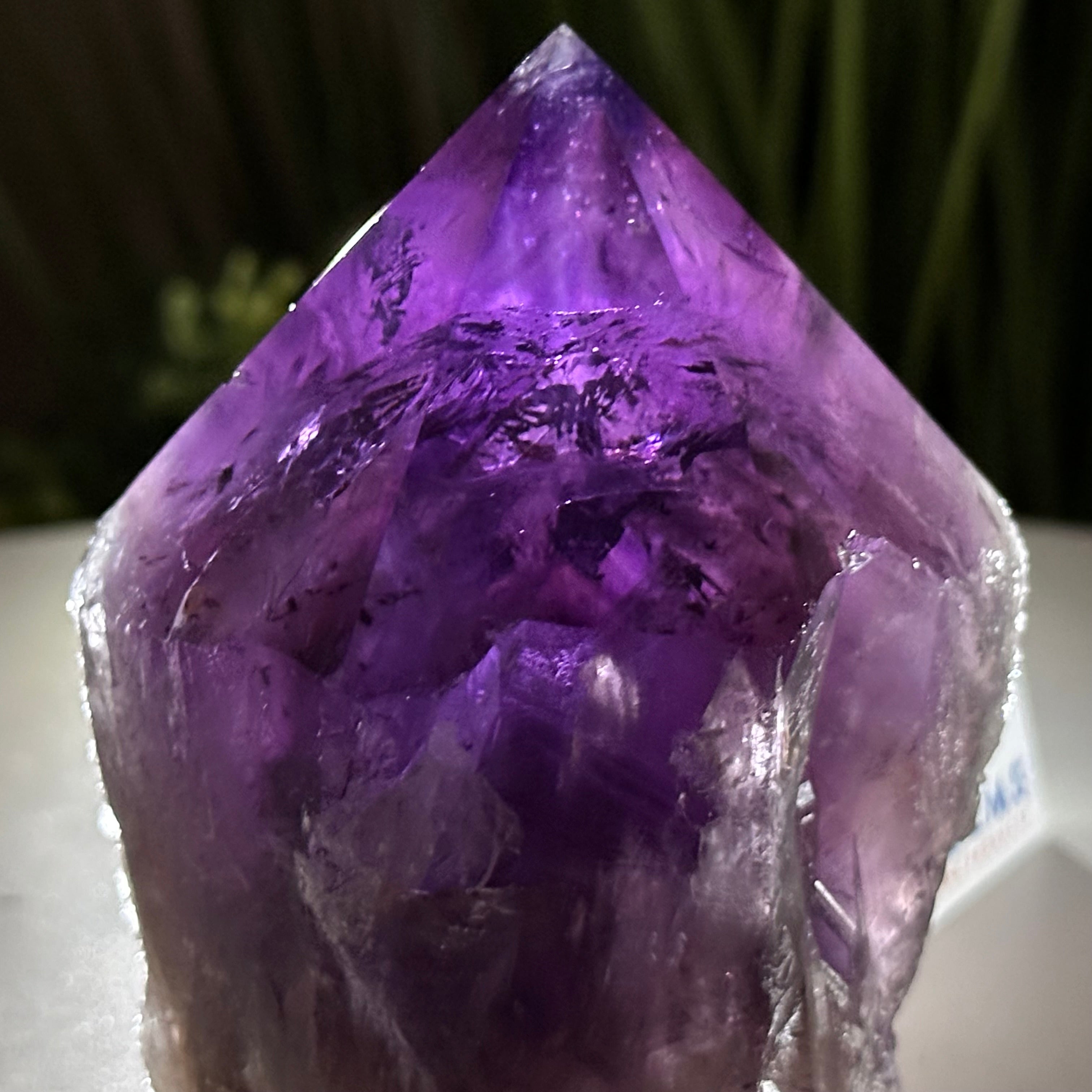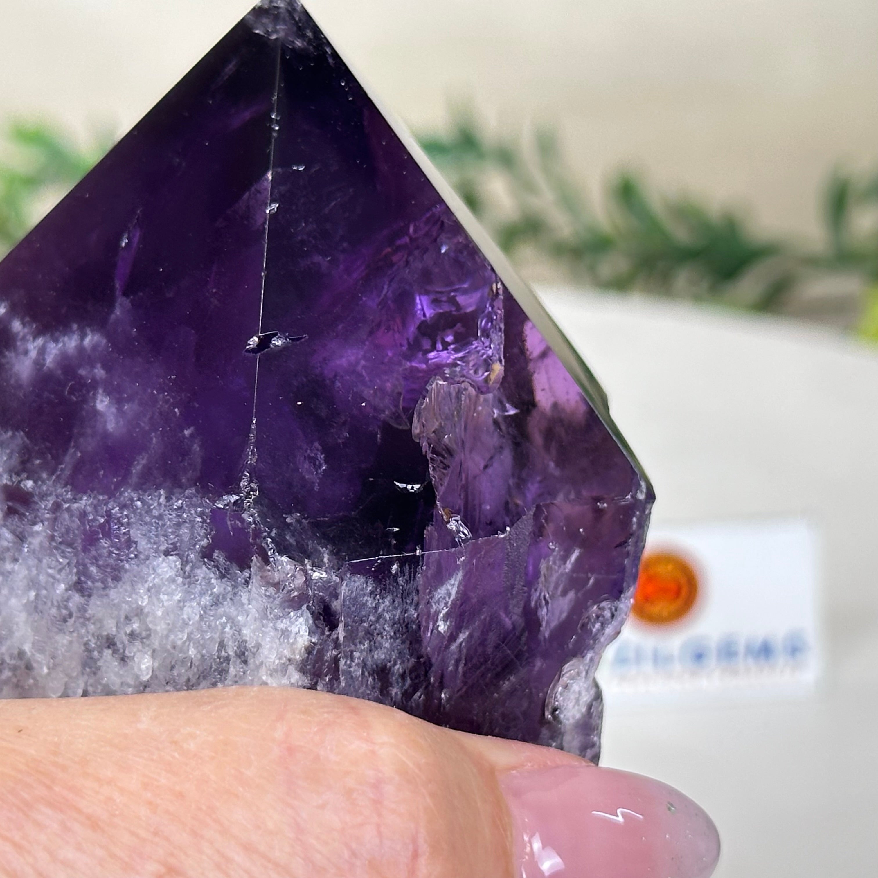 Elevate your spiritual rituals with Brazil Gems' Super Quality Polished Amethyst Crystal Foot & Point. Featuring deep purple tones, this exquisite crystal exudes incredible energy and exquisite artistry. Whether used in meditation or healing, it is a must-have for the refined crystal connoisseur. With its polished point, flat base, and raw side edges, this piece has a tactile and visual appeal, perfect to hold or display on a tabletop.