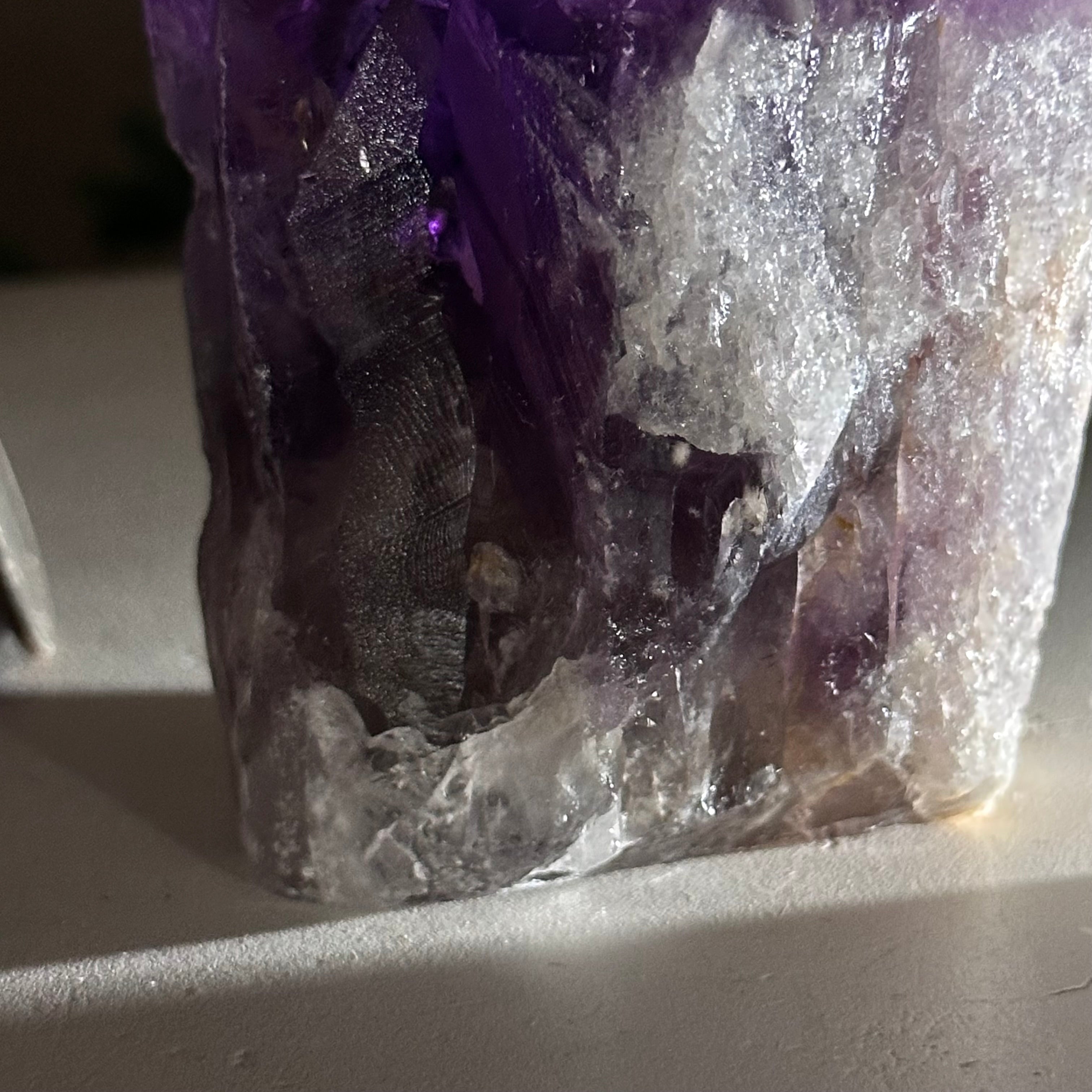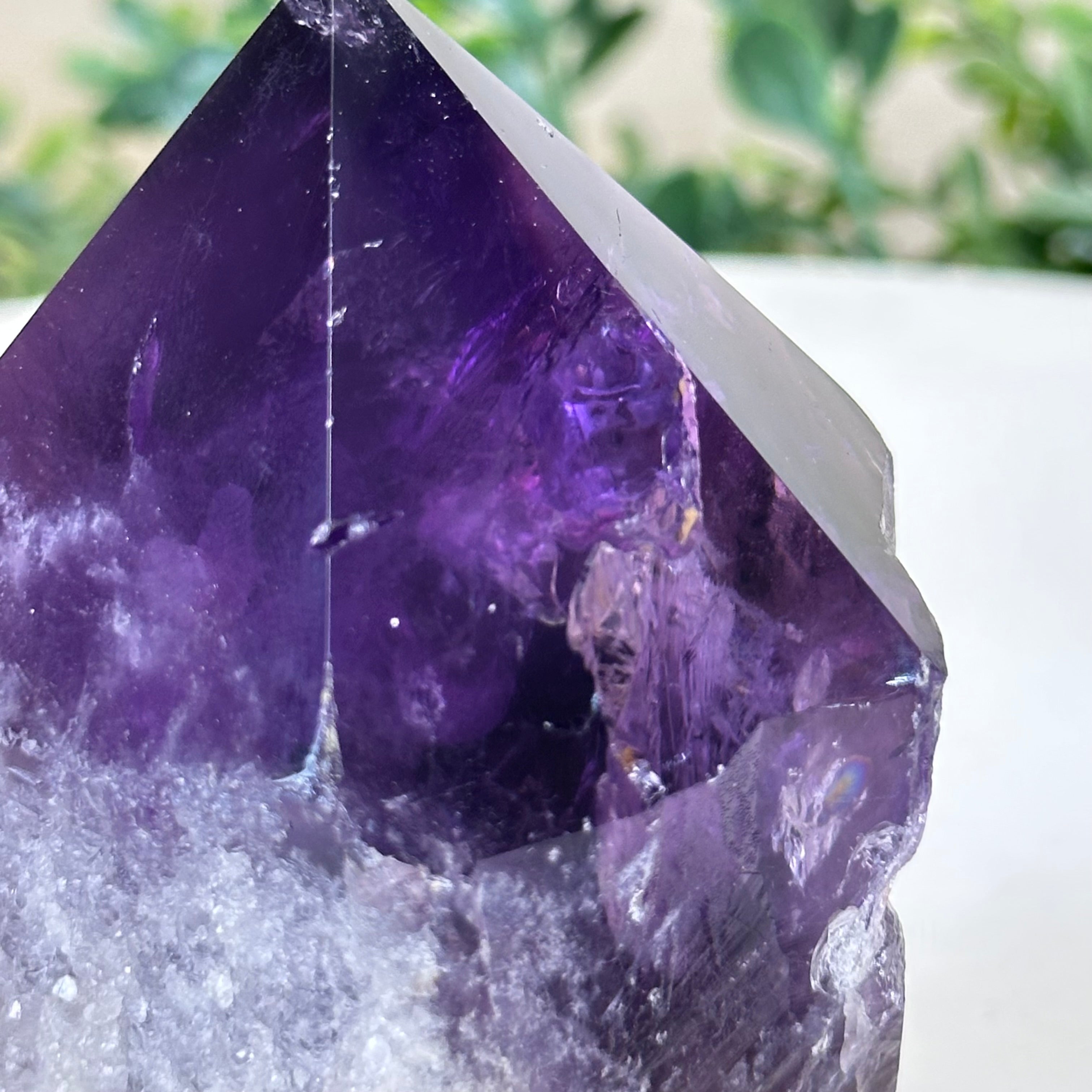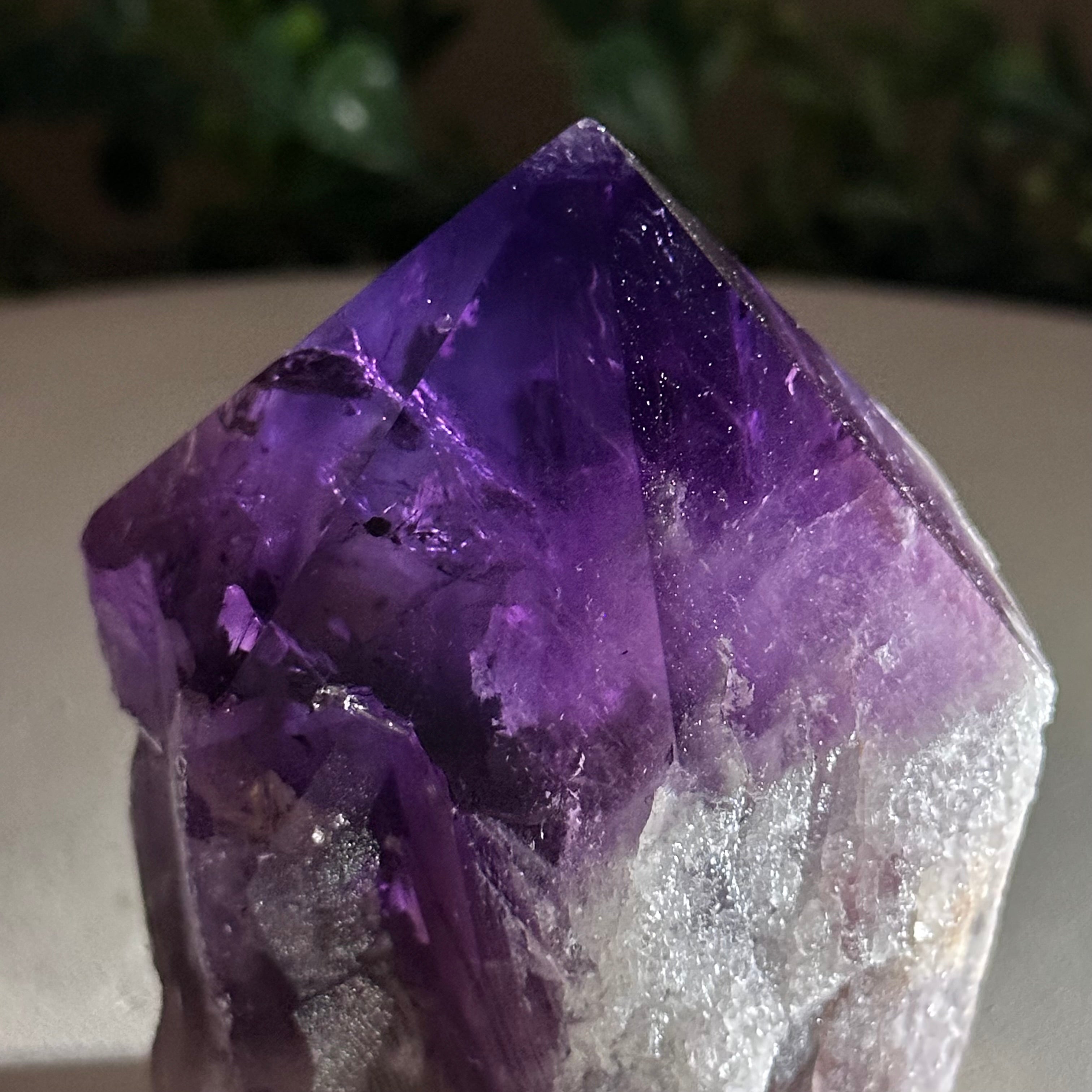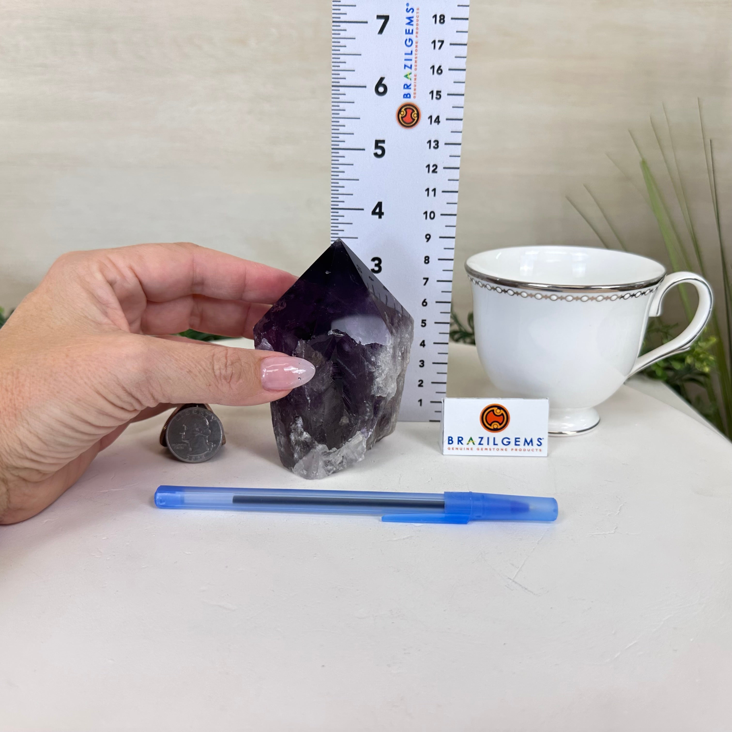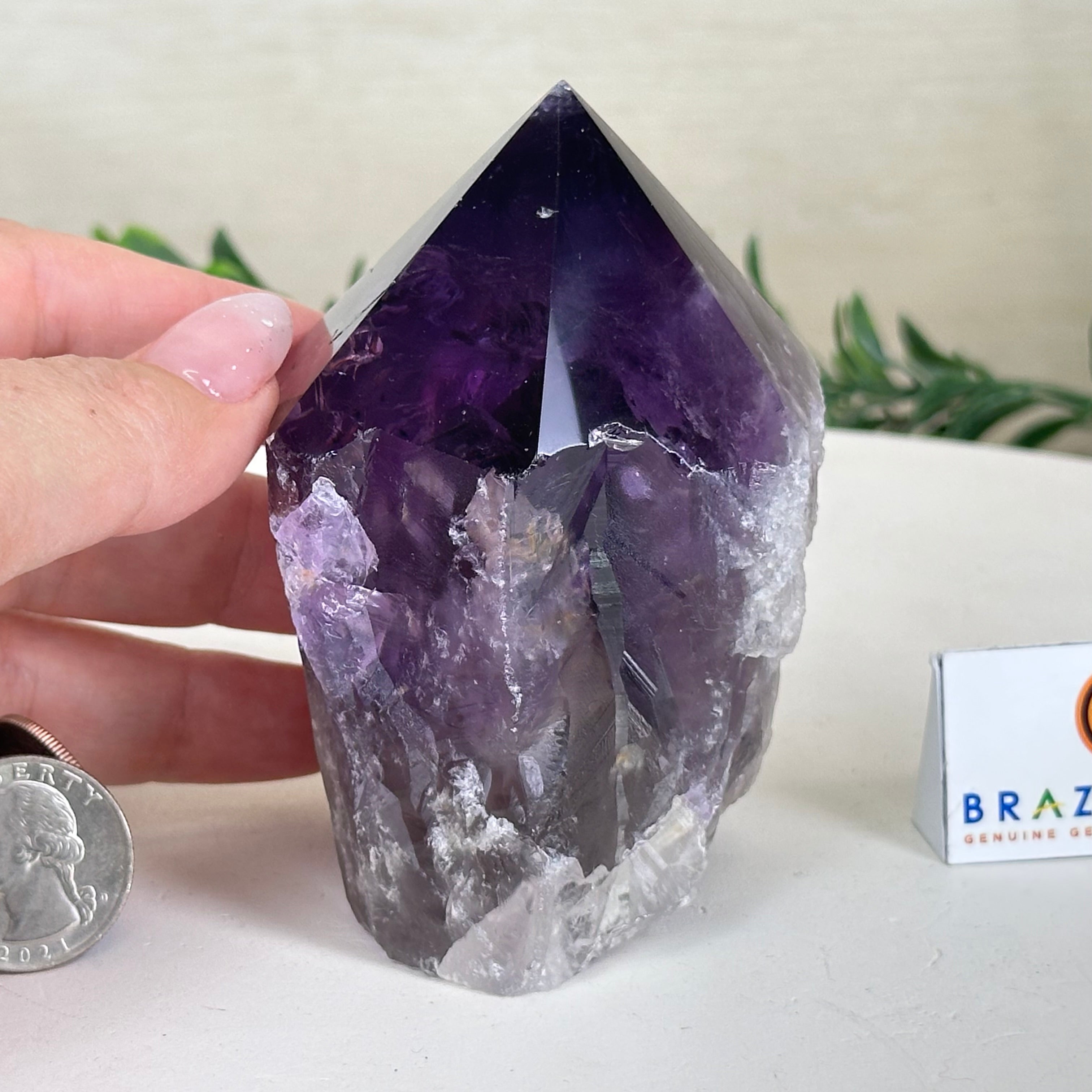 Elevate your spiritual rituals with Brazil Gems' Super Quality Polished Amethyst Crystal Foot & Point. Featuring deep purple tones, this exquisite crystal exudes incredible energy and exquisite artistry. Whether used in meditation or healing, it is a must-have for the refined crystal connoisseur. With its polished point, flat base, and raw side edges, this piece has a tactile and visual appeal, perfect to hold or display on a tabletop.