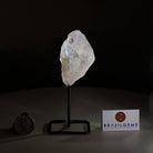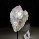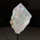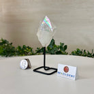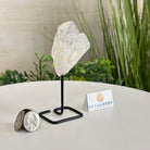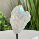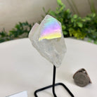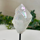 Enhance your home or sacred space with the multi-faceted beauty of this Angel Aura Quartz Point on a metal stand. This iridescent crystal has rough edges and a bright and captivating glow.