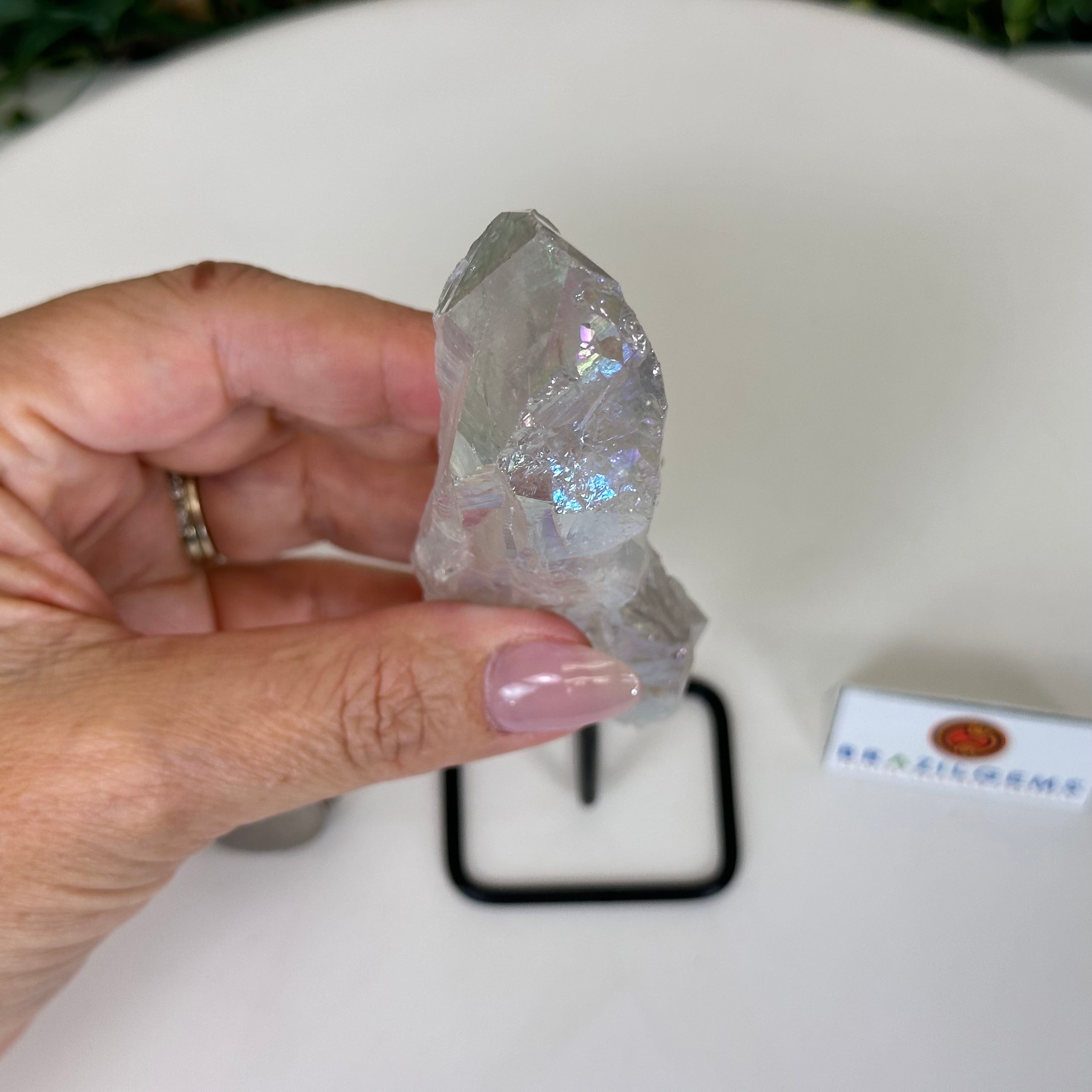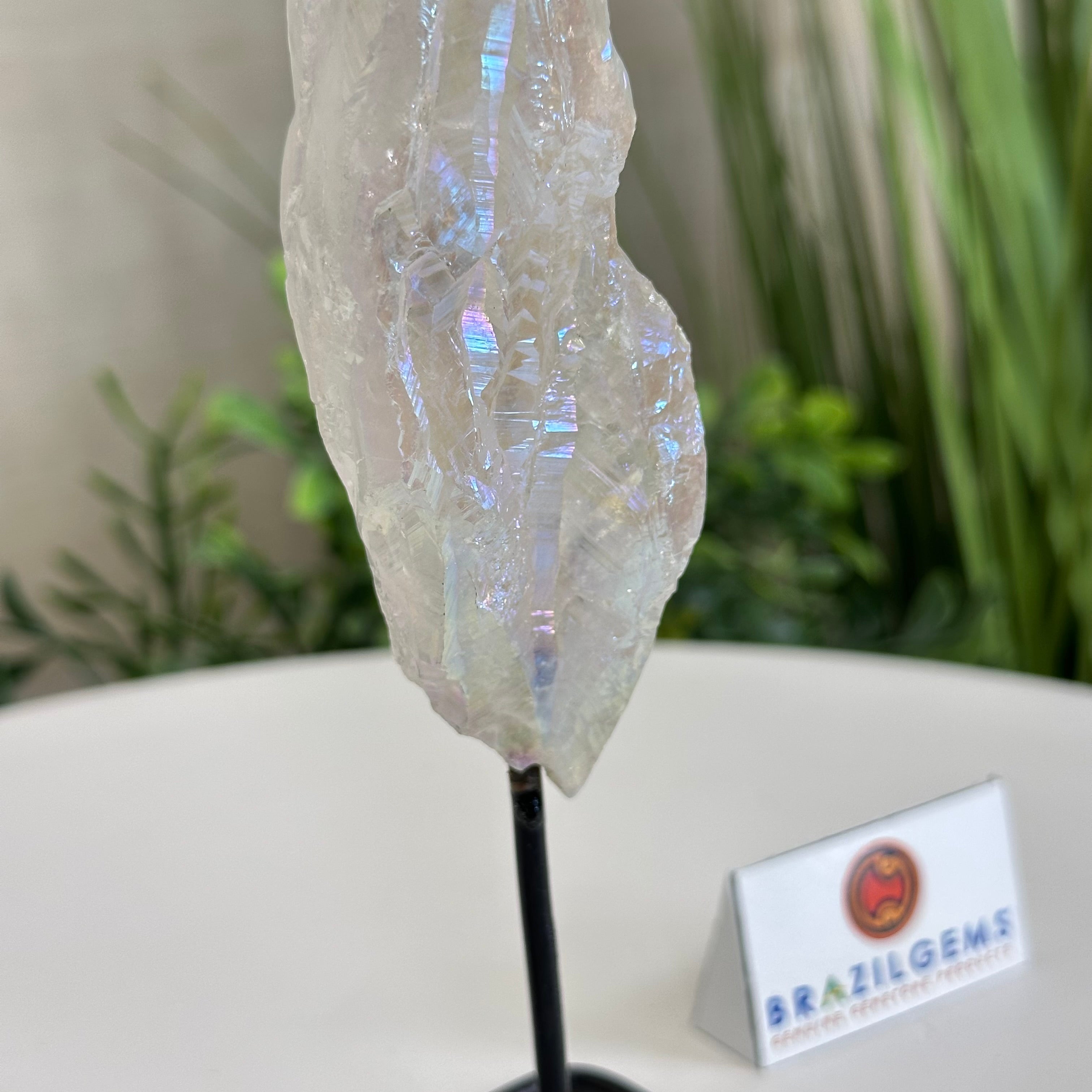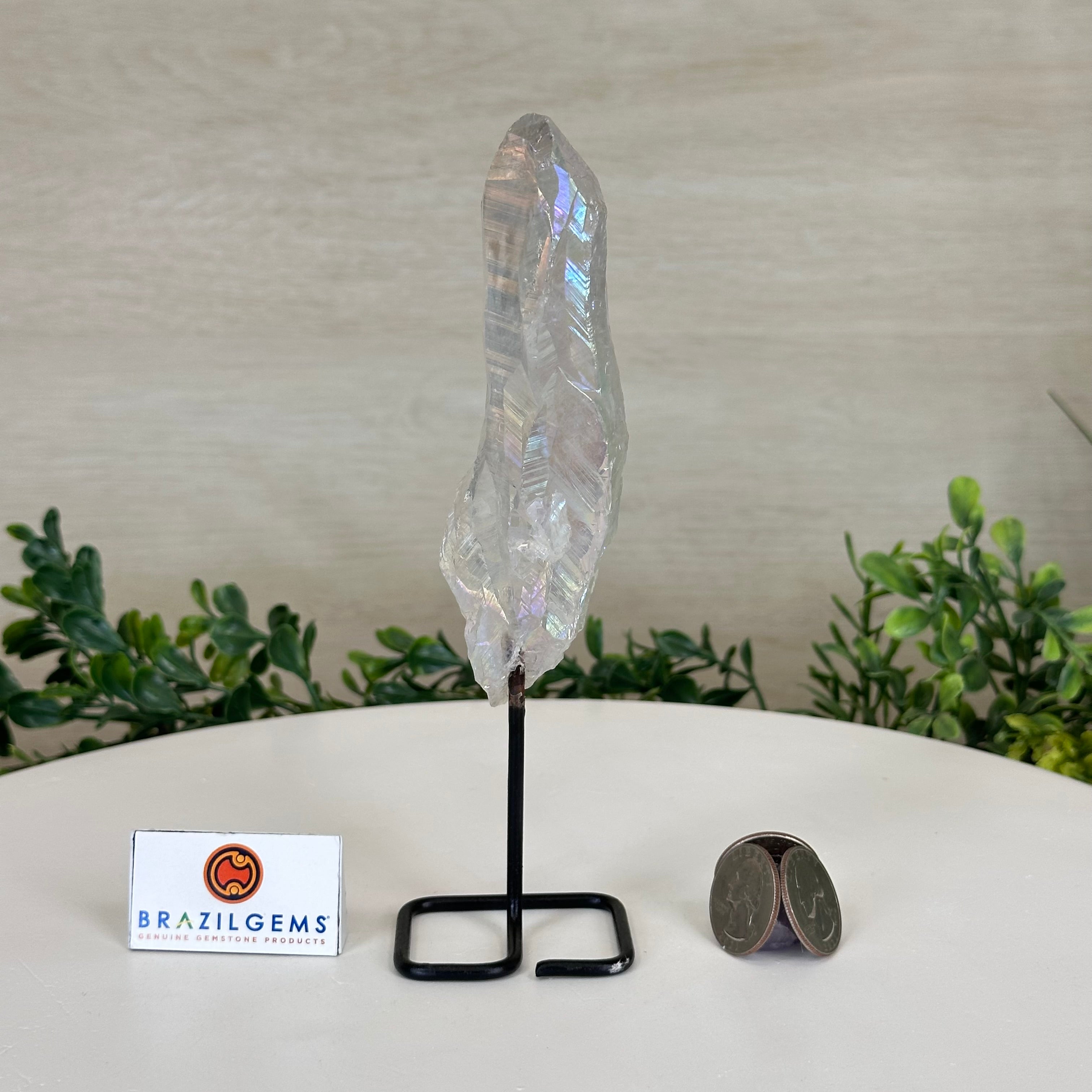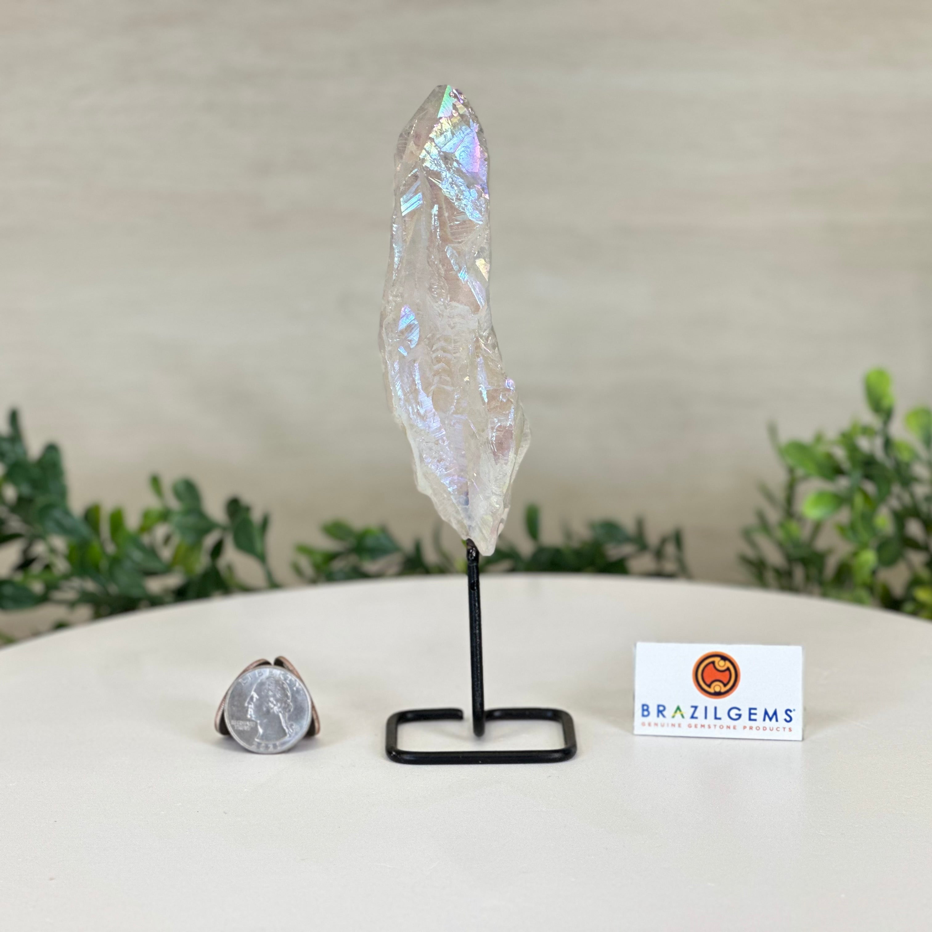Disclaimer: This is a natural gemstone crystal sold by Brazil Gems® as is and as you see it in its images and video. It is the exact one you will receive. It may contain natural imperfections and/or imperfections, broken edges and repairs from the extraction, mounting and aura-effect bonding processes. The crystal has a hole drilled into the bottom of it so it could be mounted onto its black-painted metal stand. The Angel Aura effect is achieved through a process called vacuum deposition where vaporized metals such as silver and/or platinum are bonded to the natural crystal in a vacuum chamber giving it that iridescent pearlized sheen. At Brazil Gems® we make every effort to get measurements as exact as possible but they are done by human hands and eyes and therefore may have minor discrepancies.