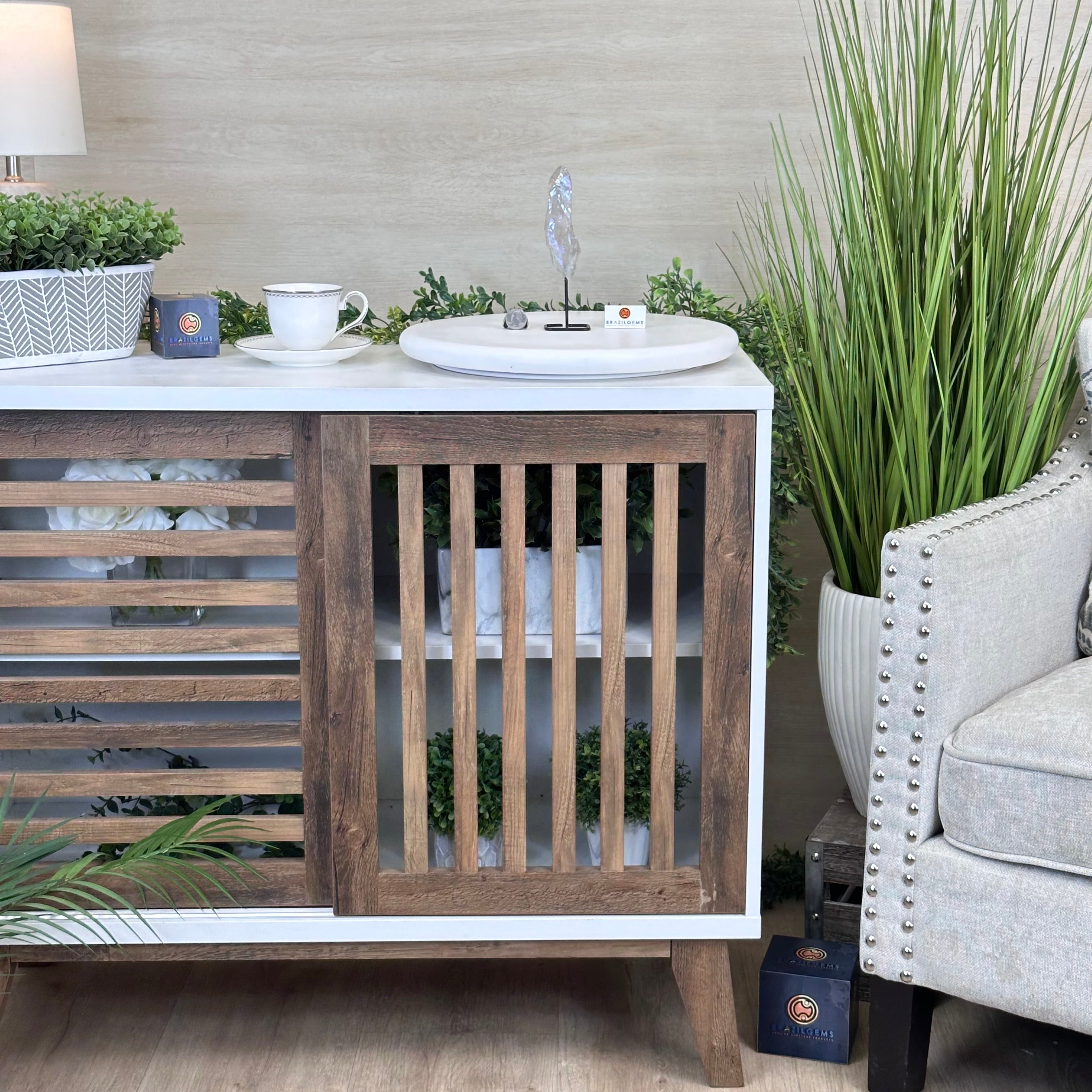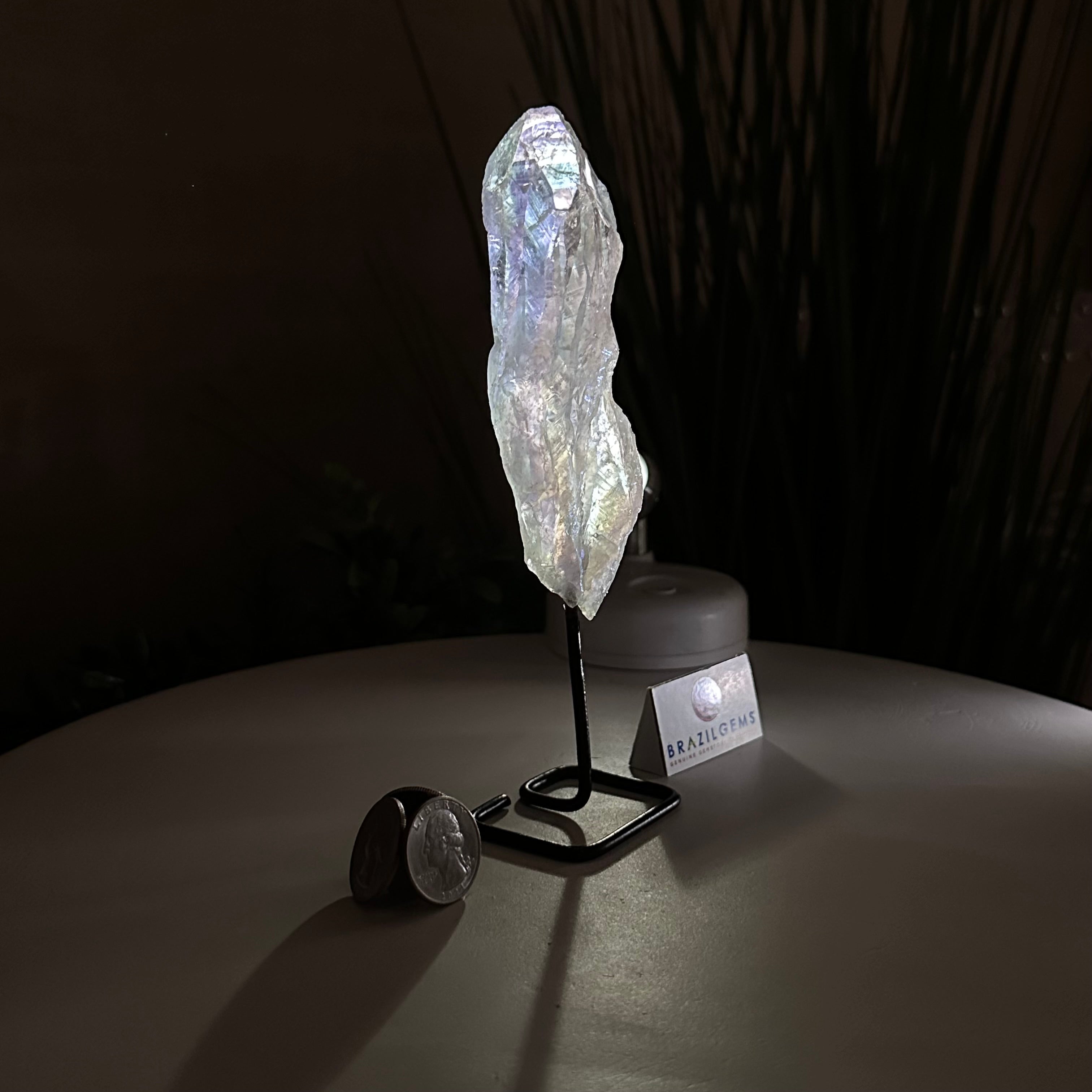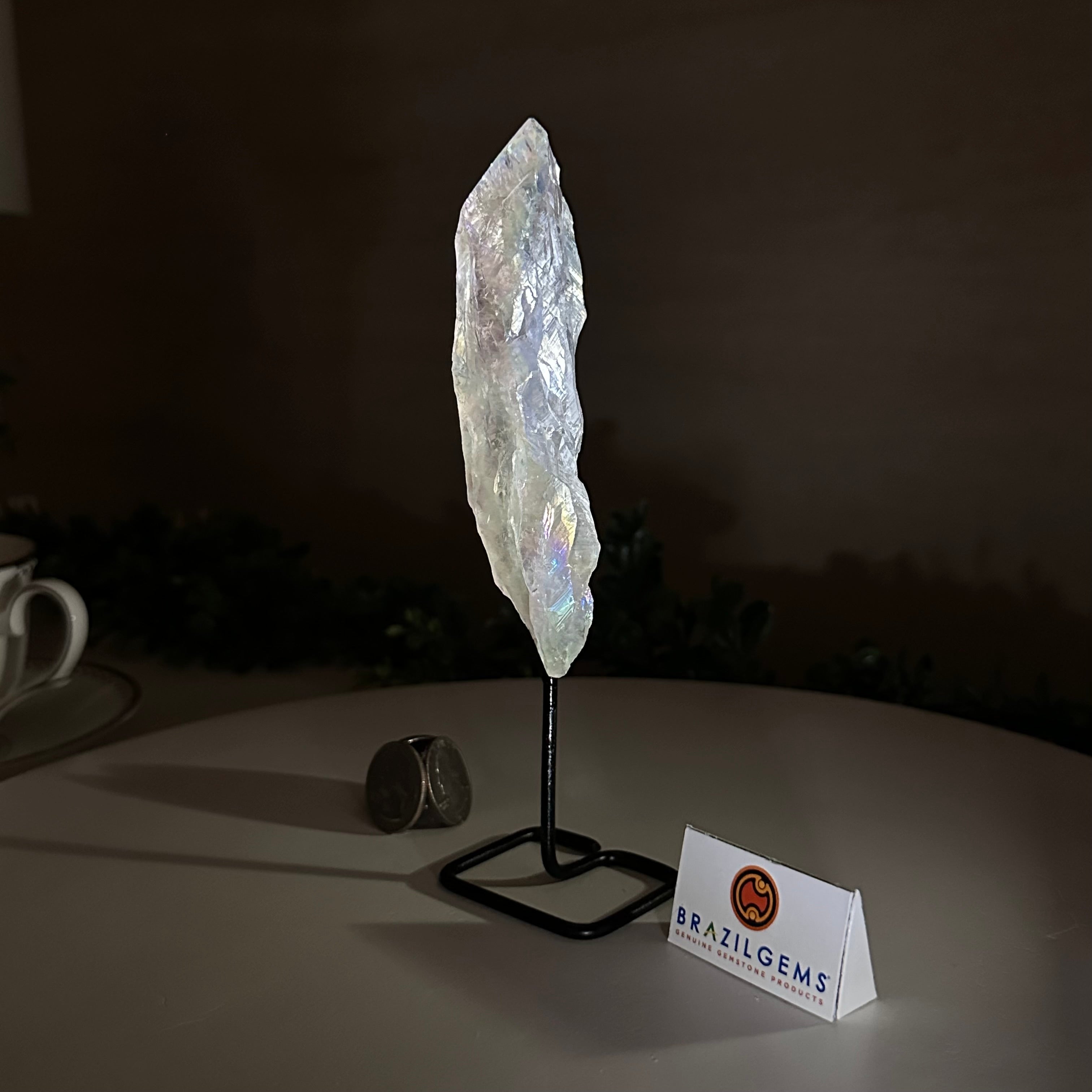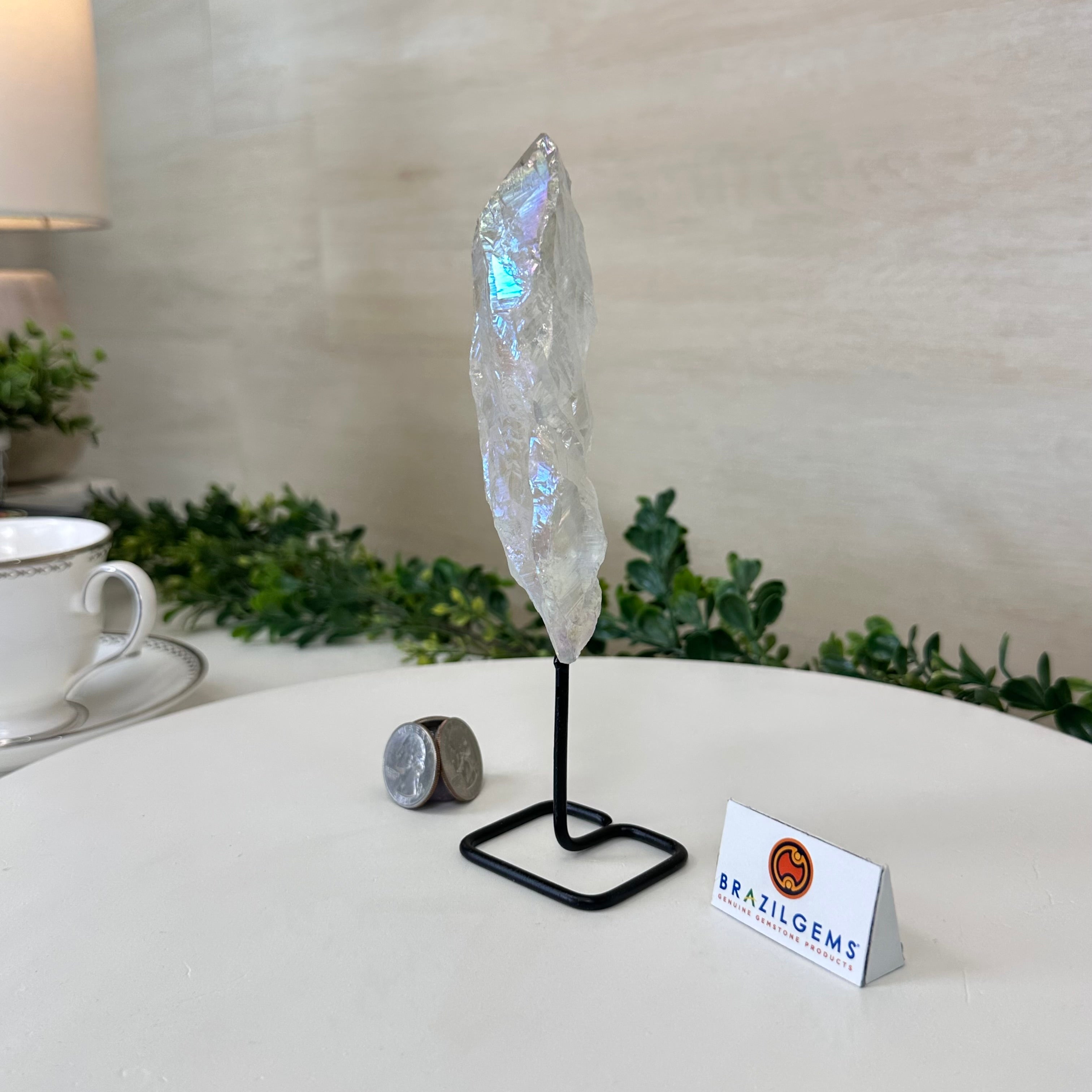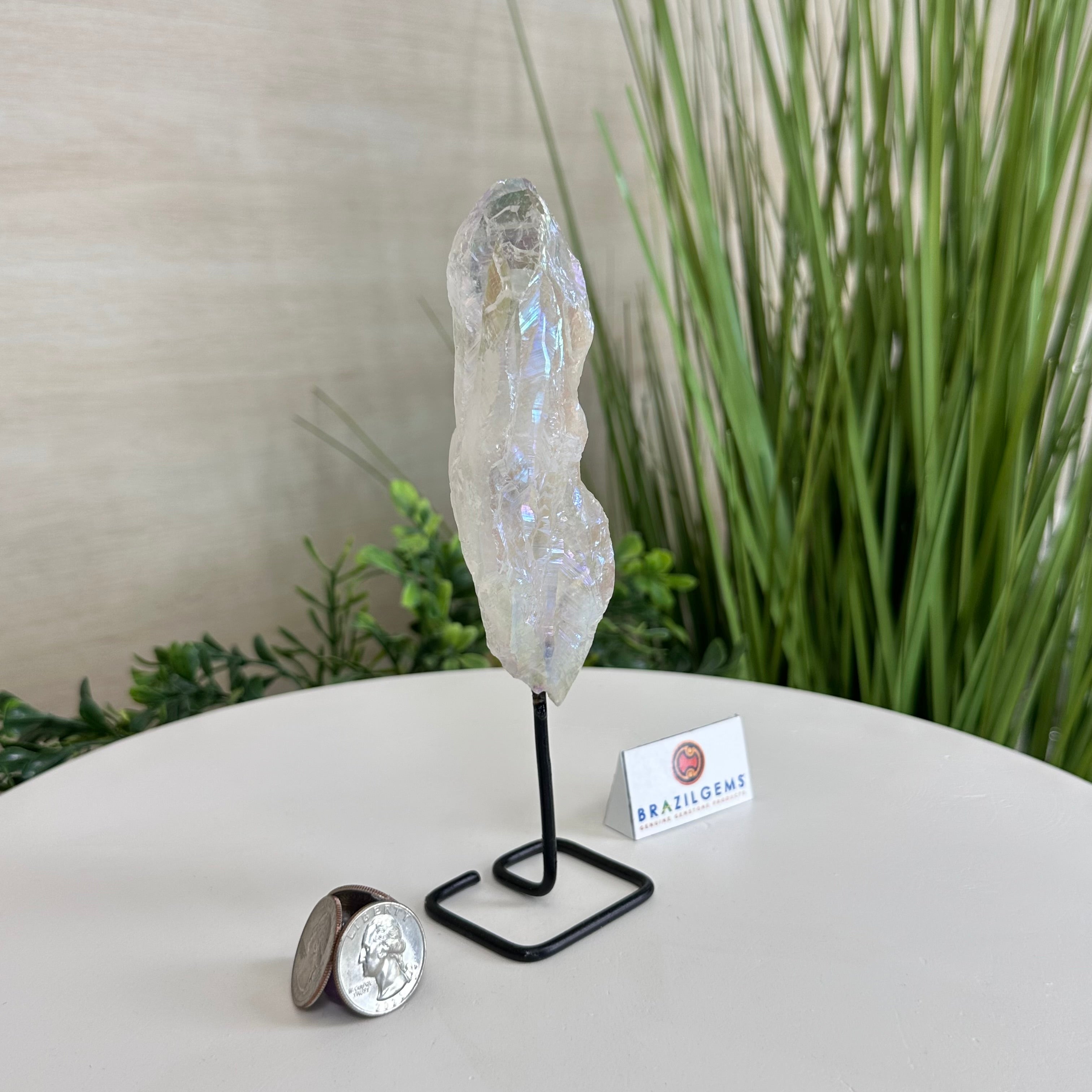 Disclaimer: This is a natural gemstone crystal sold by Brazil Gems® as is and as you see it in its images and video. It is the exact one you will receive. It may contain natural imperfections and/or imperfections, broken edges and repairs from the extraction, mounting and aura-effect bonding processes. The crystal has a hole drilled into the bottom of it so it could be mounted onto its black-painted metal stand. The Angel Aura effect is achieved through a process called vacuum deposition where vaporized metals such as silver and/or platinum are bonded to the natural crystal in a vacuum chamber giving it that iridescent pearlized sheen. At Brazil Gems® we make every effort to get measurements as exact as possible but they are done by human hands and eyes and therefore may have minor discrepancies.