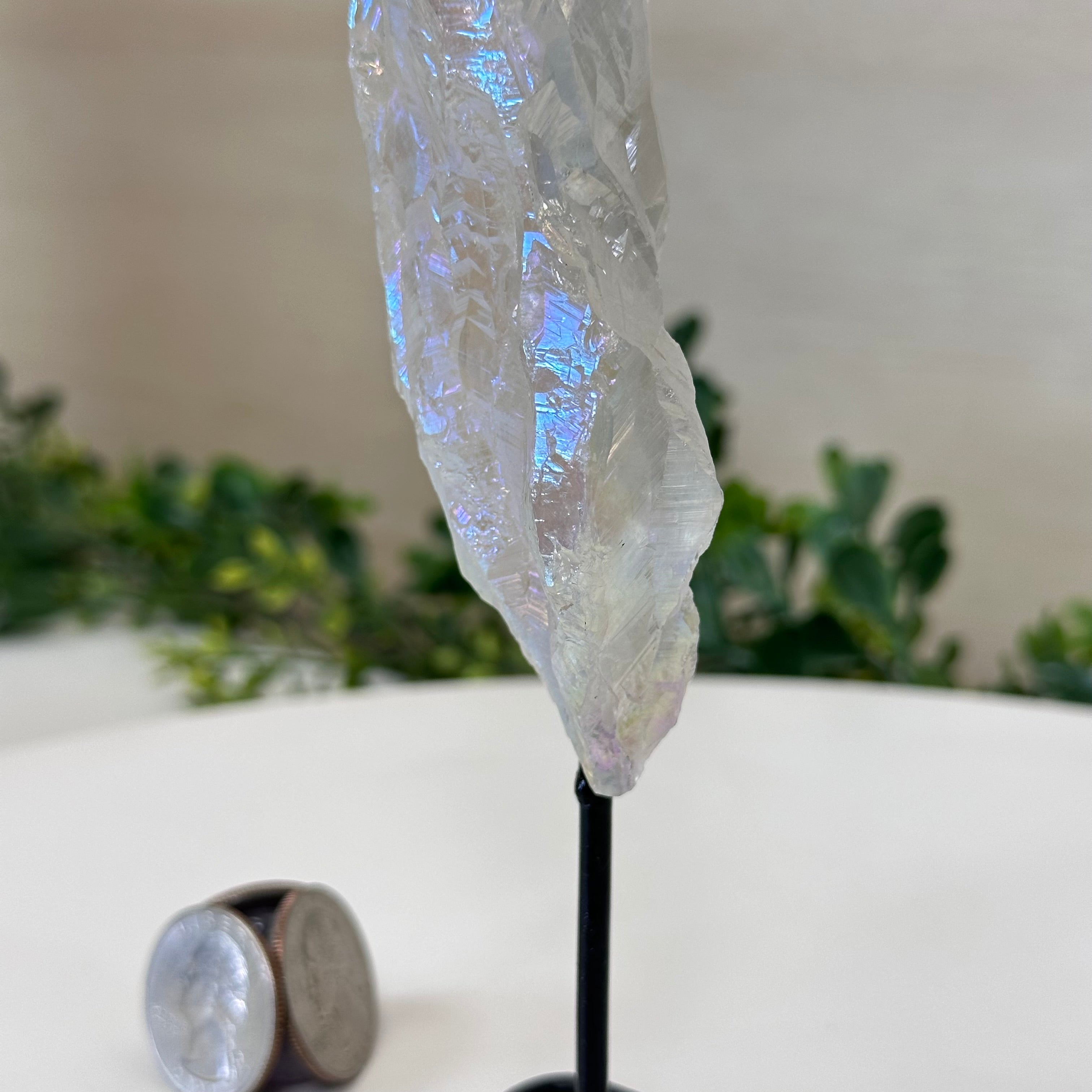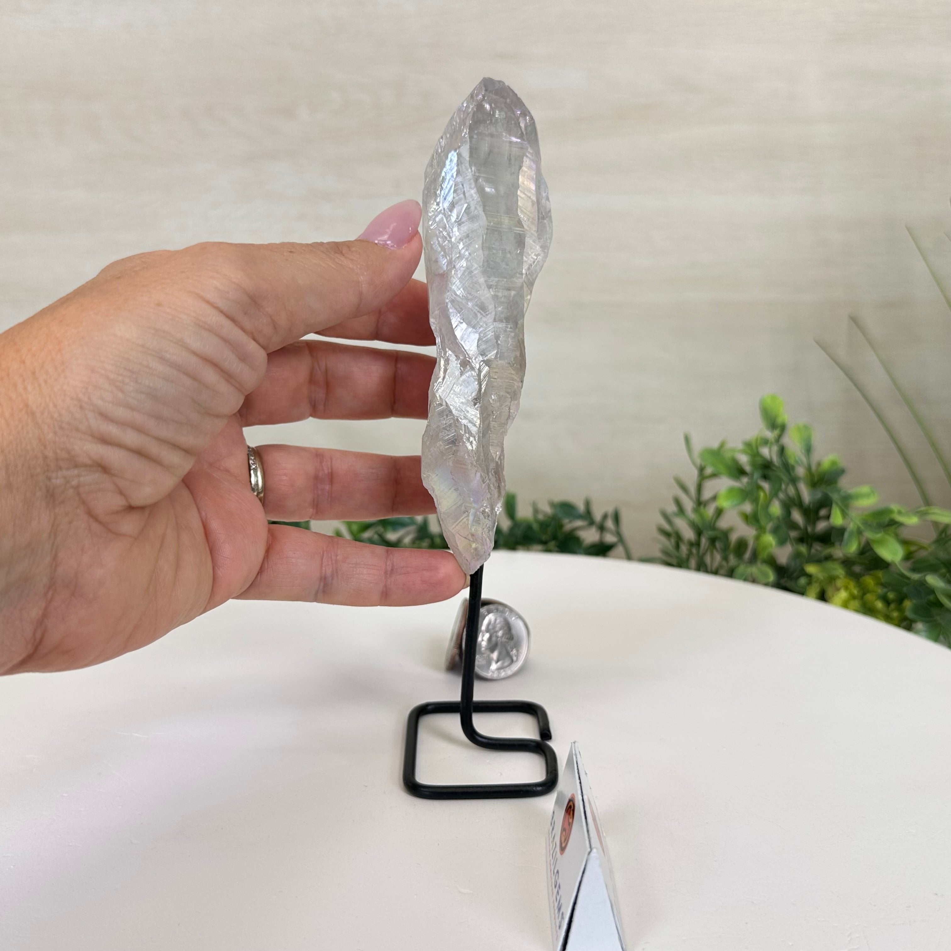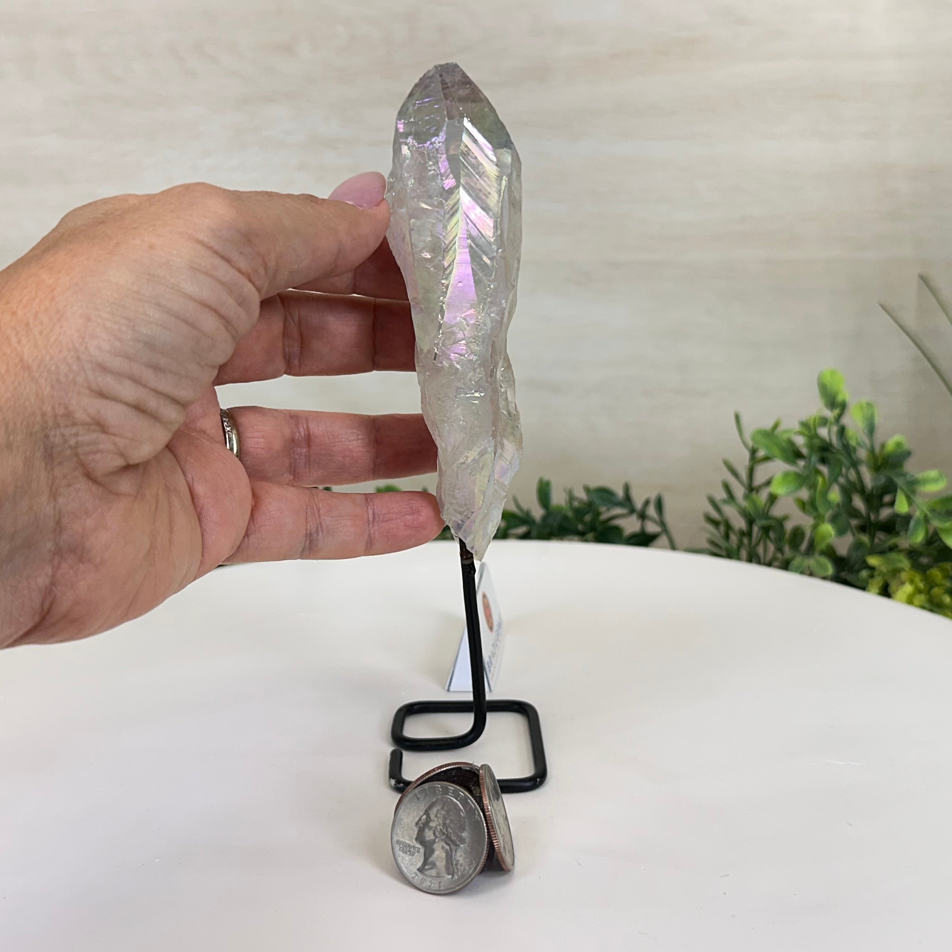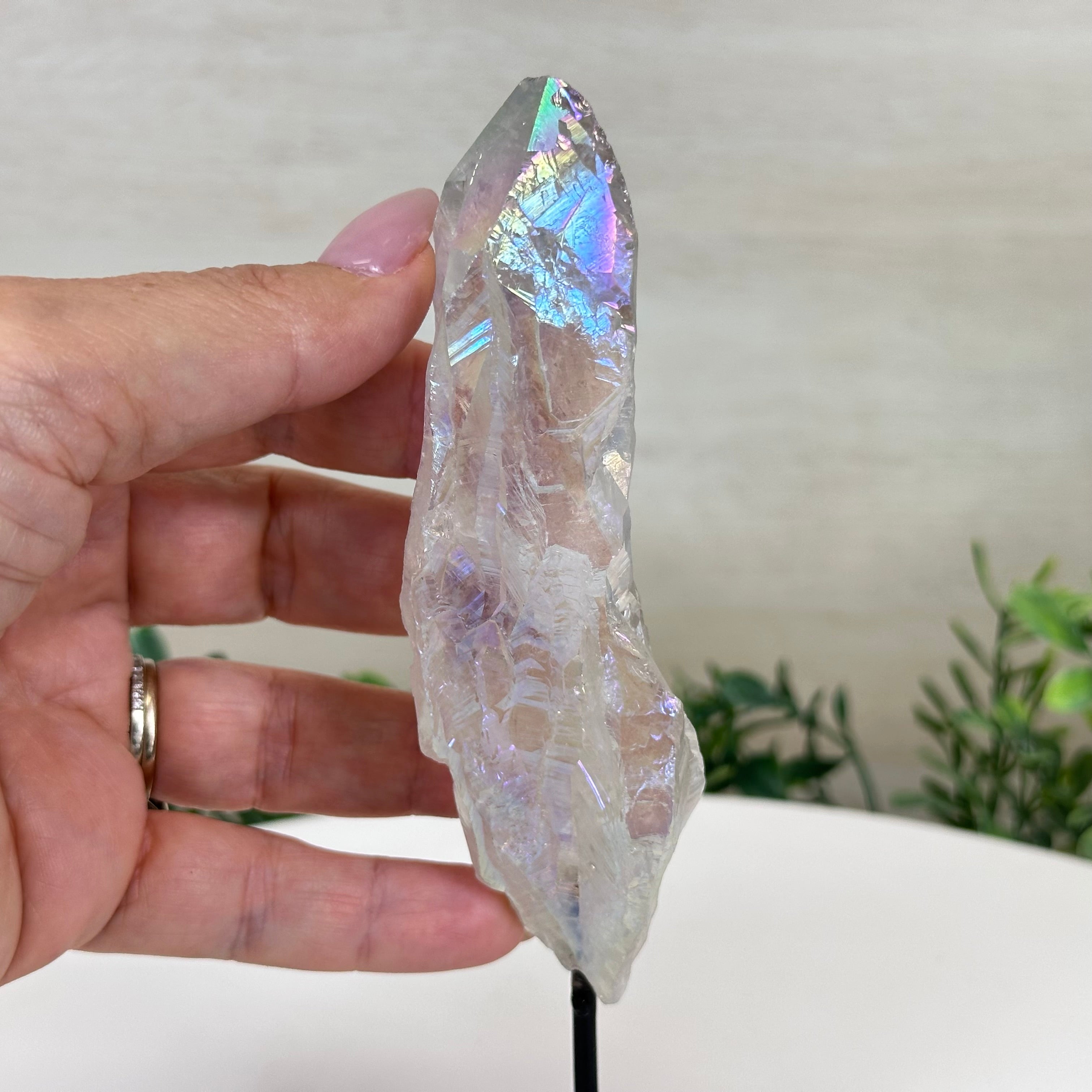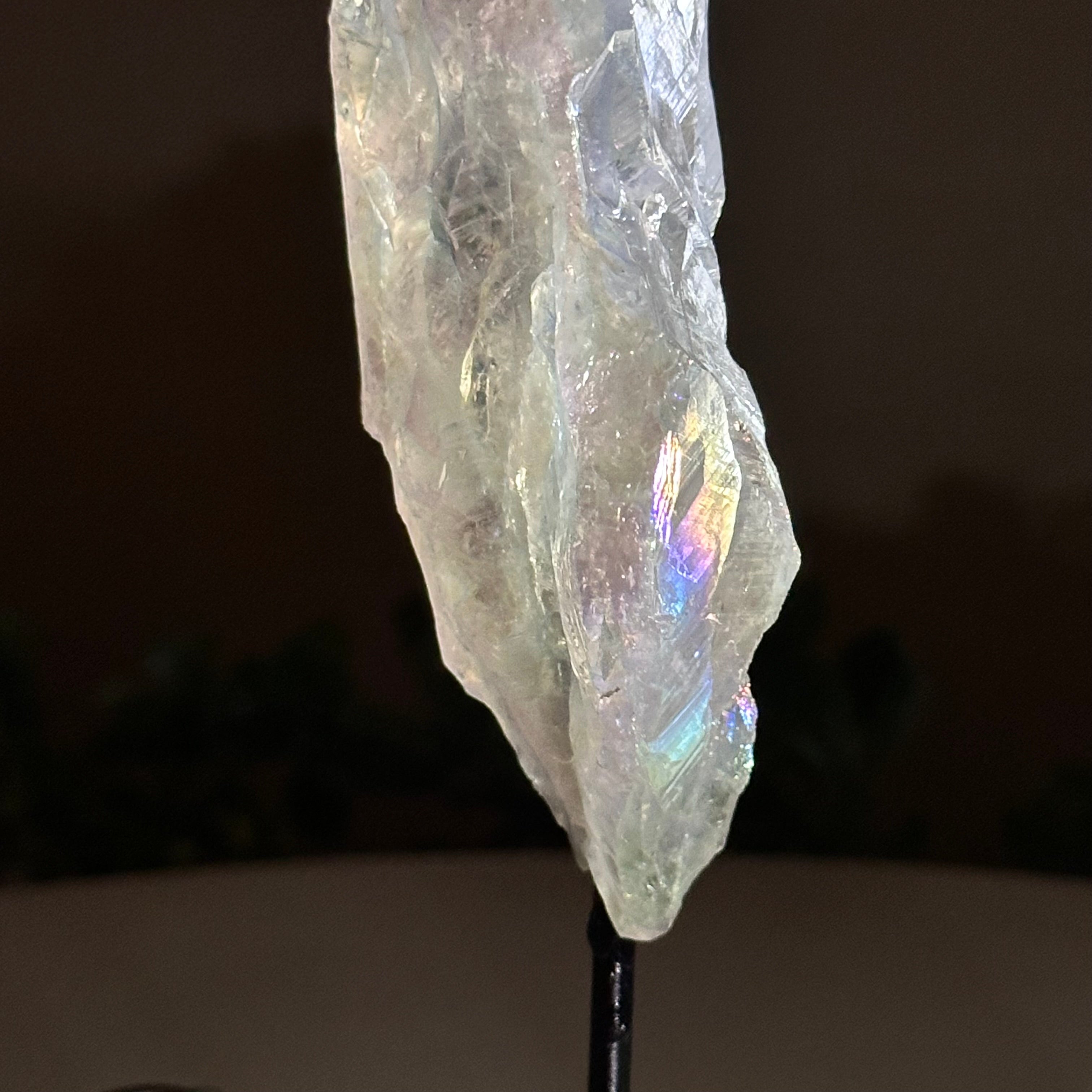 Enhance your home or sacred space with the multi-faceted beauty of this Angel Aura Quartz Point on a metal stand. This iridescent crystal has rough edges and a bright and captivating glow.