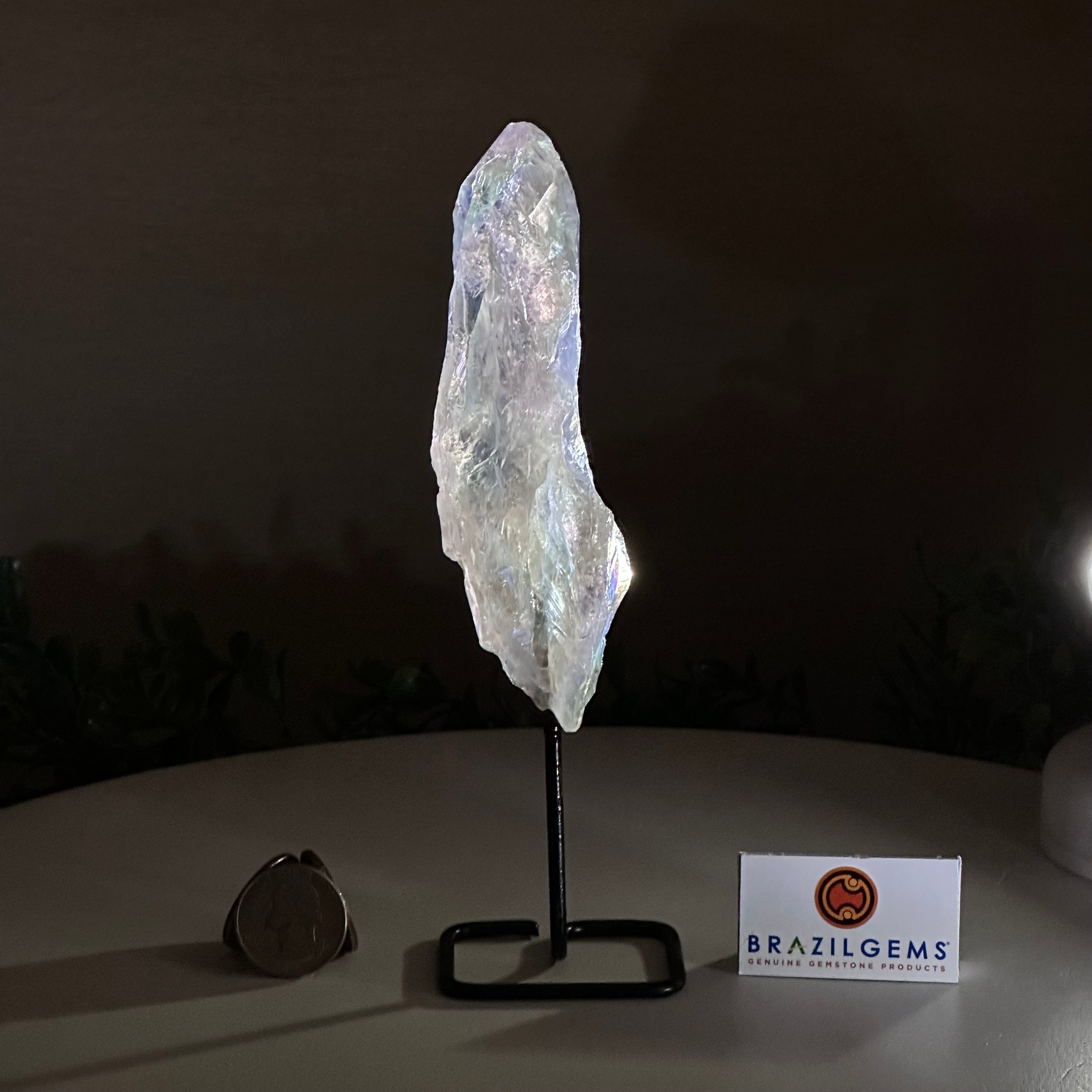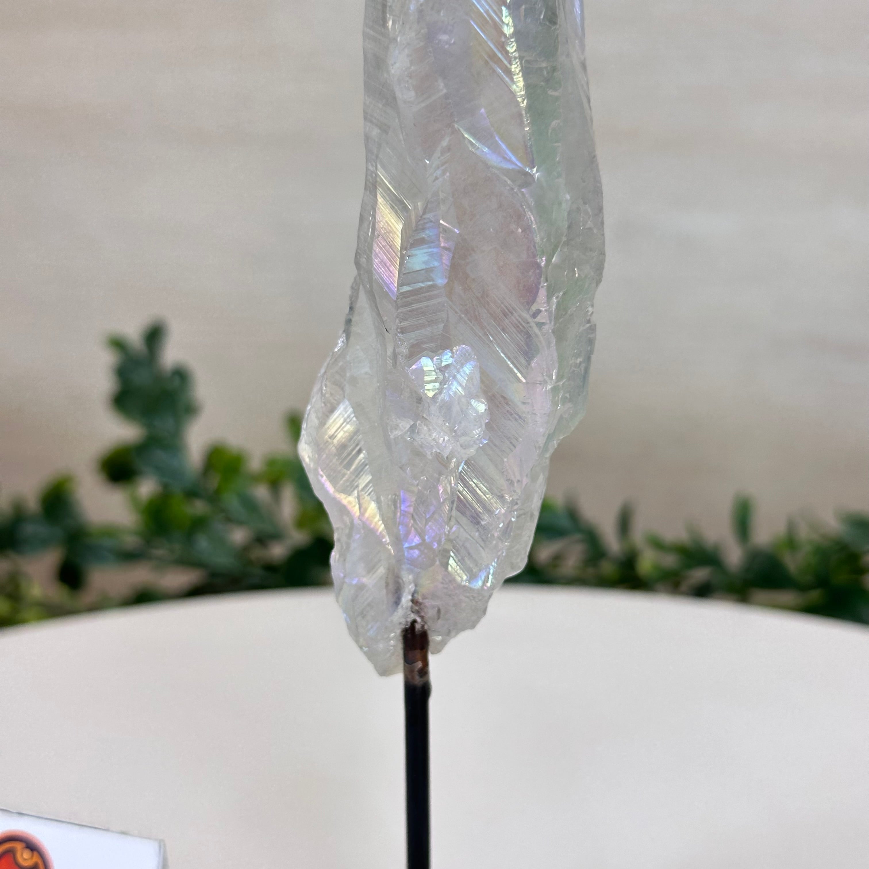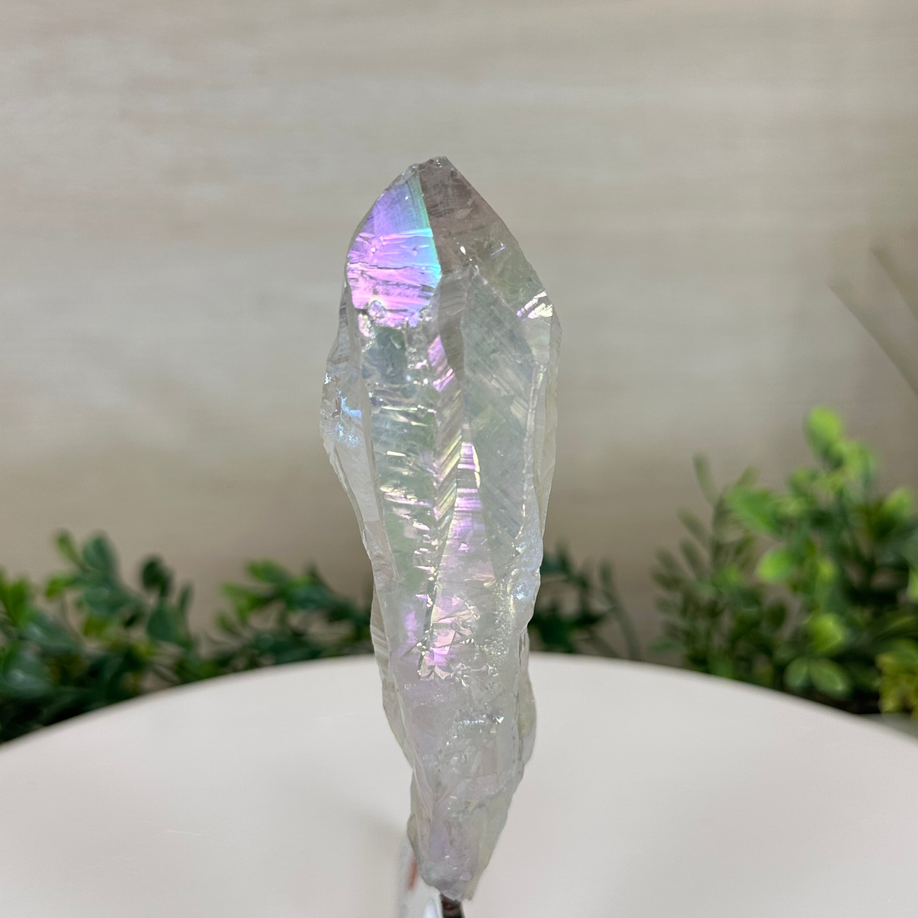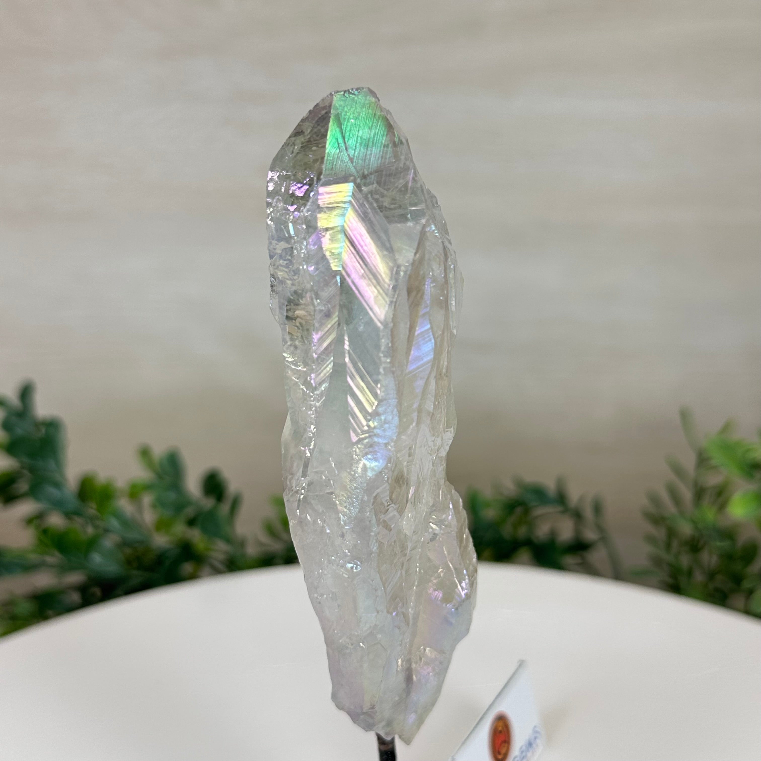 Enhance your home or sacred space with the multi-faceted beauty of this Angel Aura Quartz Point on a metal stand. This iridescent crystal has rough edges and a bright and captivating glow.