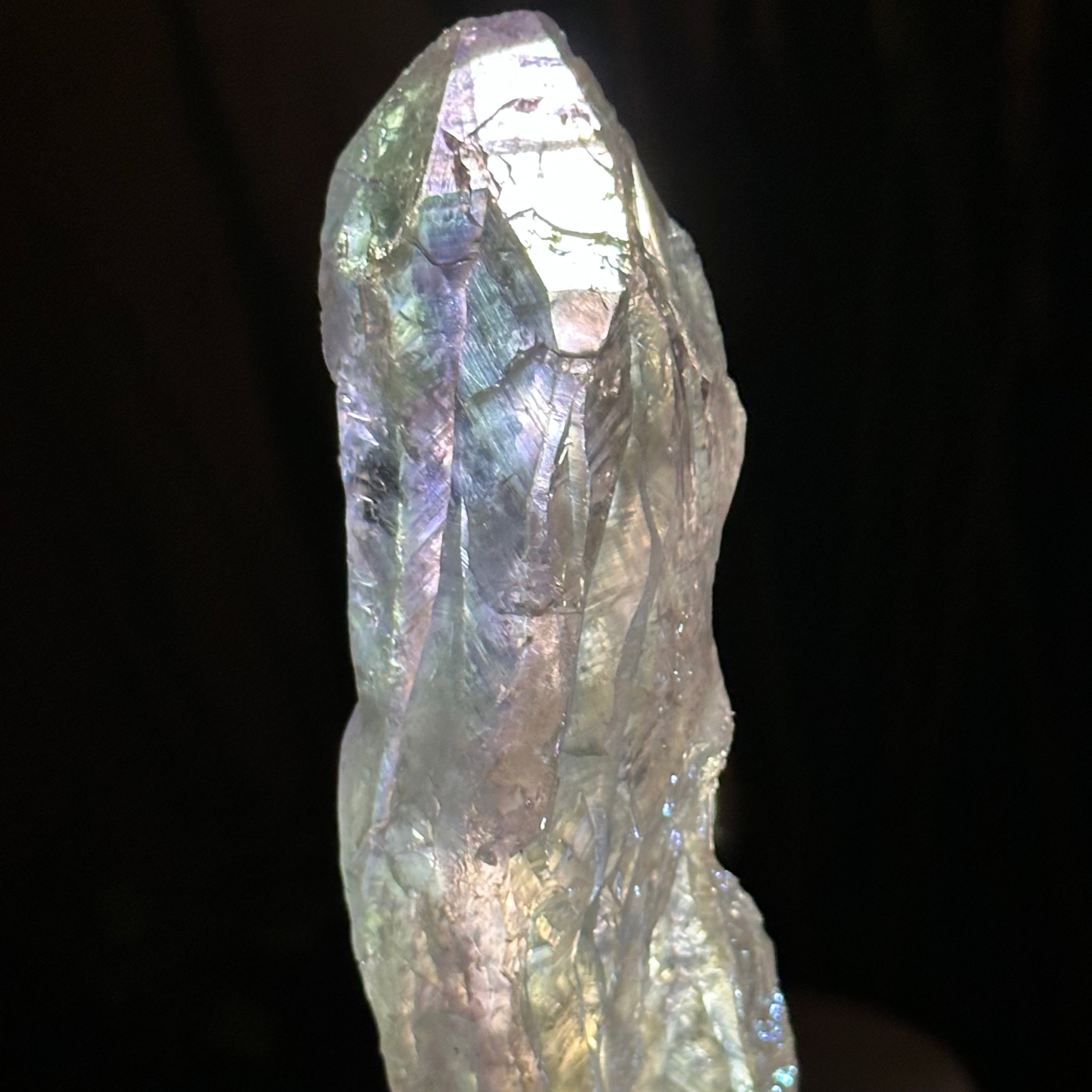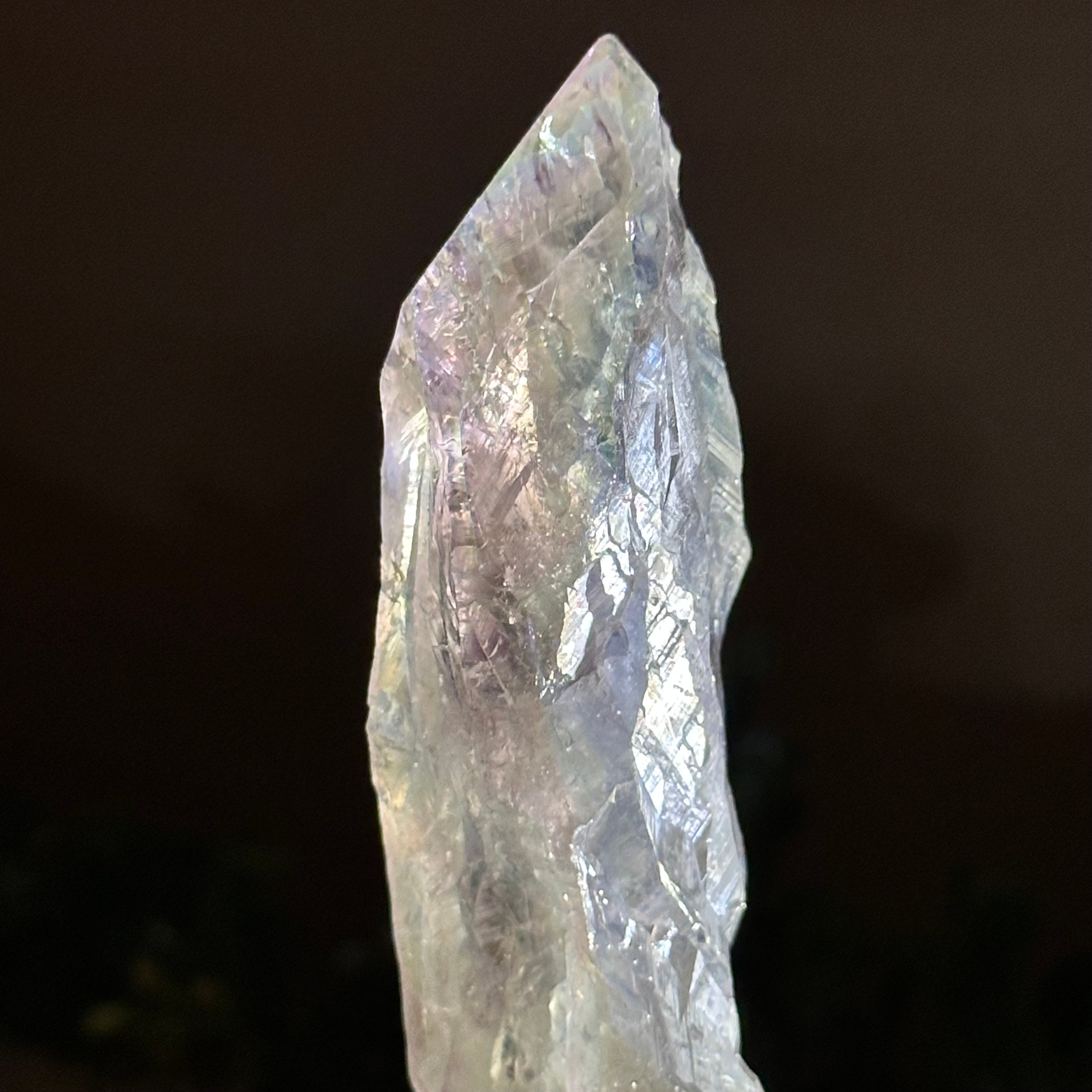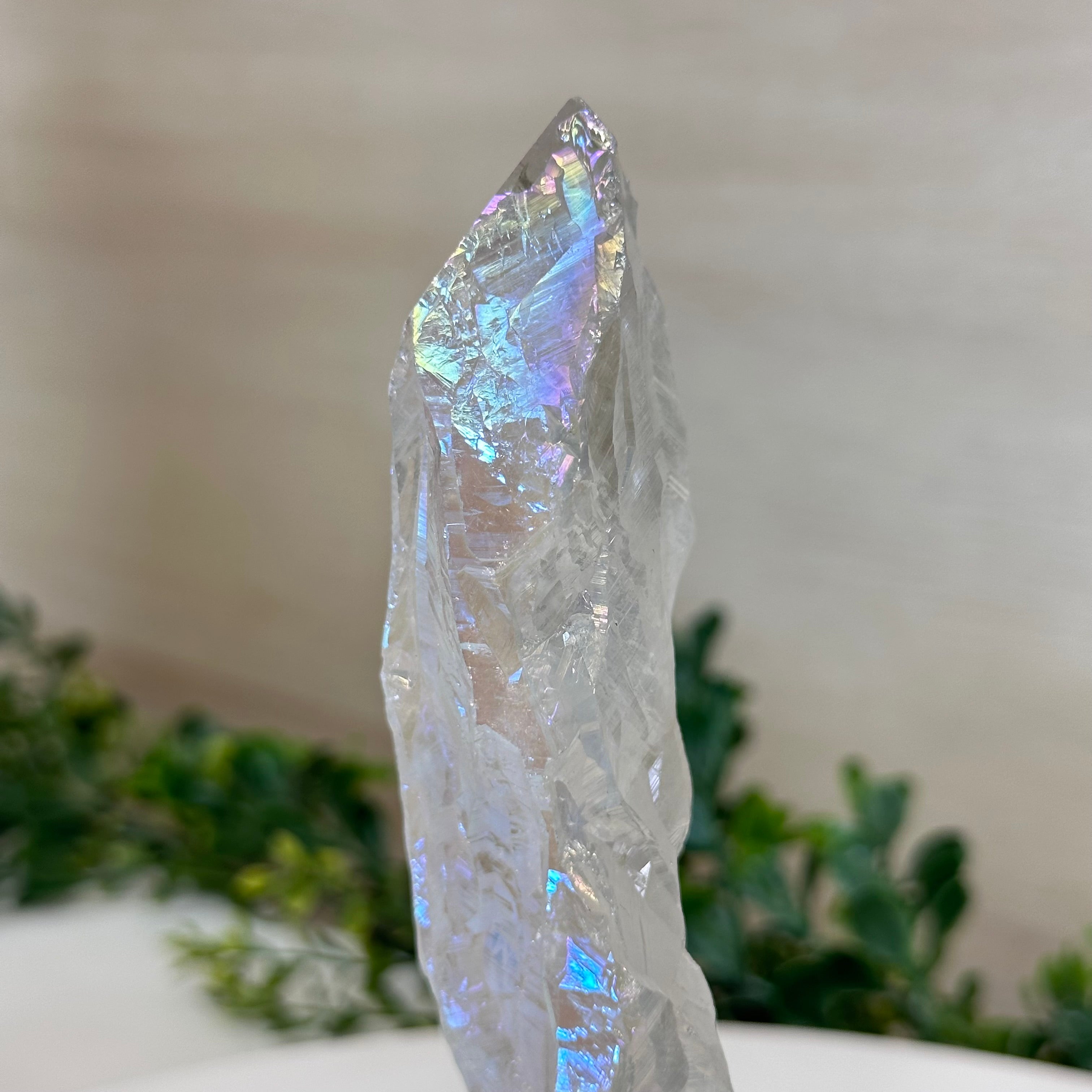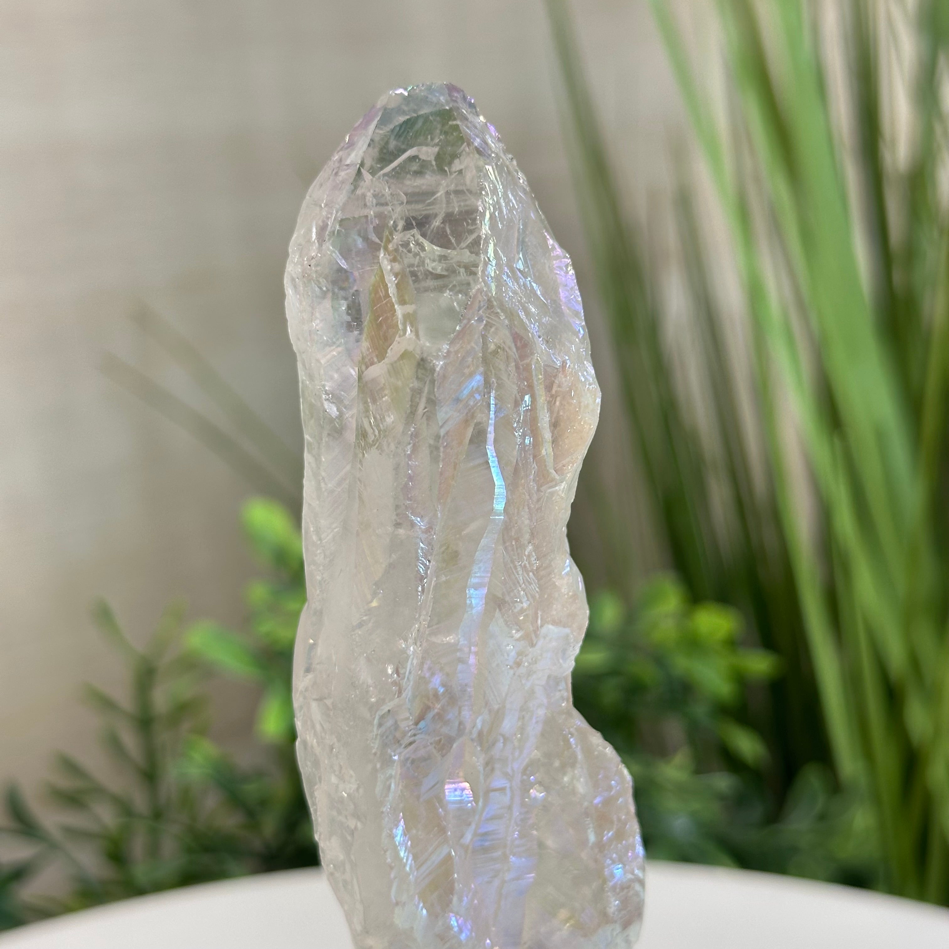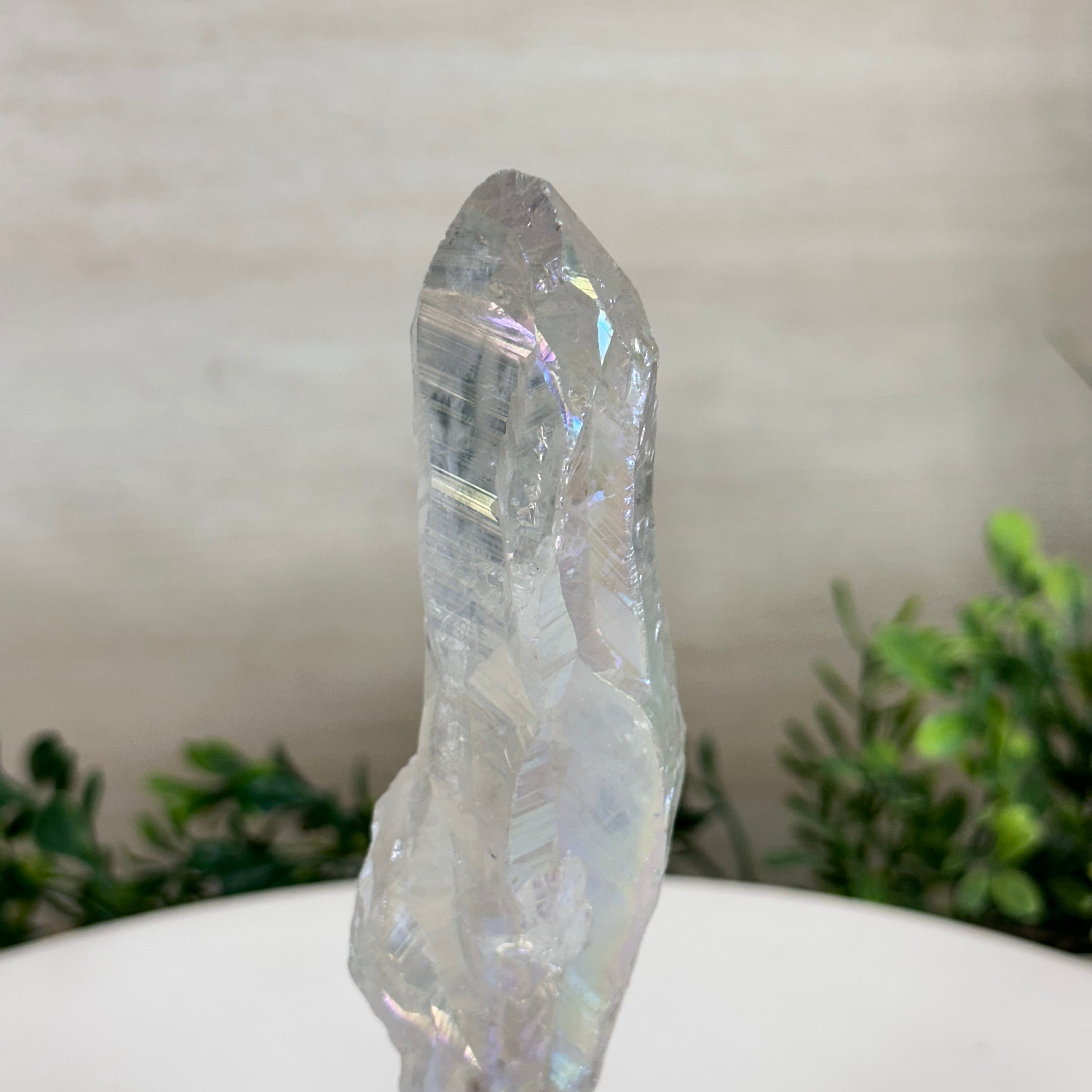 Enhance your home or sacred space with the multi-faceted beauty of this Angel Aura Quartz Point on a metal stand. This iridescent crystal has rough edges and a bright and captivating glow.