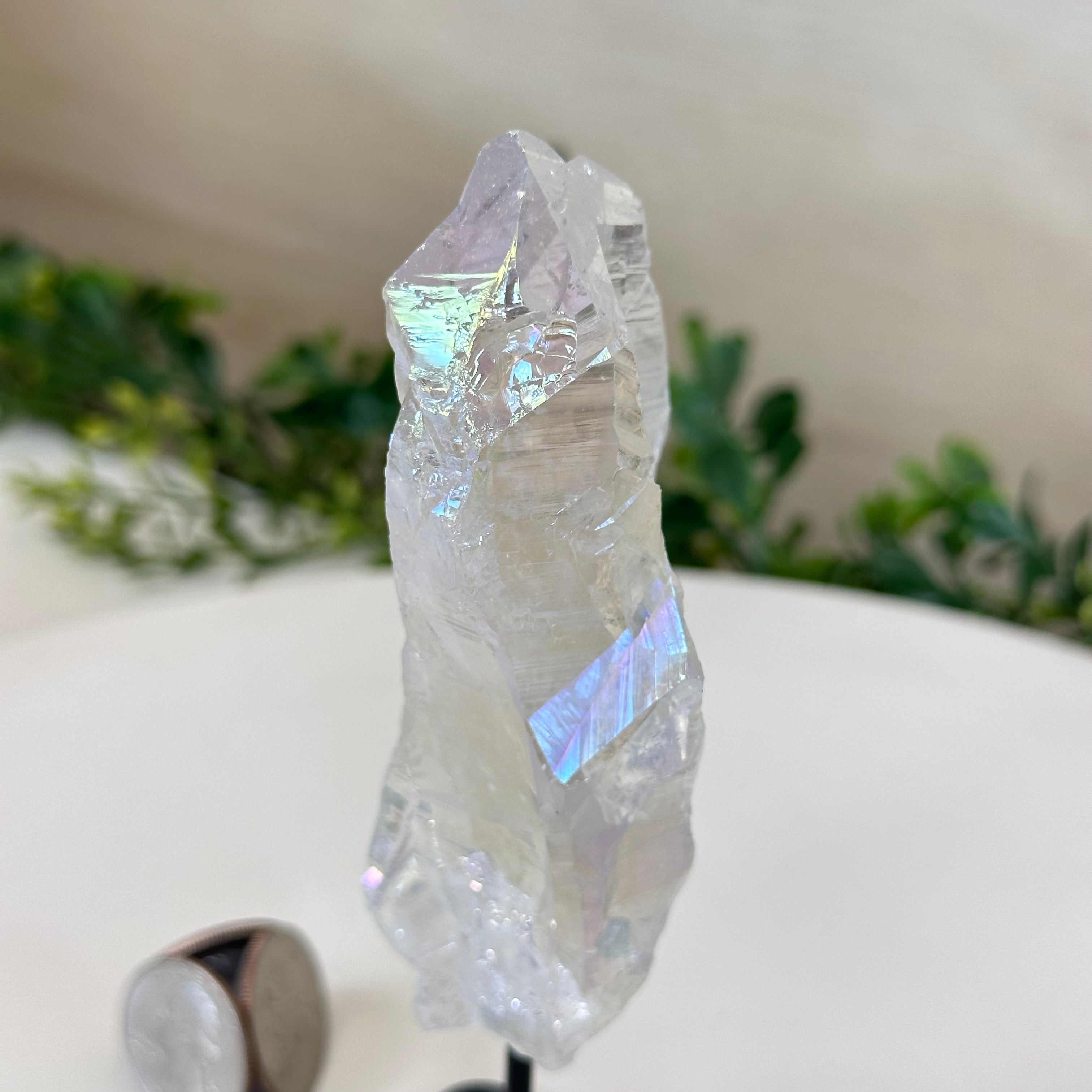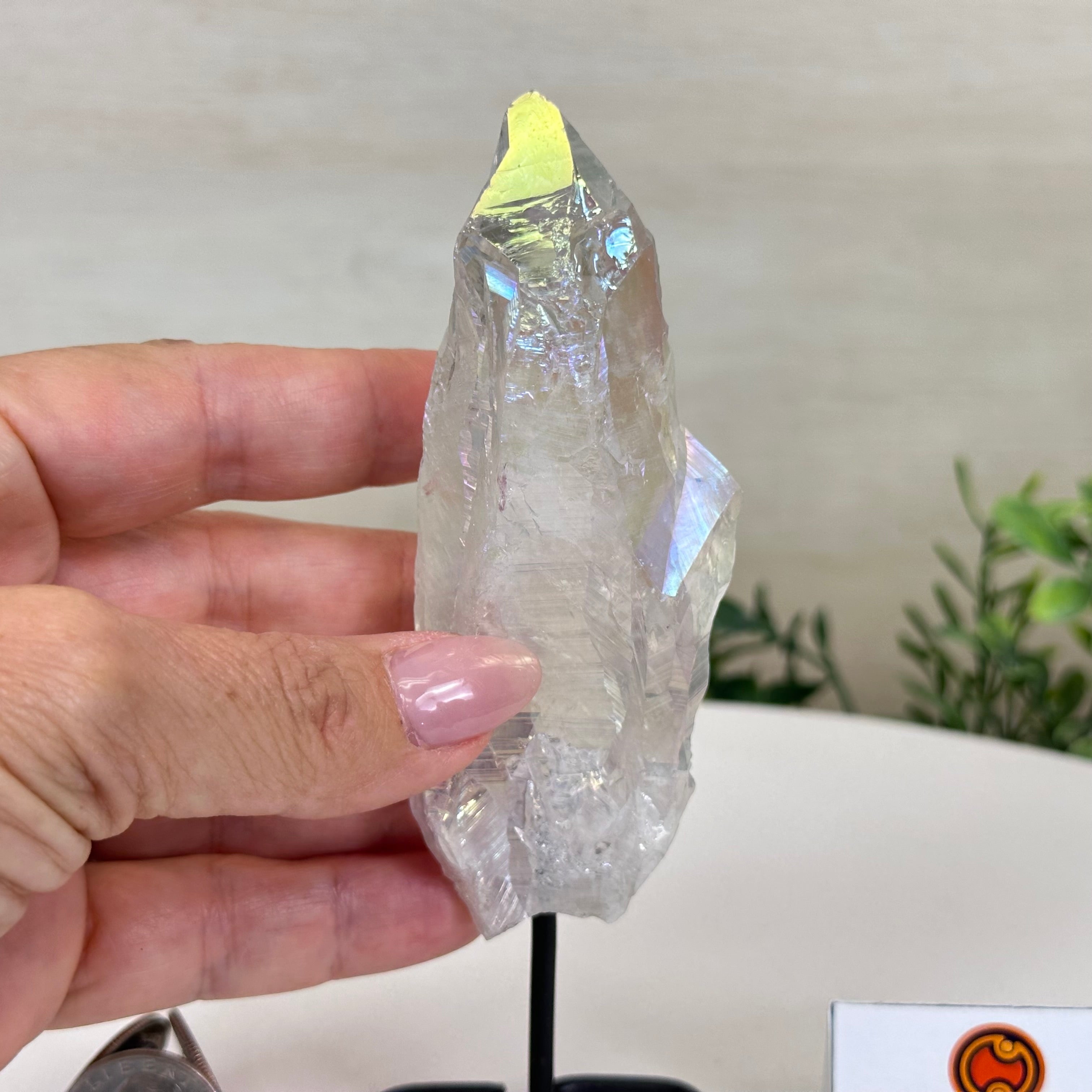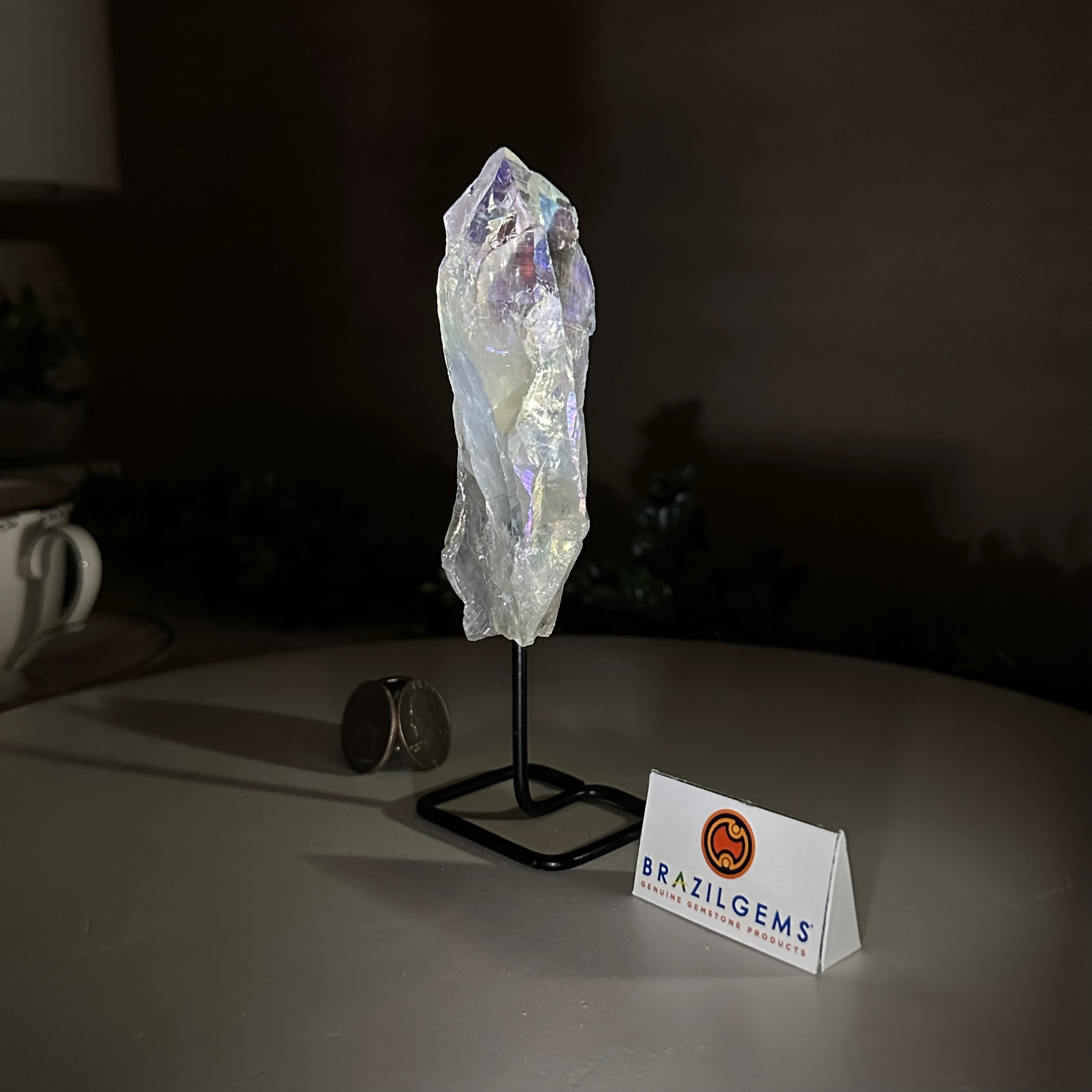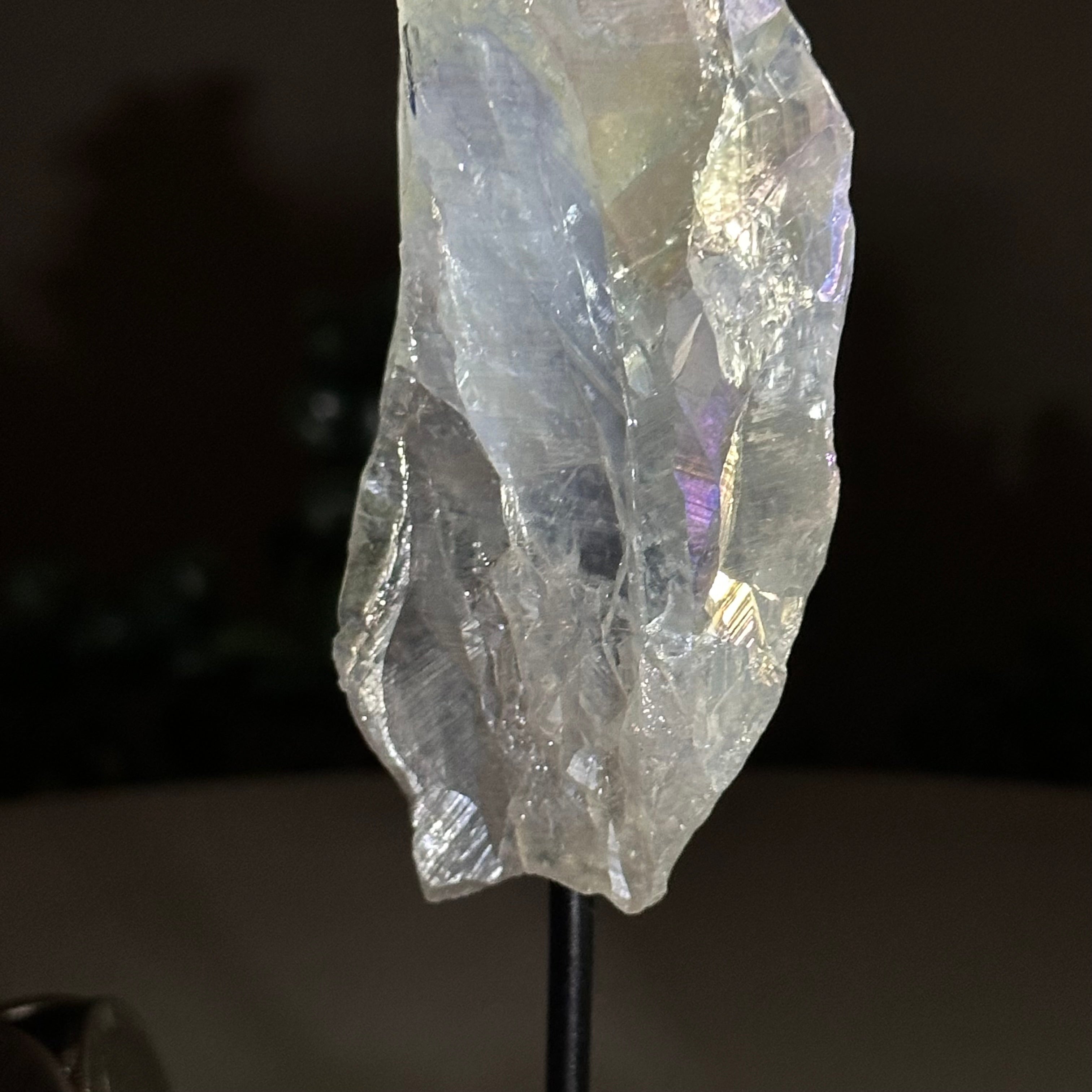 Enhance your home or sacred space with the multi-faceted beauty of this Angel Aura Quartz Point on a metal stand. This iridescent crystal has rough edges and a bright and captivating glow.