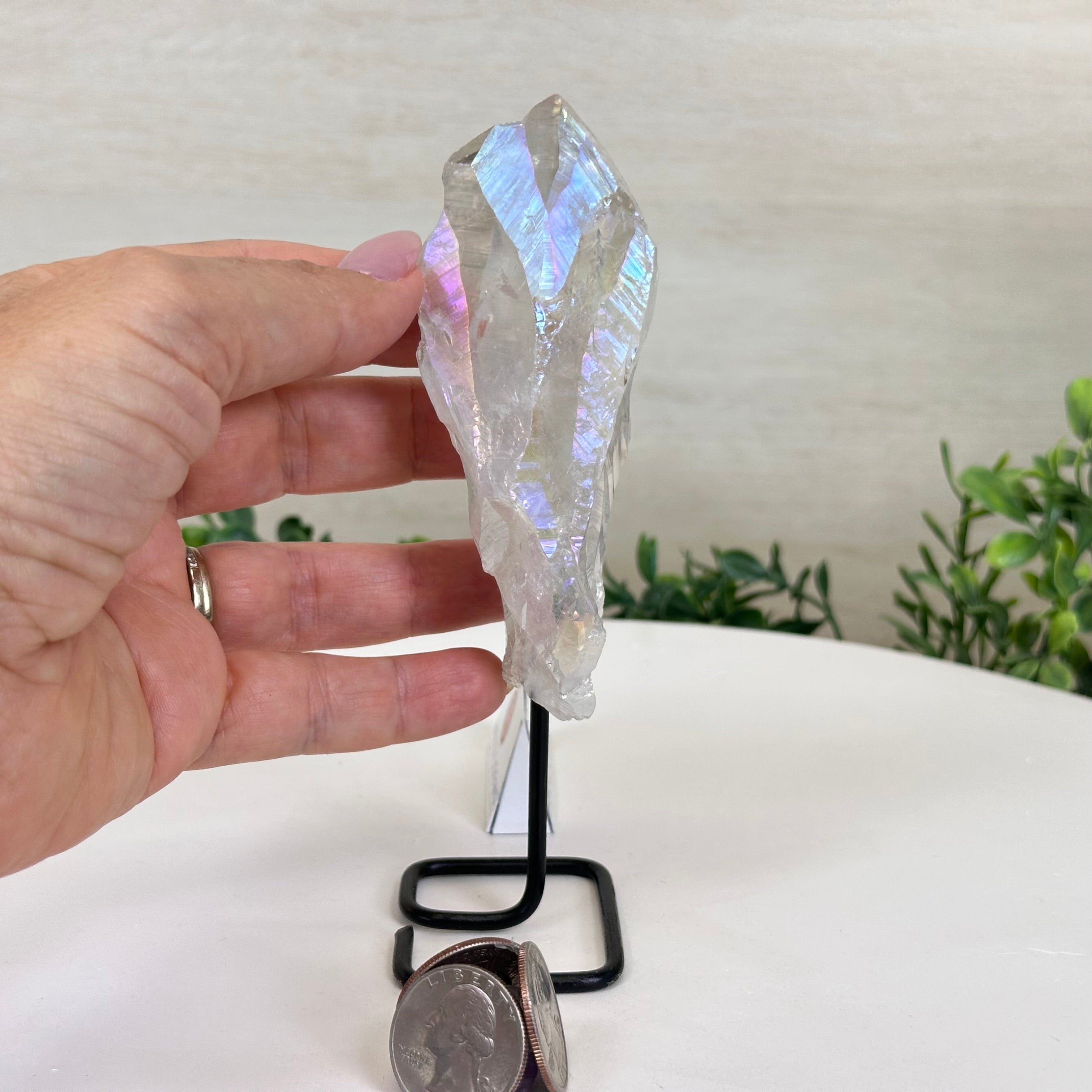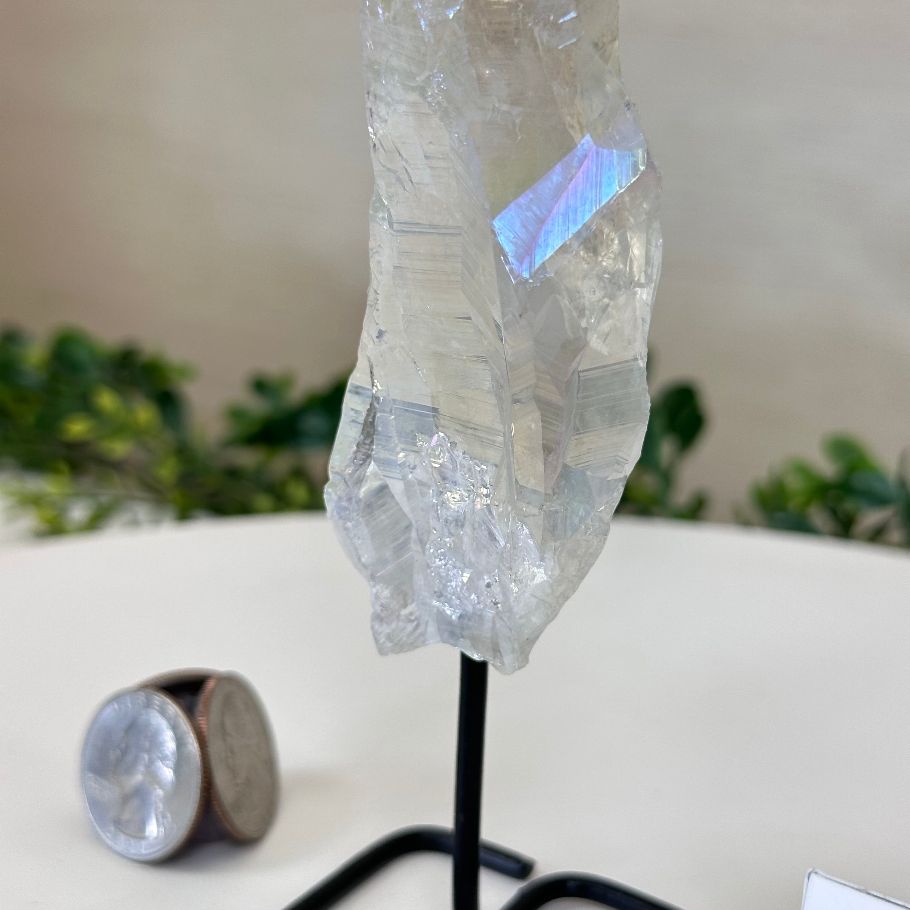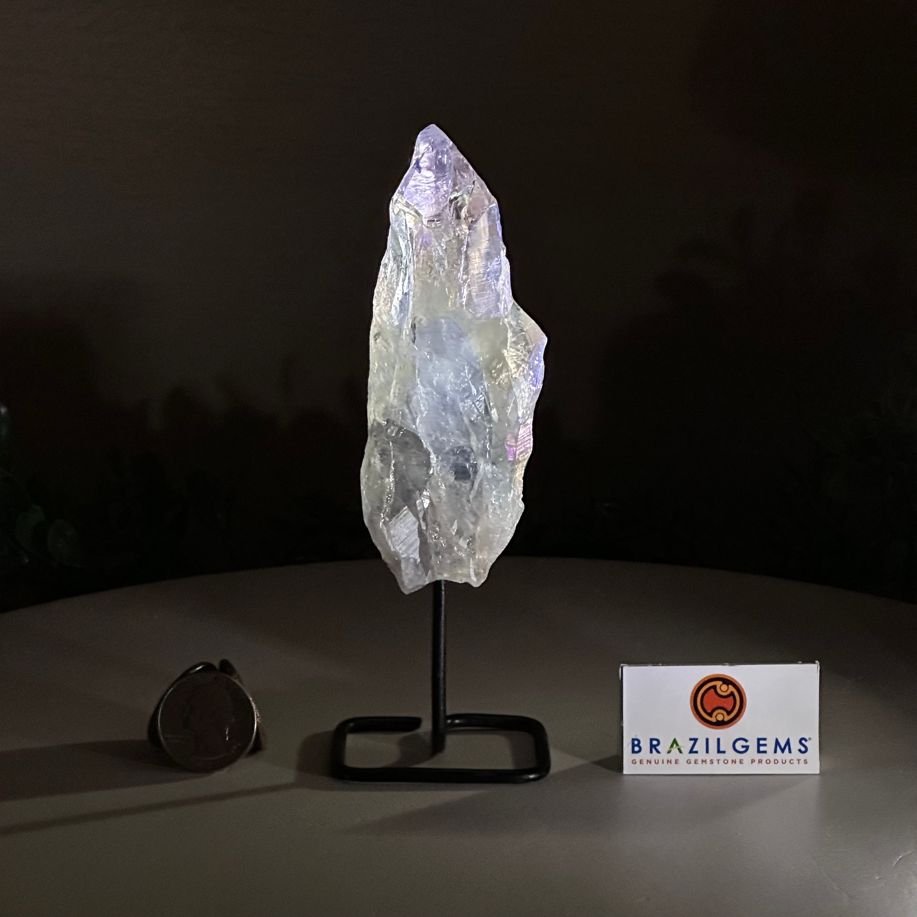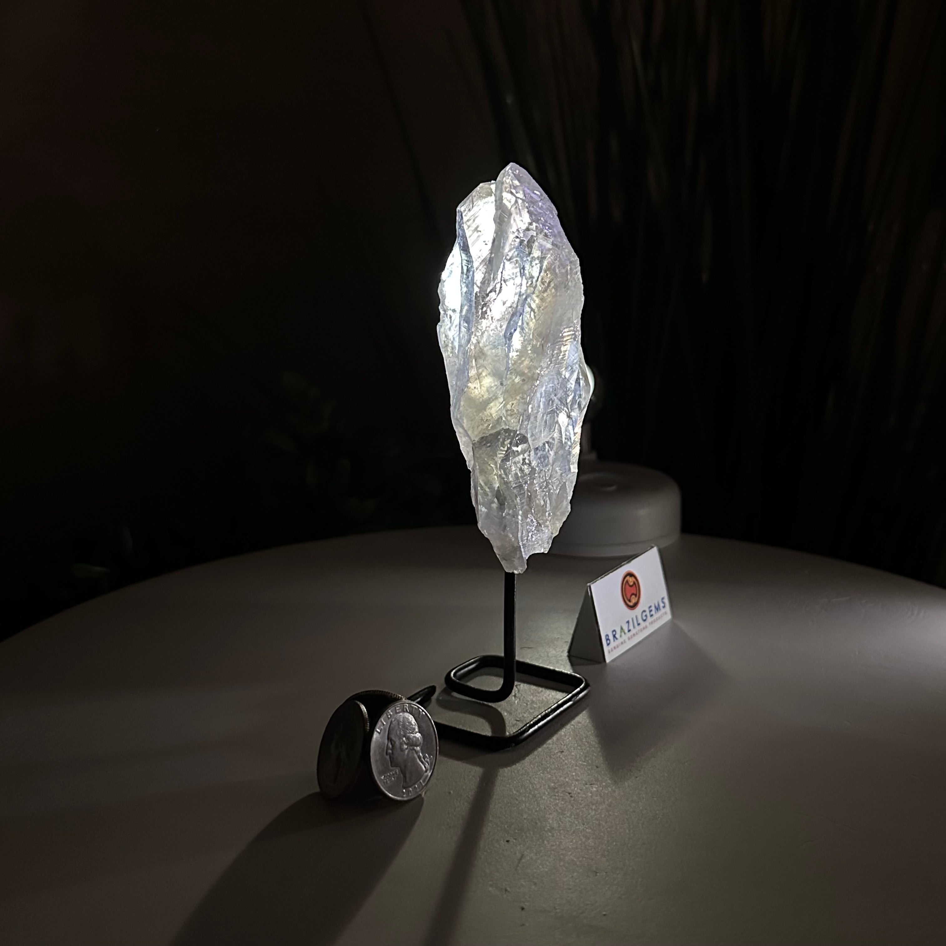 Enhance your home or sacred space with the multi-faceted beauty of this Angel Aura Quartz Point on a metal stand. This iridescent crystal has rough edges and a bright and captivating glow.
