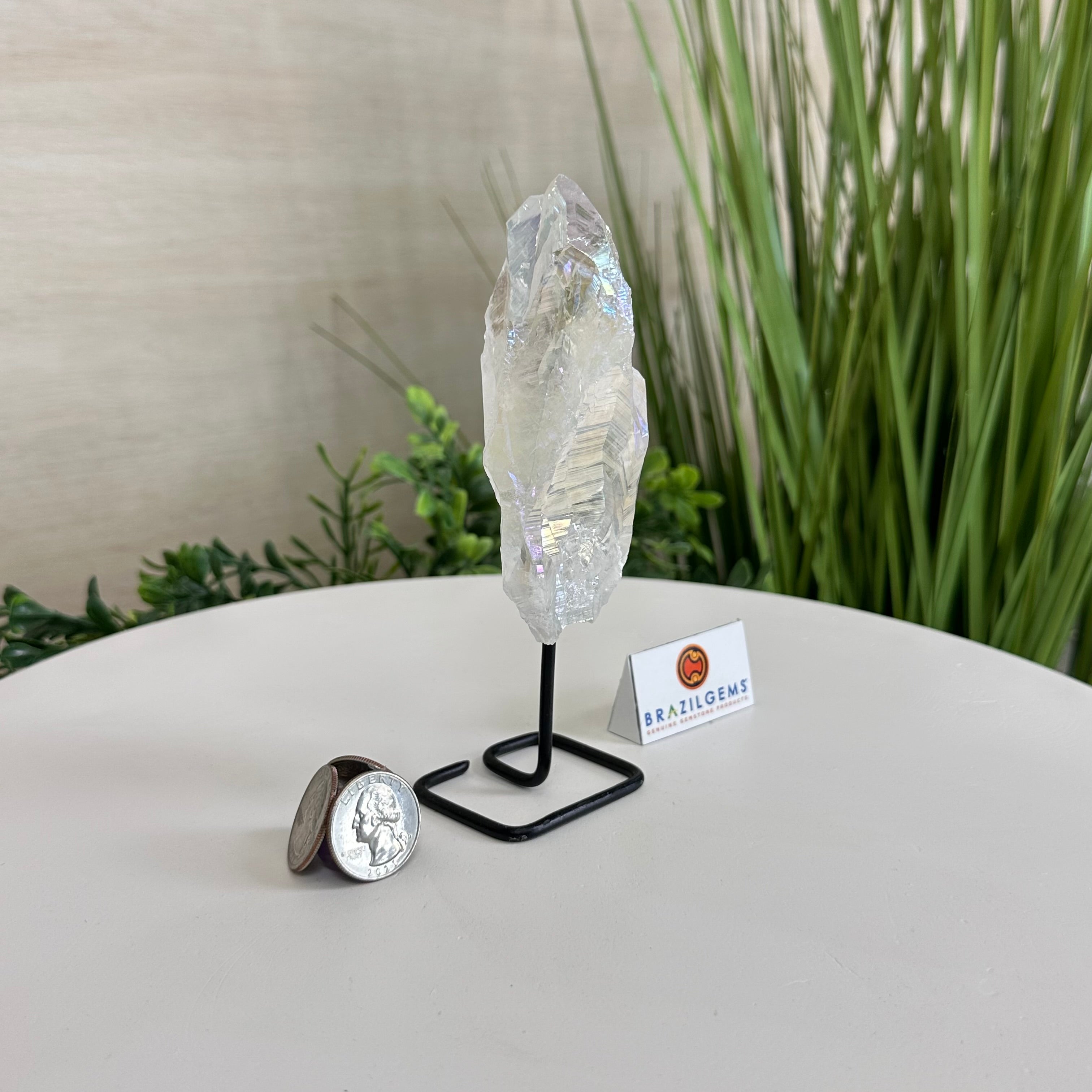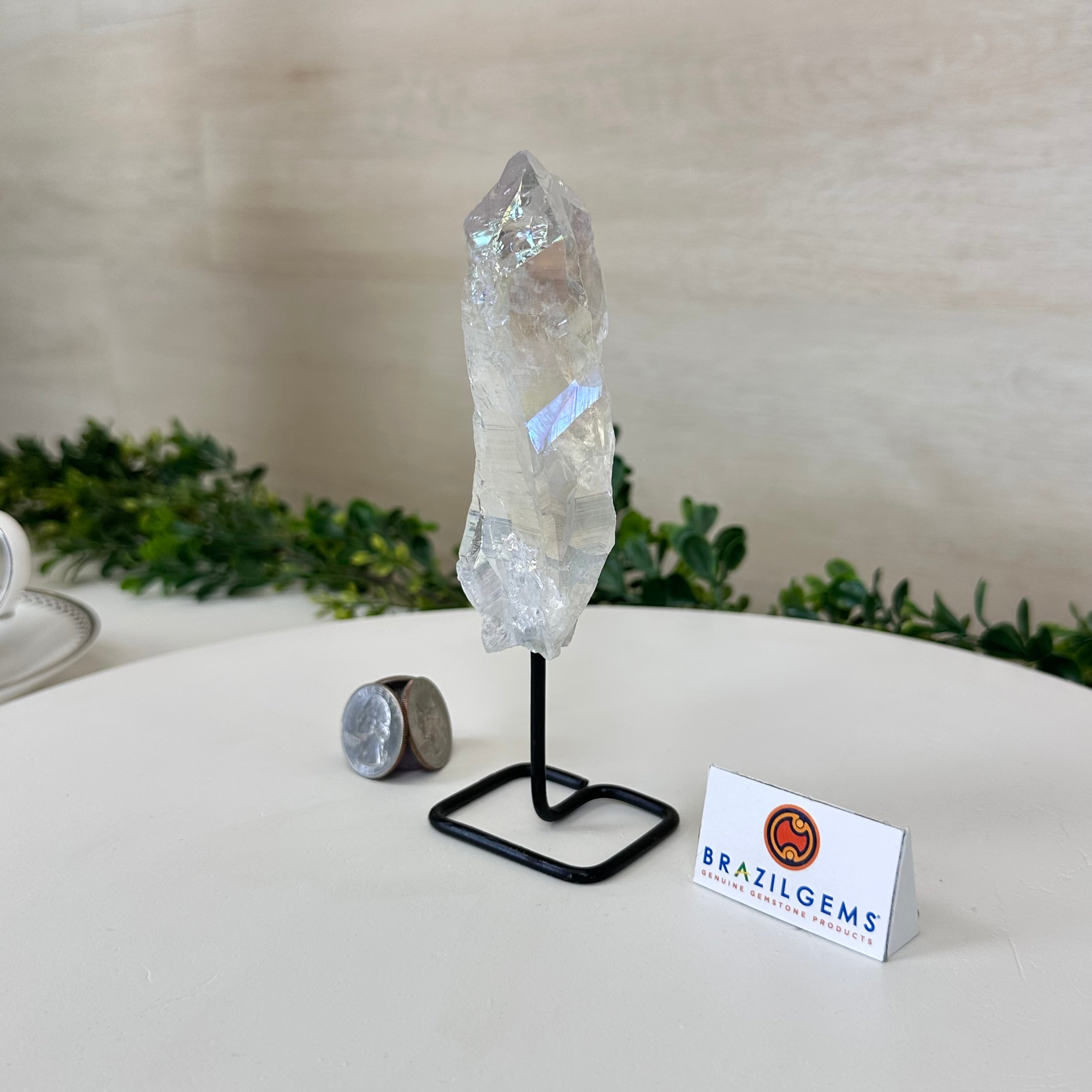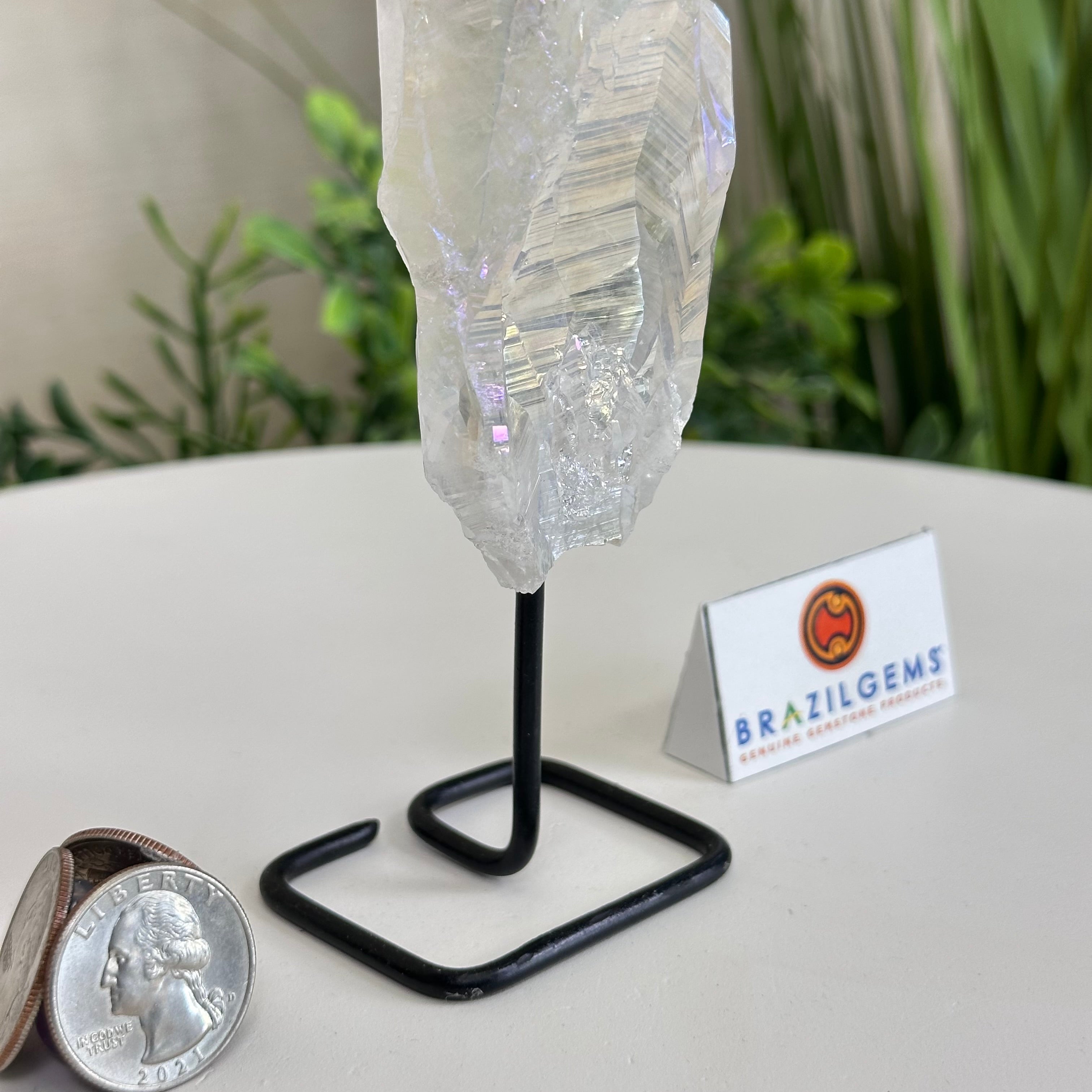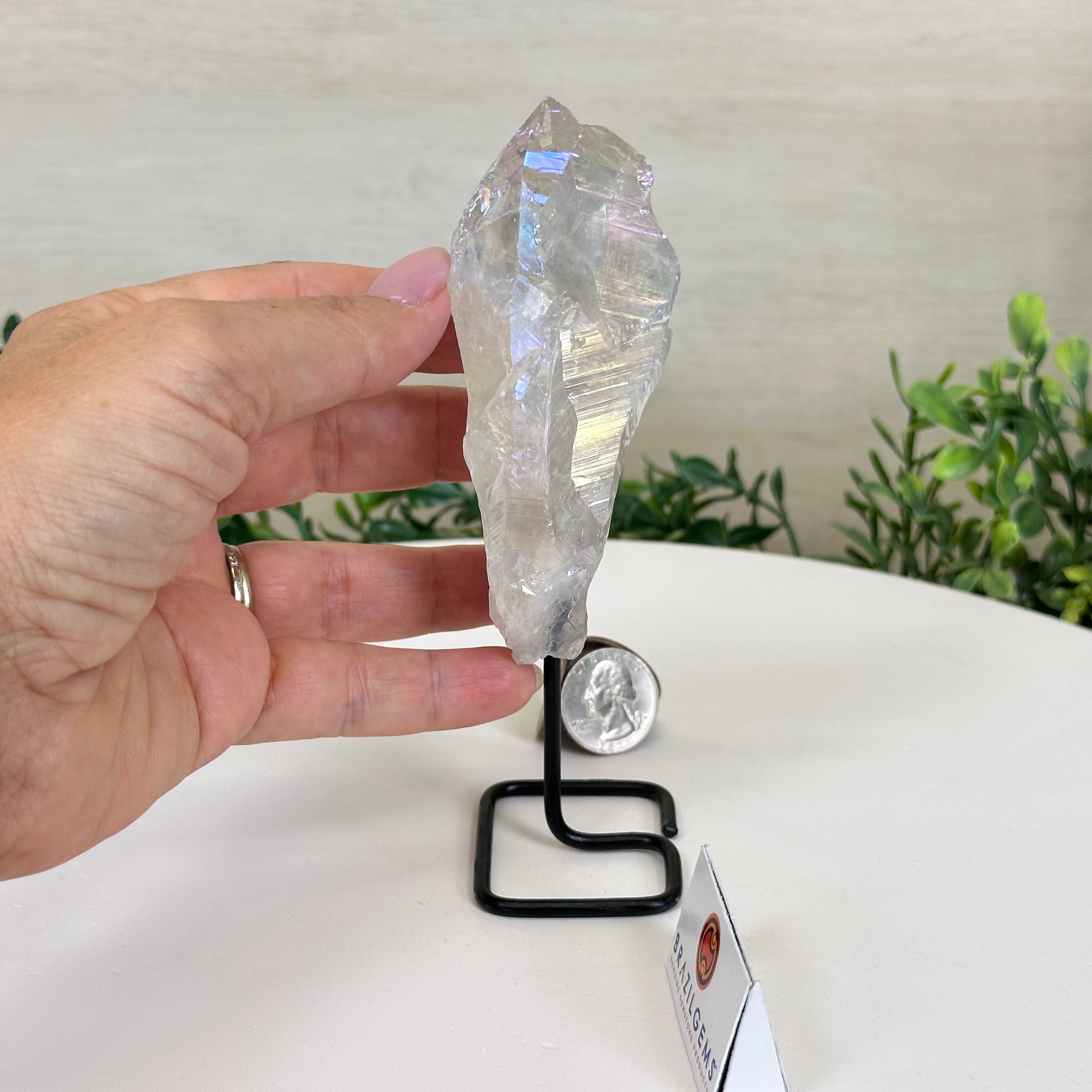 Enhance your home or sacred space with the multi-faceted beauty of this Angel Aura Quartz Point on a metal stand. This iridescent crystal has rough edges and a bright and captivating glow.