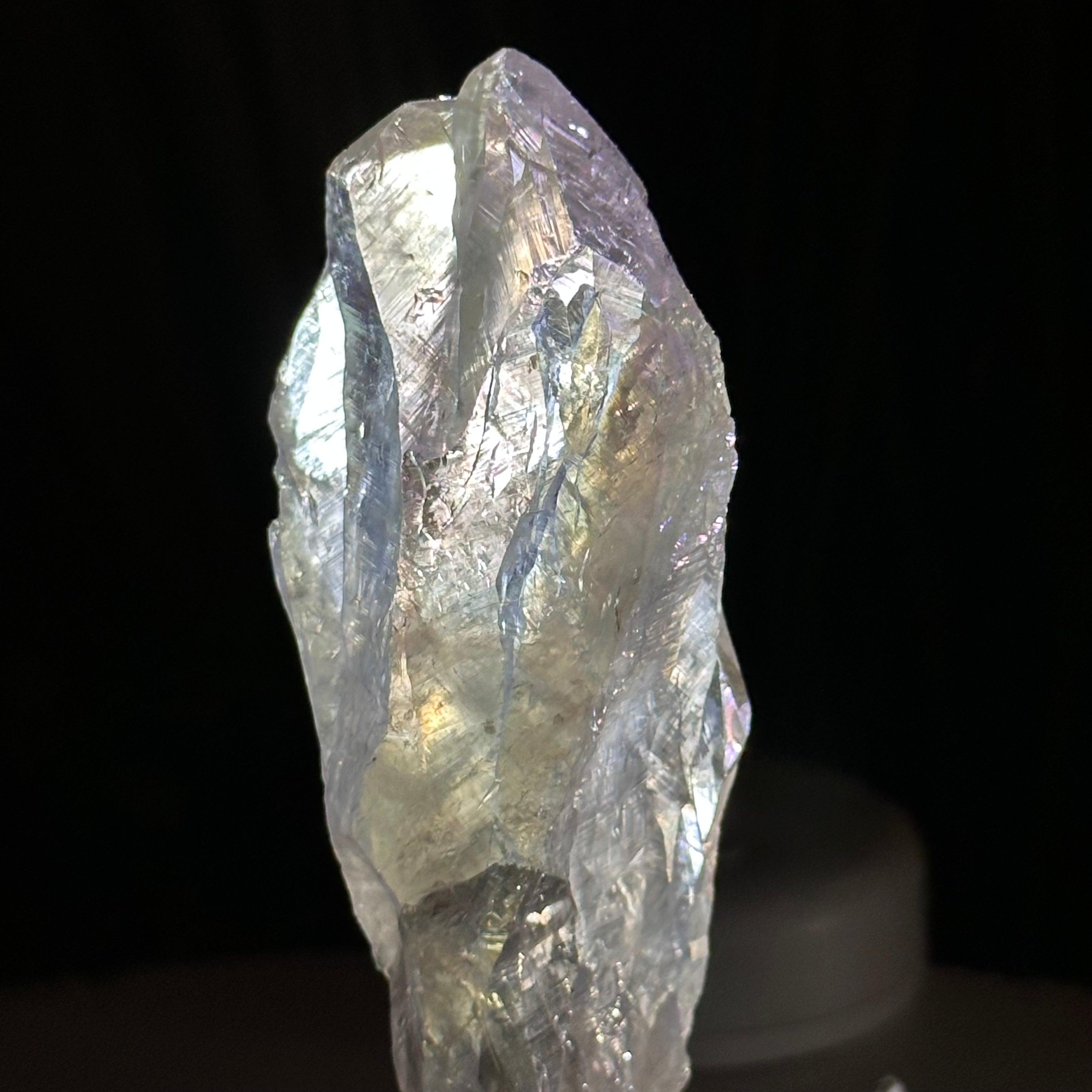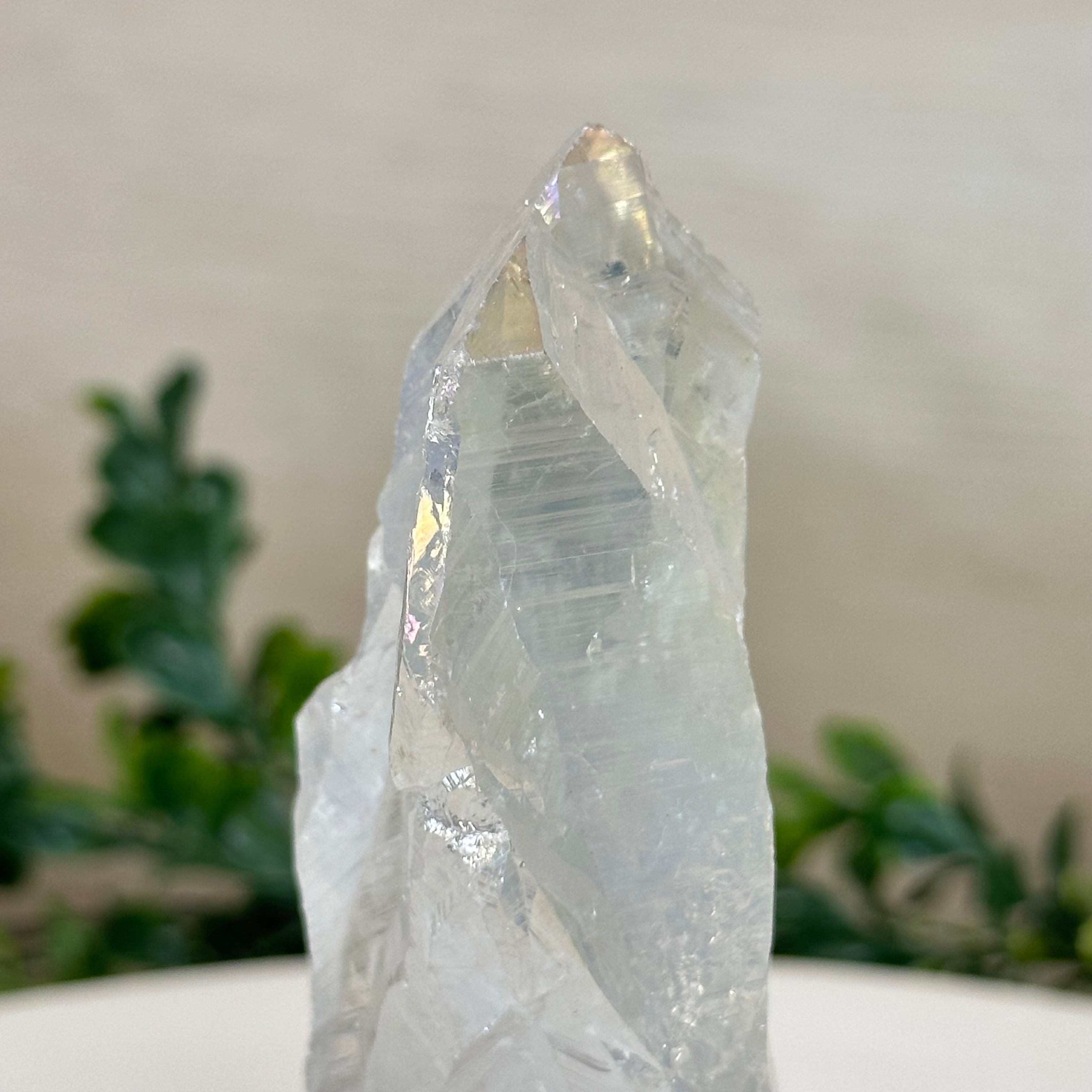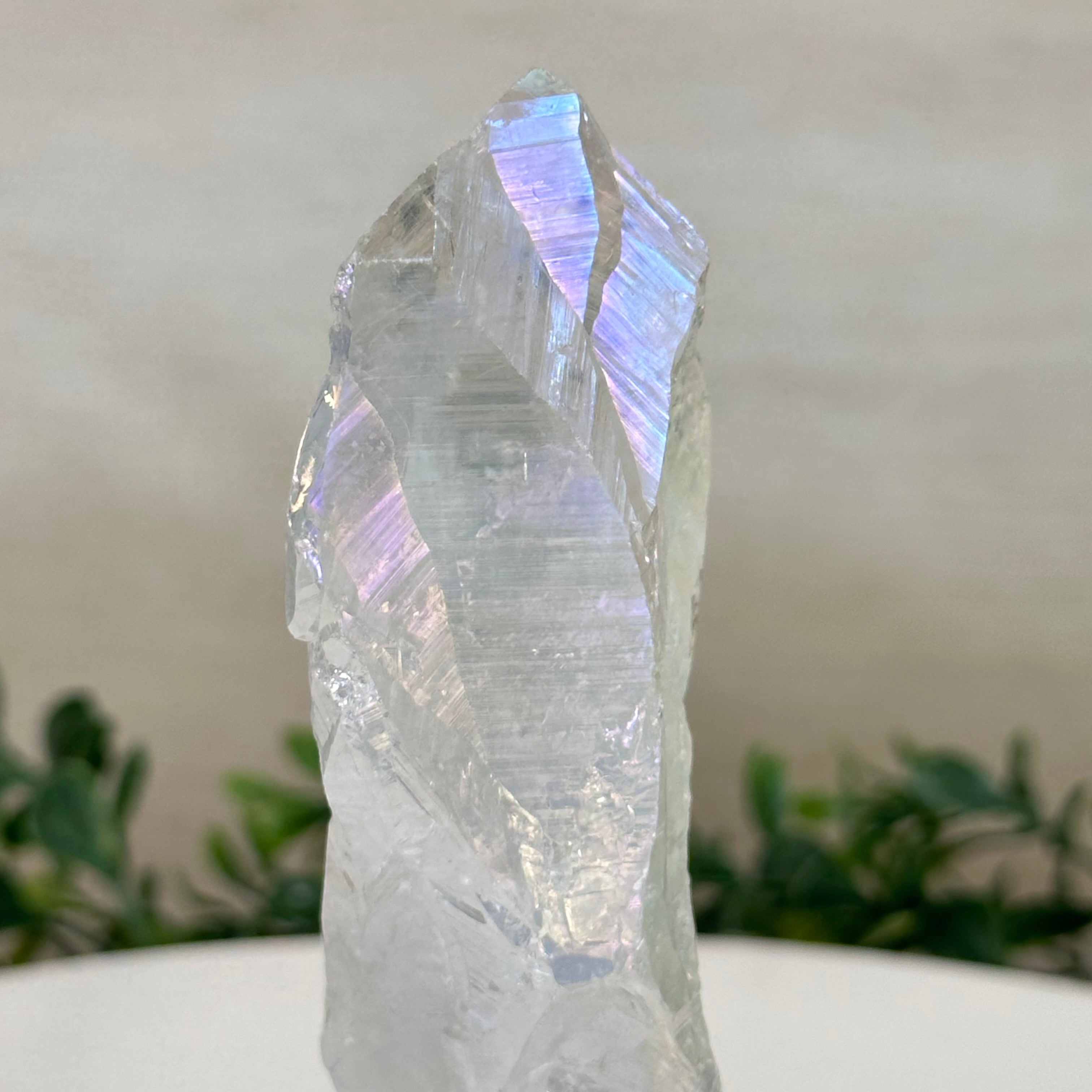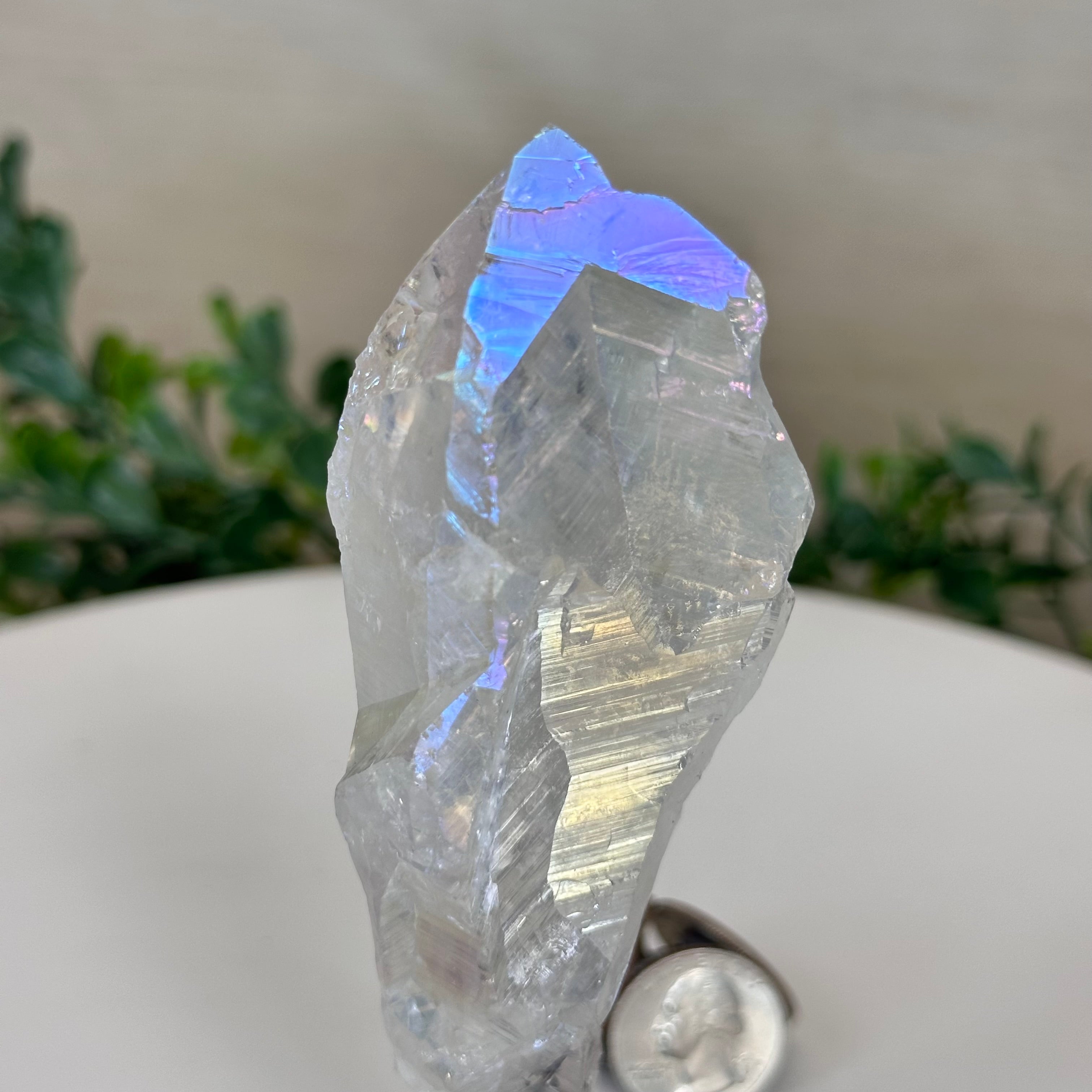 Enhance your home or sacred space with the multi-faceted beauty of this Angel Aura Quartz Point on a metal stand. This iridescent crystal has rough edges and a bright and captivating glow.