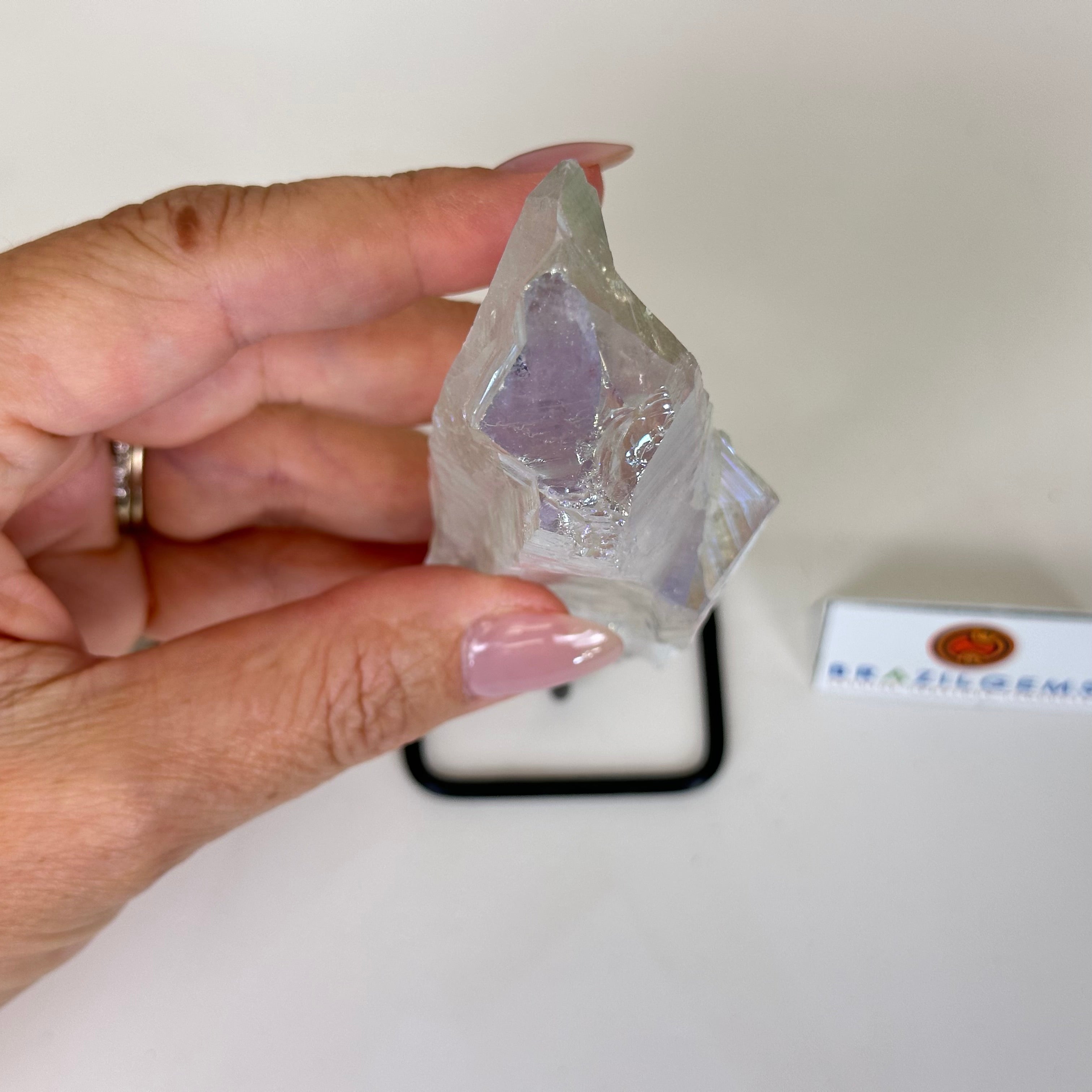 Disclaimer: This is a natural gemstone crystal sold by Brazil Gems® as is and as you see it in its images and video. It is the exact one you will receive. It may contain natural imperfections and/or imperfections, broken edges and repairs from the extraction, mounting and aura-effect bonding processes. The crystal has a hole drilled into the bottom of it so it could be mounted onto its black-painted metal stand. The Angel Aura effect is achieved through a process called vacuum deposition where vaporized metals such as silver and/or platinum are bonded to the natural crystal in a vacuum chamber giving it that iridescent pearlized sheen. At Brazil Gems® we make every effort to get measurements as exact as possible but they are done by human hands and eyes and therefore may have minor discrepancies.