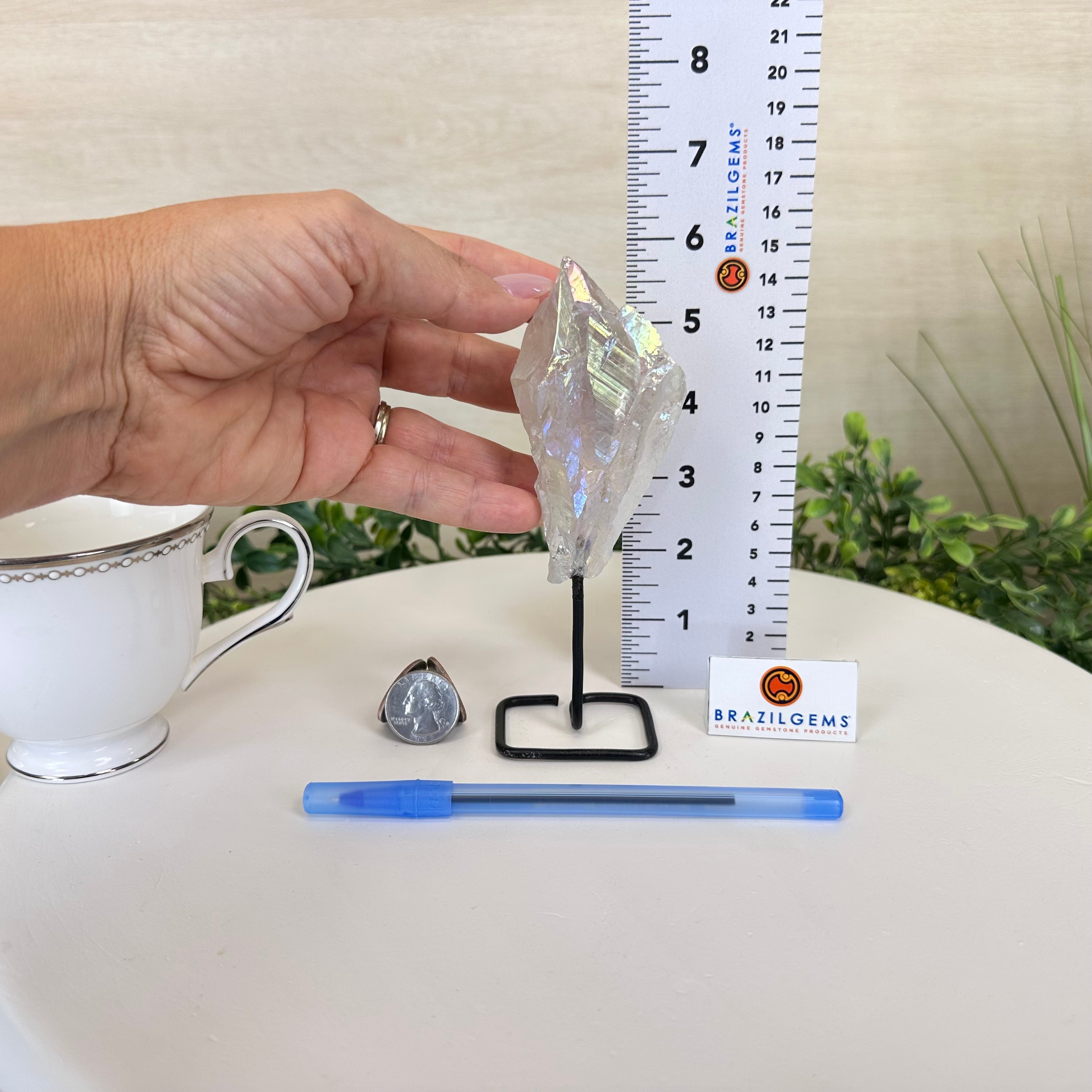 Disclaimer: This is a natural gemstone crystal sold by Brazil Gems® as is and as you see it in its images and video. It is the exact one you will receive. It may contain natural imperfections and/or imperfections, broken edges and repairs from the extraction, mounting and aura-effect bonding processes. The crystal has a hole drilled into the bottom of it so it could be mounted onto its black-painted metal stand. The Angel Aura effect is achieved through a process called vacuum deposition where vaporized metals such as silver and/or platinum are bonded to the natural crystal in a vacuum chamber giving it that iridescent pearlized sheen. At Brazil Gems® we make every effort to get measurements as exact as possible but they are done by human hands and eyes and therefore may have minor discrepancies.