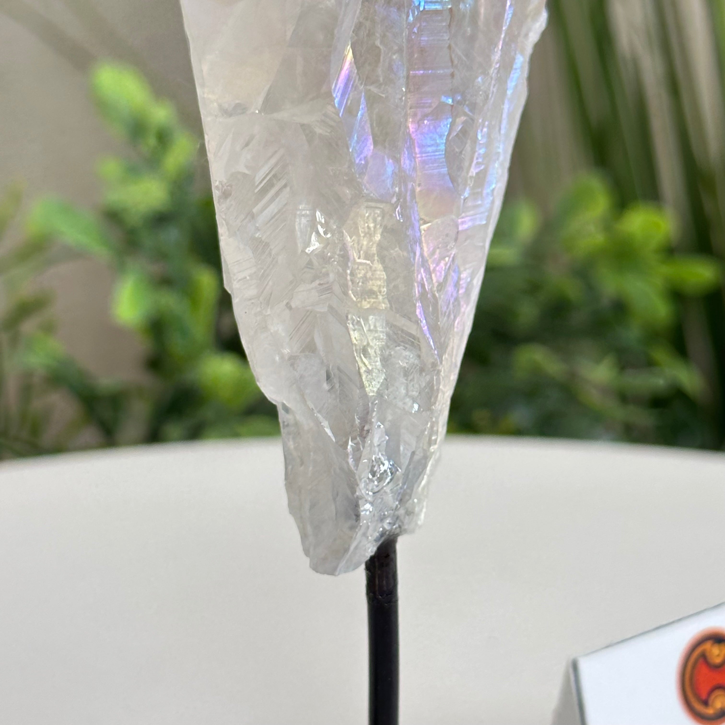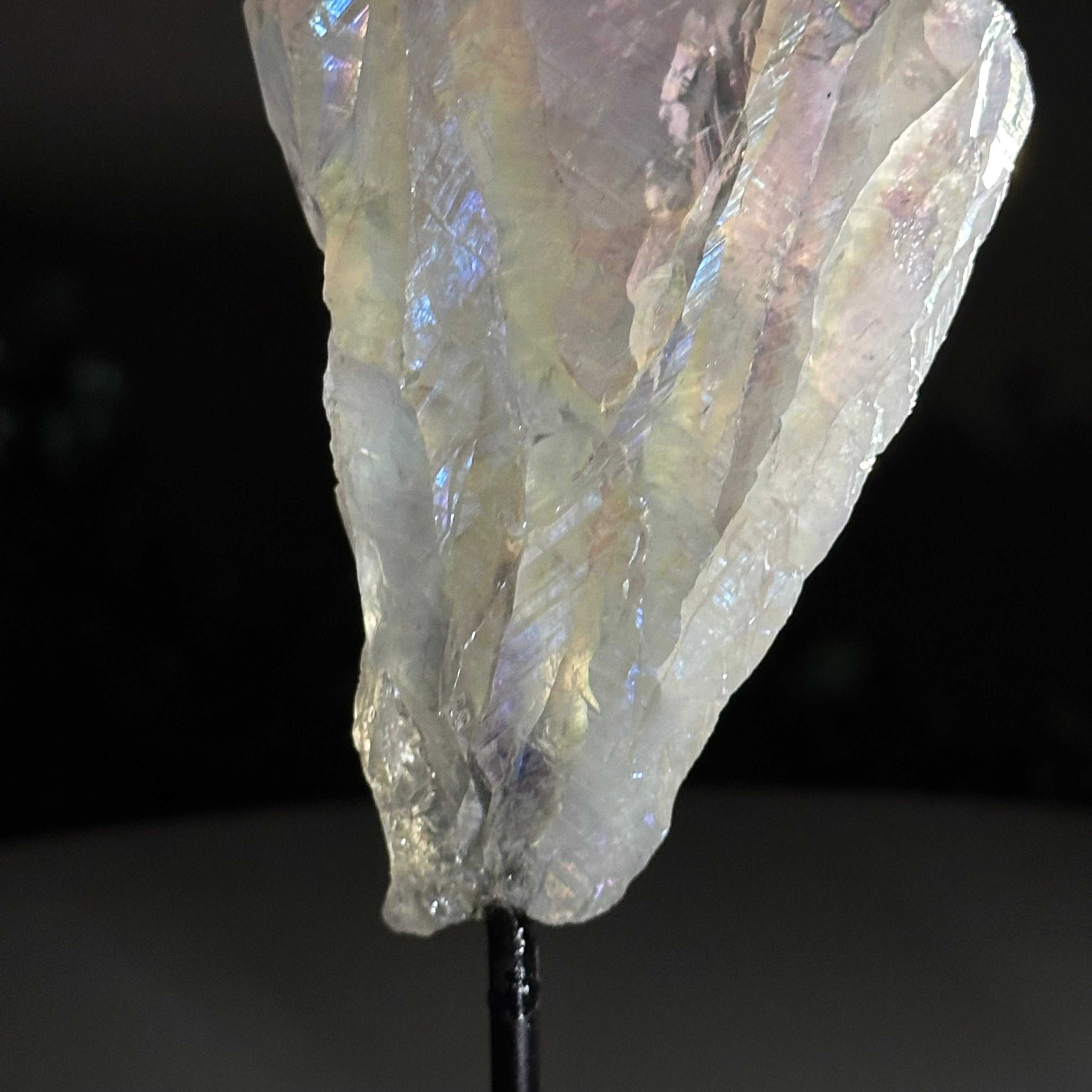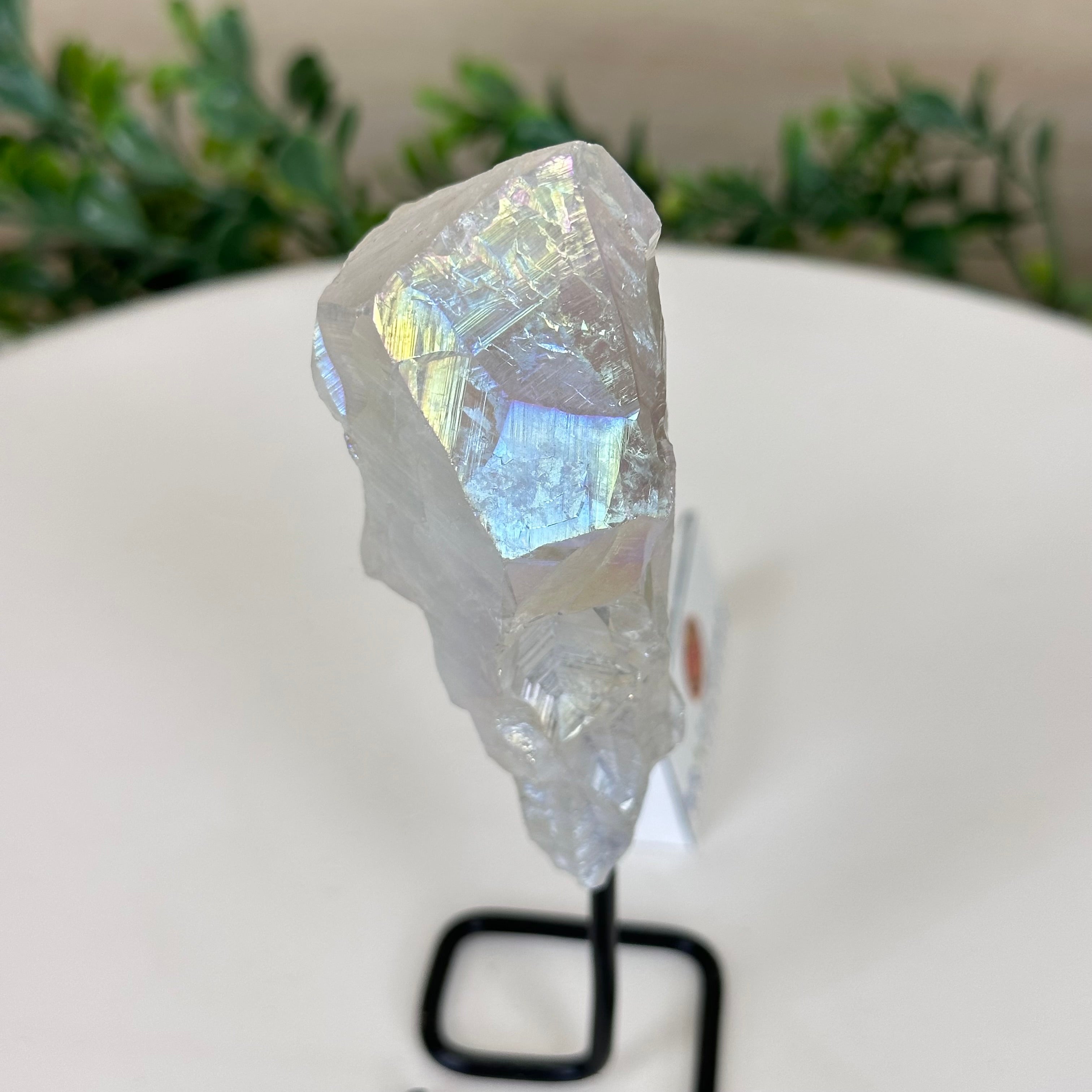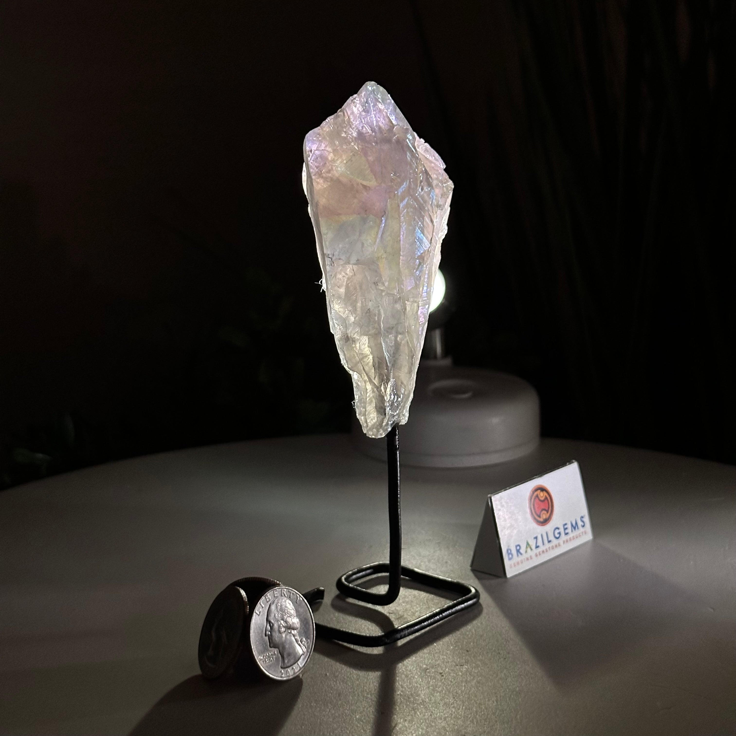 Enhance your home or sacred space with the multi-faceted beauty of this Angel Aura Quartz Point on a metal stand. This iridescent crystal has rough edges and a bright and captivating glow.