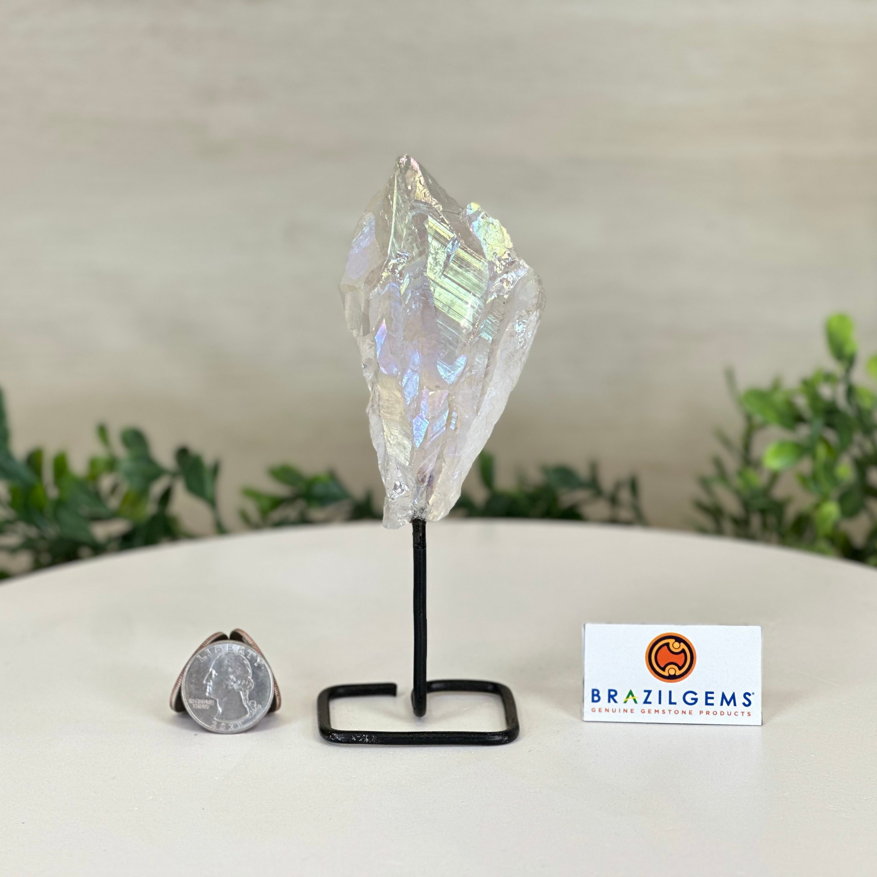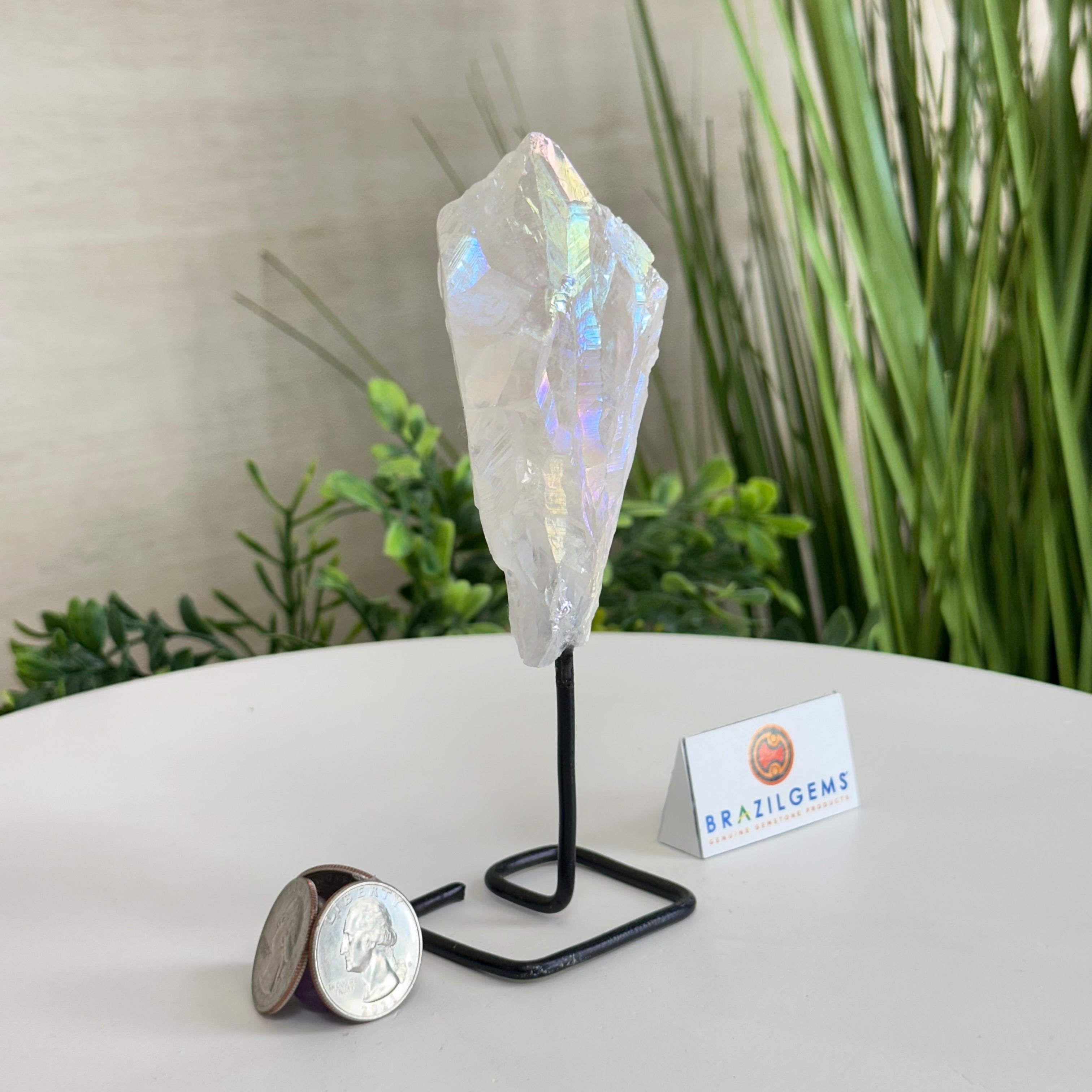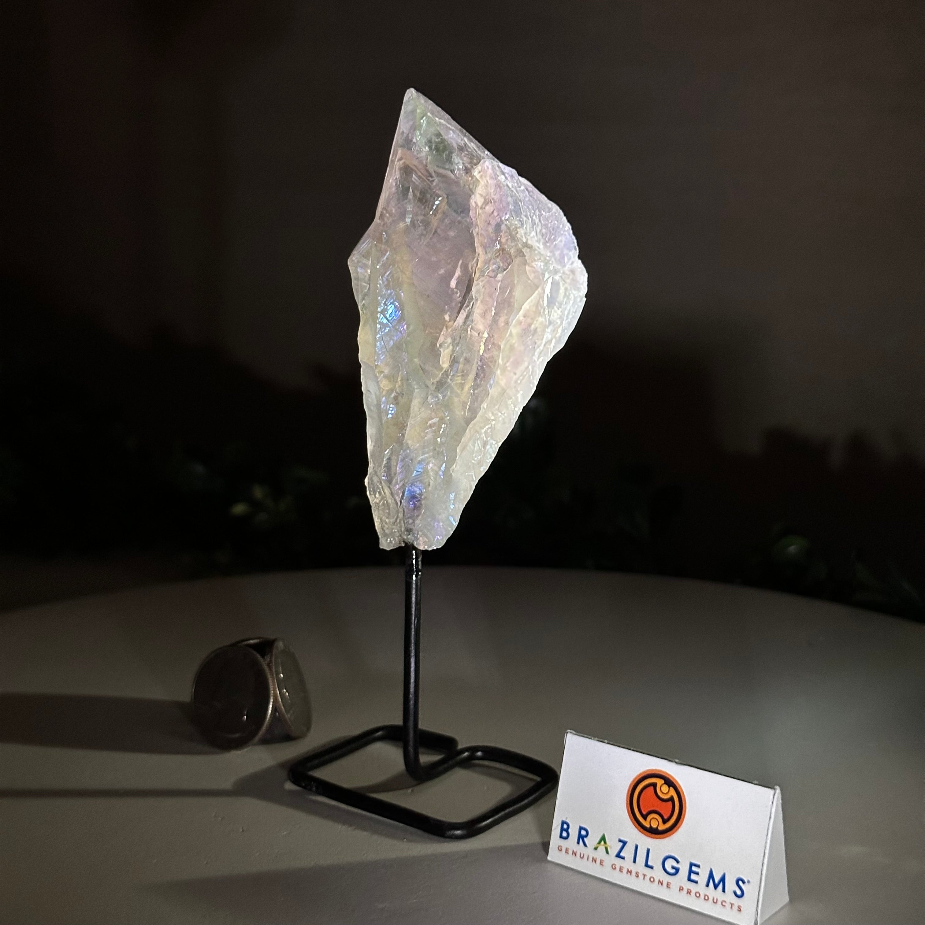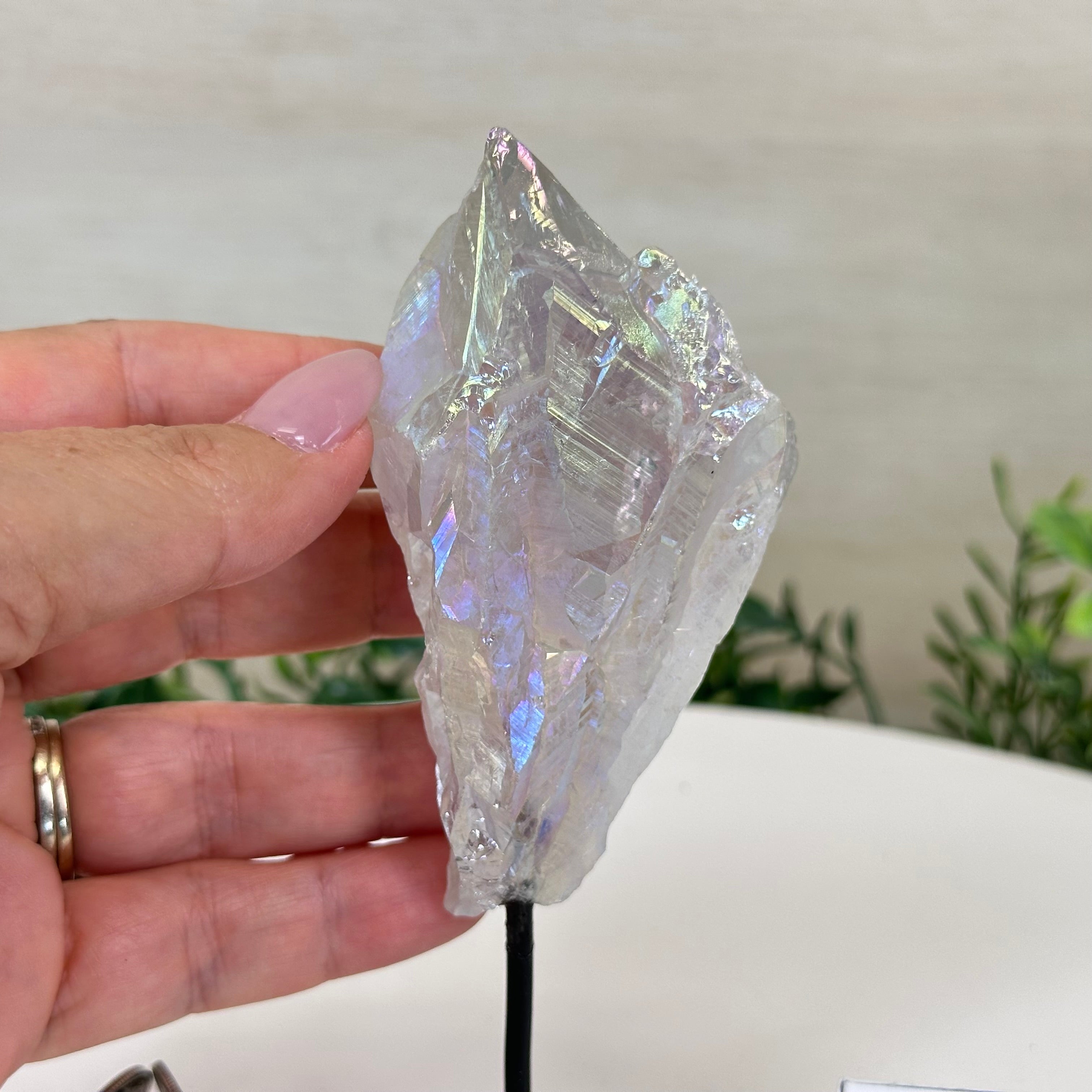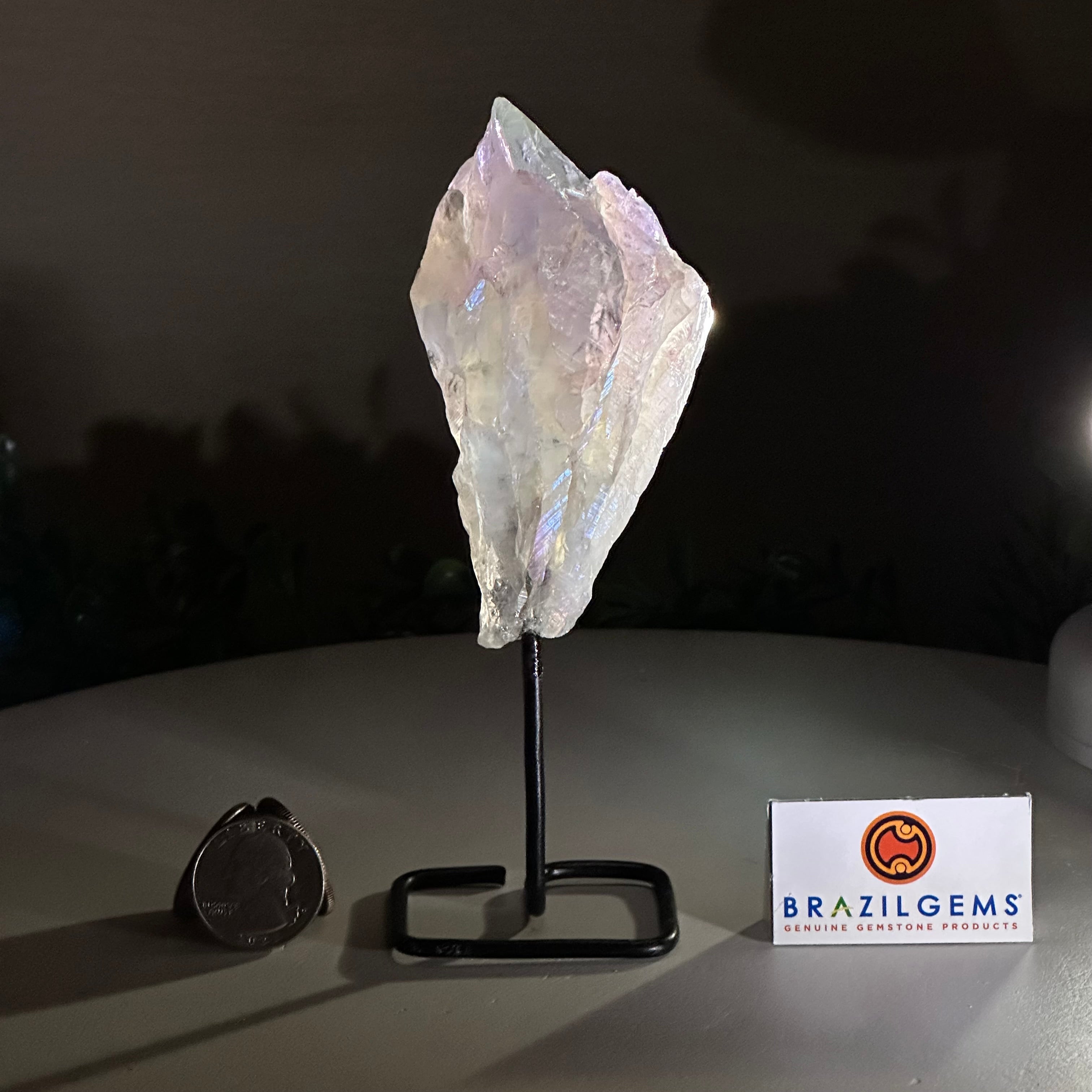 Enhance your home or sacred space with the multi-faceted beauty of this Angel Aura Quartz Point on a metal stand. This iridescent crystal has rough edges and a bright and captivating glow.