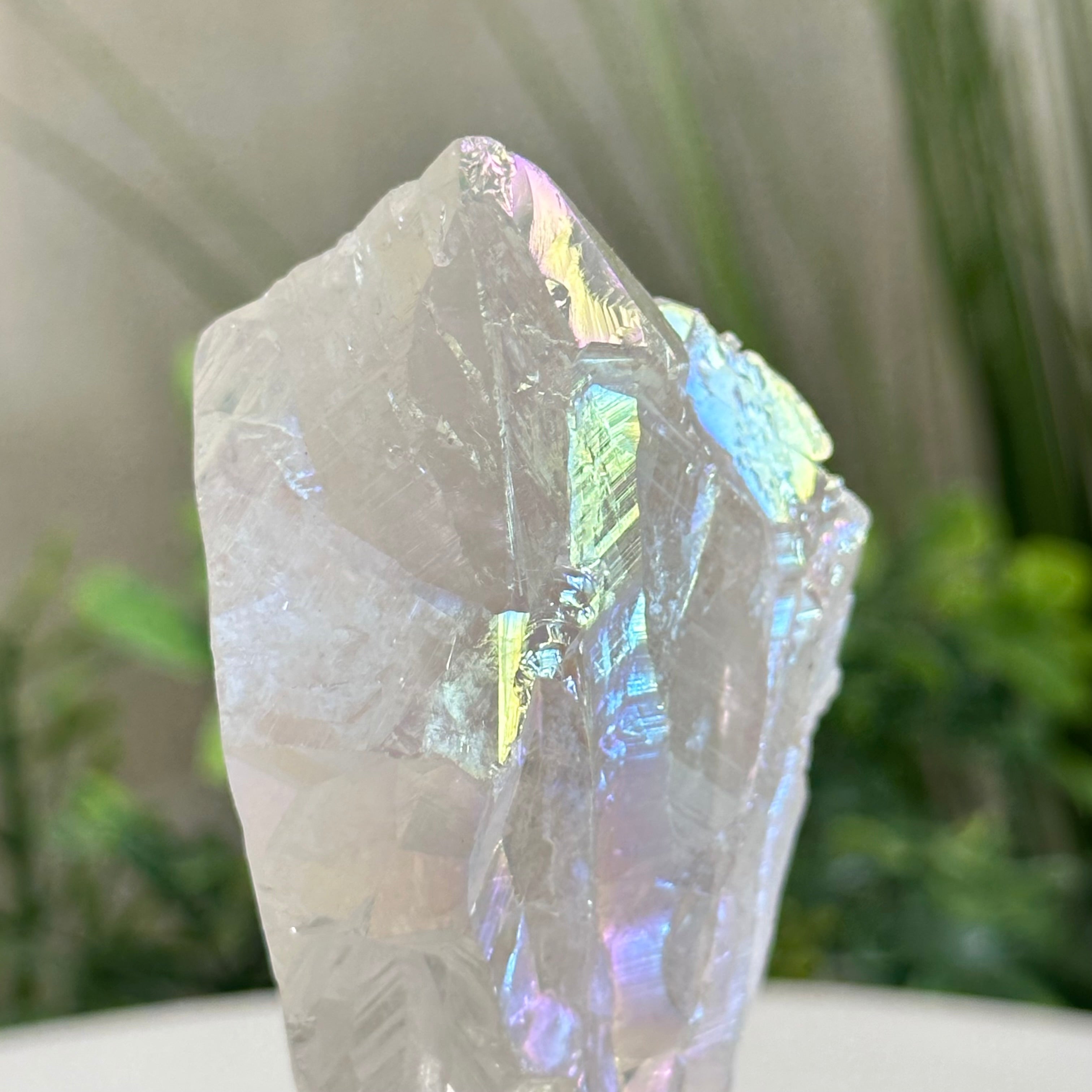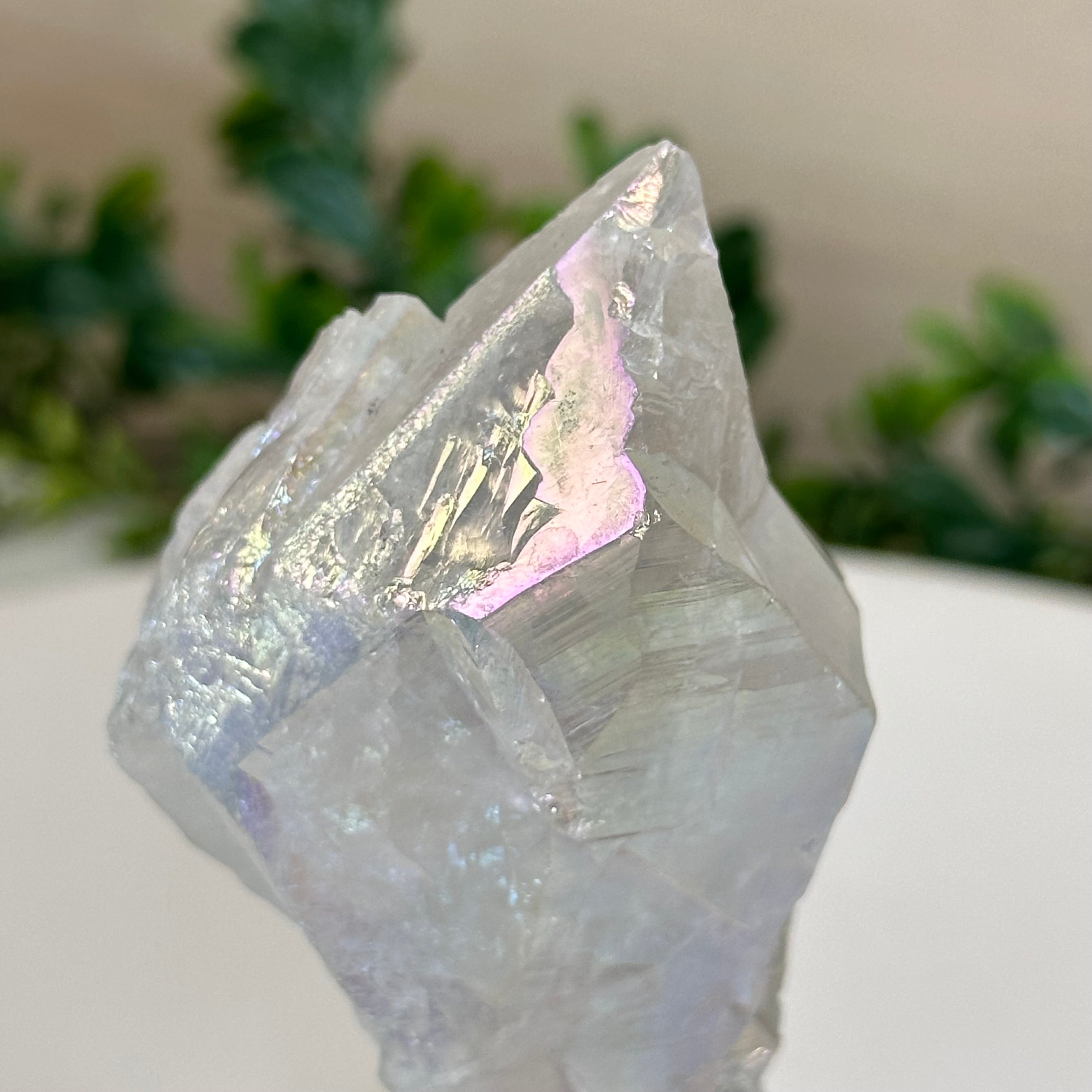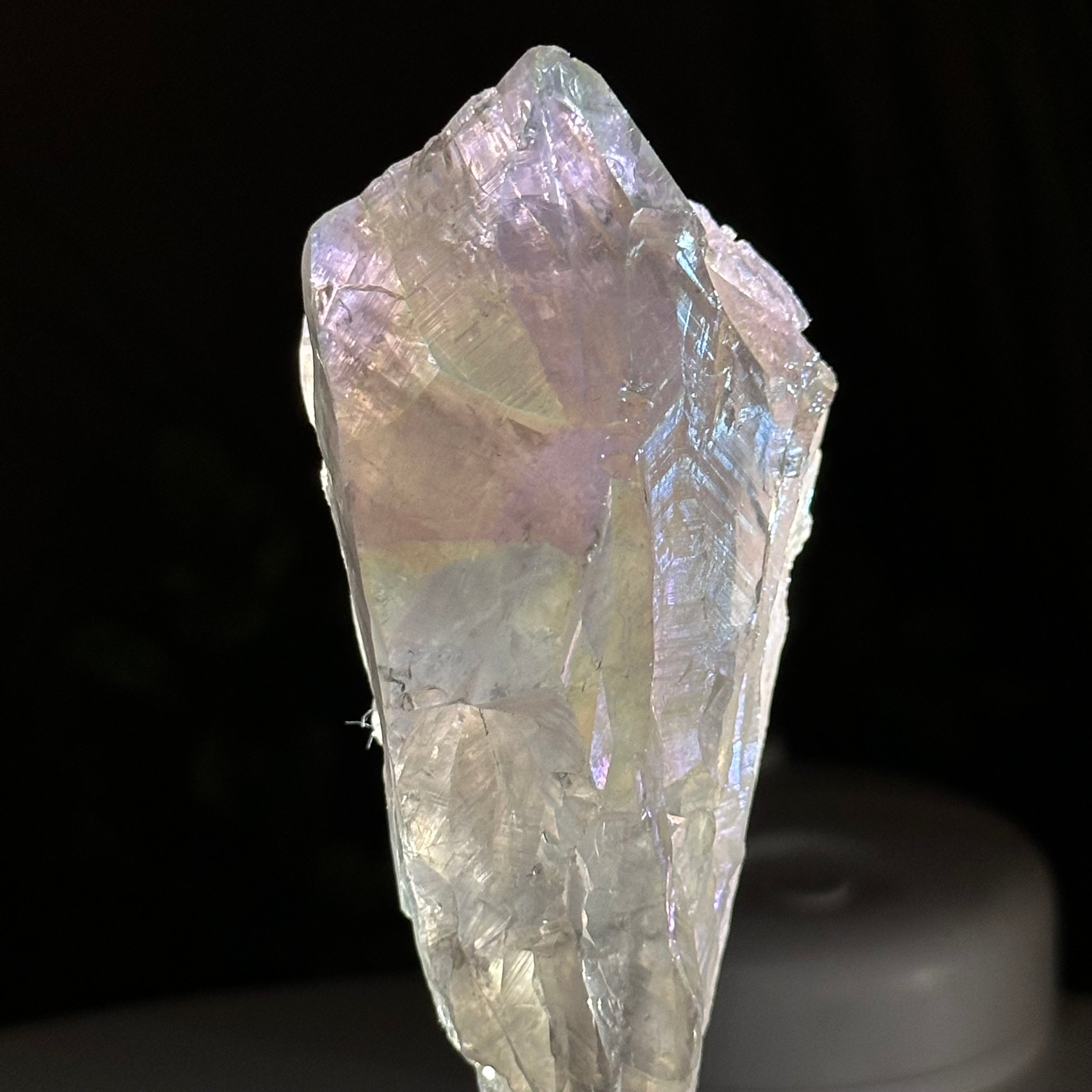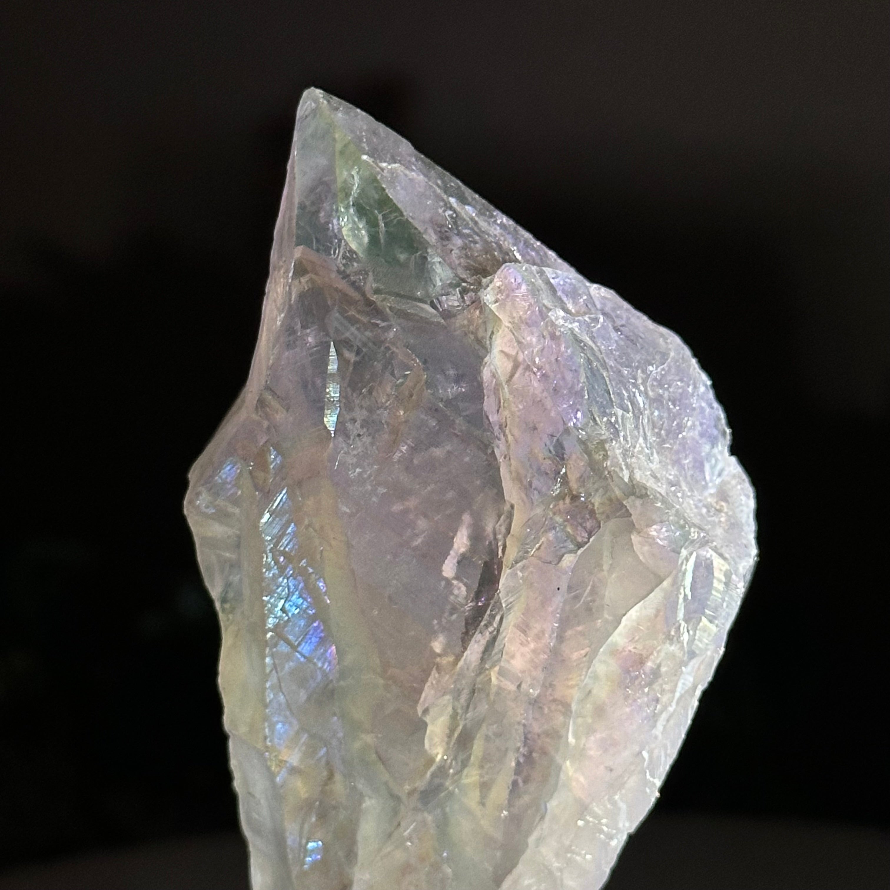 Enhance your home or sacred space with the multi-faceted beauty of this Angel Aura Quartz Point on a metal stand. This iridescent crystal has rough edges and a bright and captivating glow.