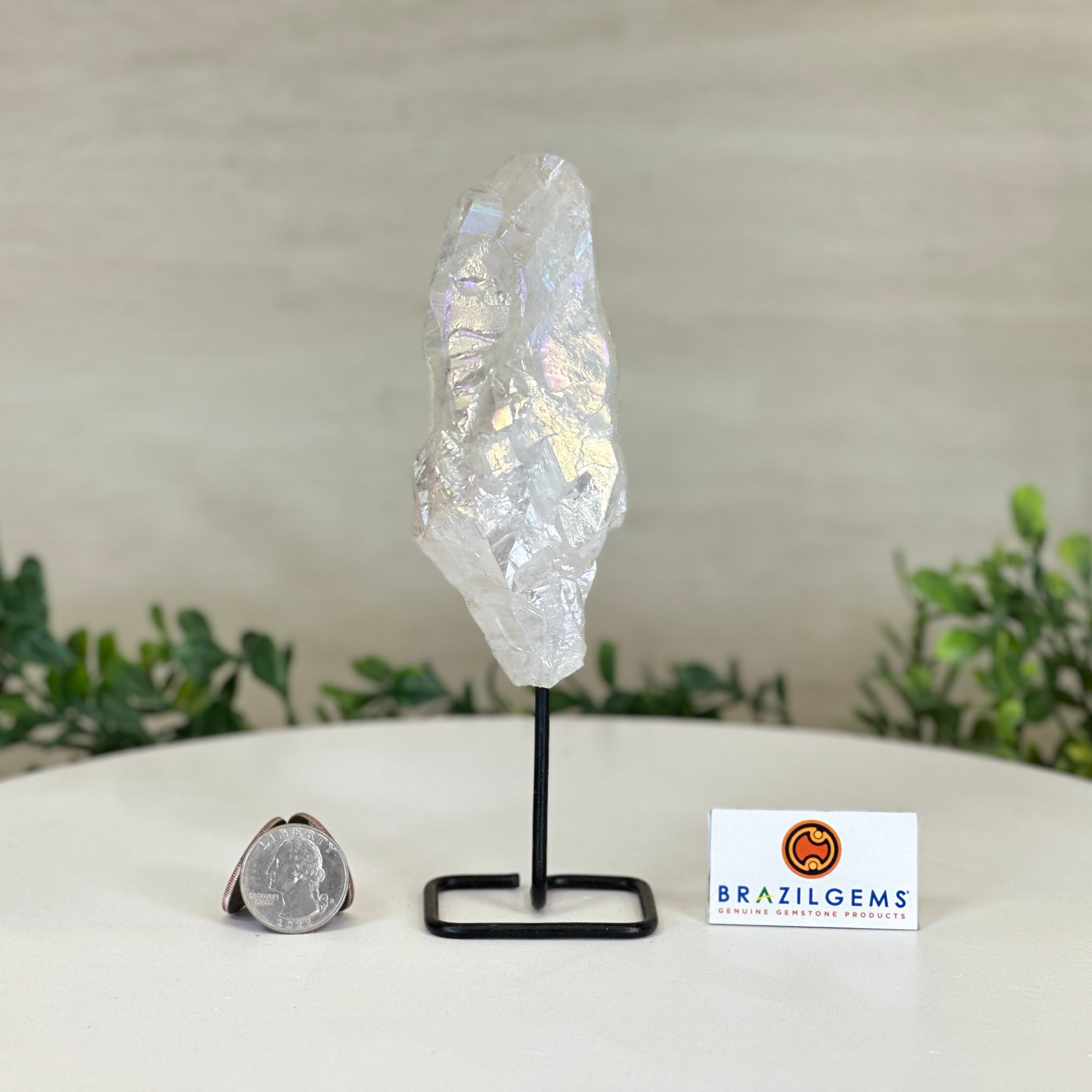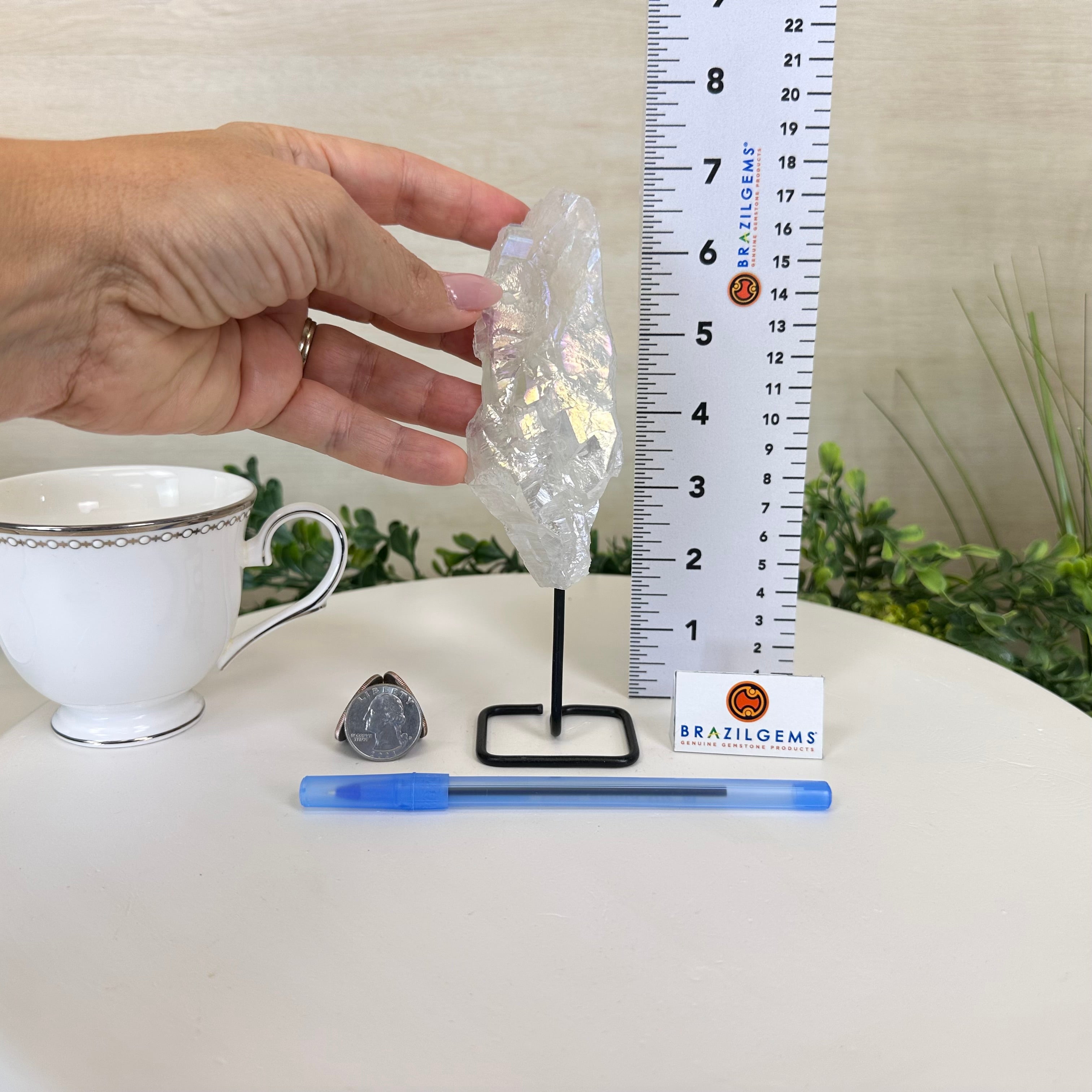 Disclaimer: This is a natural gemstone crystal sold by Brazil Gems® as is and as you see it in its images and video. It is the exact one you will receive. It may contain natural imperfections and/or imperfections, broken edges and repairs from the extraction, mounting and aura-effect bonding processes. The crystal has a hole drilled into the bottom of it so it could be mounted onto its black-painted metal stand. The Angel Aura effect is achieved through a process called vacuum deposition where vaporized metals such as silver and/or platinum are bonded to the natural crystal in a vacuum chamber giving it that iridescent pearlized sheen. At Brazil Gems® we make every effort to get measurements as exact as possible but they are done by human hands and eyes and therefore may have minor discrepancies.
