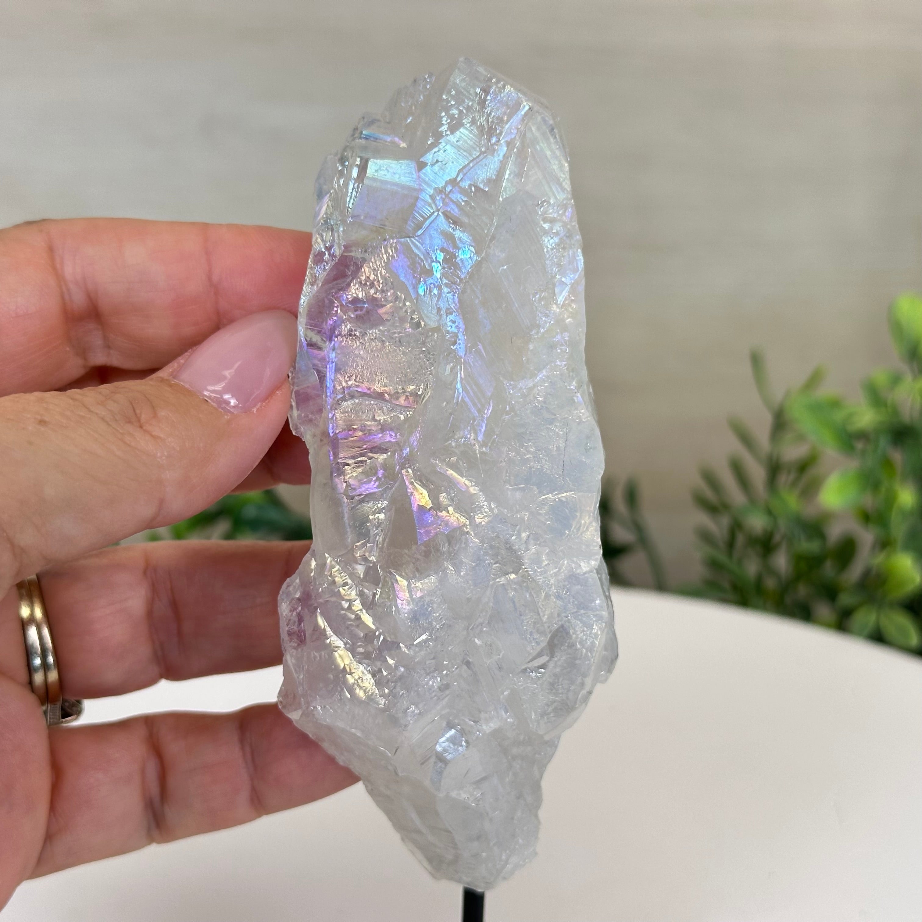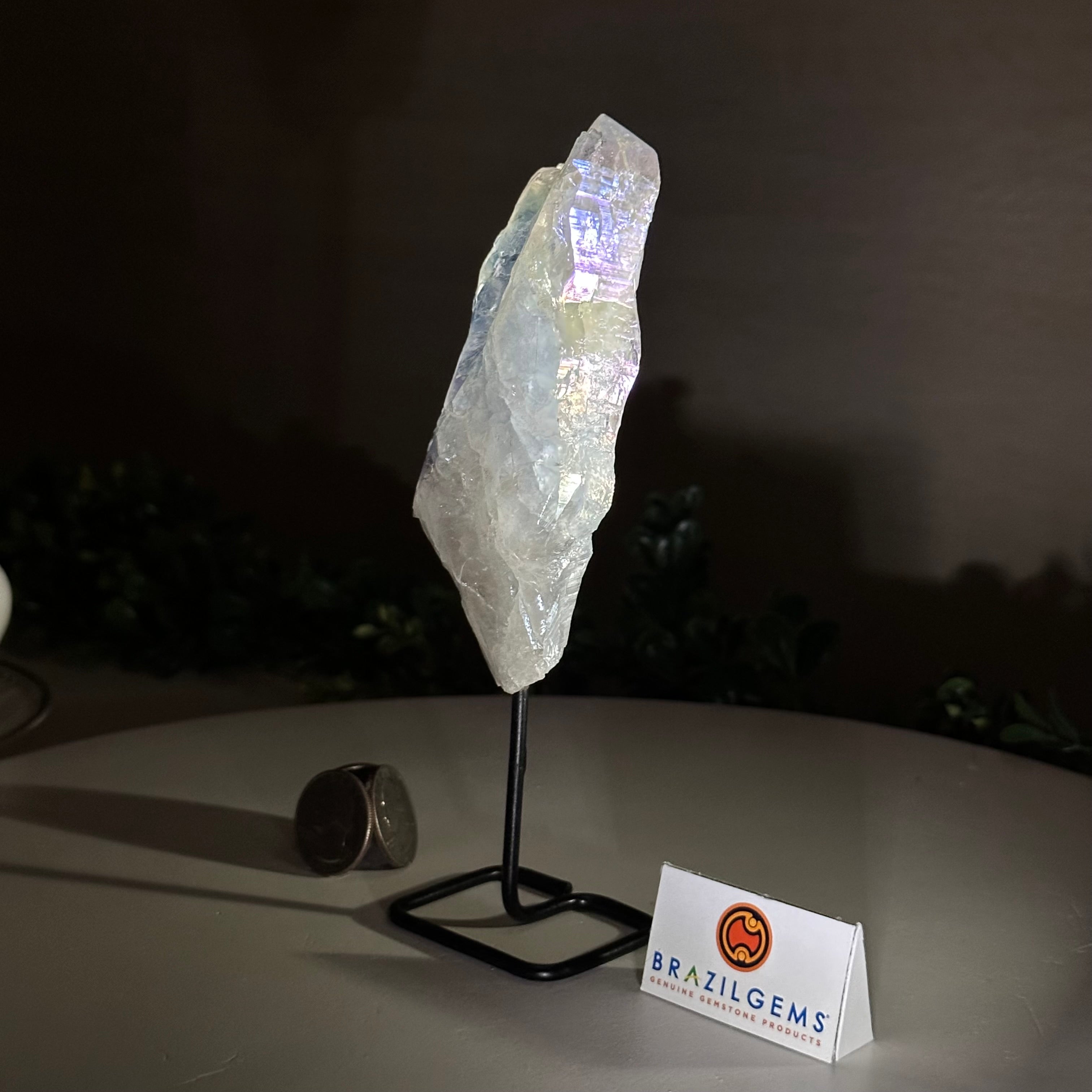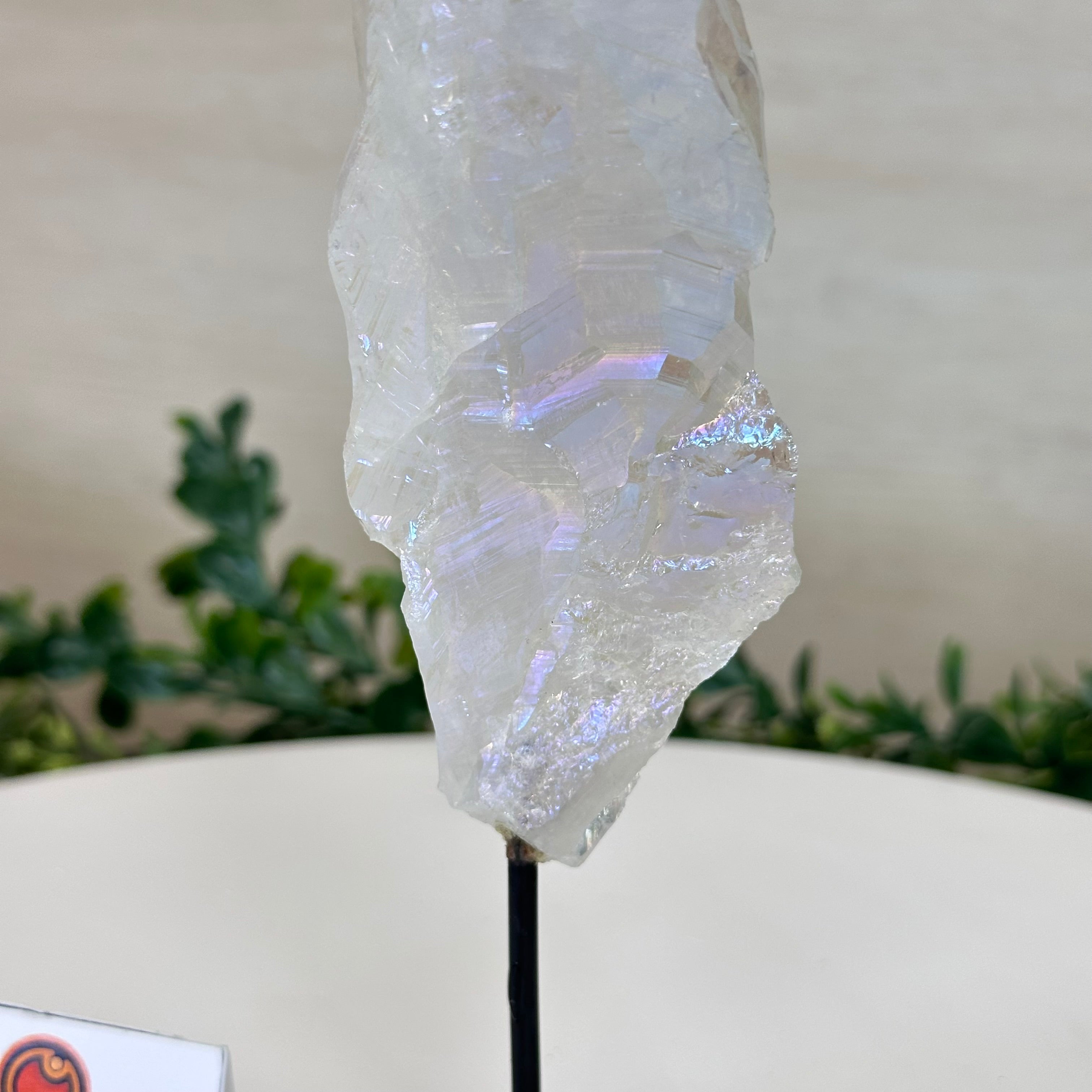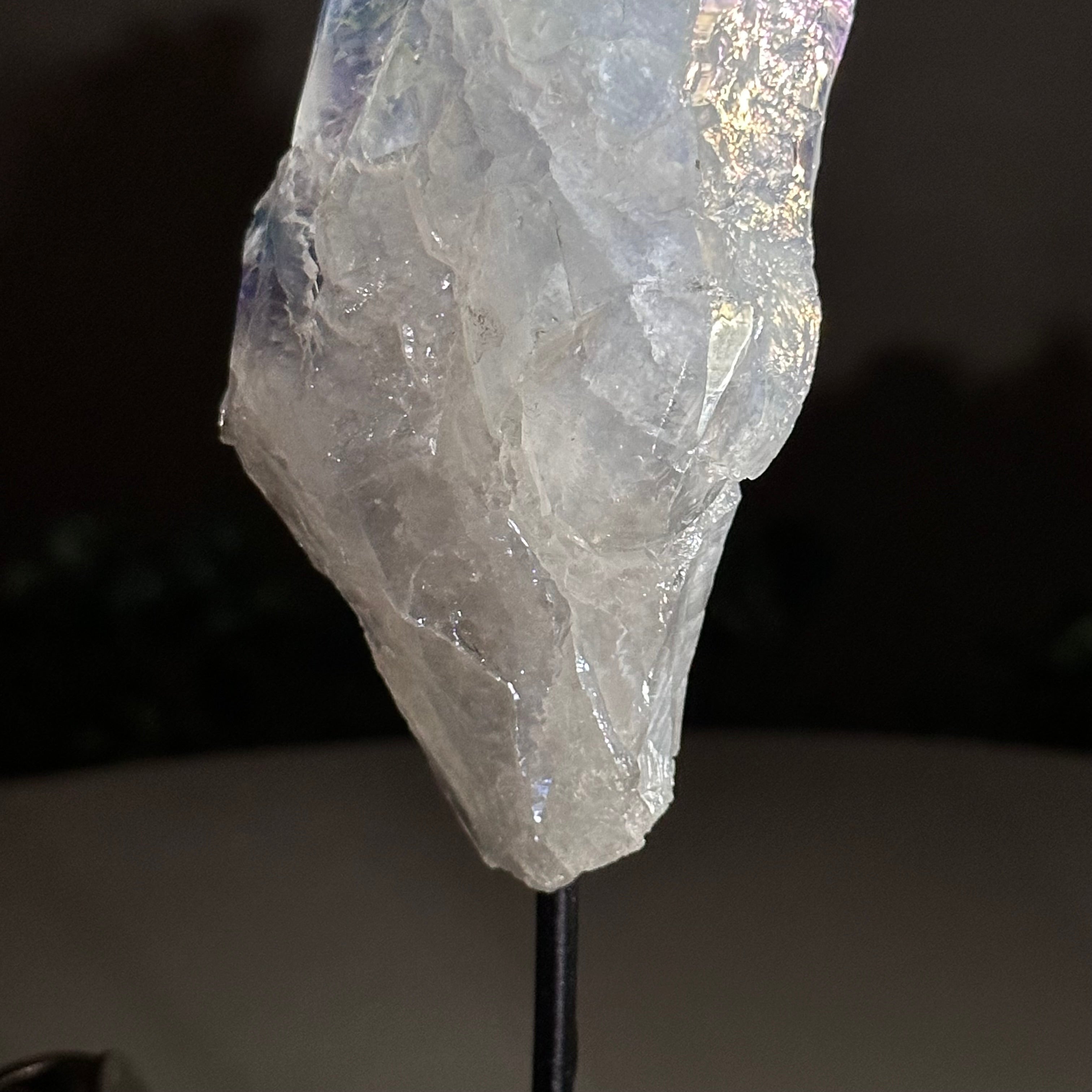 Enhance your home or sacred space with the multi-faceted beauty of this Angel Aura Quartz Point on a metal stand. This iridescent crystal has rough edges and a bright and captivating glow.