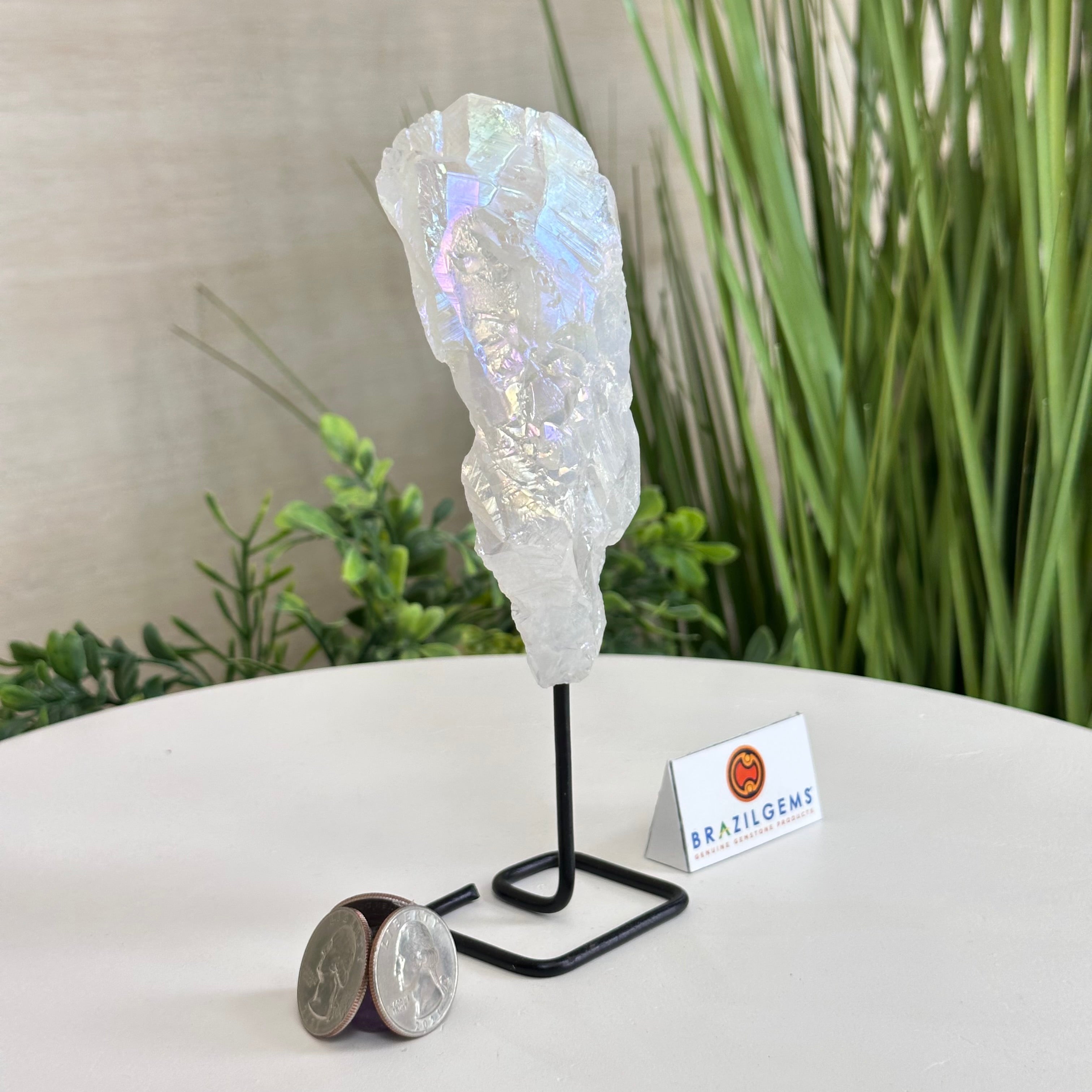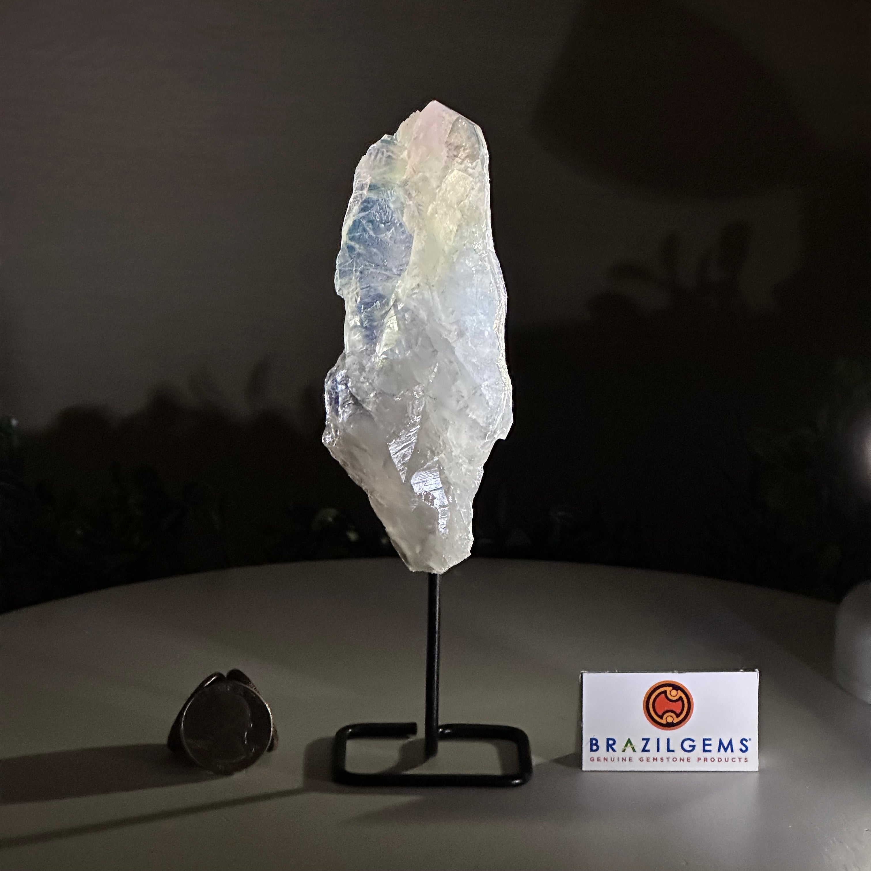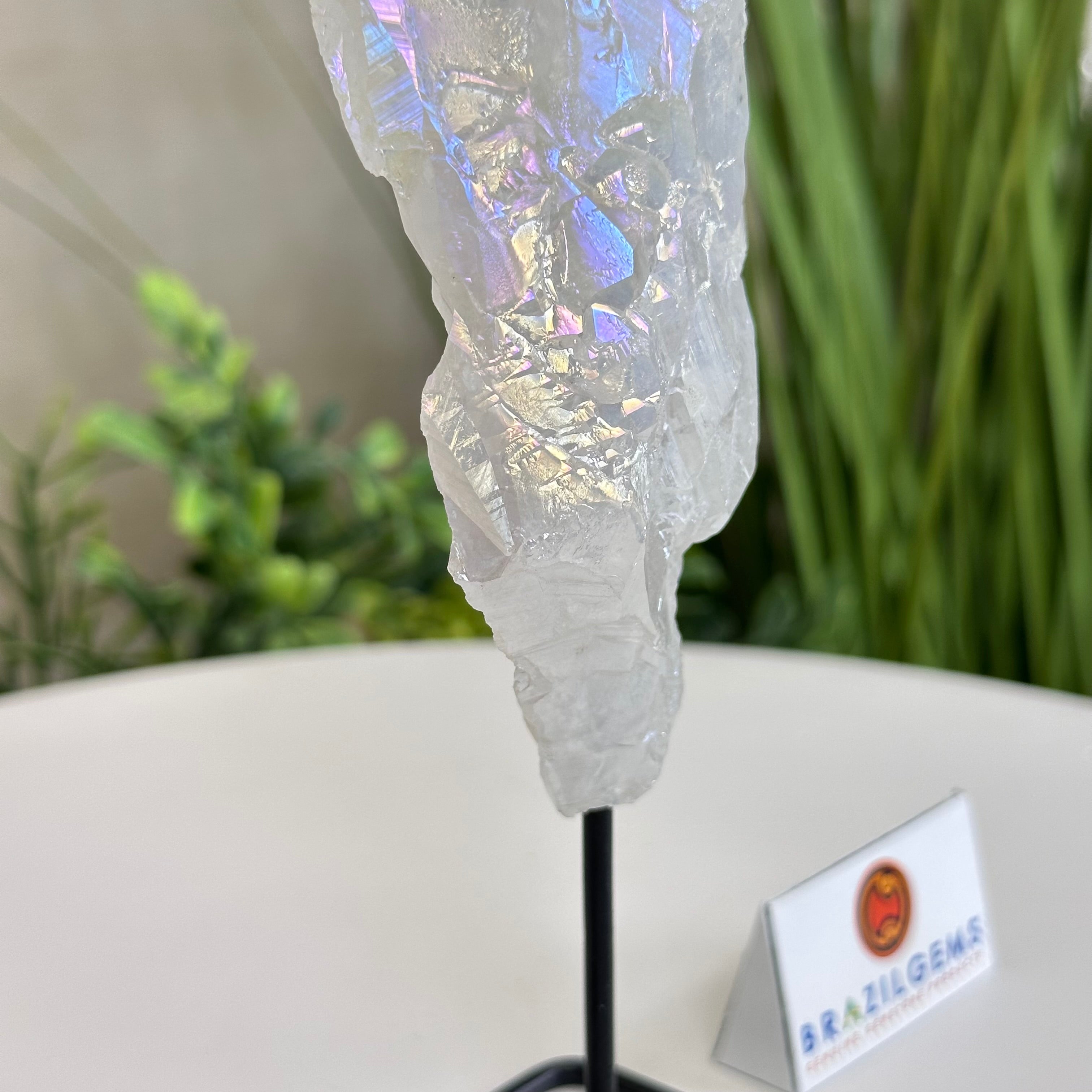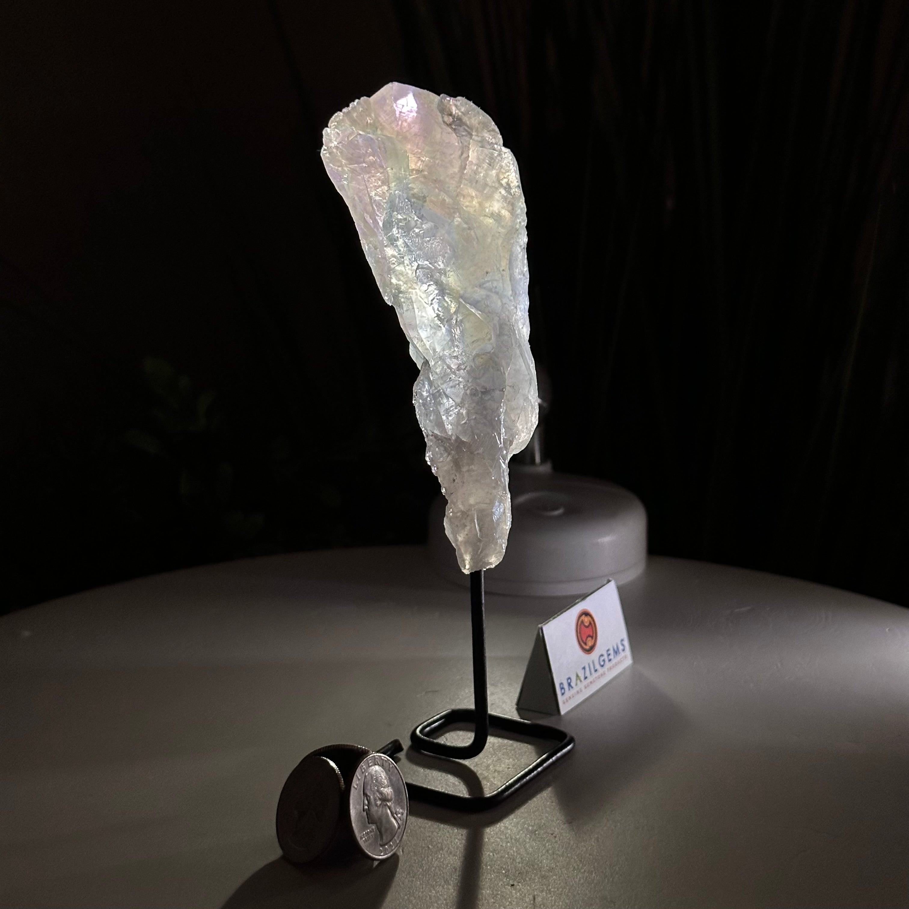 Enhance your home or sacred space with the multi-faceted beauty of this Angel Aura Quartz Point on a metal stand. This iridescent crystal has rough edges and a bright and captivating glow.