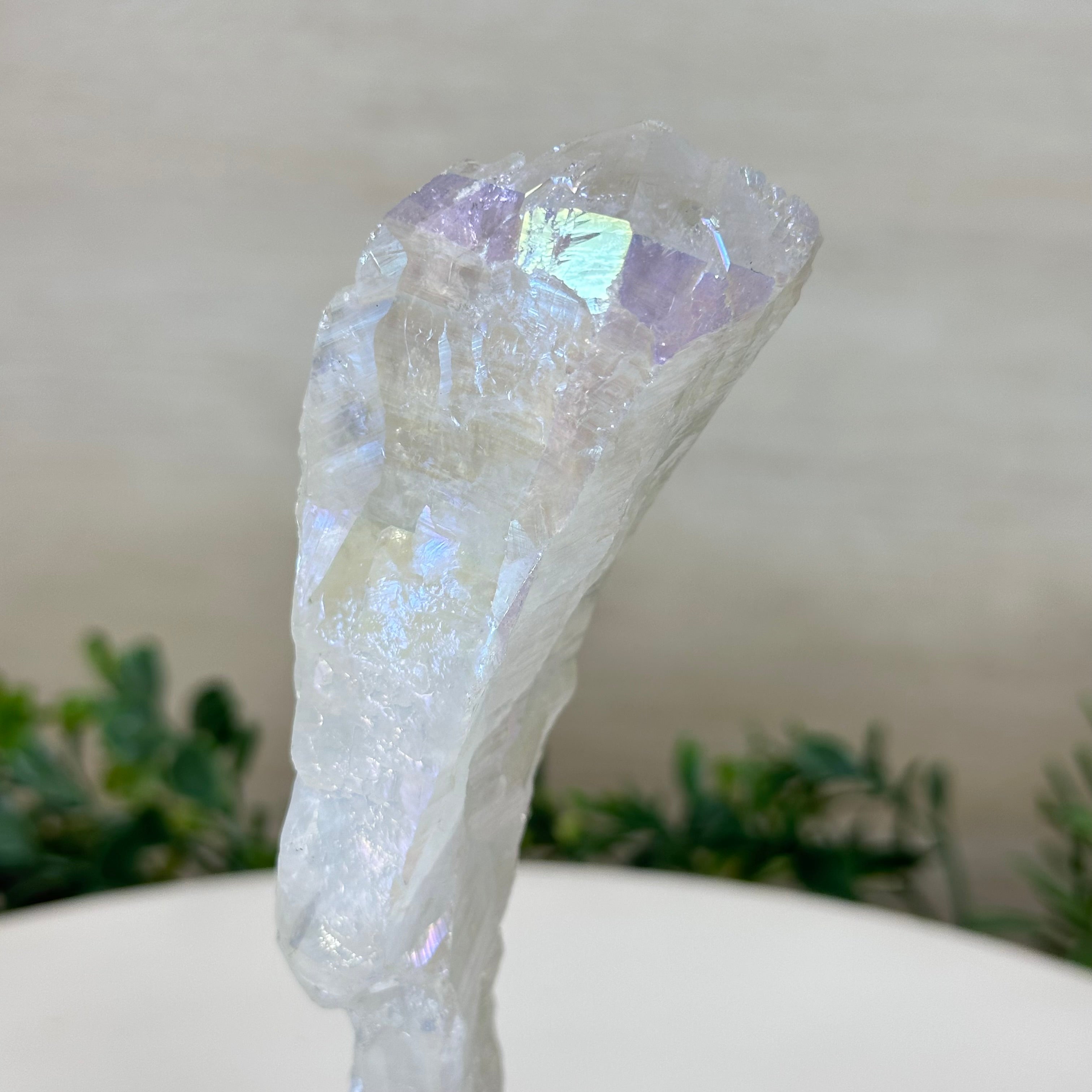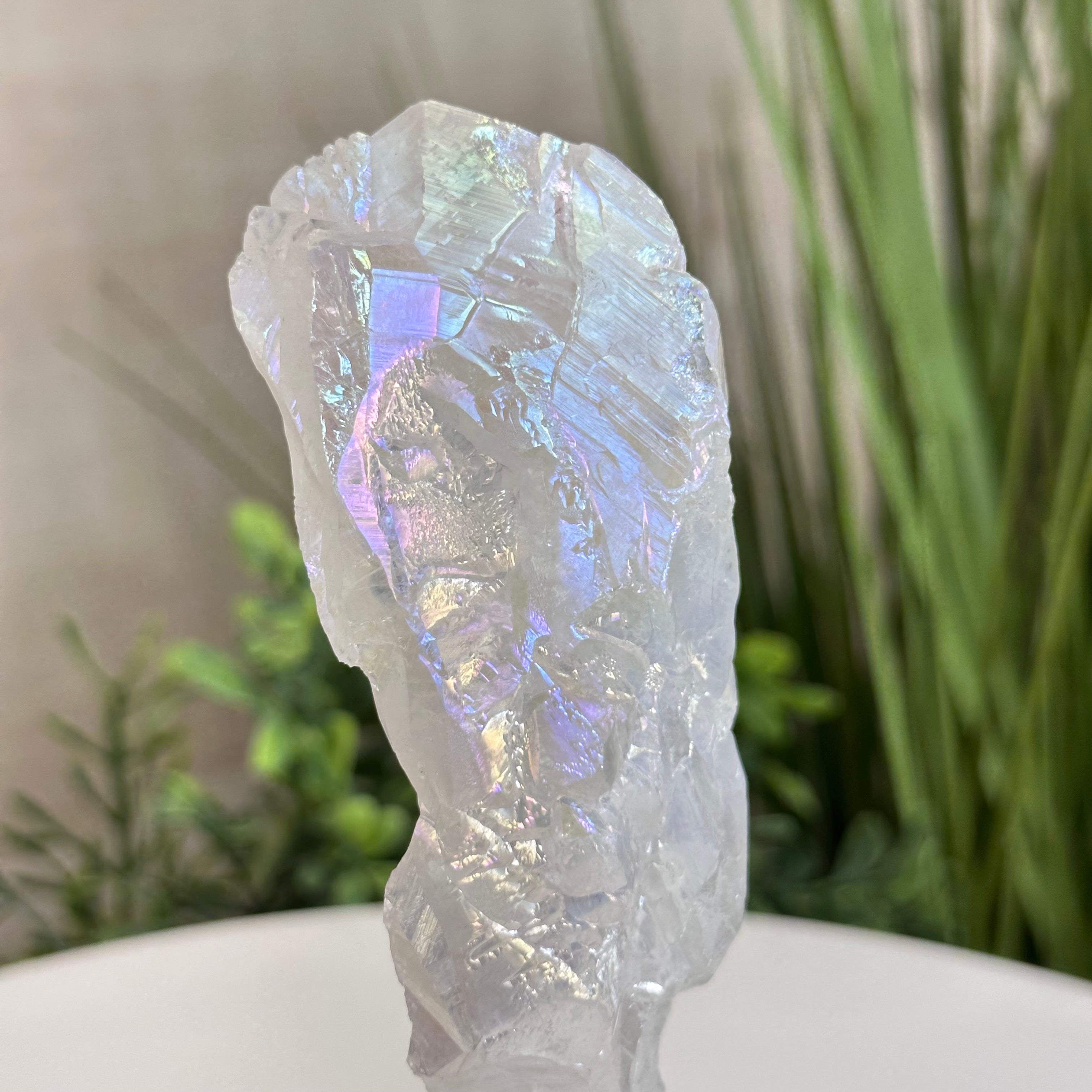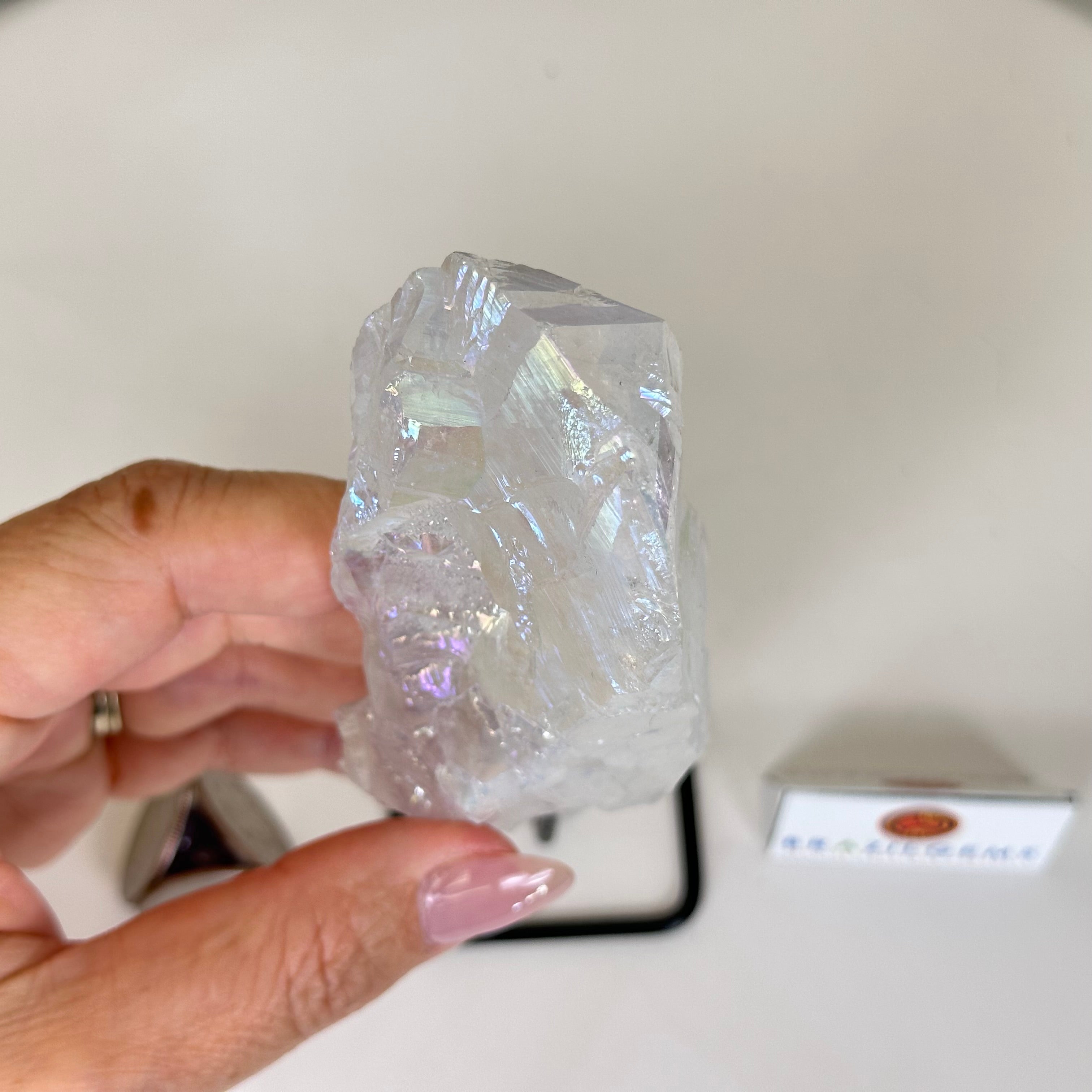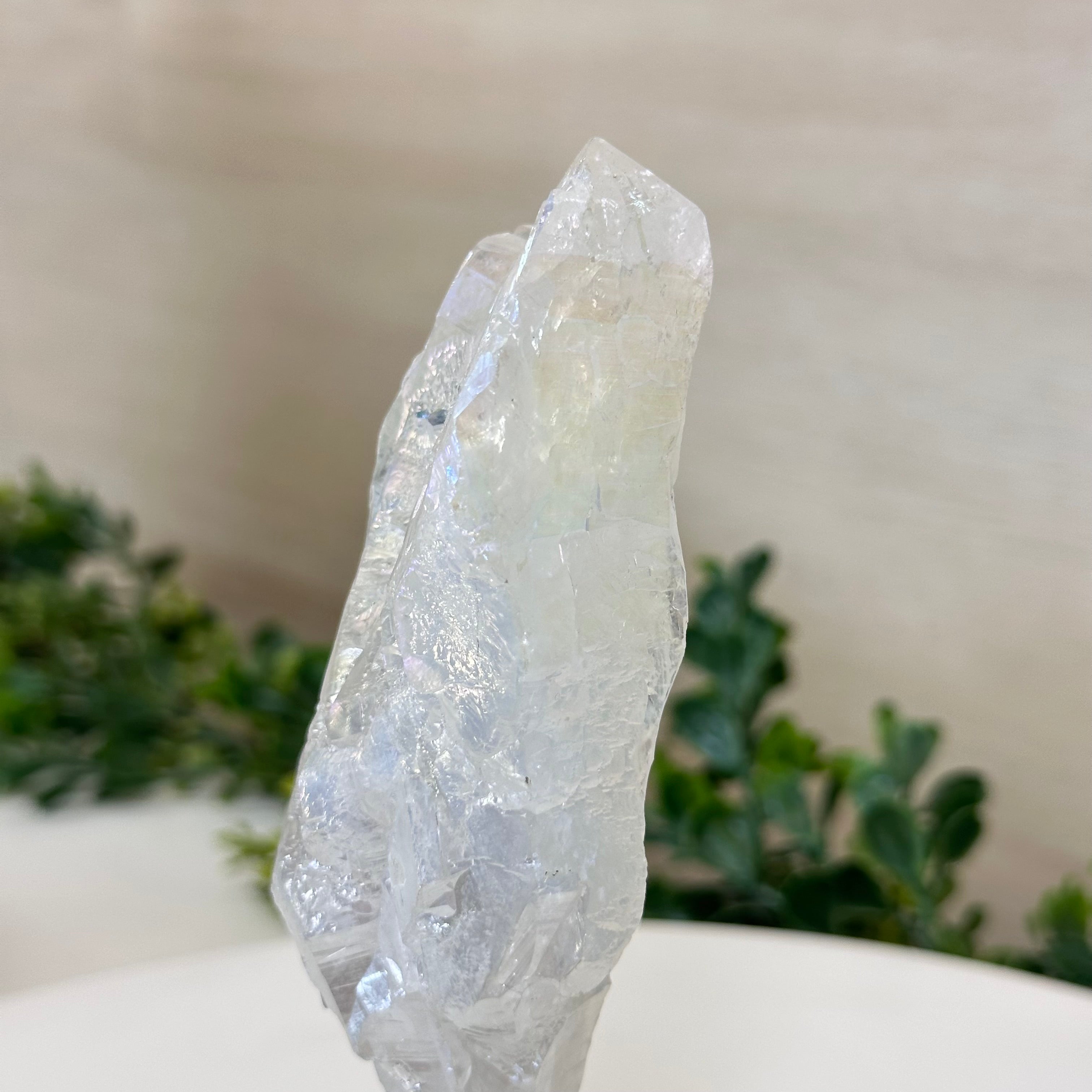 Enhance your home or sacred space with the multi-faceted beauty of this Angel Aura Quartz Point on a metal stand. This iridescent crystal has rough edges and a bright and captivating glow.