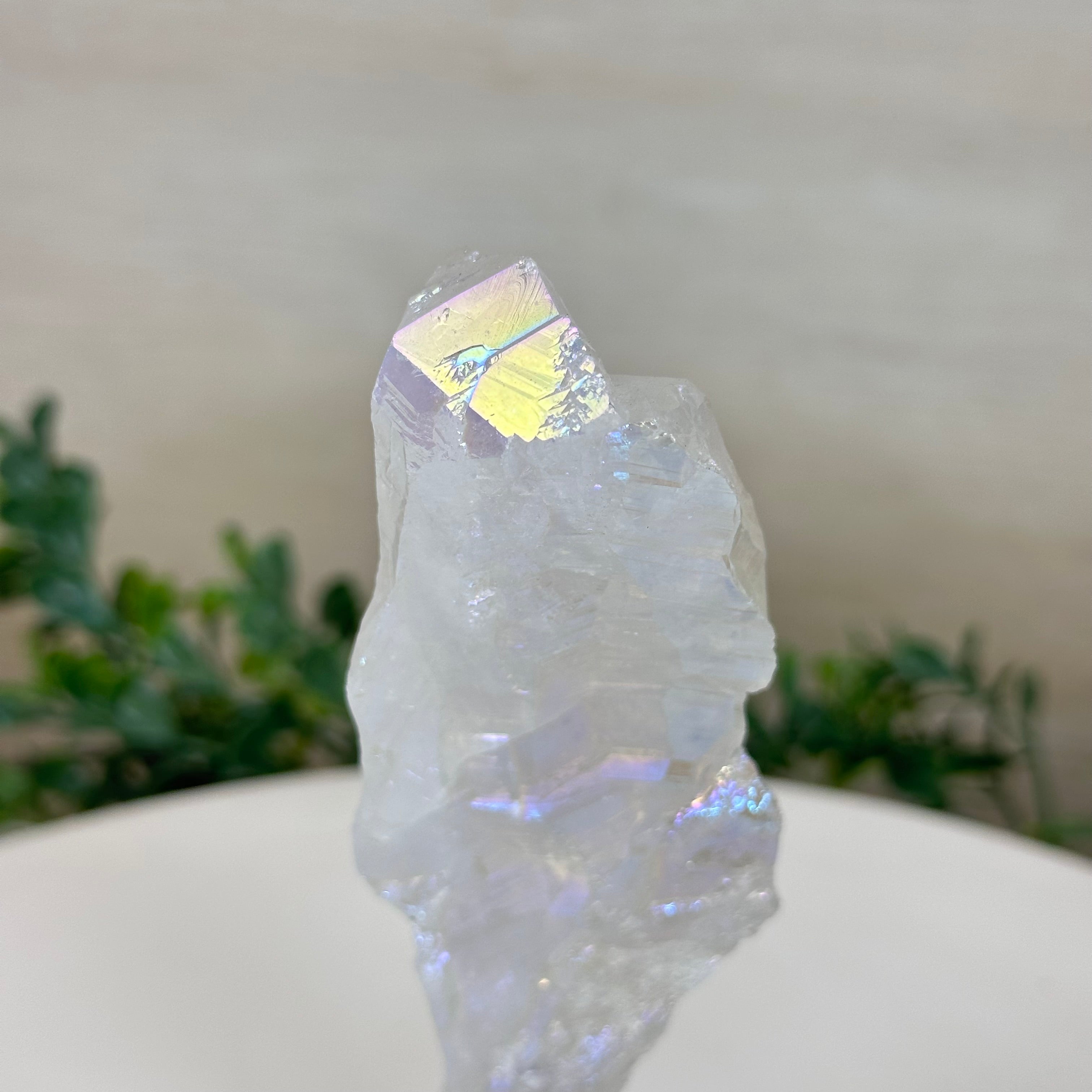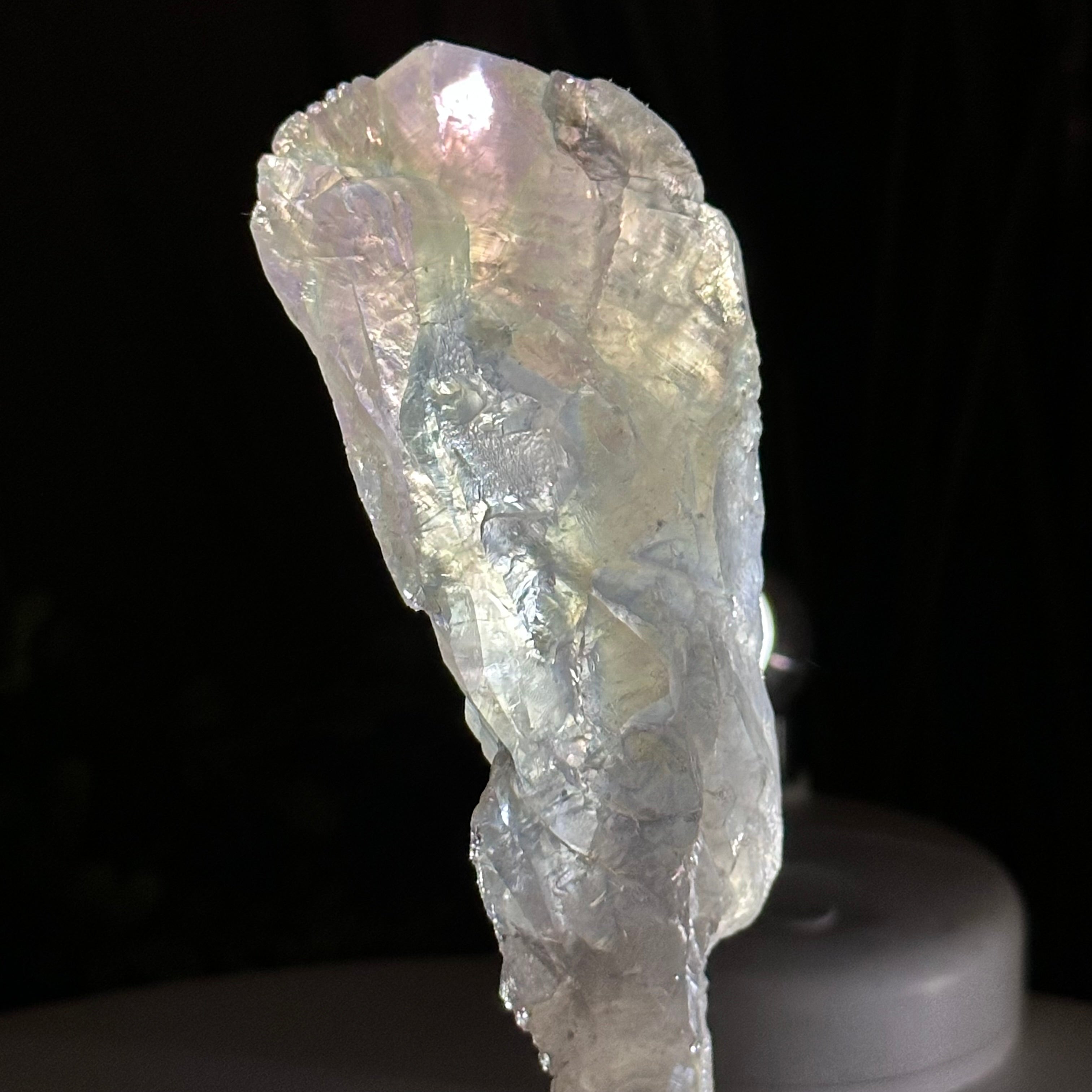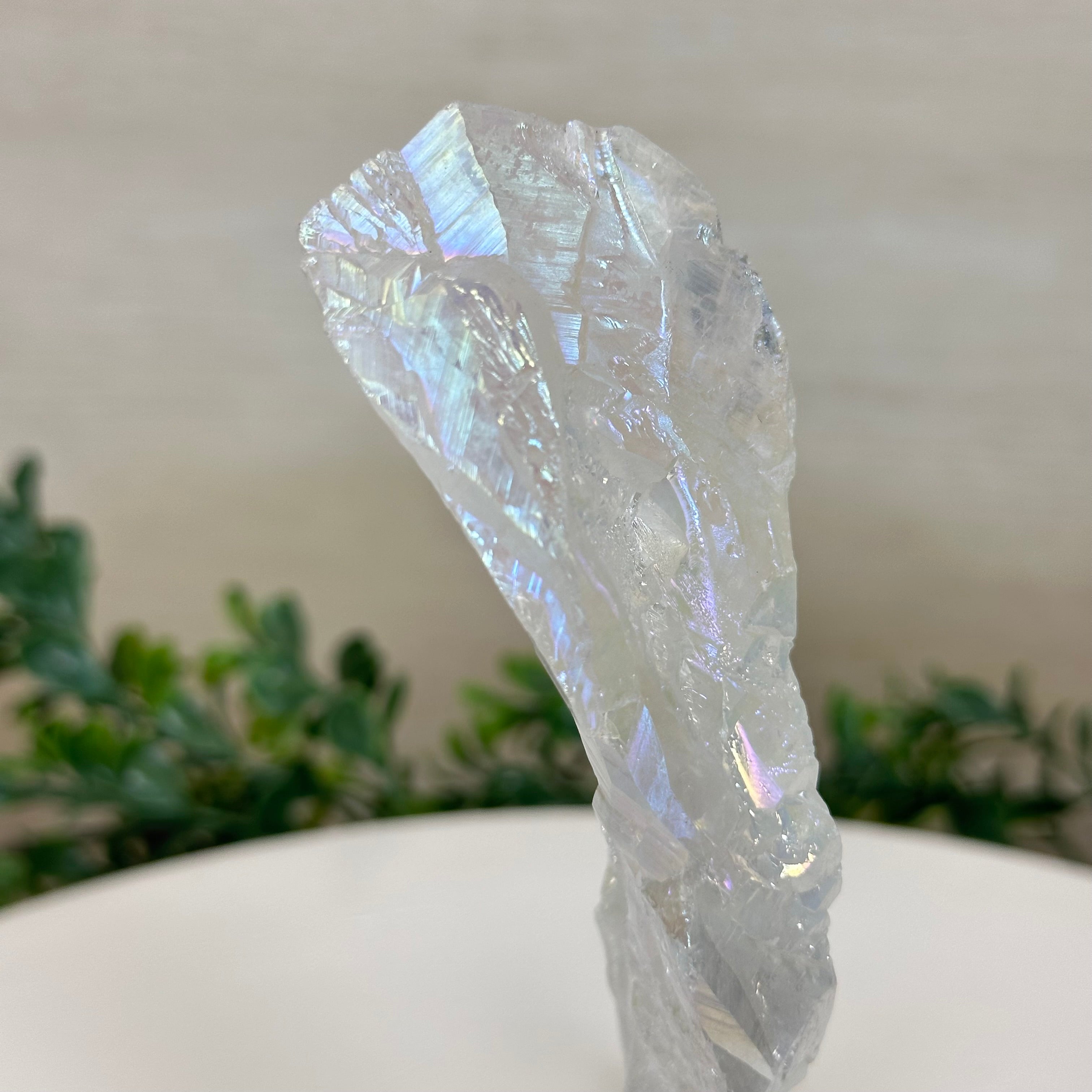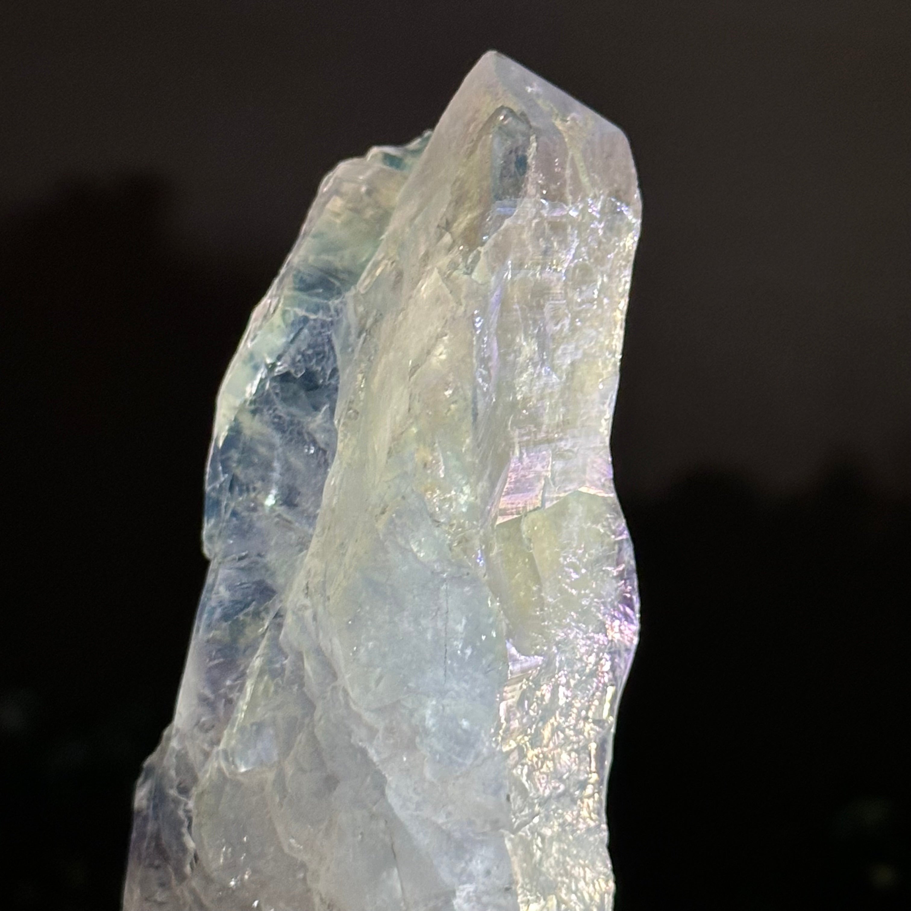 Enhance your home or sacred space with the multi-faceted beauty of this Angel Aura Quartz Point on a metal stand. This iridescent crystal has rough edges and a bright and captivating glow.