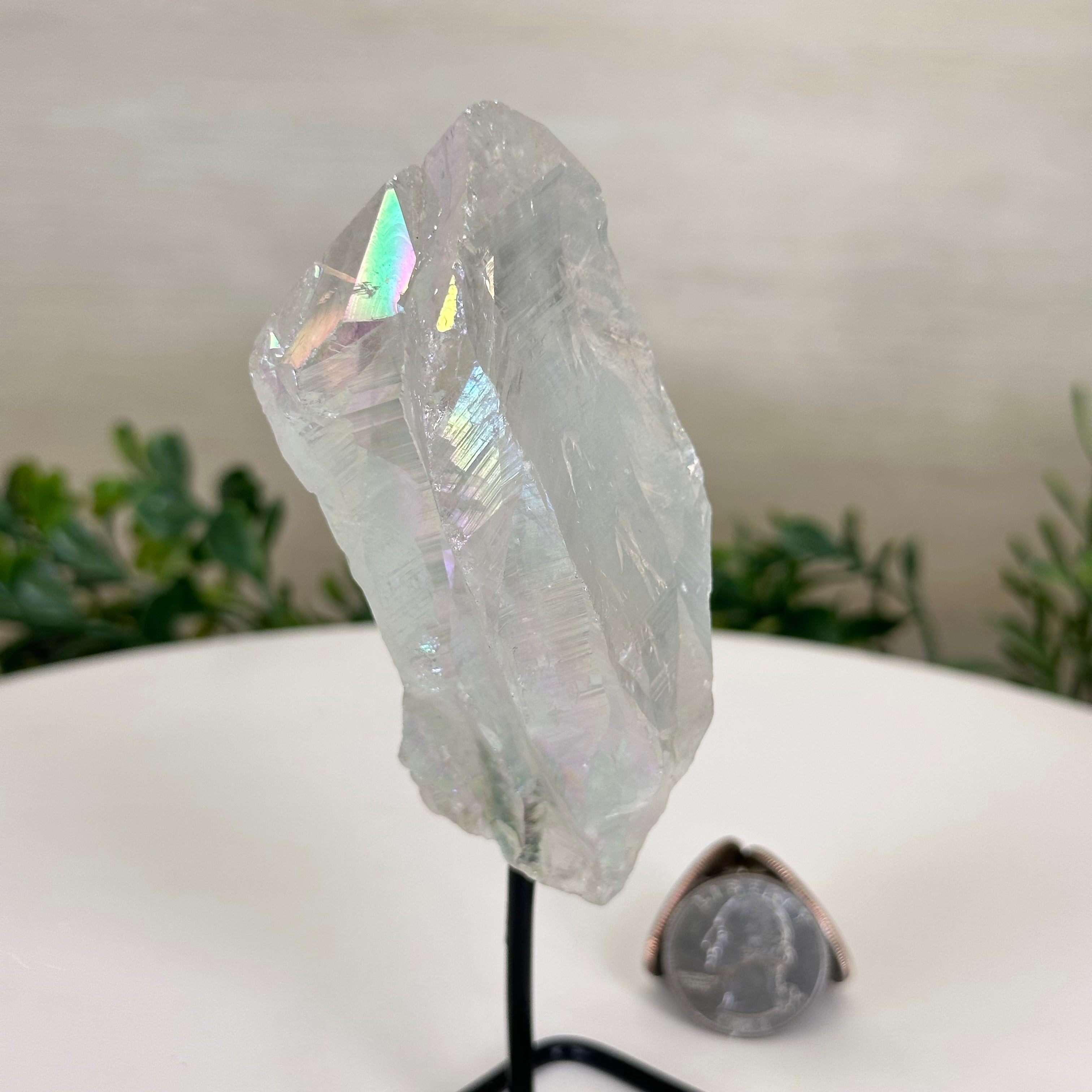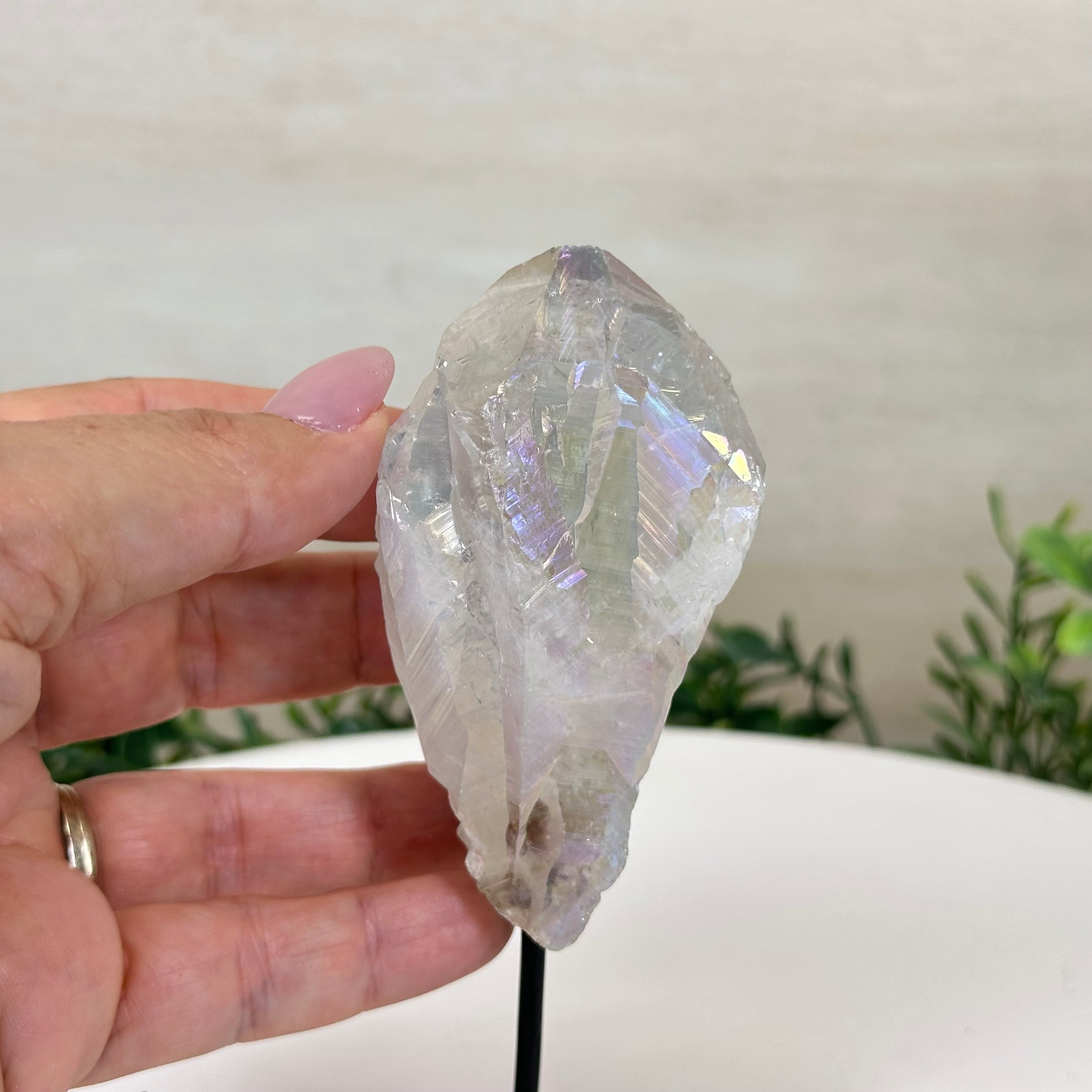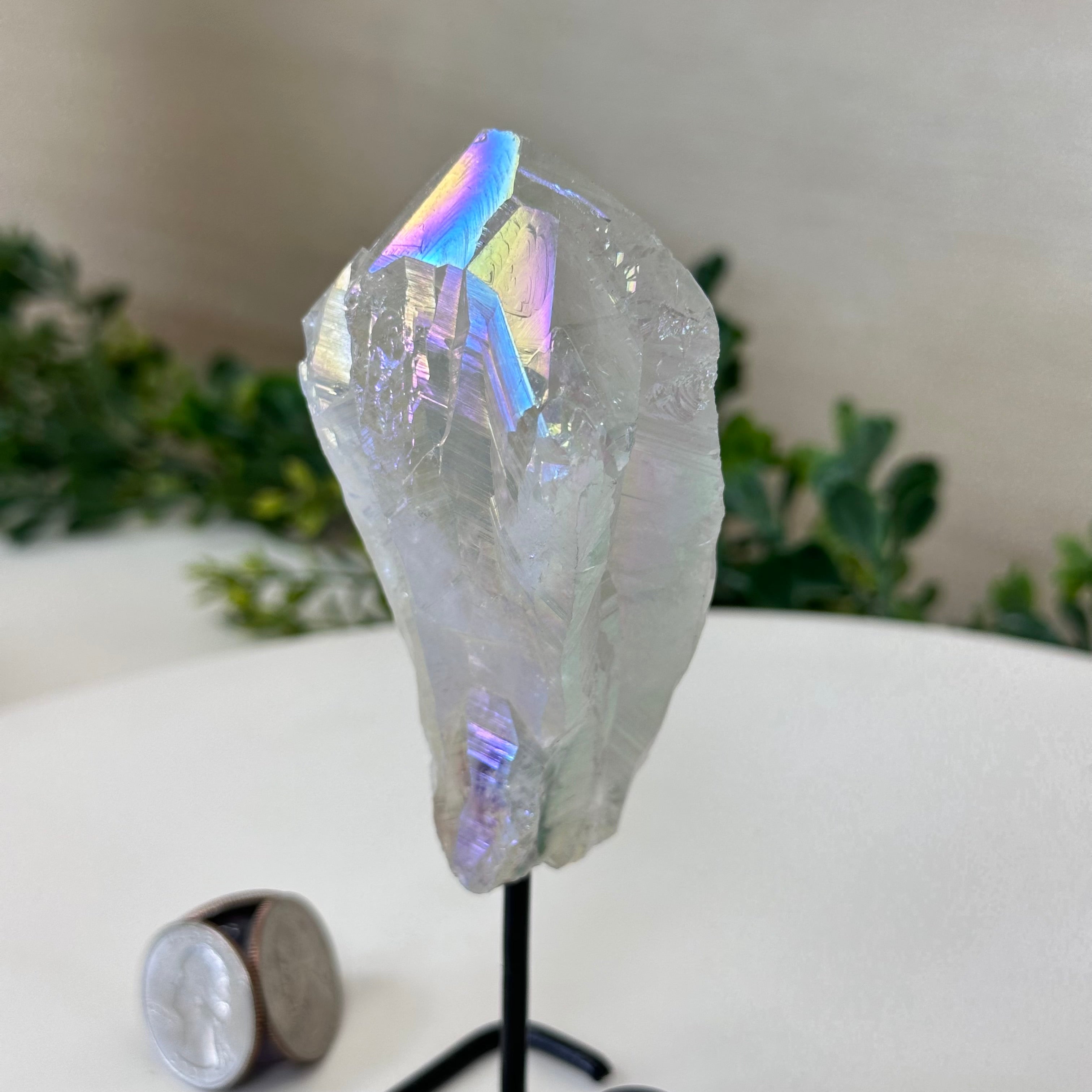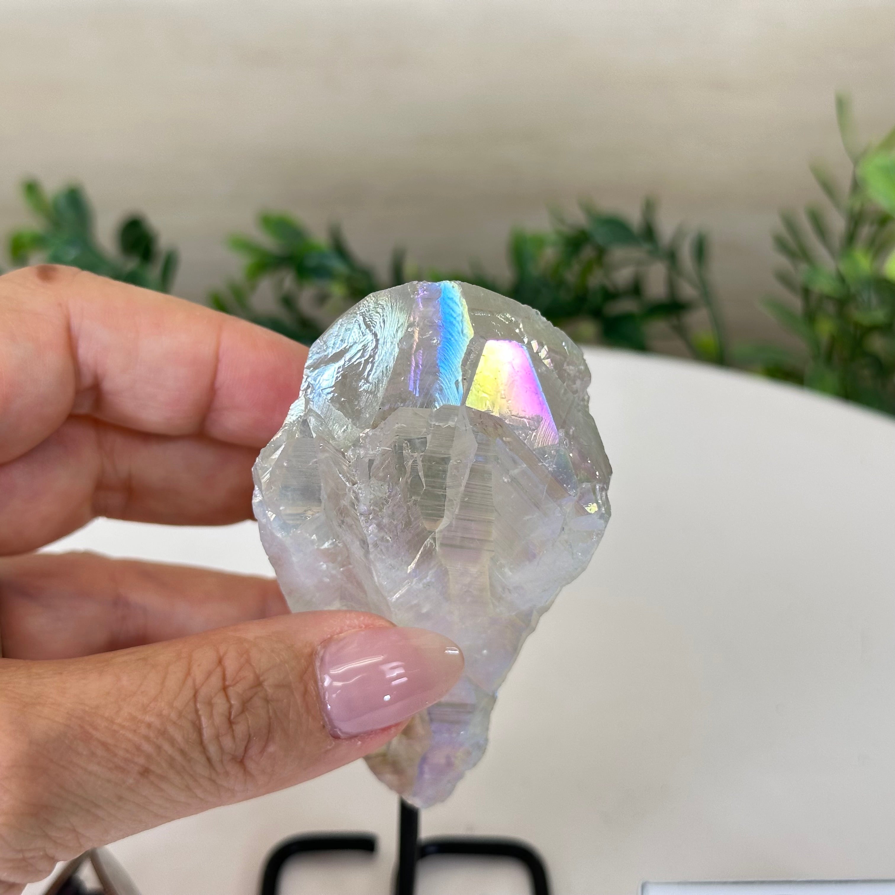 Enhance your home or sacred space with the multi-faceted beauty of this Angel Aura Quartz Point on a metal stand. This iridescent crystal has rough edges and a bright and captivating glow.