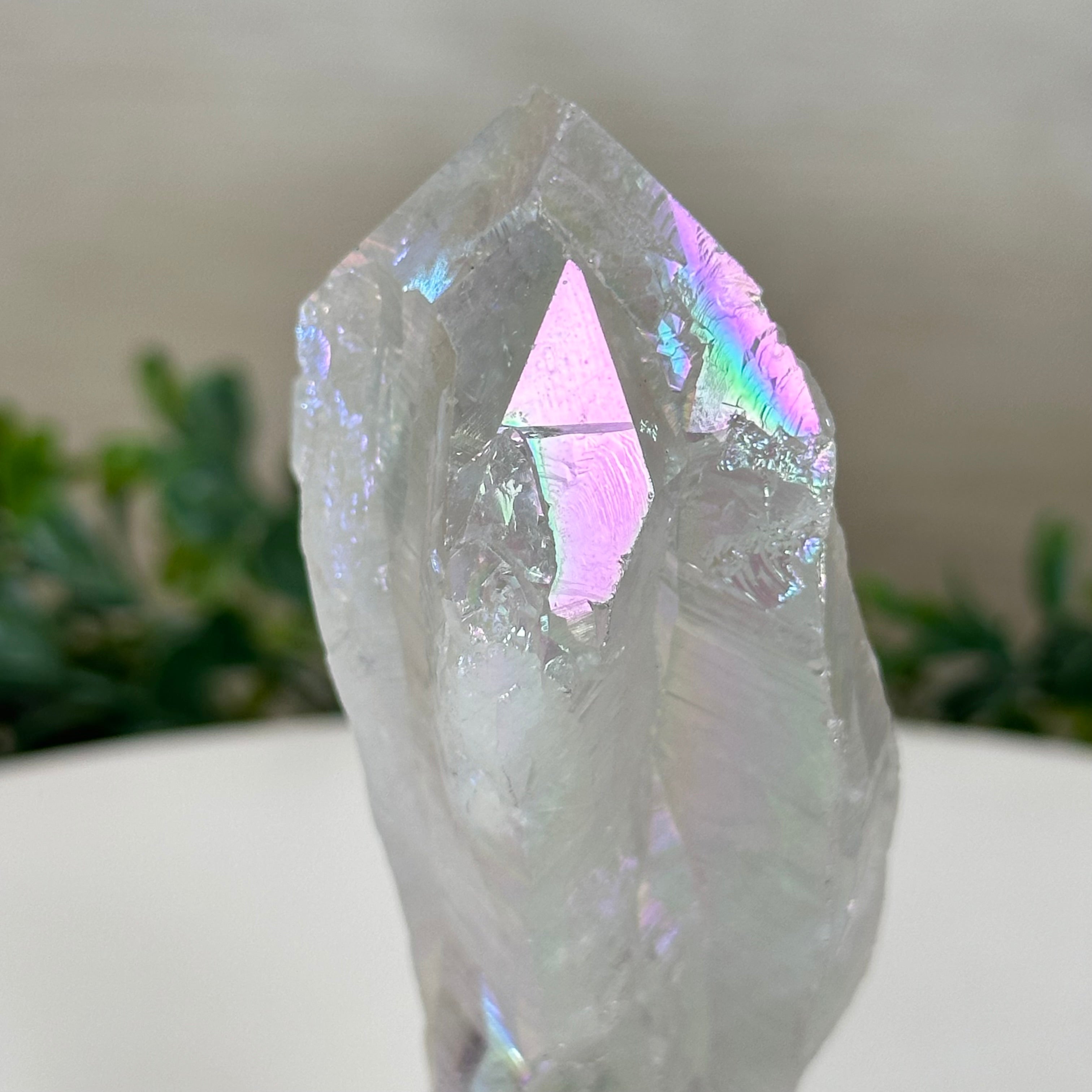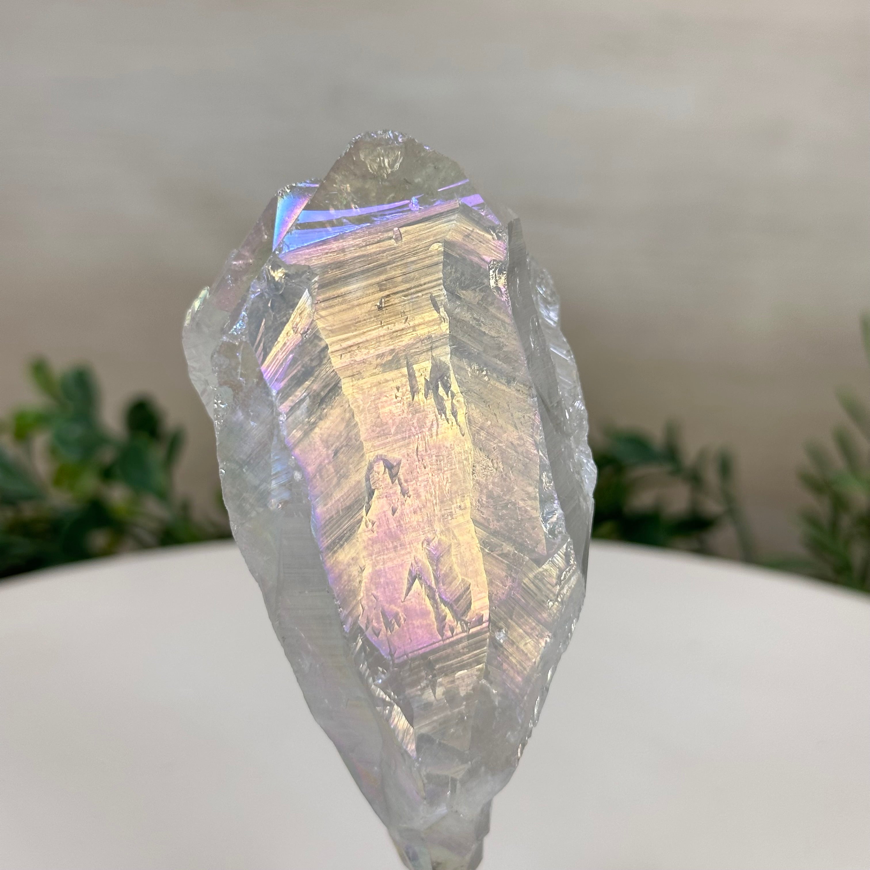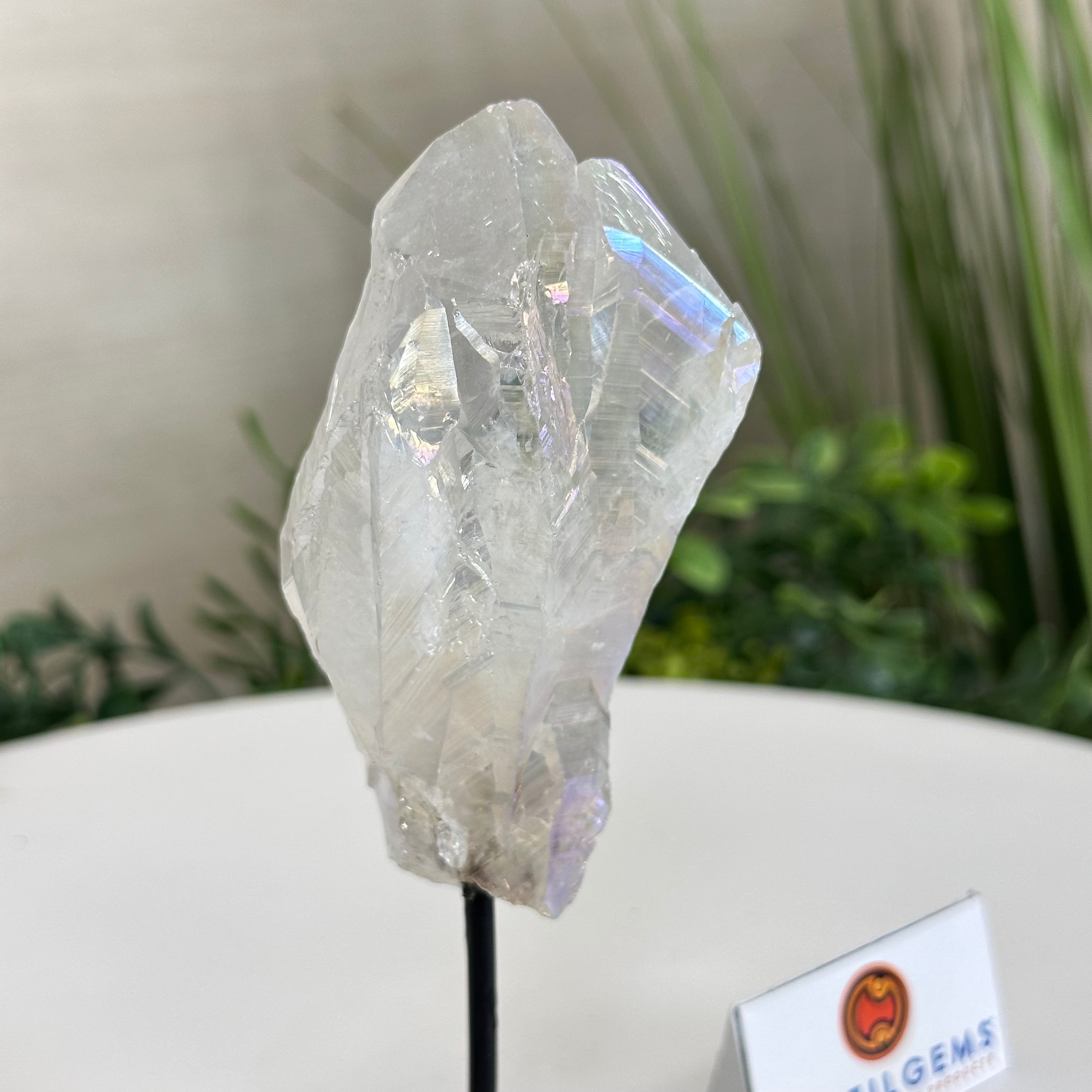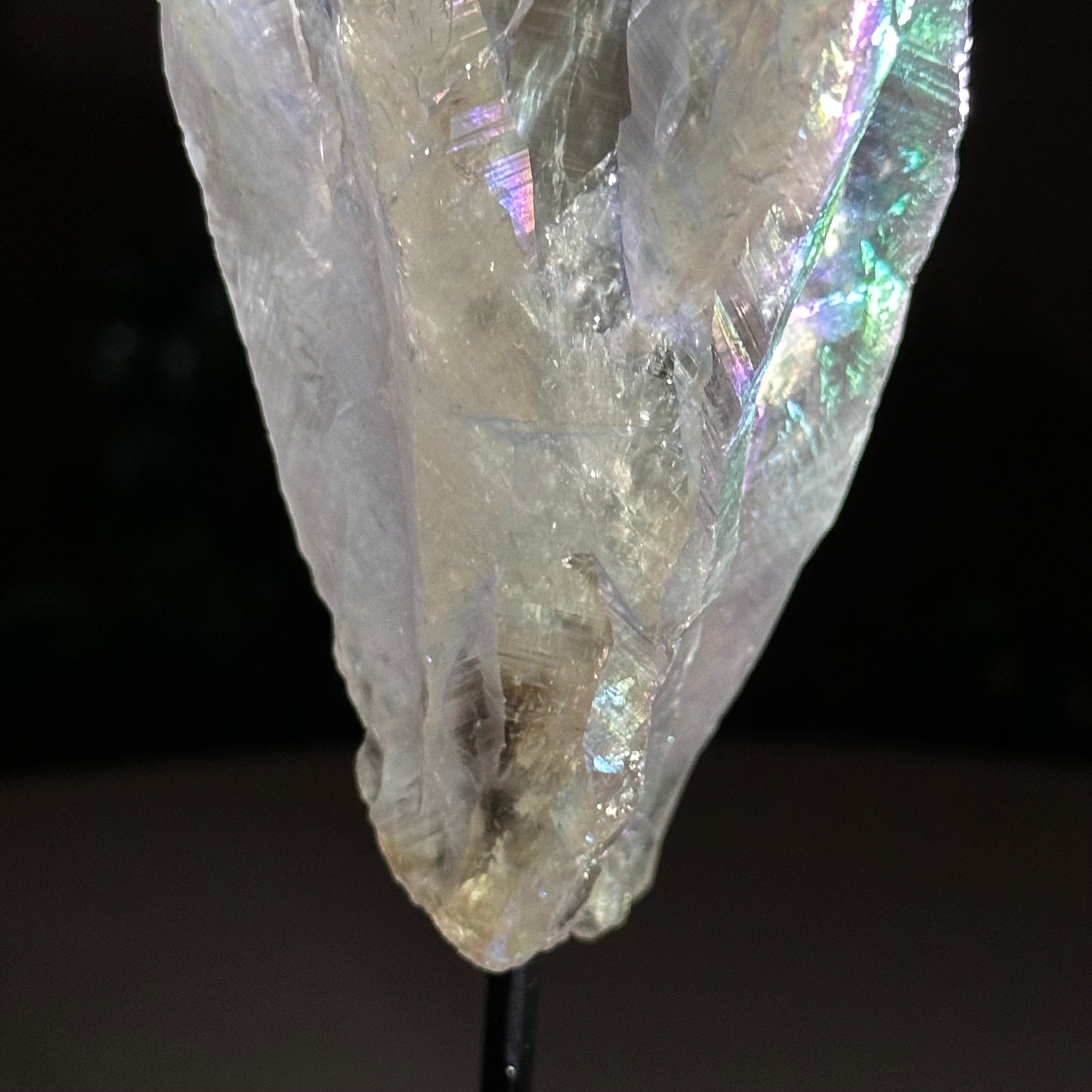 Enhance your home or sacred space with the multi-faceted beauty of this Angel Aura Quartz Point on a metal stand. This iridescent crystal has rough edges and a bright and captivating glow.