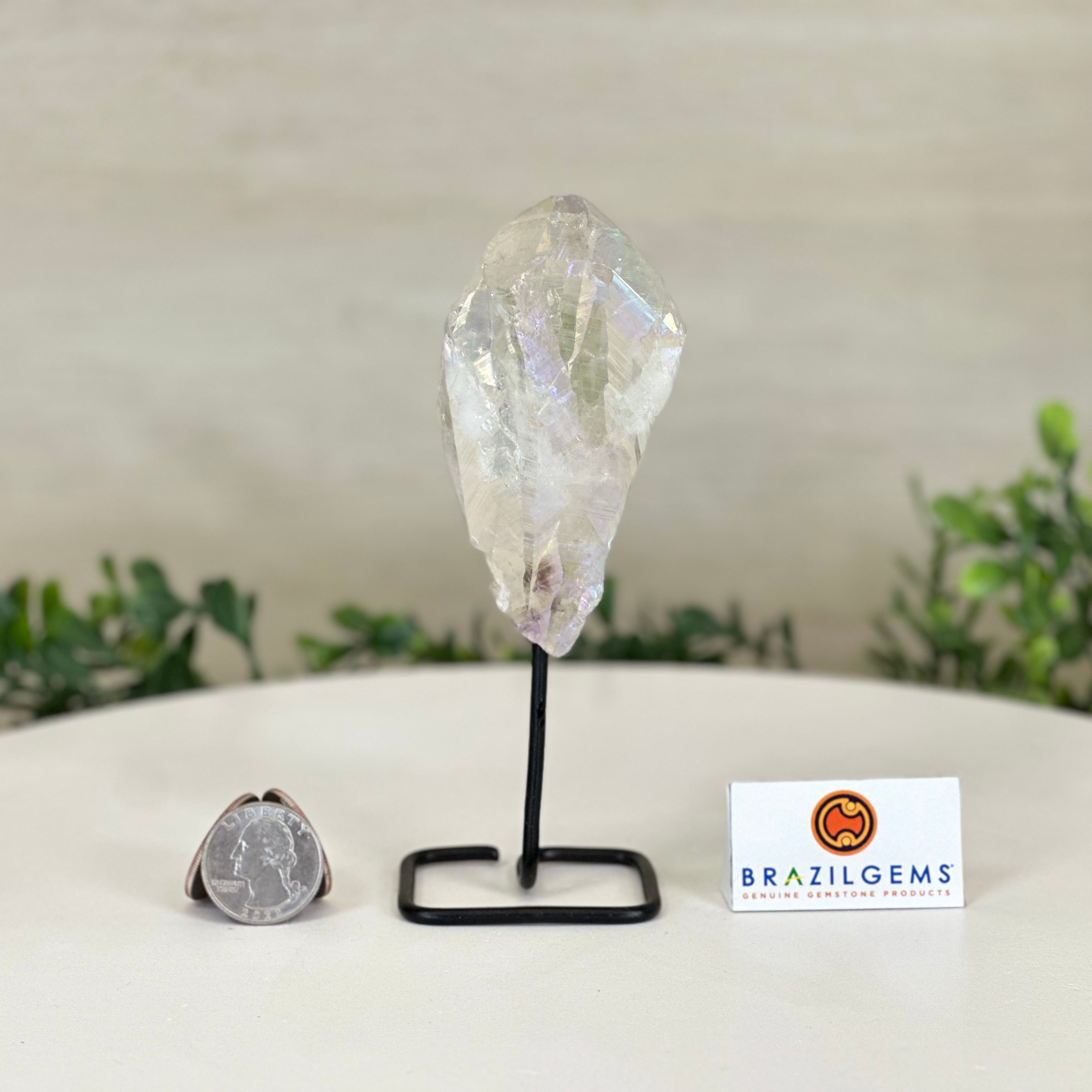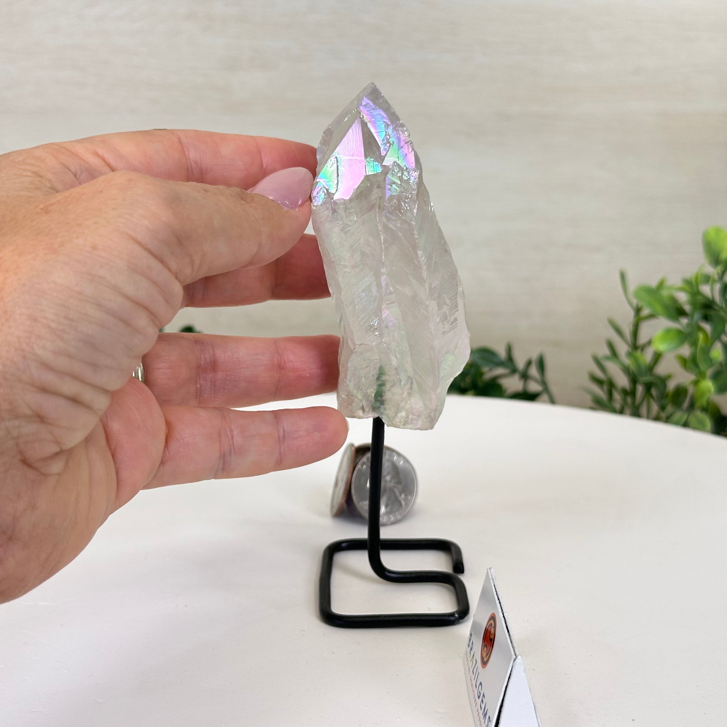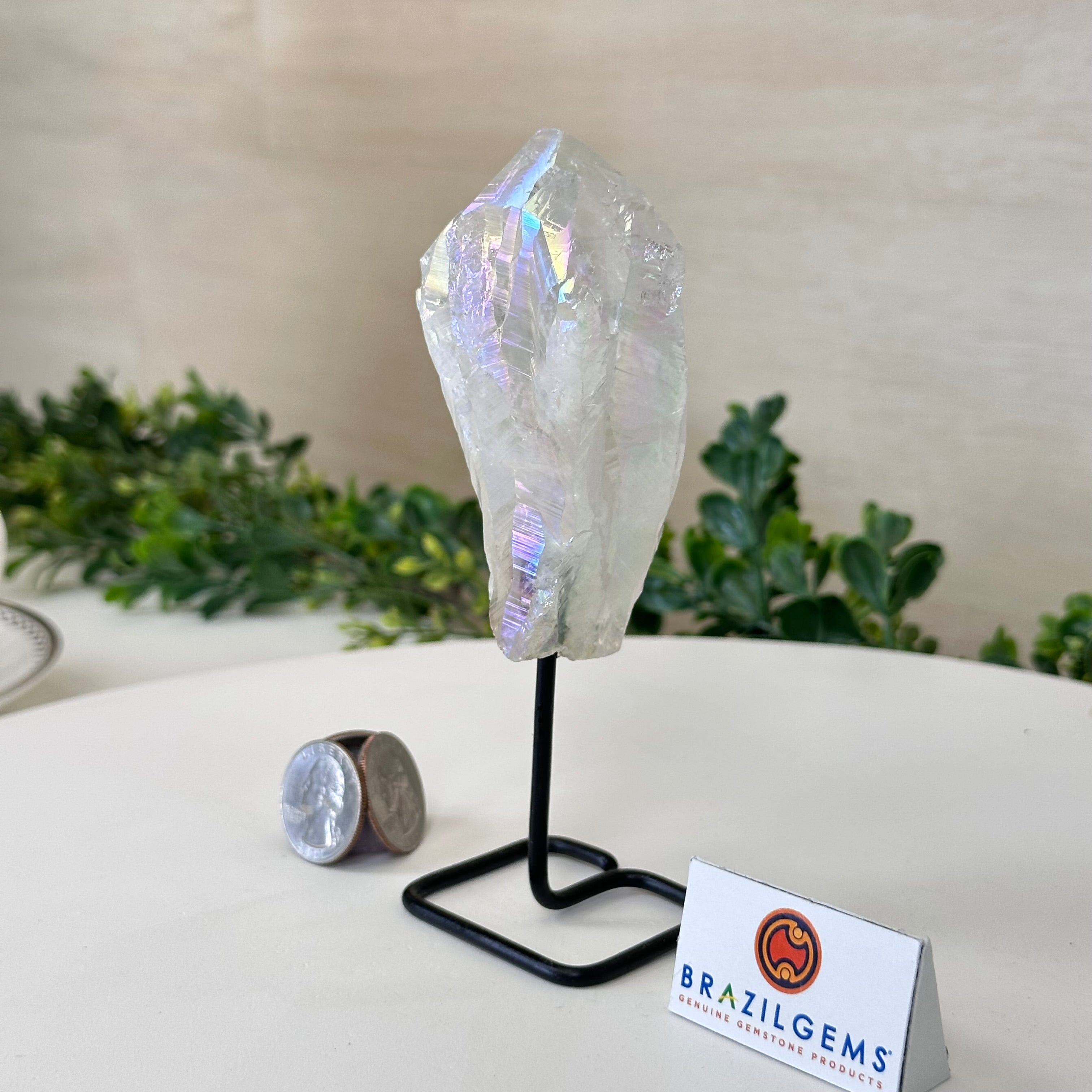 Disclaimer: This is a natural gemstone crystal sold by Brazil Gems® as is and as you see it in its images and video. It is the exact one you will receive. It may contain natural imperfections and/or imperfections, broken edges and repairs from the extraction, mounting and aura-effect bonding processes. The crystal has a hole drilled into the bottom of it so it could be mounted onto its black-painted metal stand. The Angel Aura effect is achieved through a process called vacuum deposition where vaporized metals such as silver and/or platinum are bonded to the natural crystal in a vacuum chamber giving it that iridescent pearlized sheen. At Brazil Gems® we make every effort to get measurements as exact as possible but they are done by human hands and eyes and therefore may have minor discrepancies.