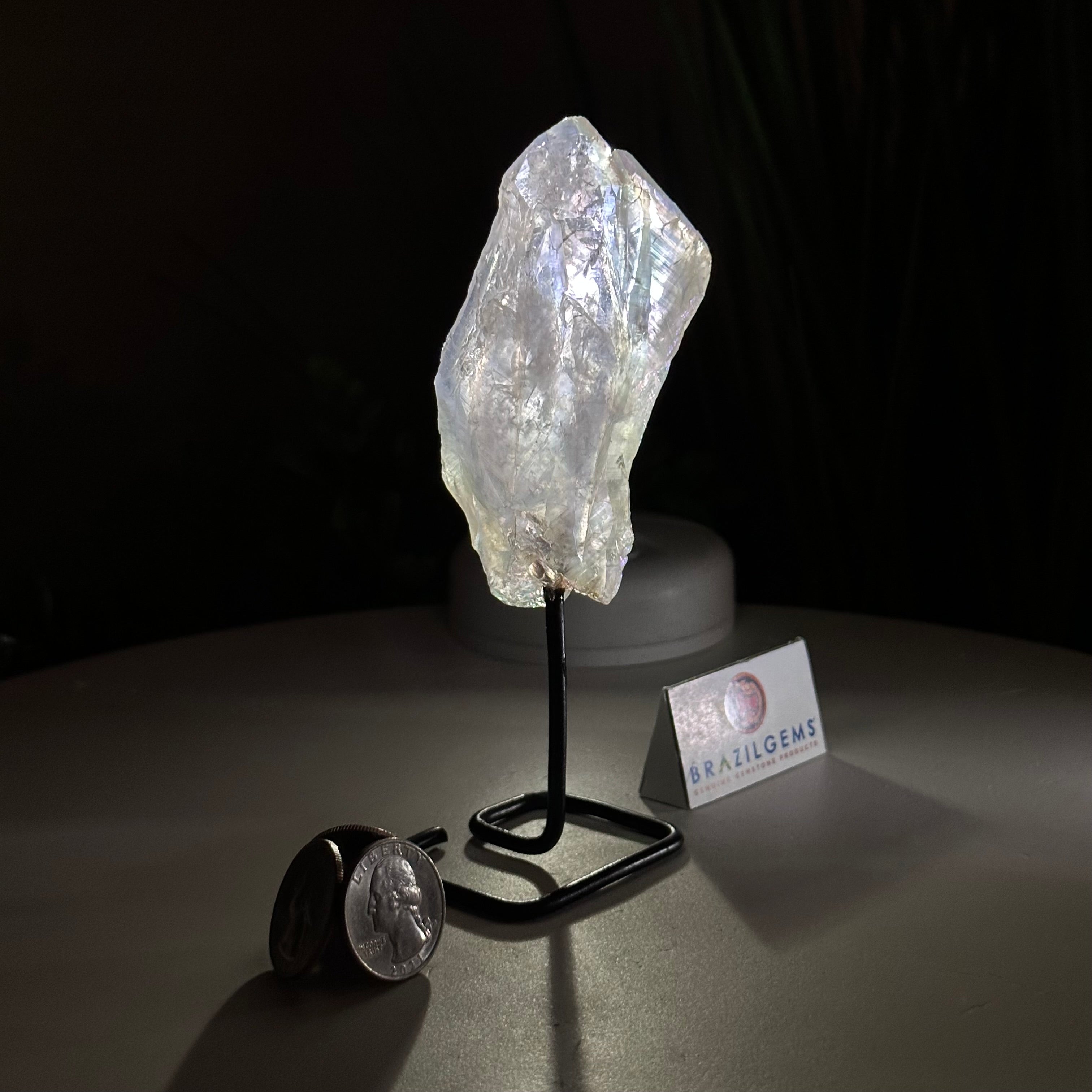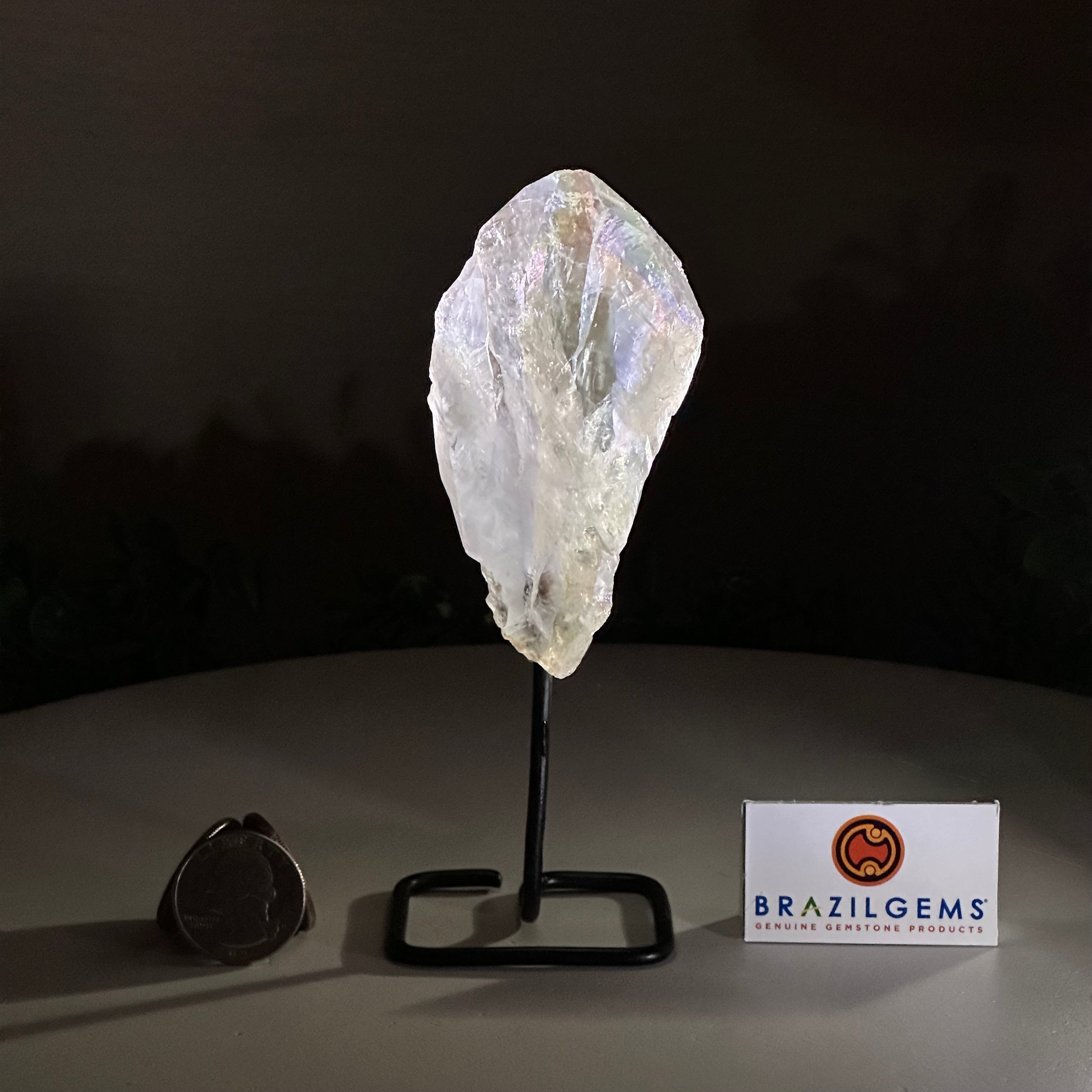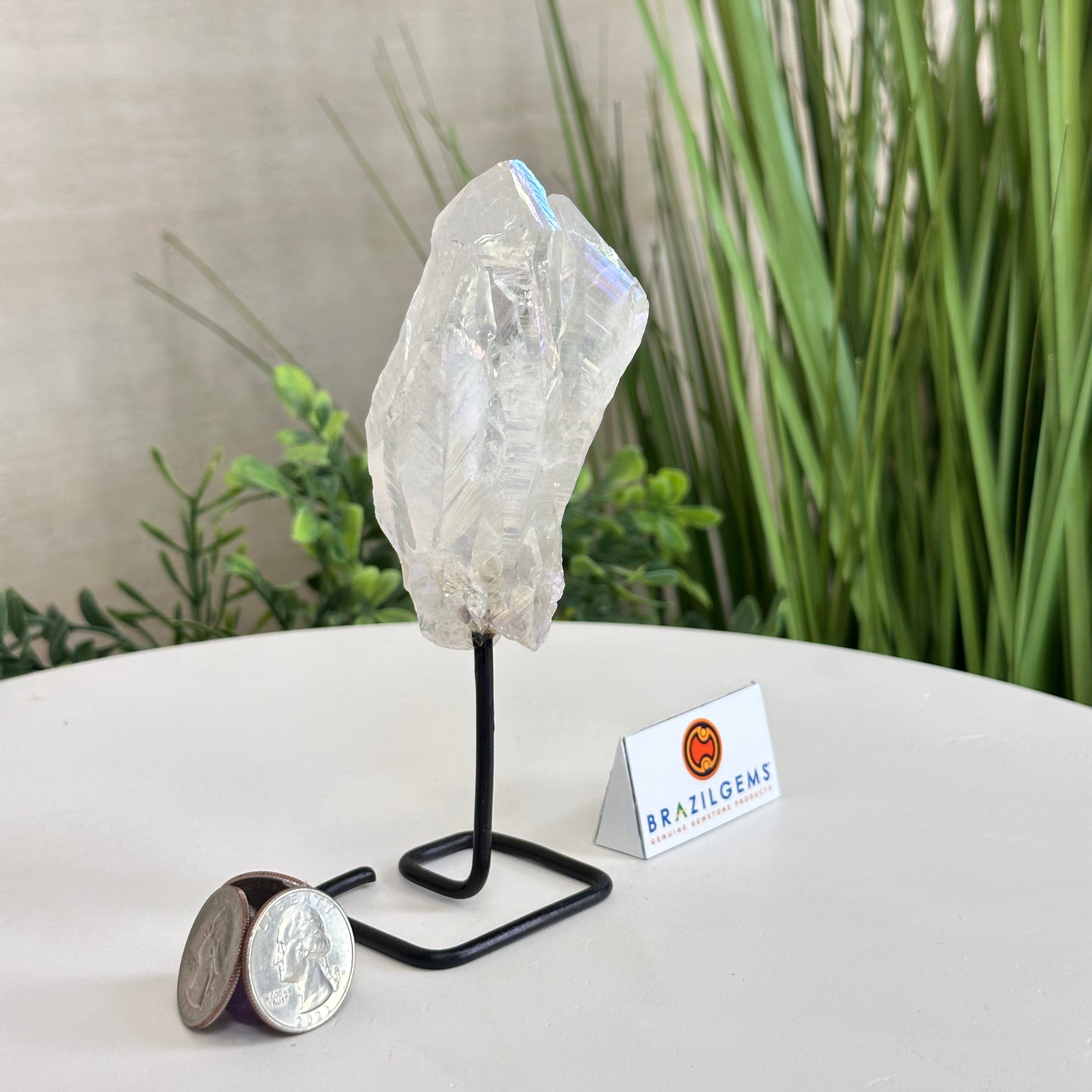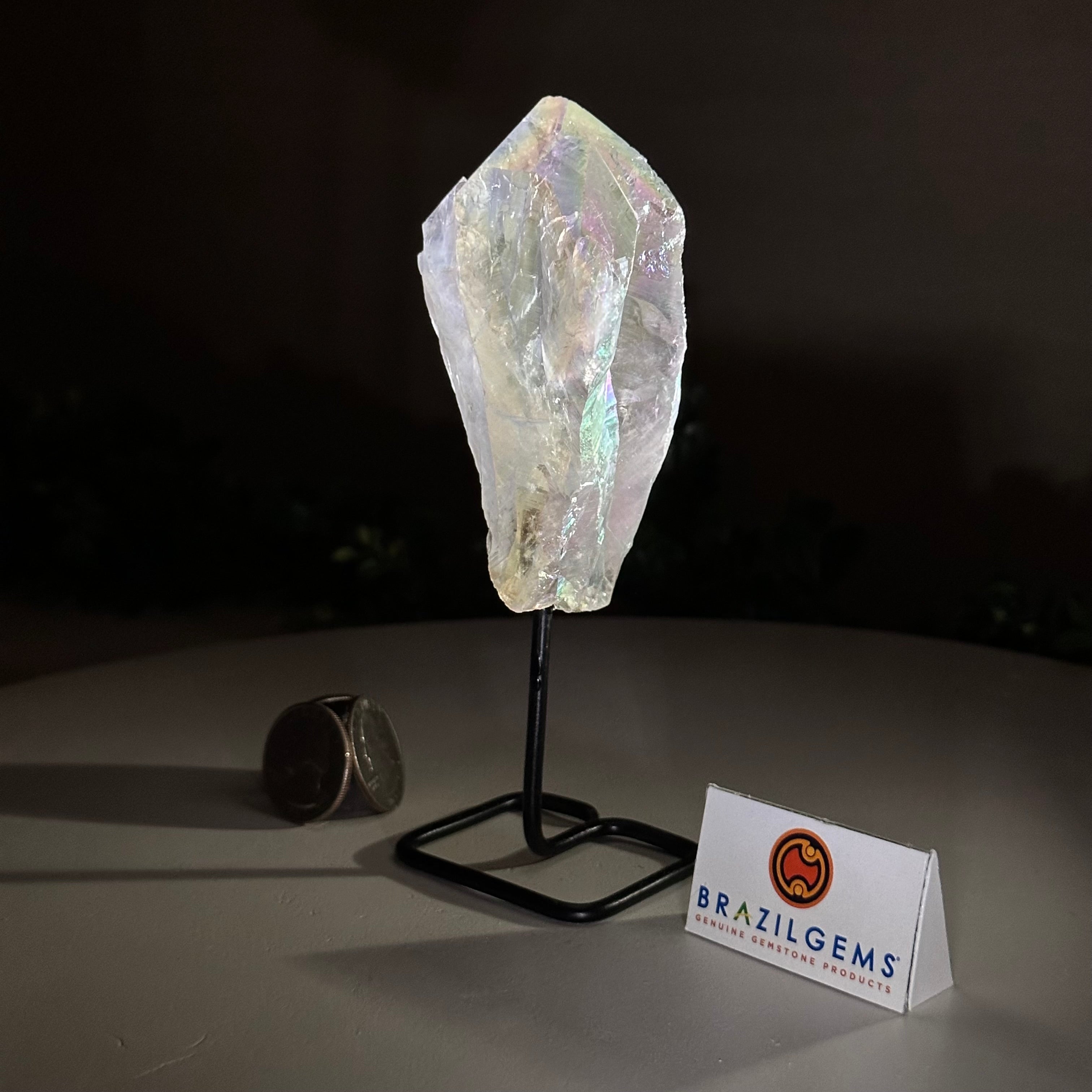 Disclaimer: This is a natural gemstone crystal sold by Brazil Gems® as is and as you see it in its images and video. It is the exact one you will receive. It may contain natural imperfections and/or imperfections, broken edges and repairs from the extraction, mounting and aura-effect bonding processes. The crystal has a hole drilled into the bottom of it so it could be mounted onto its black-painted metal stand. The Angel Aura effect is achieved through a process called vacuum deposition where vaporized metals such as silver and/or platinum are bonded to the natural crystal in a vacuum chamber giving it that iridescent pearlized sheen. At Brazil Gems® we make every effort to get measurements as exact as possible but they are done by human hands and eyes and therefore may have minor discrepancies.