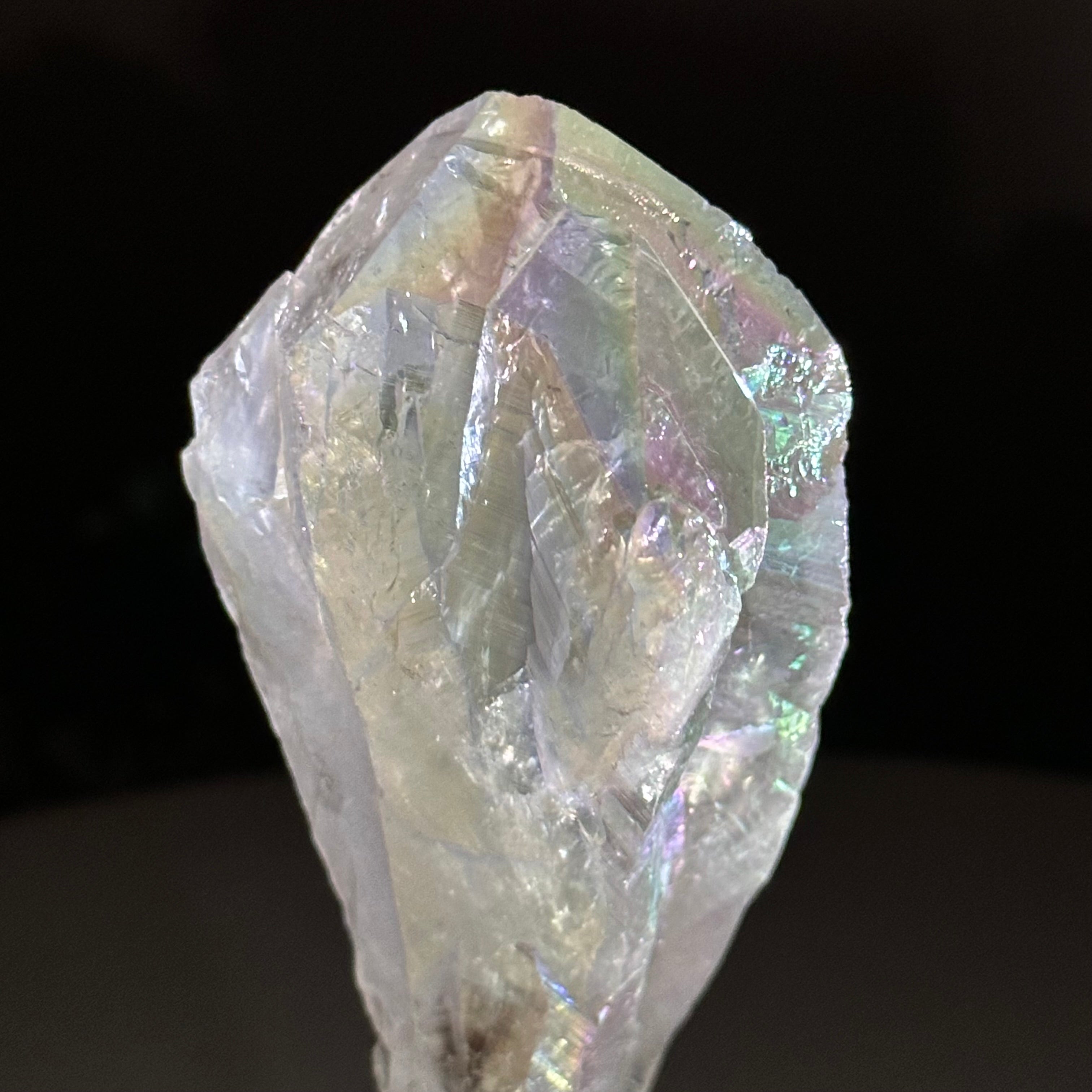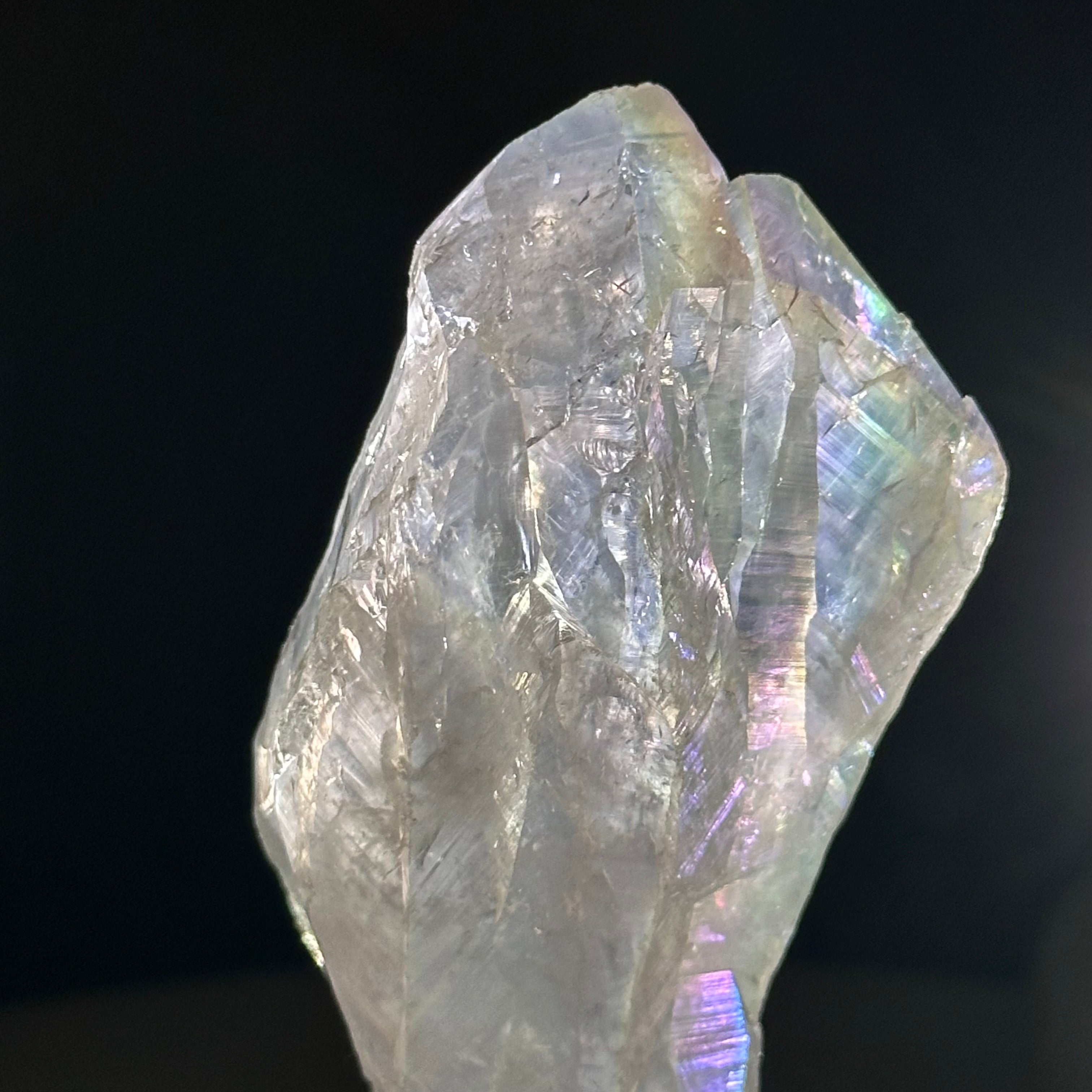 The angel aura effect is achieved through a process called vacuum deposition where vaporized metals such as silver and/or platinum are bonded to the natural crystal in a vacuum chamber giving it that beautiful iridescent pearlized sheen. The result shows luminous pastel colors that change when seen from different angles.