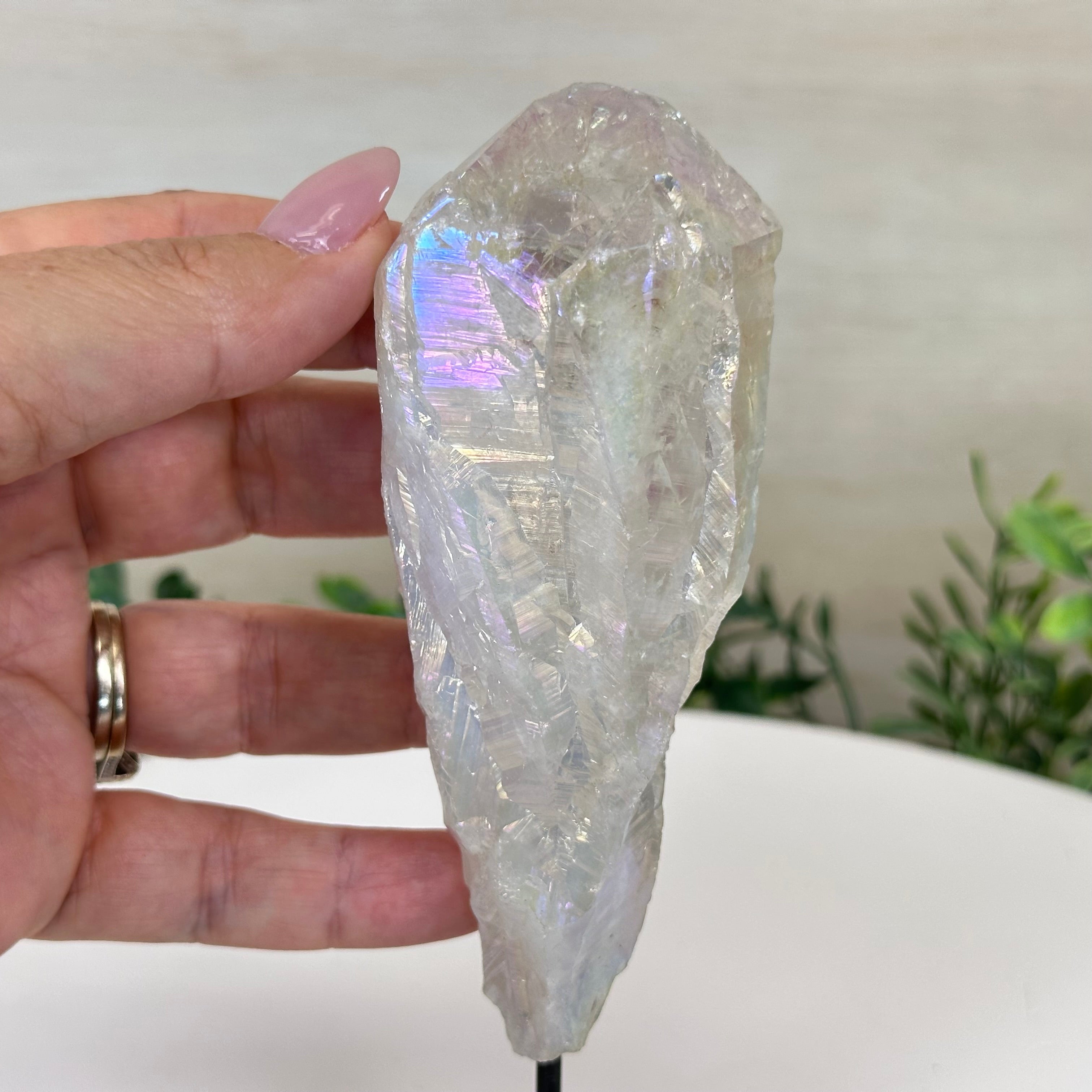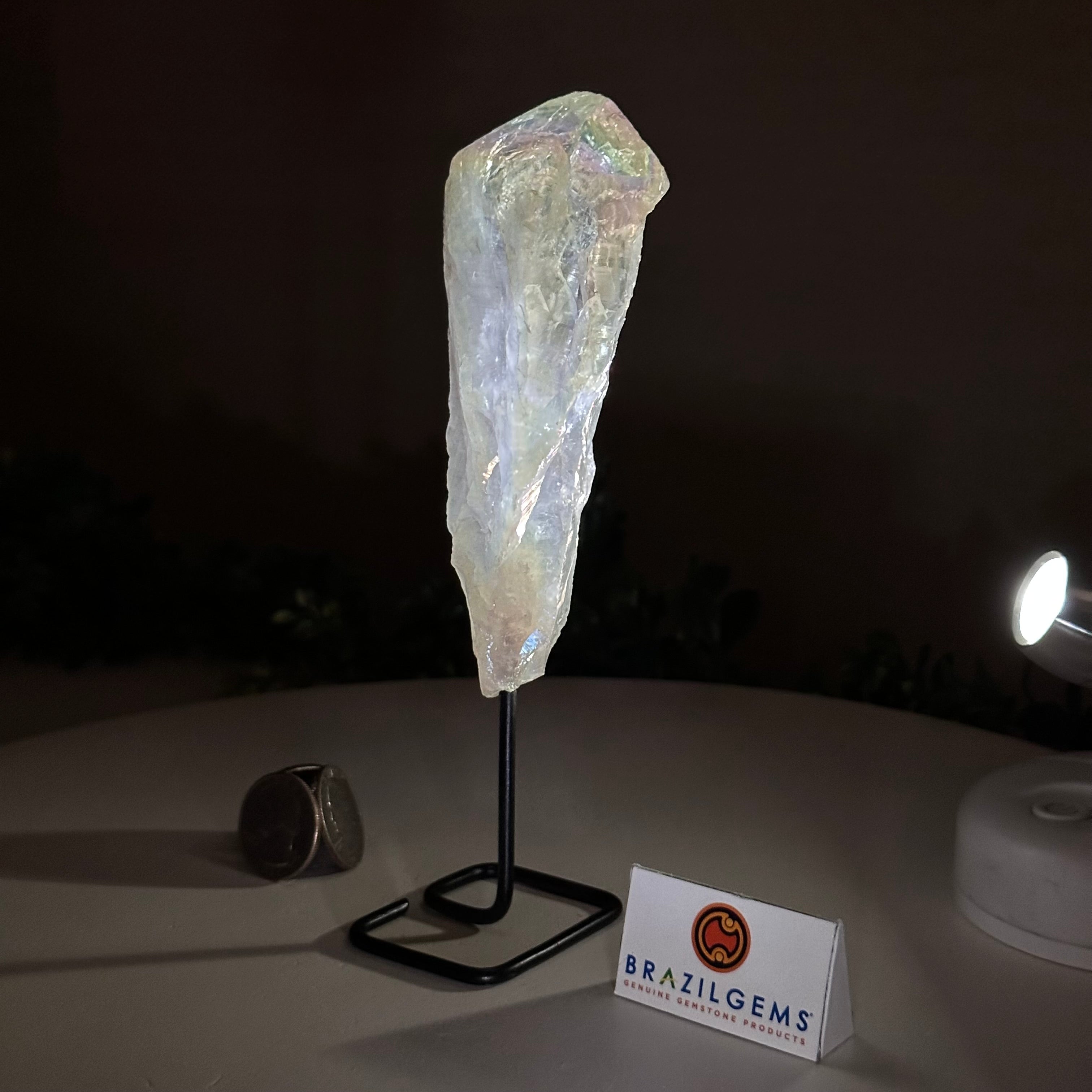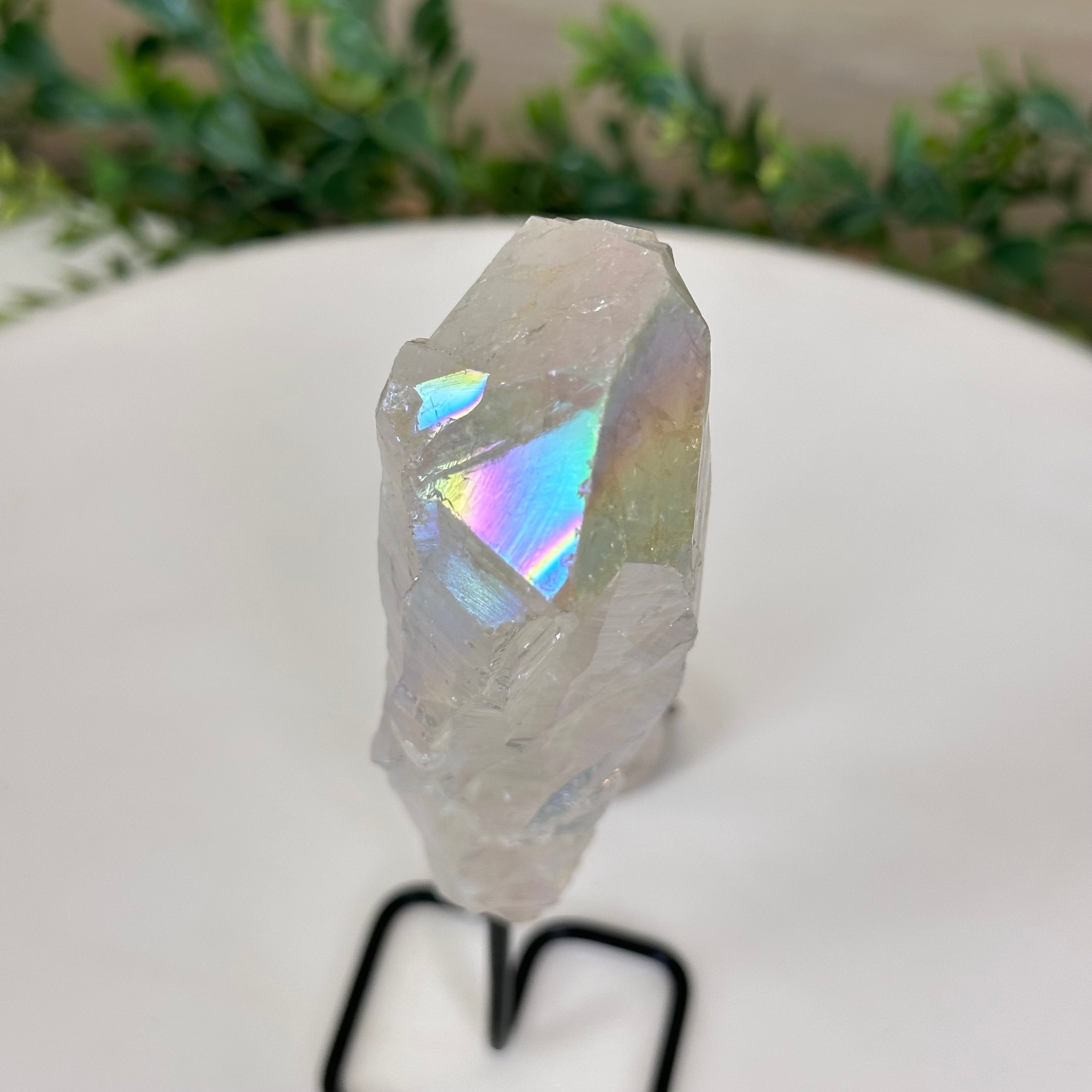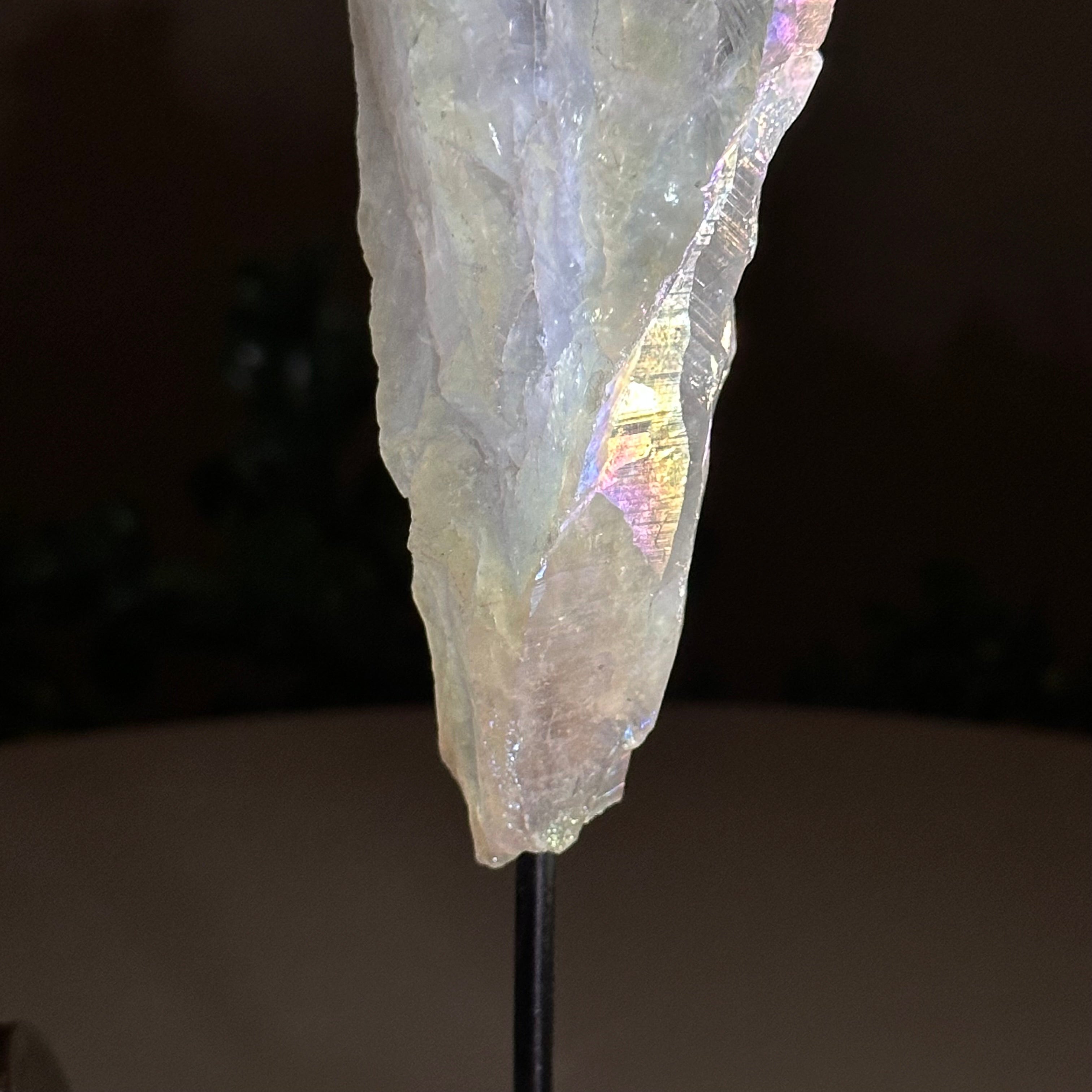 Enhance your home or sacred space with the multi-faceted beauty of this Angel Aura Quartz Point on a metal stand. This iridescent crystal has rough edges and a bright and captivating glow.