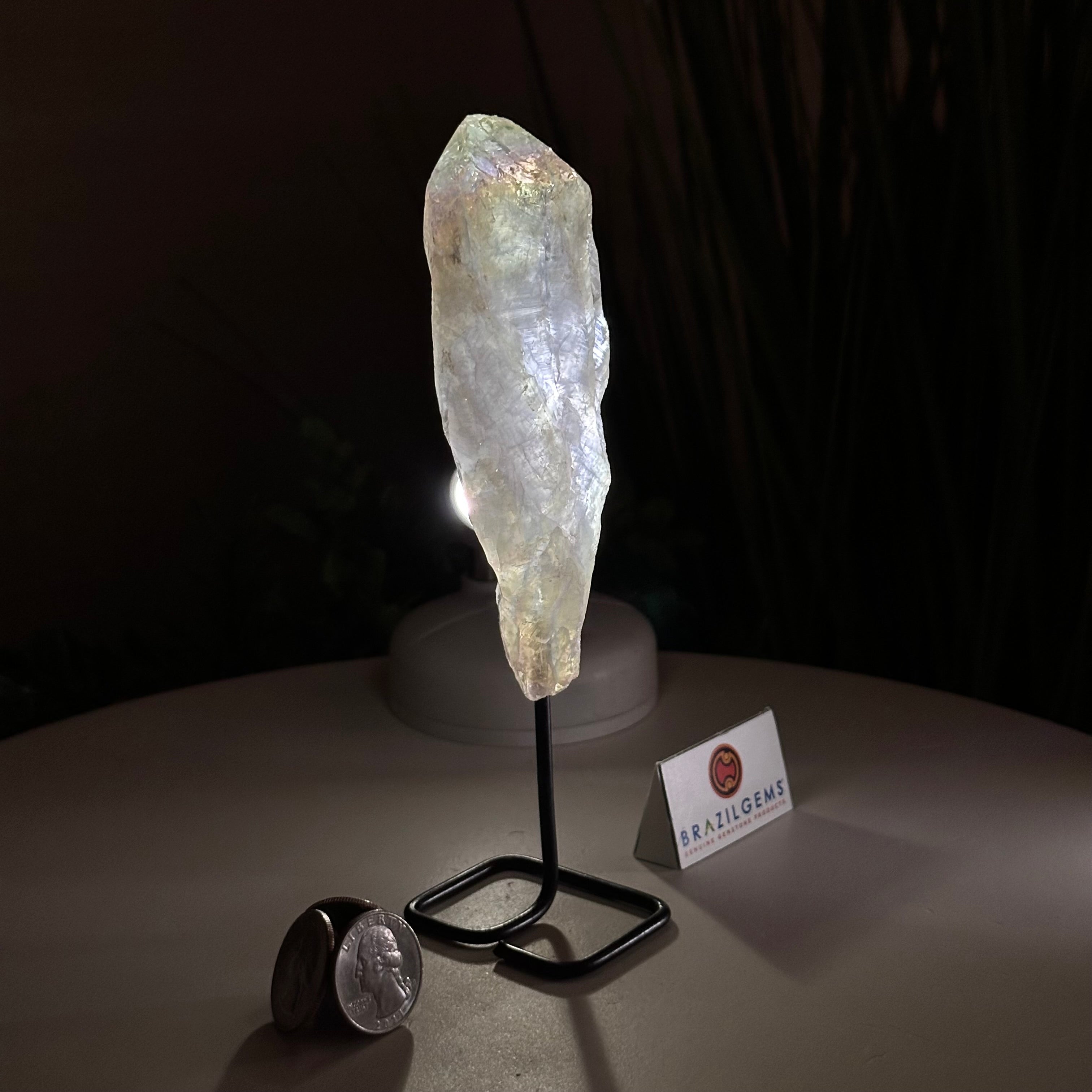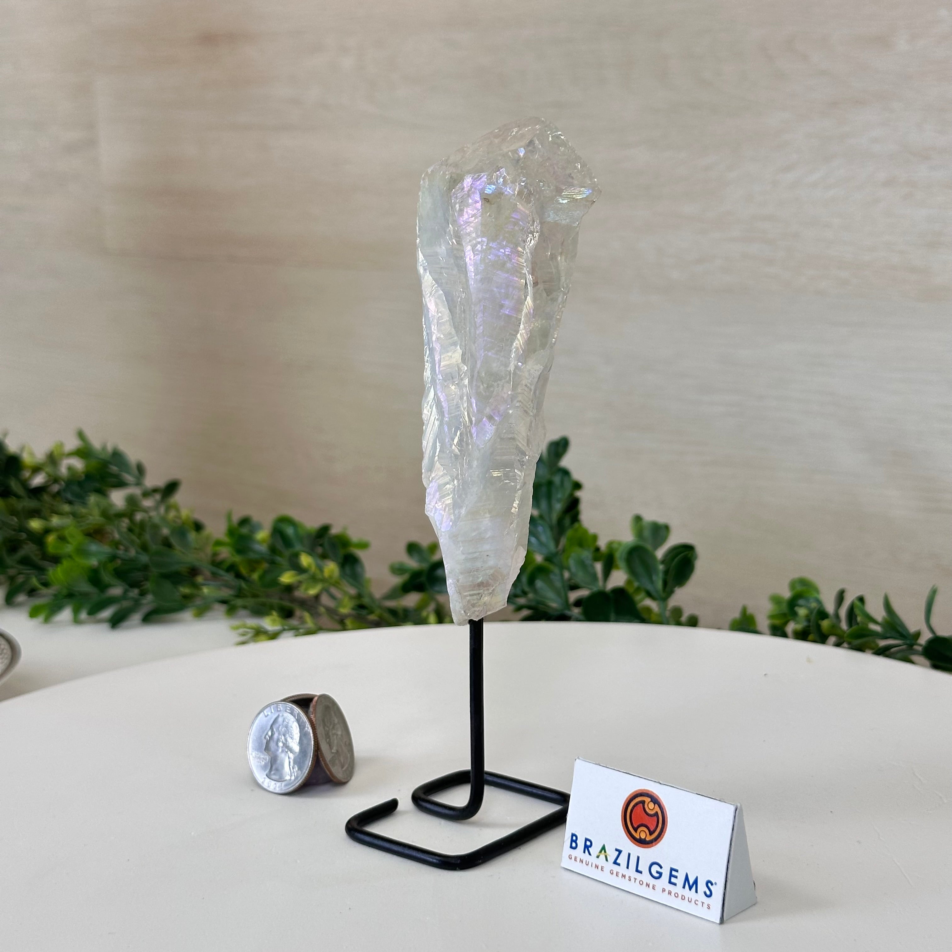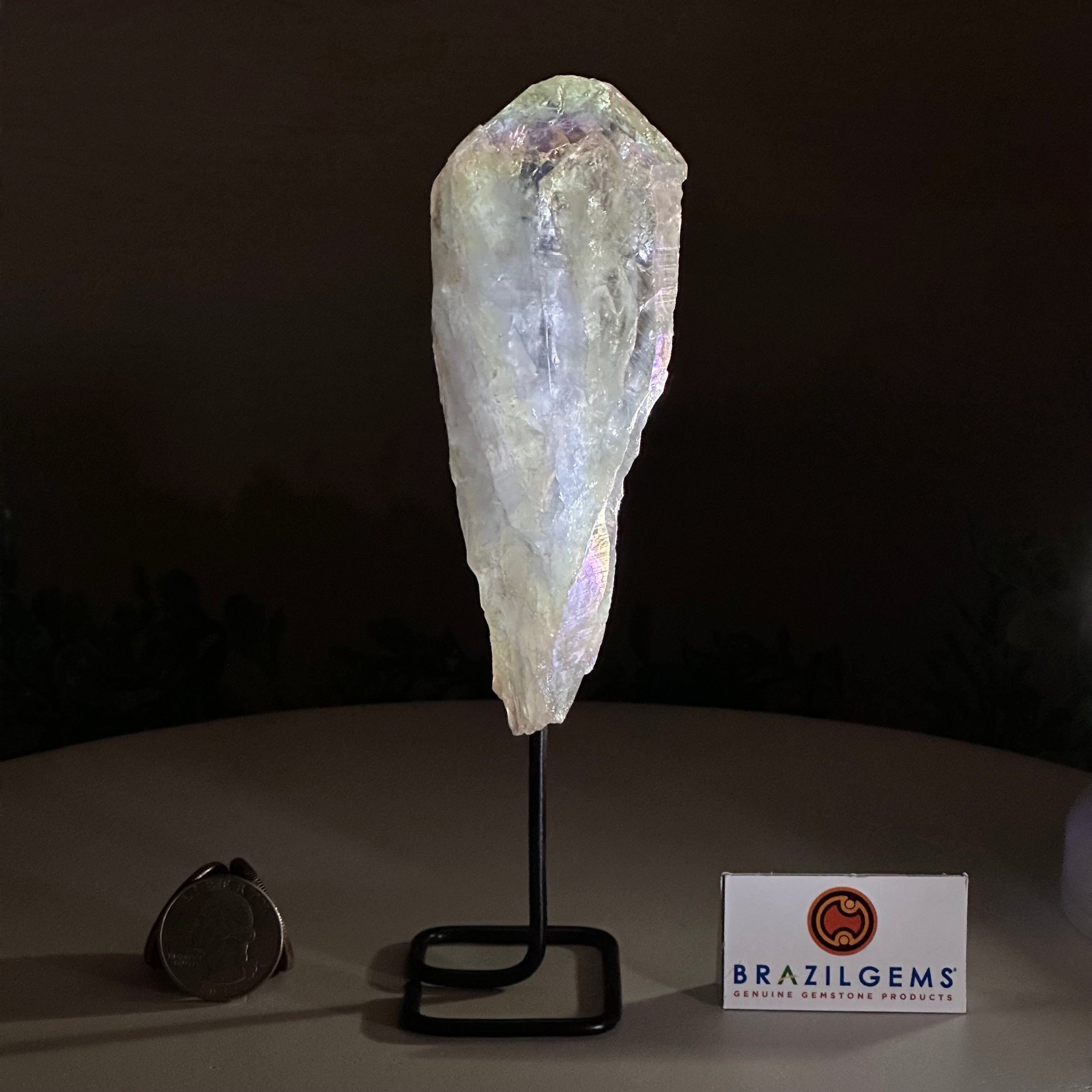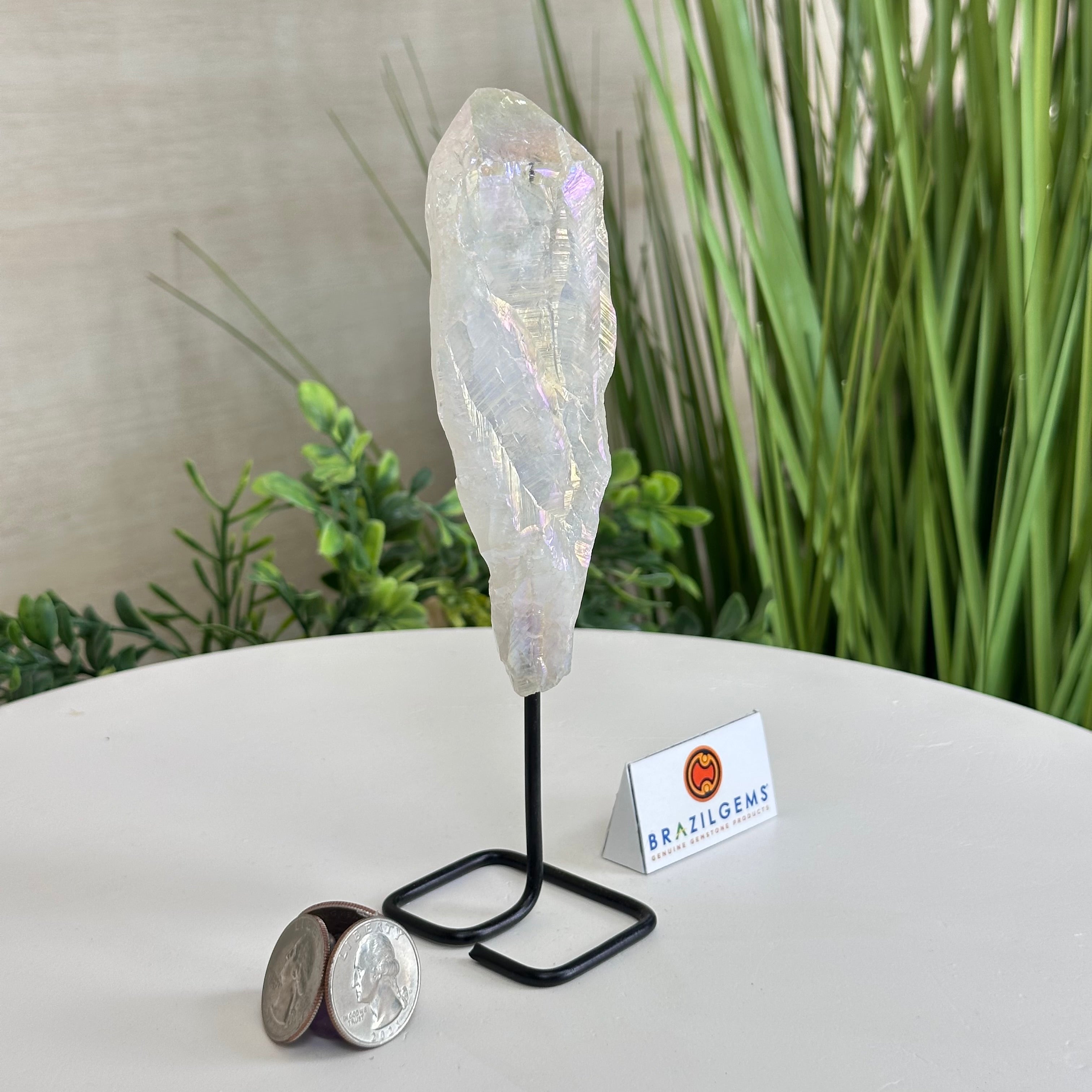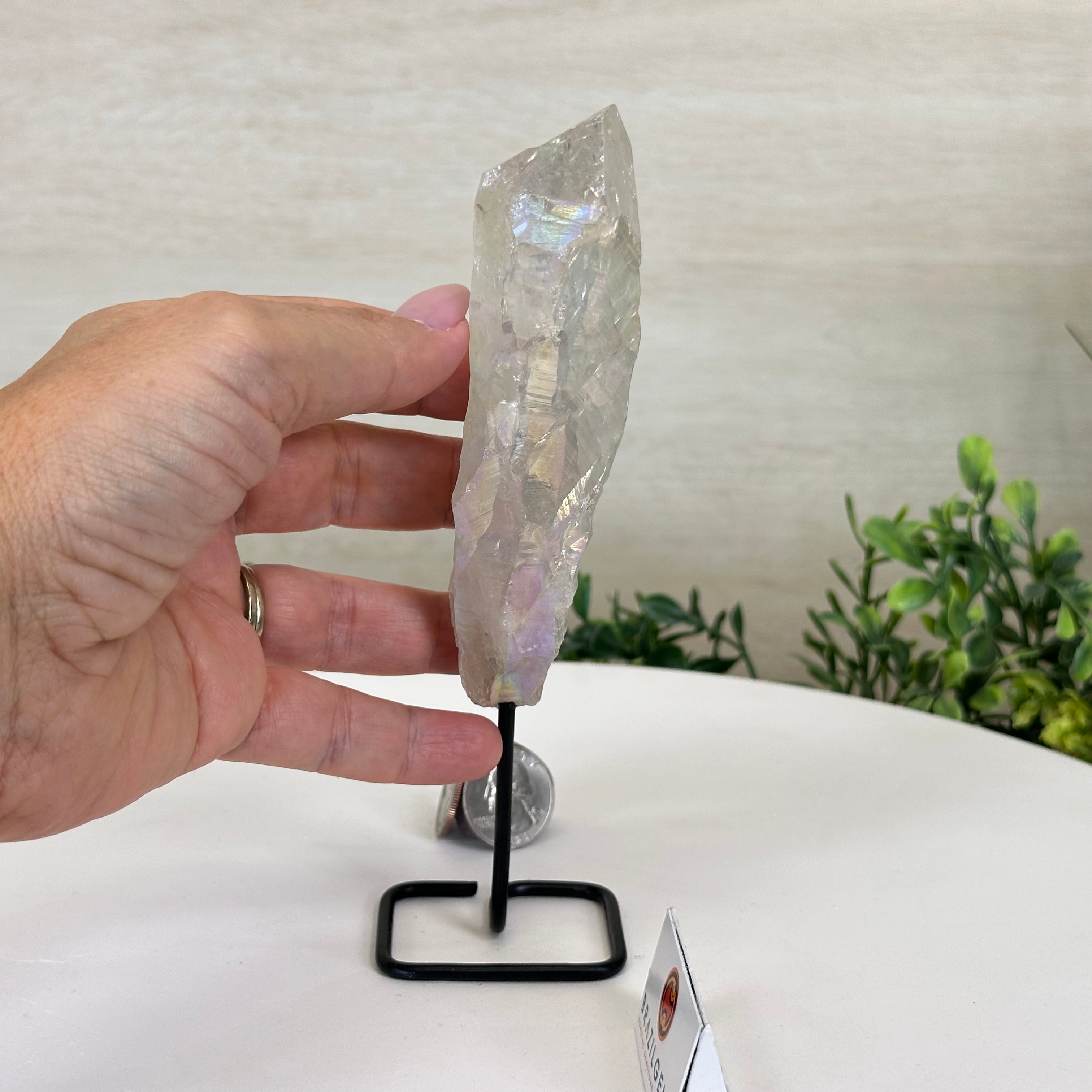 Enhance your home or sacred space with the multi-faceted beauty of this Angel Aura Quartz Point on a metal stand. This iridescent crystal has rough edges and a bright and captivating glow.