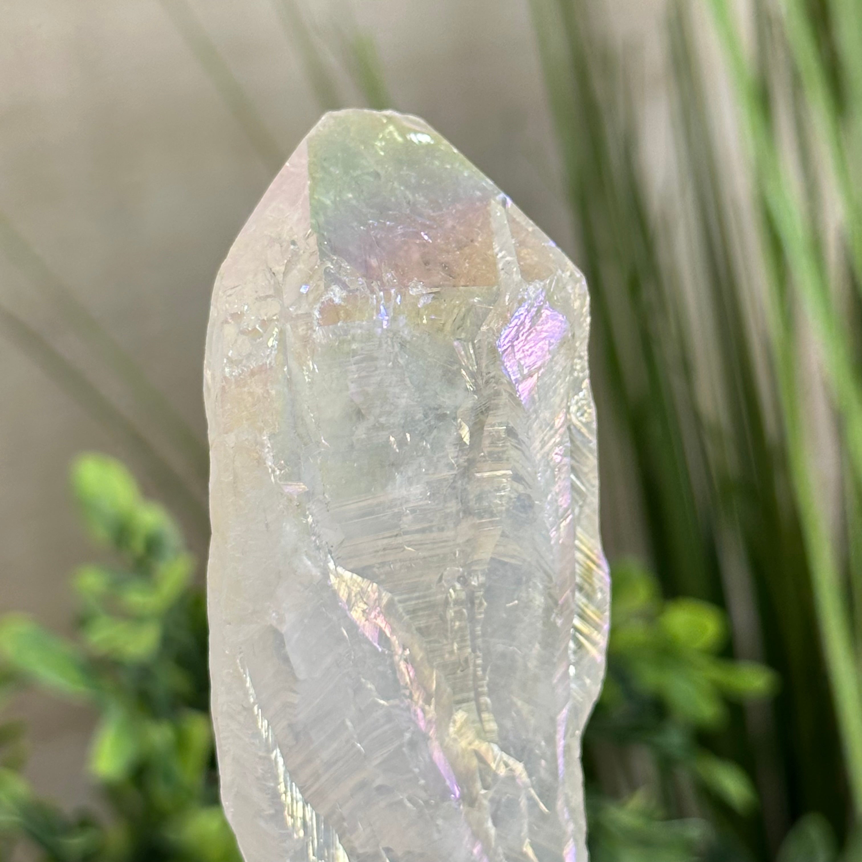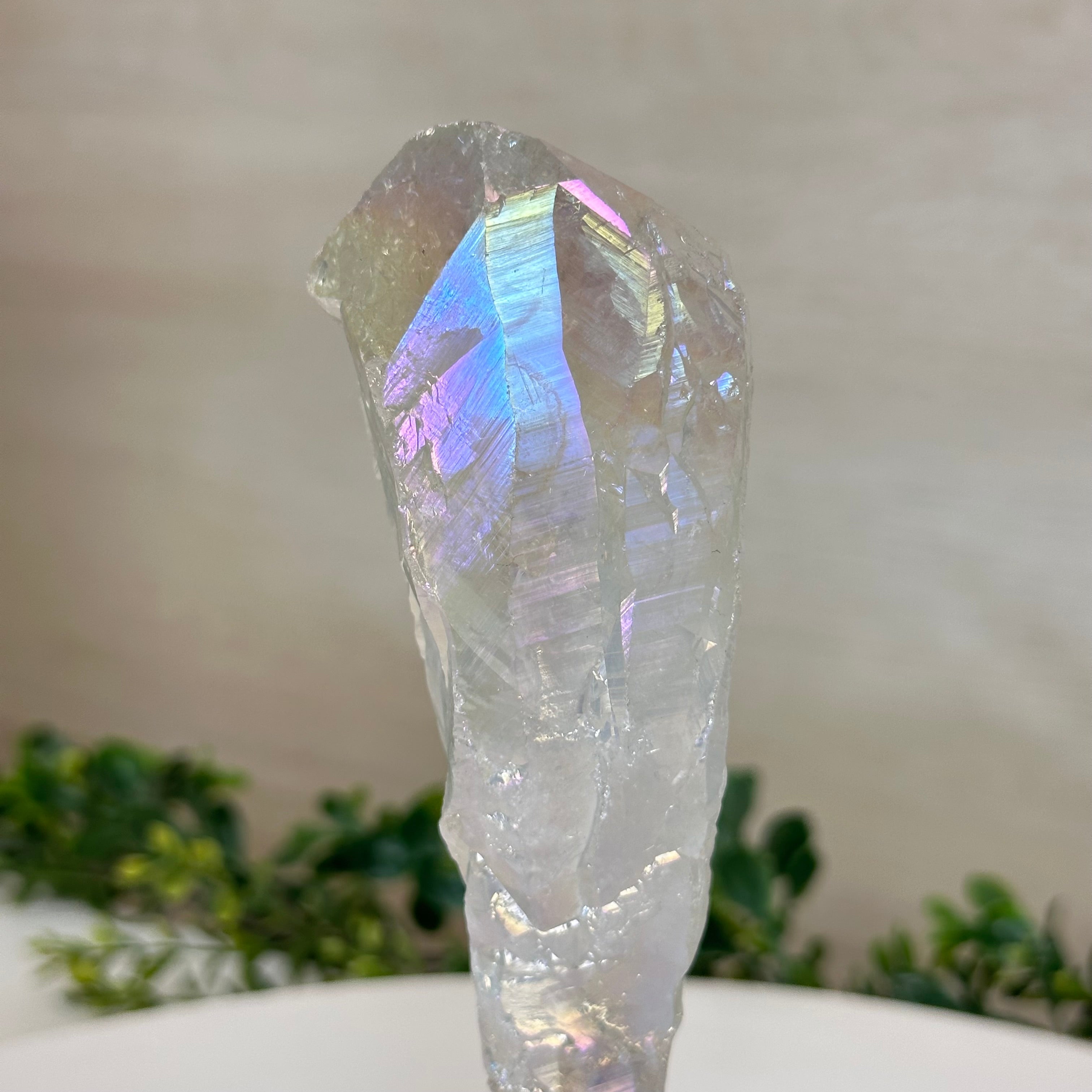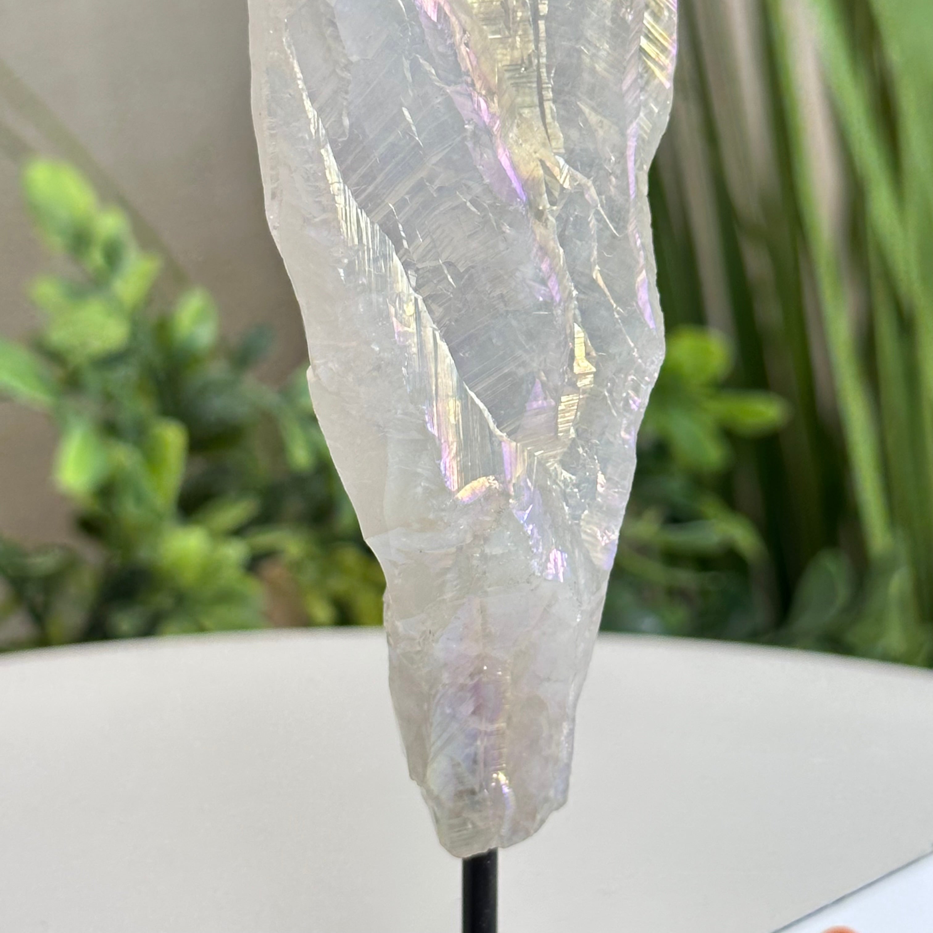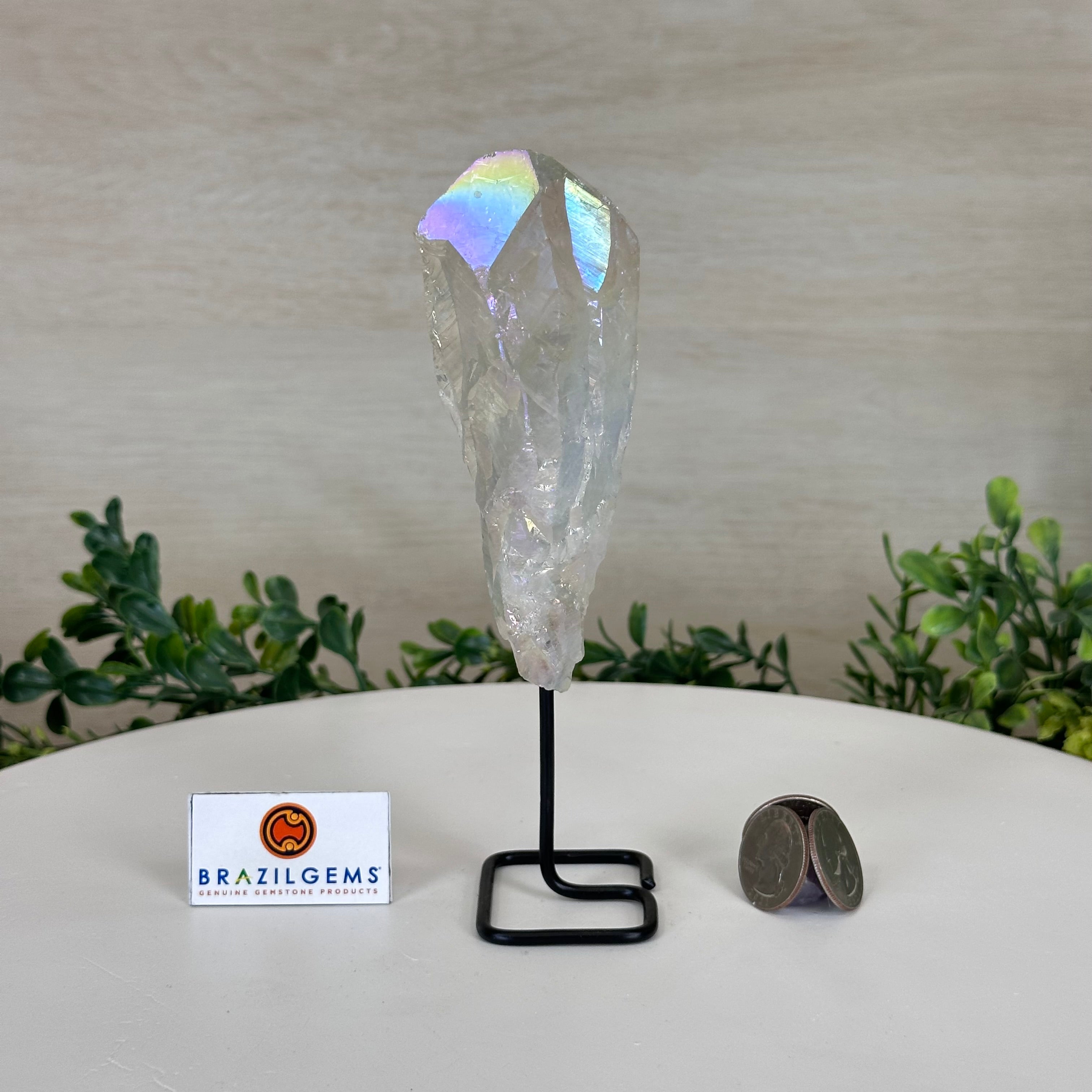 Enhance your home or sacred space with the multi-faceted beauty of this Angel Aura Quartz Point on a metal stand. This iridescent crystal has rough edges and a bright and captivating glow.