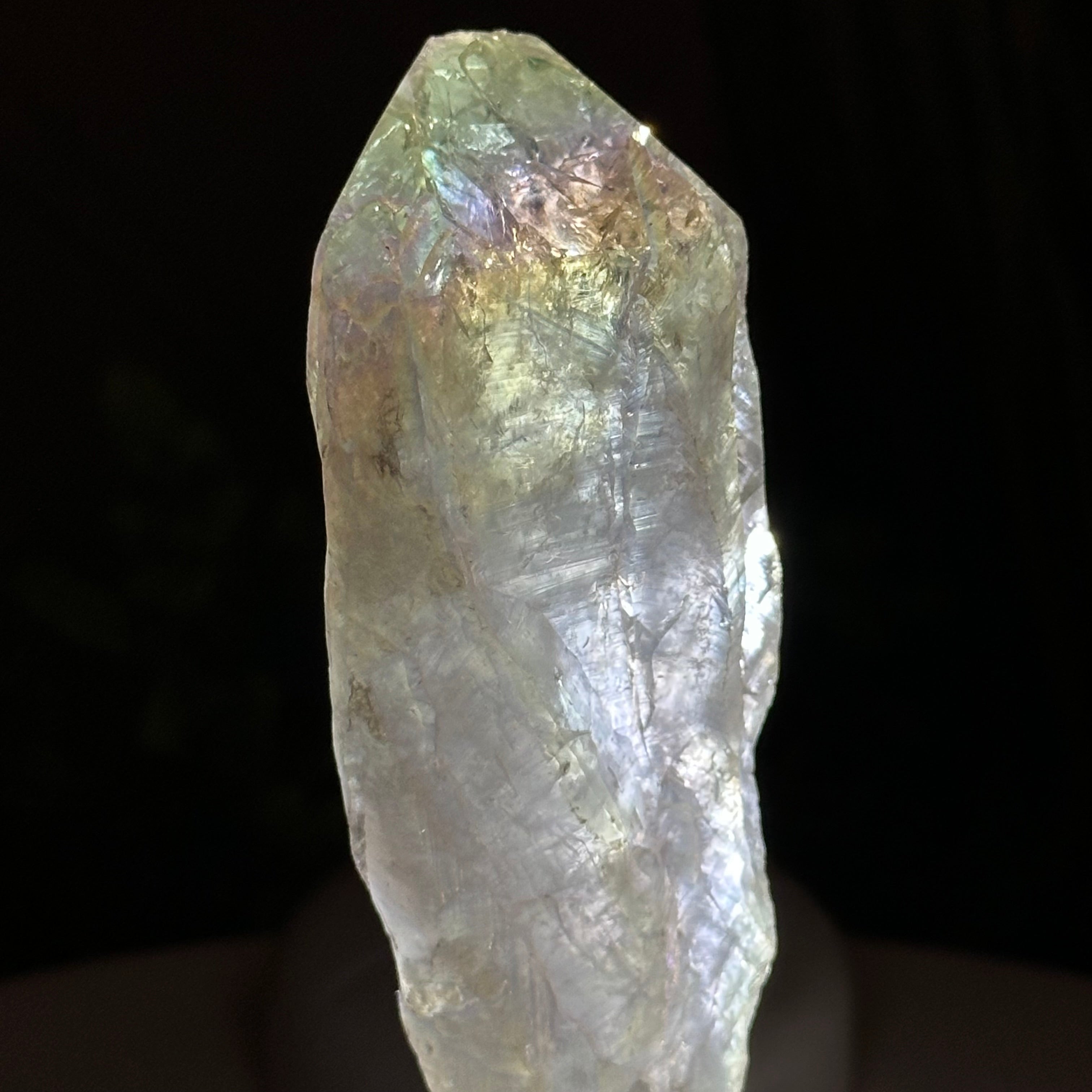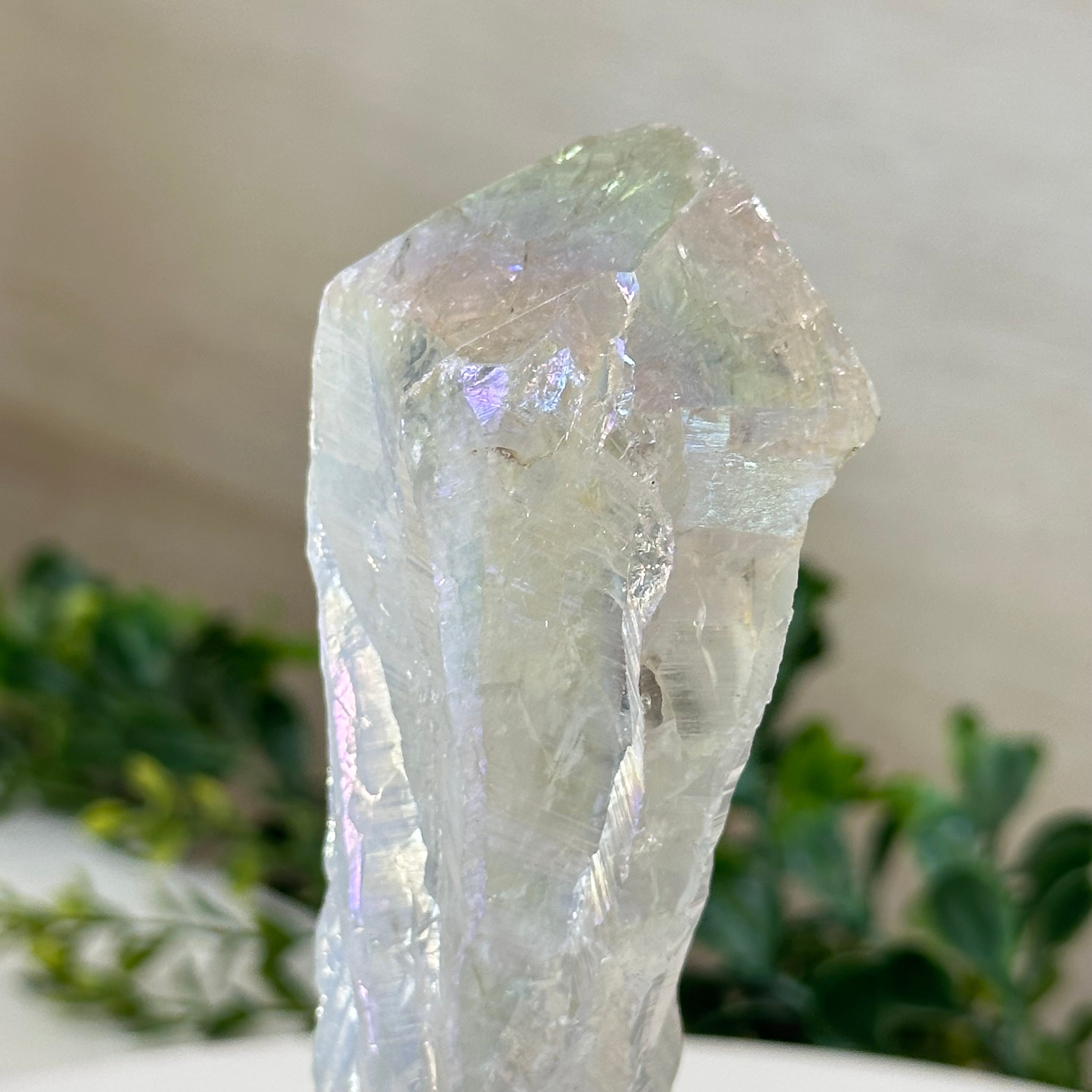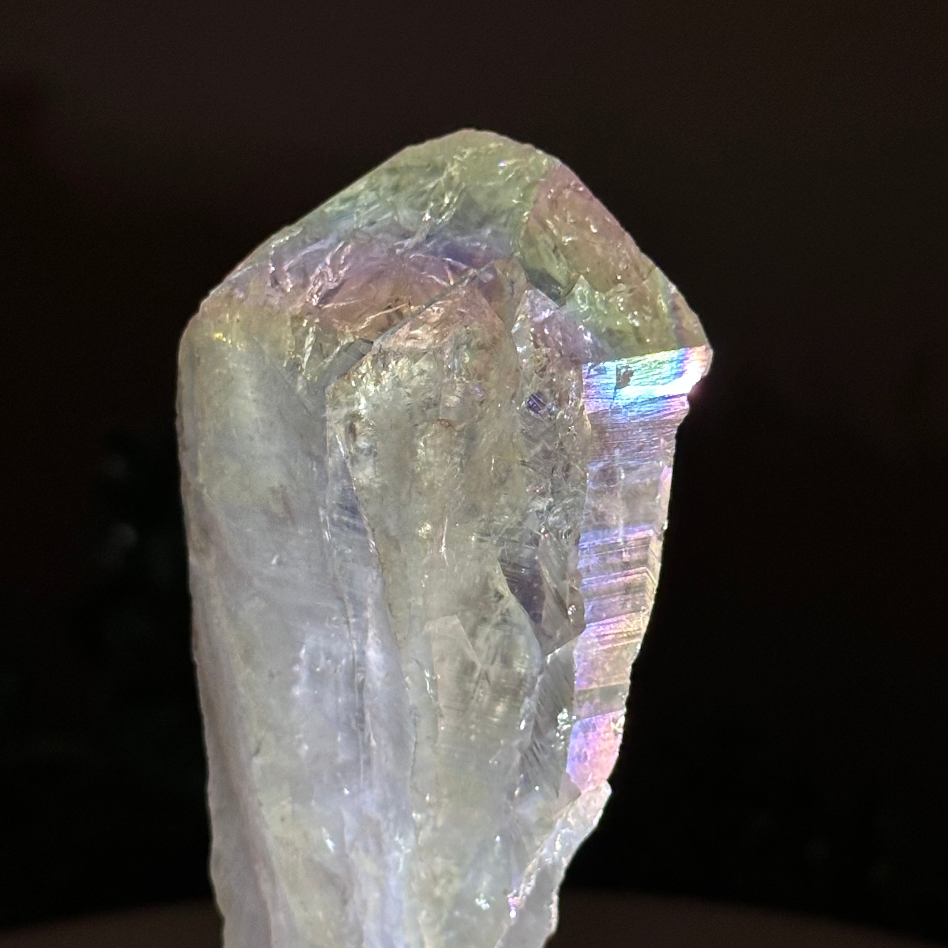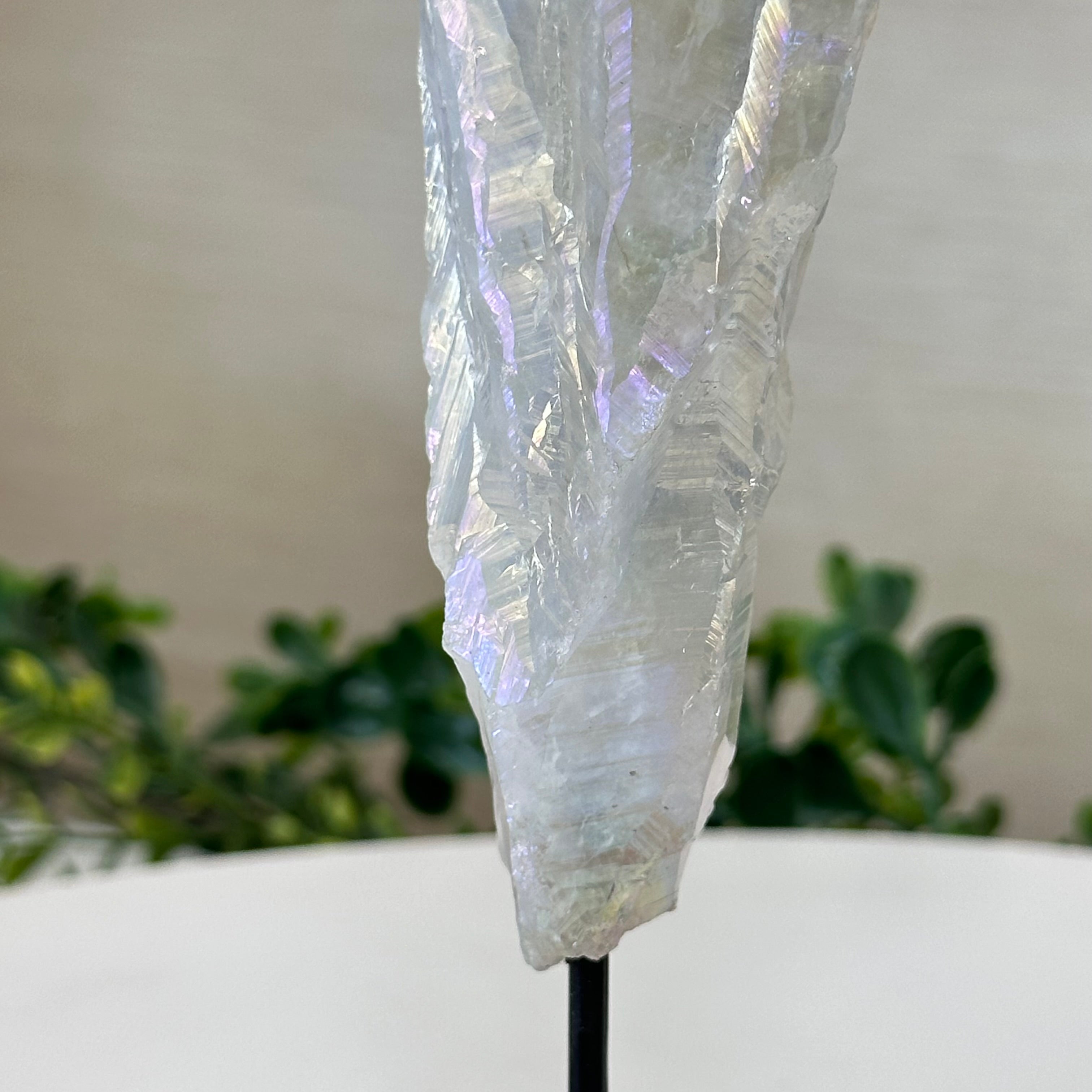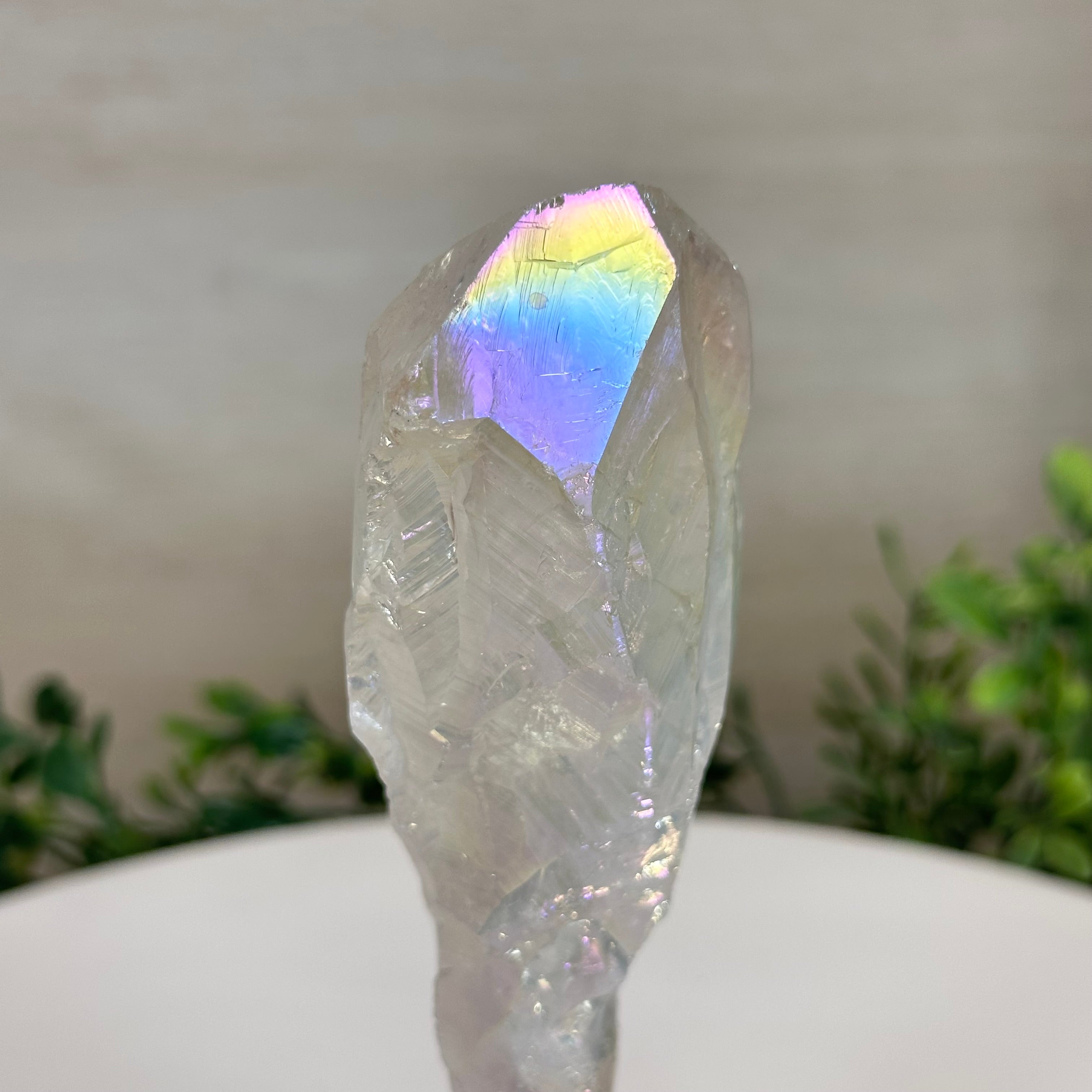 Enhance your home or sacred space with the multi-faceted beauty of this Angel Aura Quartz Point on a metal stand. This iridescent crystal has rough edges and a bright and captivating glow.
