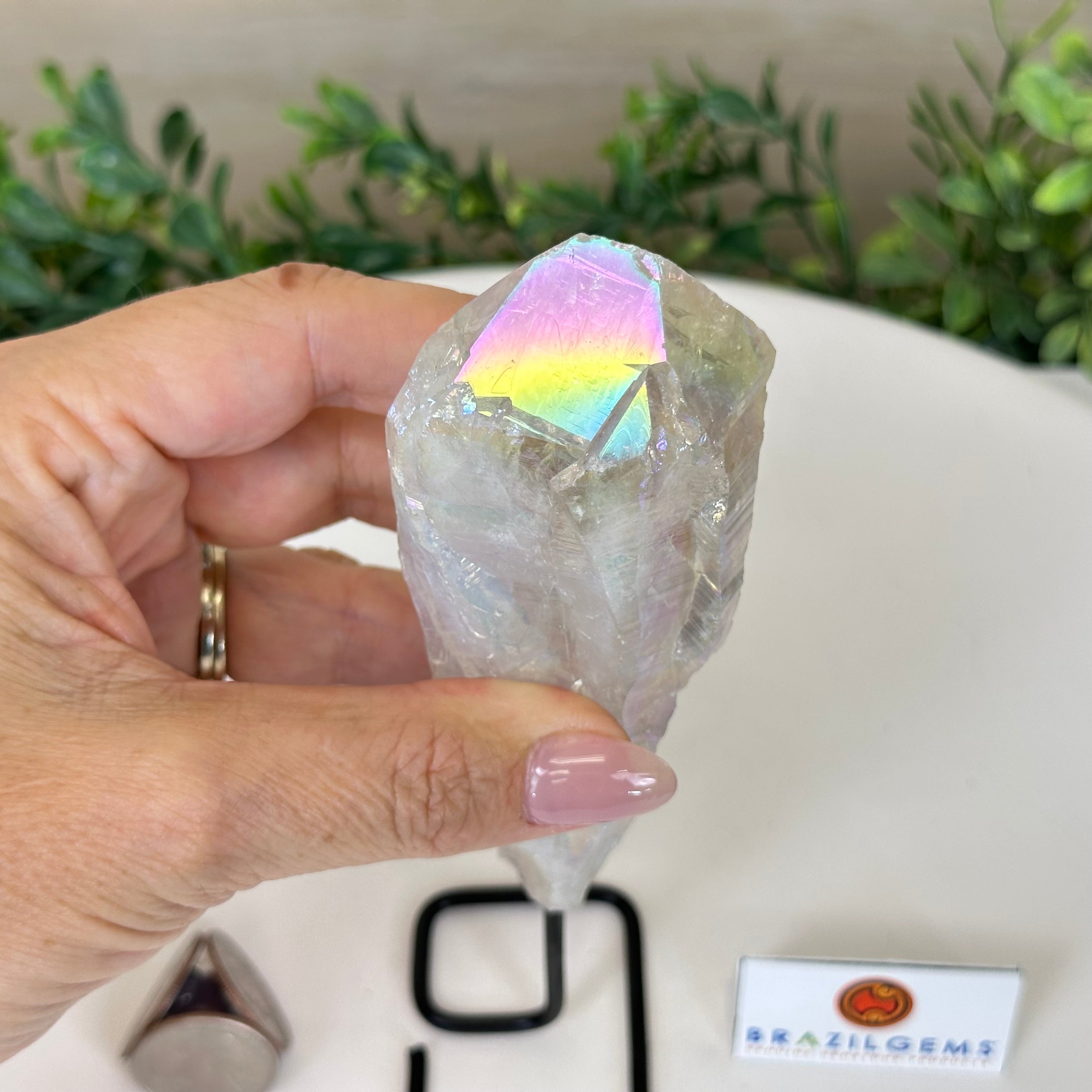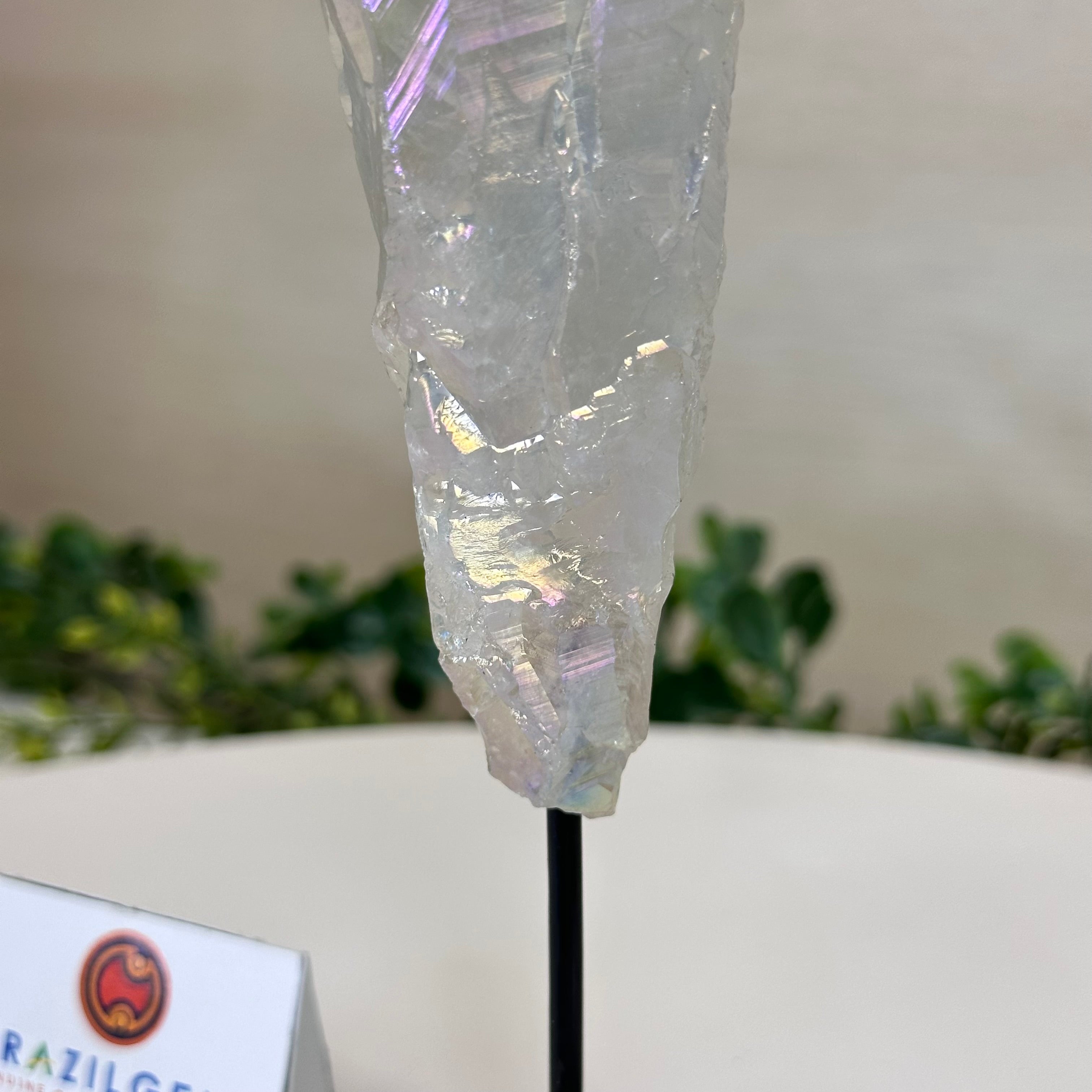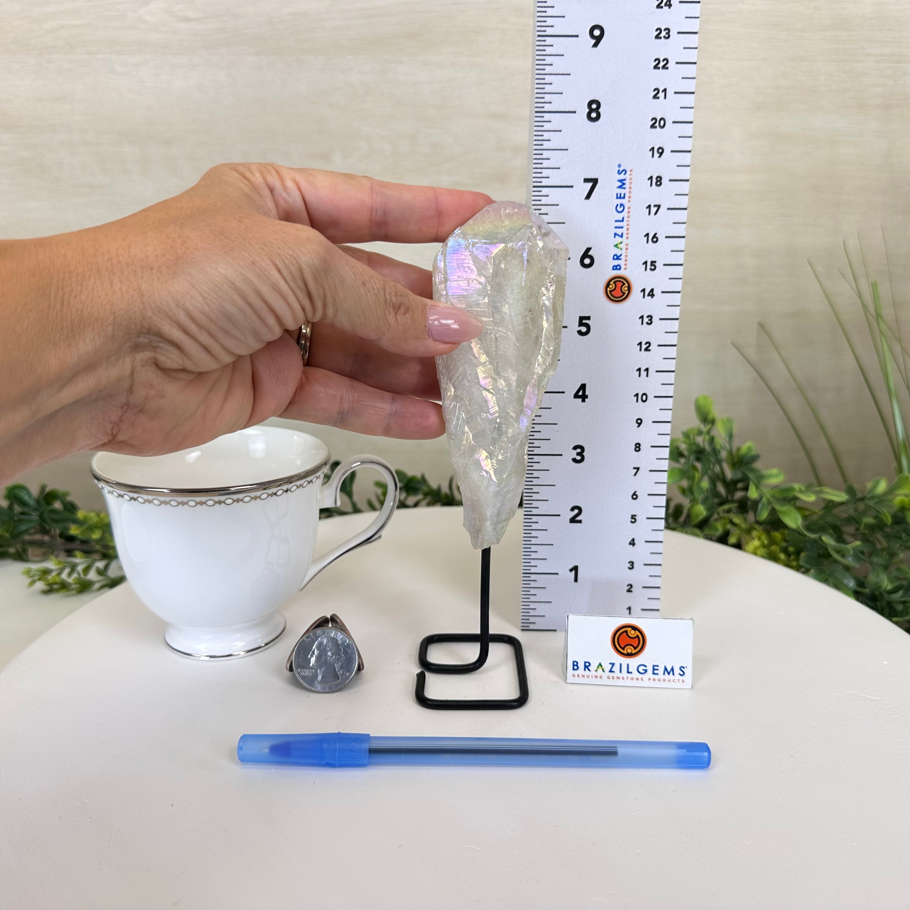 Disclaimer: This is a natural gemstone crystal sold by Brazil Gems® as is and as you see it in its images and video. It is the exact one you will receive. It may contain natural imperfections and/or imperfections, broken edges and repairs from the extraction, mounting and aura-effect bonding processes. The crystal has a hole drilled into the bottom of it so it could be mounted onto its black-painted metal stand. The Angel Aura effect is achieved through a process called vacuum deposition where vaporized metals such as silver and/or platinum are bonded to the natural crystal in a vacuum chamber giving it that iridescent pearlized sheen. At Brazil Gems® we make every effort to get measurements as exact as possible but they are done by human hands and eyes and therefore may have minor discrepancies.