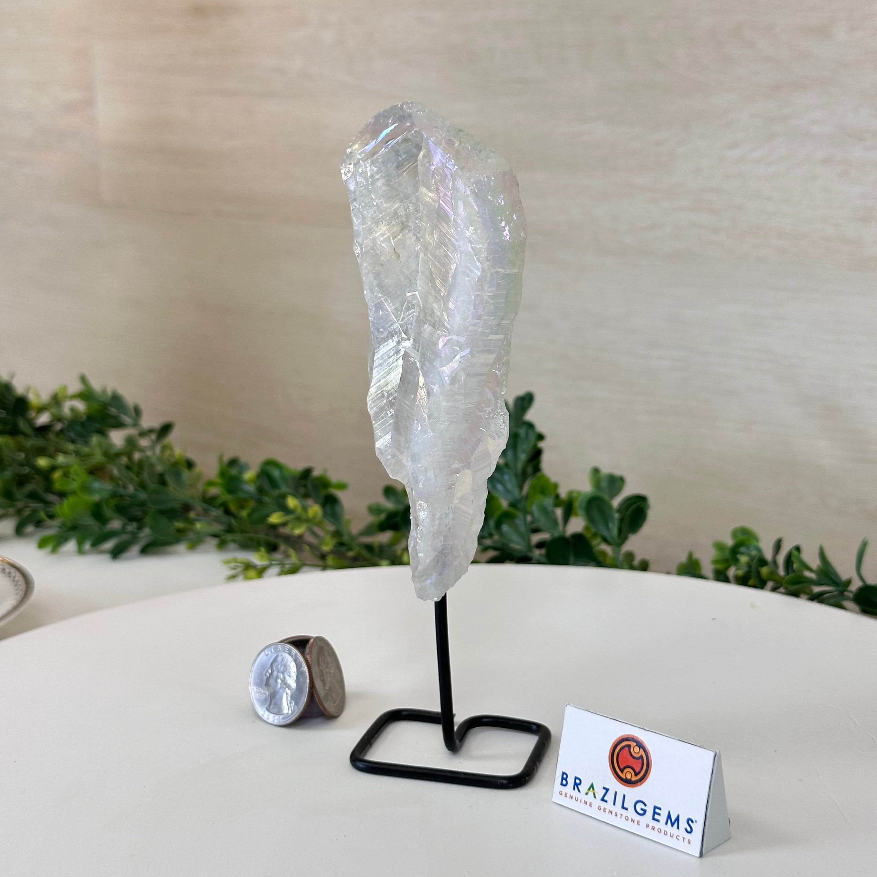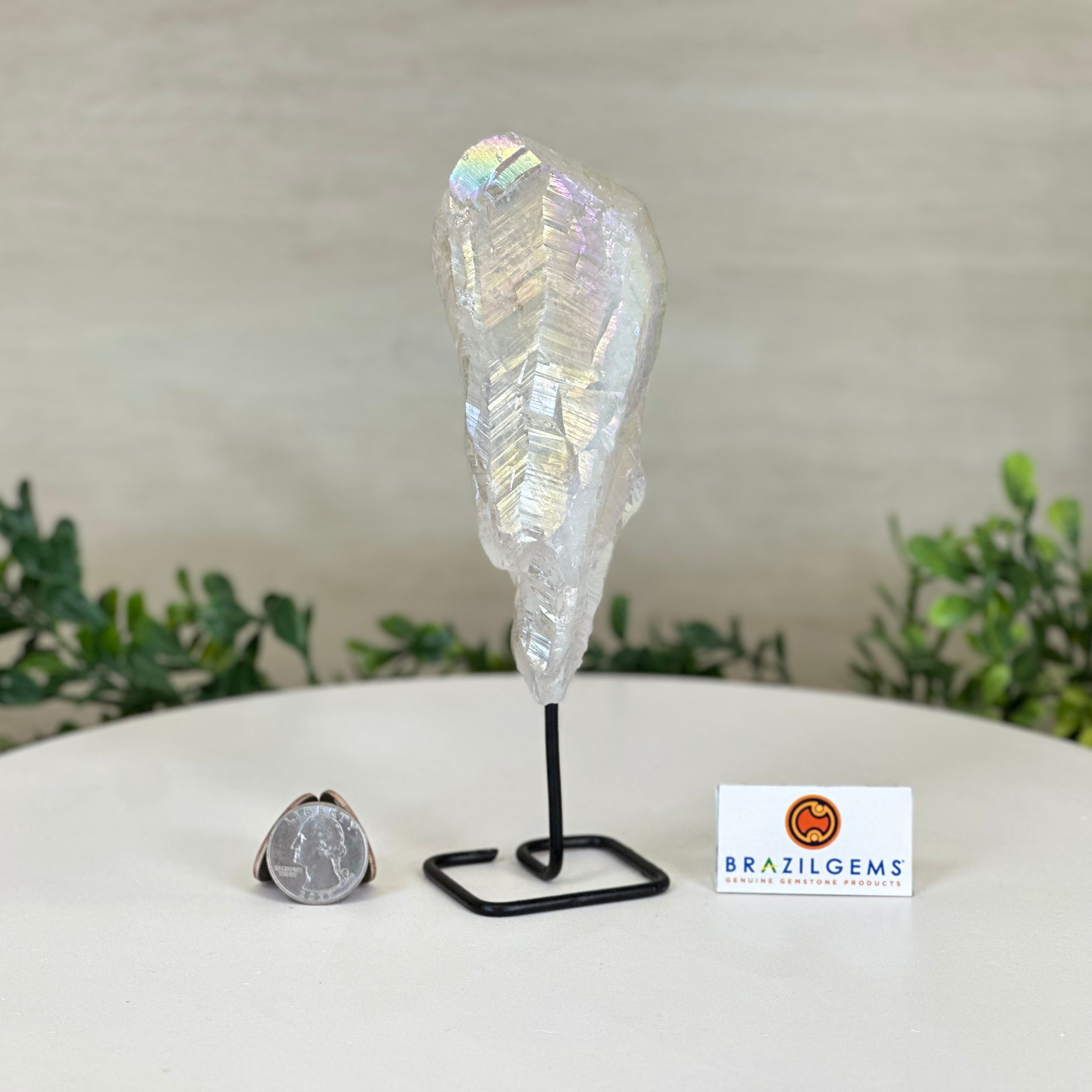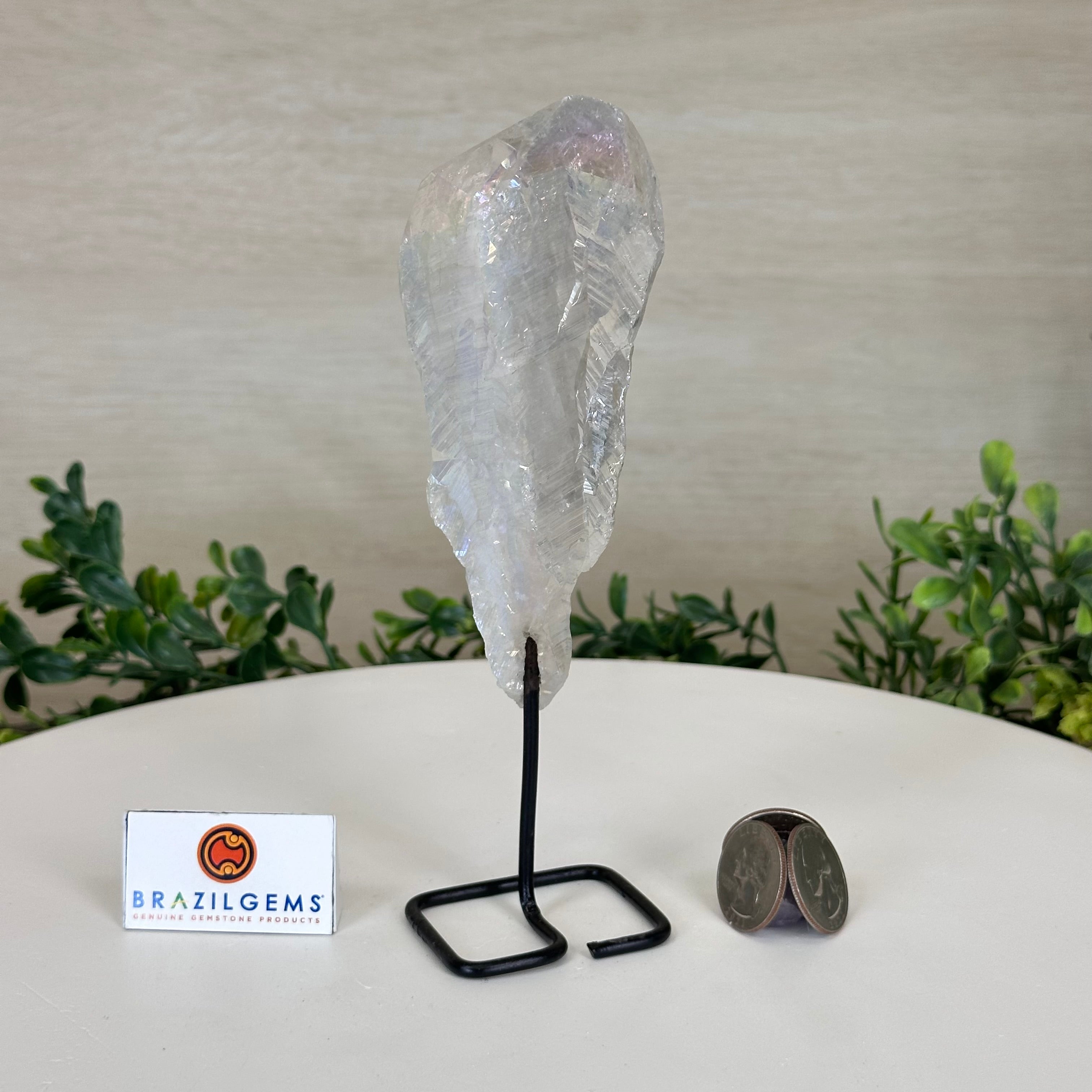 Disclaimer: This is a natural gemstone crystal sold by Brazil Gems® as is and as you see it in its images and video. It is the exact one you will receive. It may contain natural imperfections and/or imperfections, broken edges and repairs from the extraction, mounting and aura-effect bonding processes. The crystal has a hole drilled into the bottom of it so it could be mounted onto its black-painted metal stand. The Angel Aura effect is achieved through a process called vacuum deposition where vaporized metals such as silver and/or platinum are bonded to the natural crystal in a vacuum chamber giving it that iridescent pearlized sheen. At Brazil Gems® we make every effort to get measurements as exact as possible but they are done by human hands and eyes and therefore may have minor discrepancies.