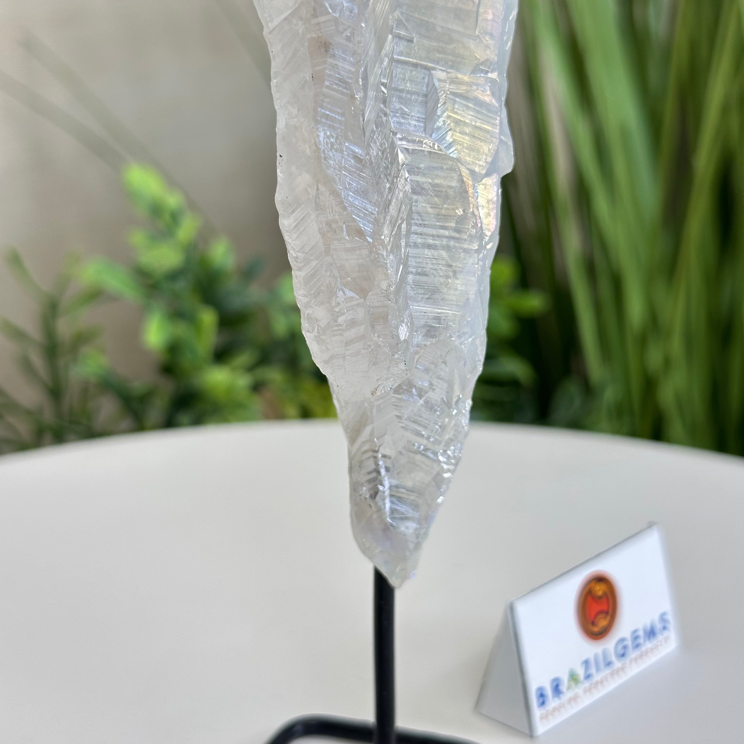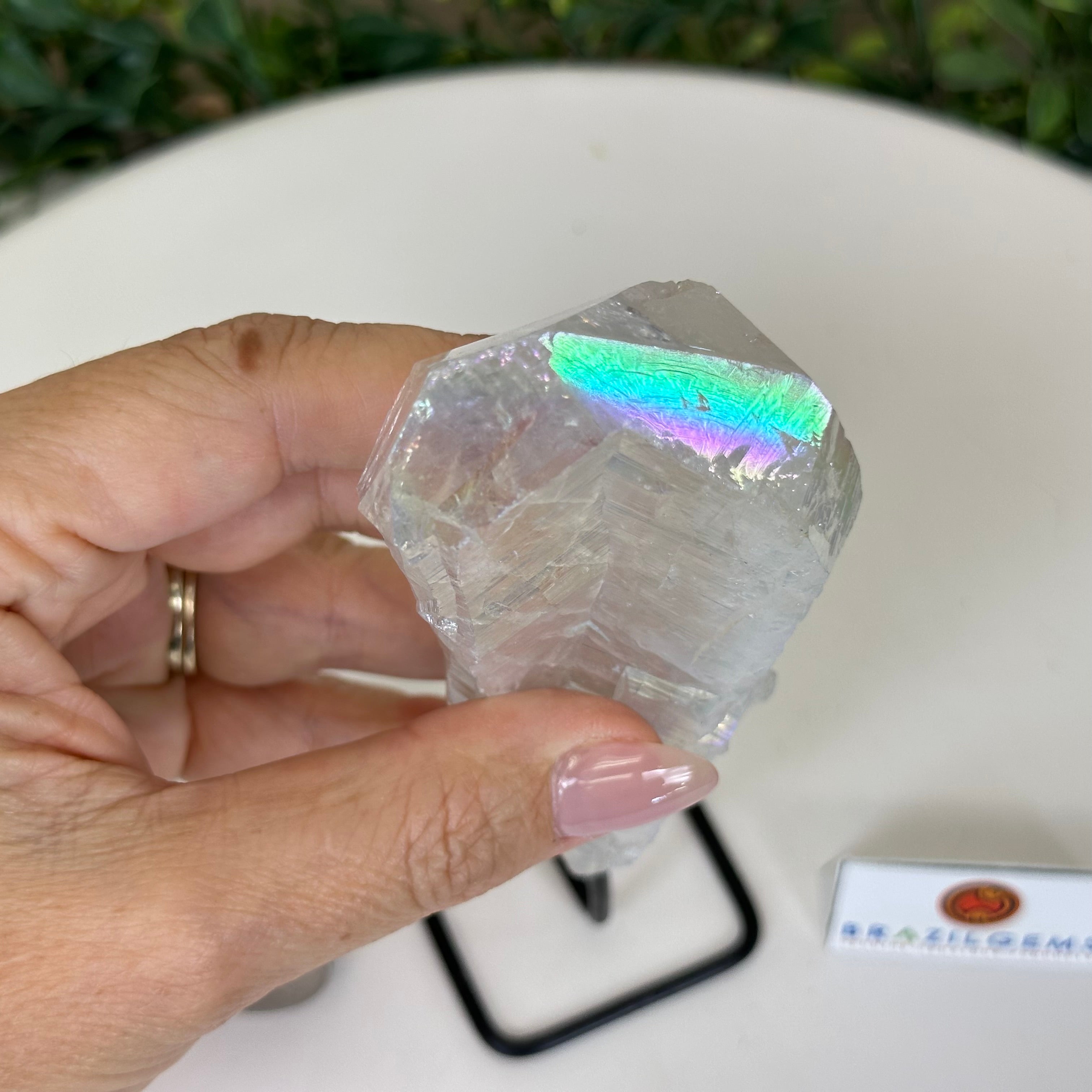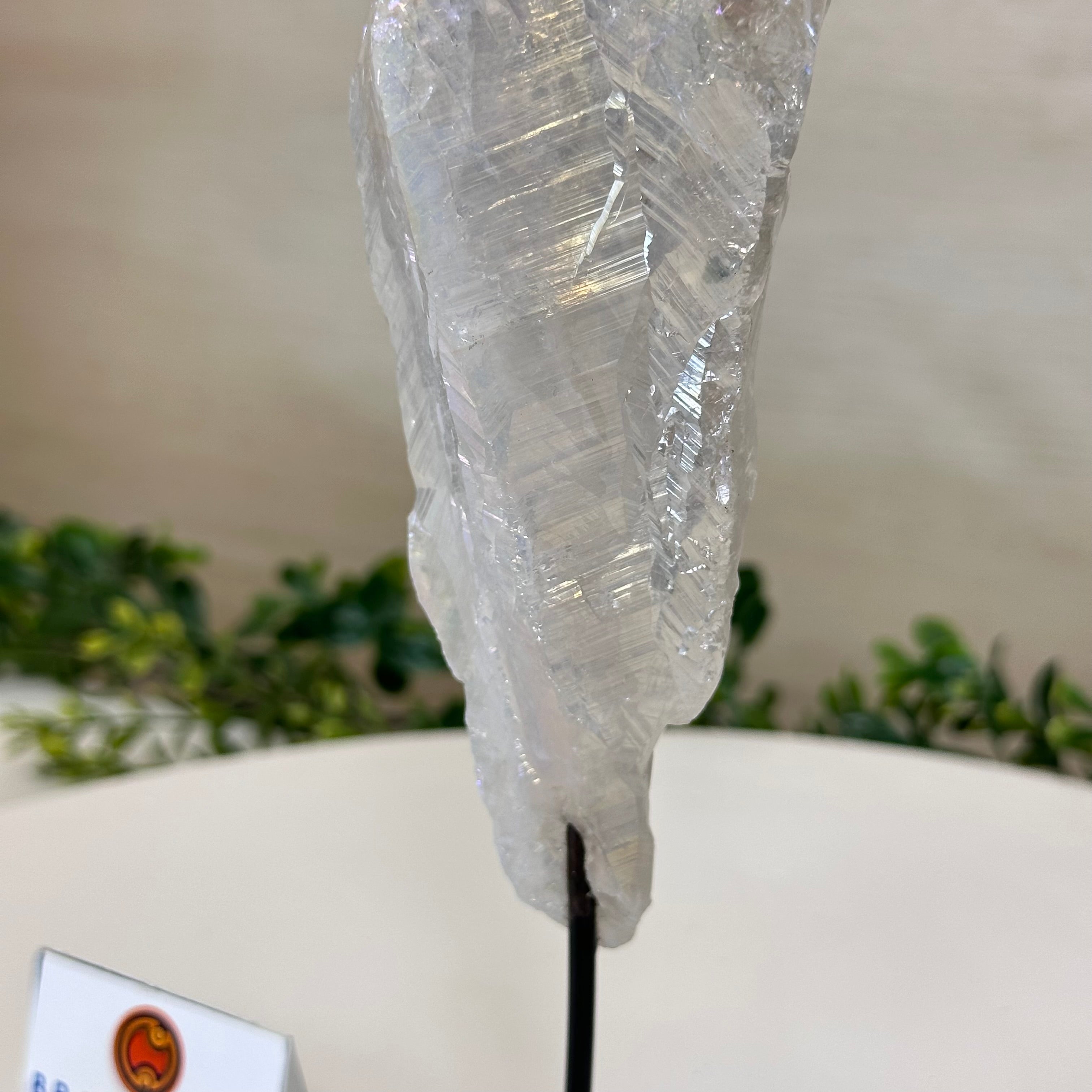 Disclaimer: This is a natural gemstone crystal sold by Brazil Gems® as is and as you see it in its images and video. It is the exact one you will receive. It may contain natural imperfections and/or imperfections, broken edges and repairs from the extraction, mounting and aura-effect bonding processes. The crystal has a hole drilled into the bottom of it so it could be mounted onto its black-painted metal stand. The Angel Aura effect is achieved through a process called vacuum deposition where vaporized metals such as silver and/or platinum are bonded to the natural crystal in a vacuum chamber giving it that iridescent pearlized sheen. At Brazil Gems® we make every effort to get measurements as exact as possible but they are done by human hands and eyes and therefore may have minor discrepancies.