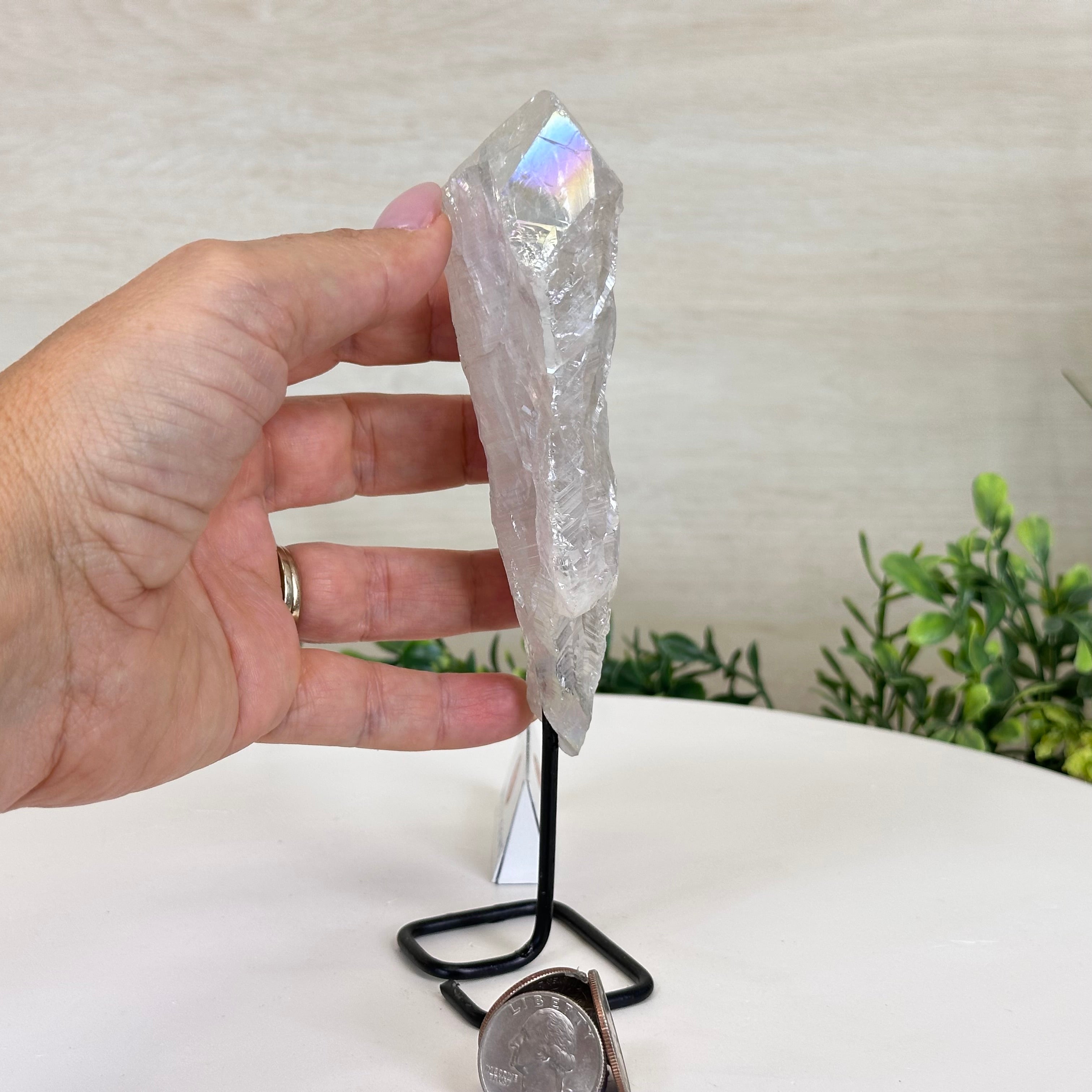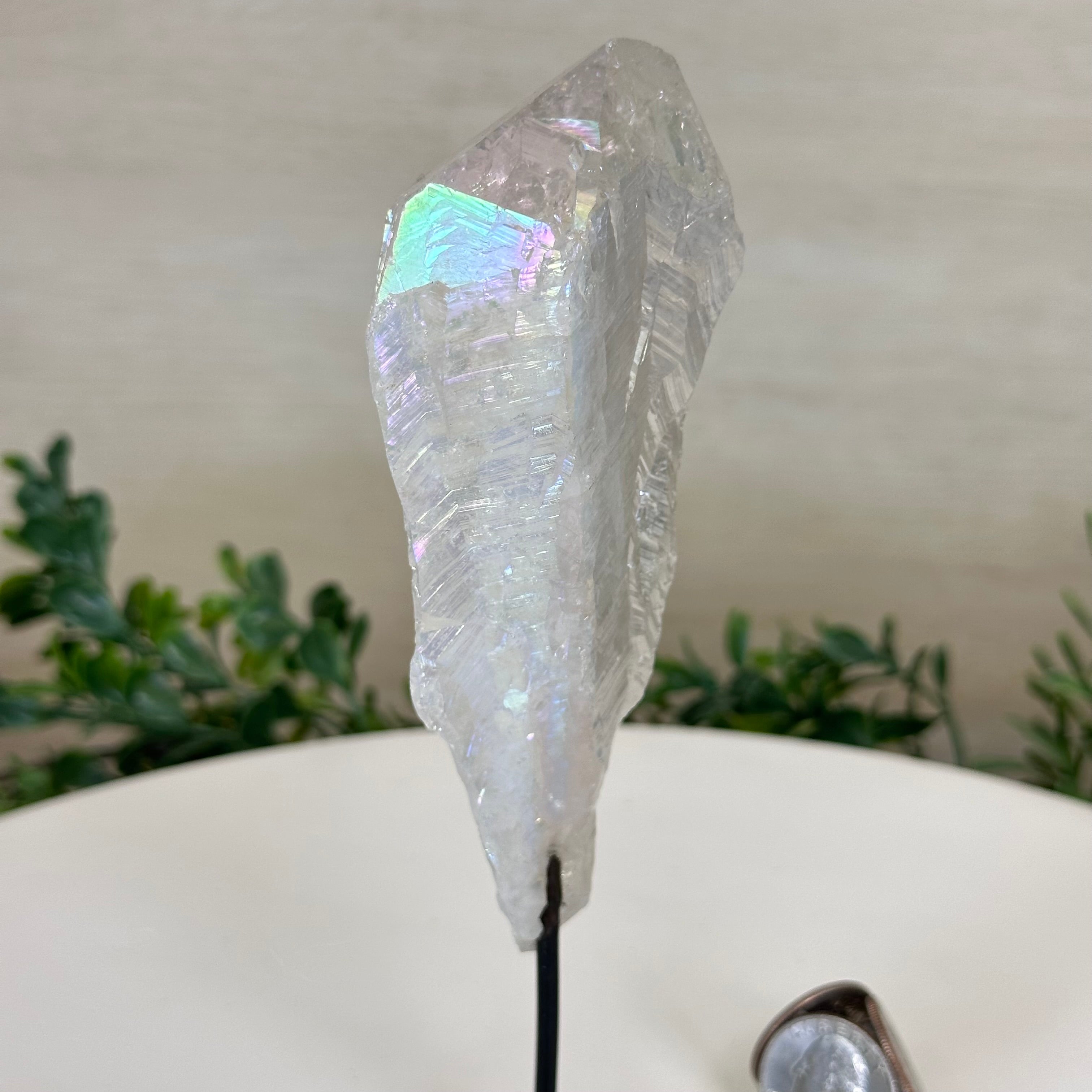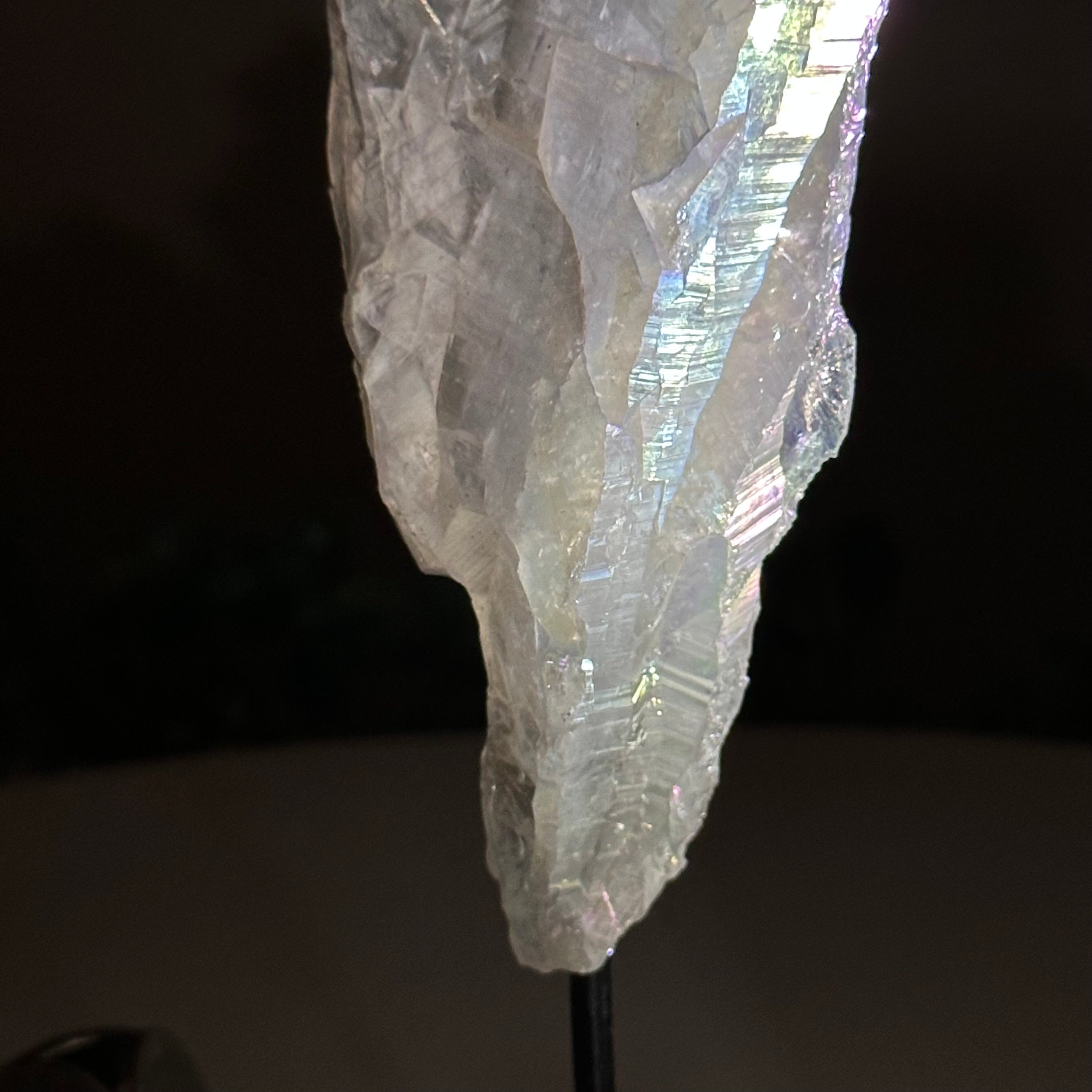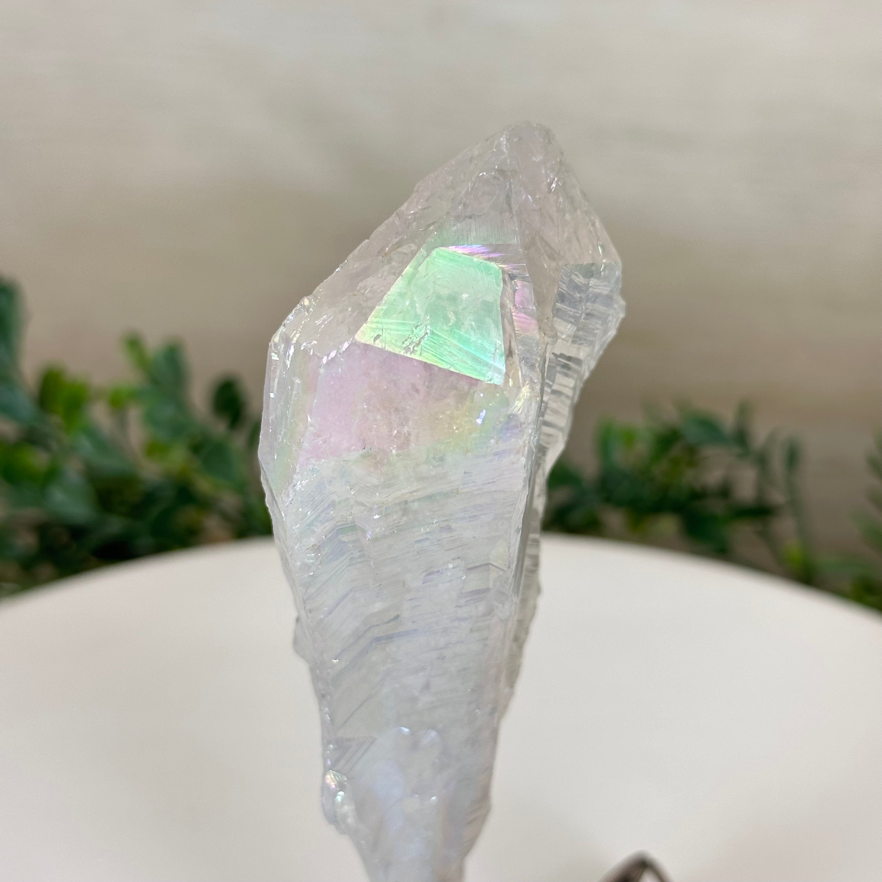 Enhance your home or sacred space with the multi-faceted beauty of this Angel Aura Quartz Point on a metal stand. This iridescent crystal has rough edges and a bright and captivating glow.