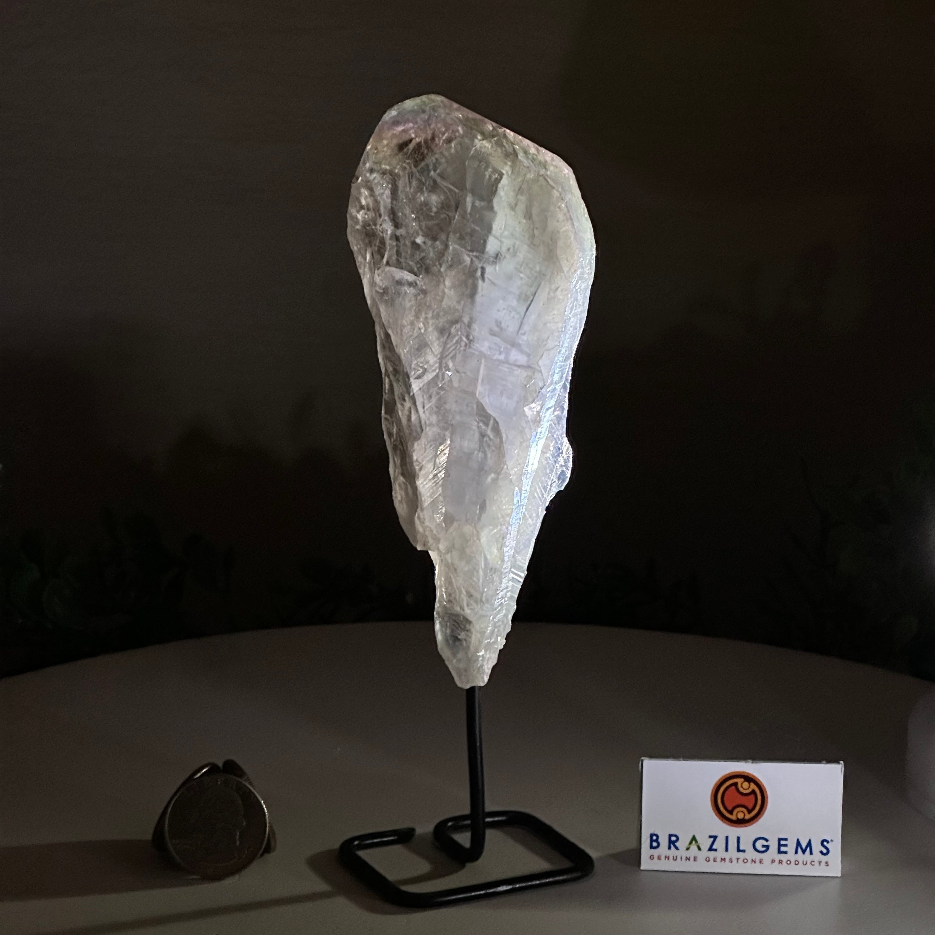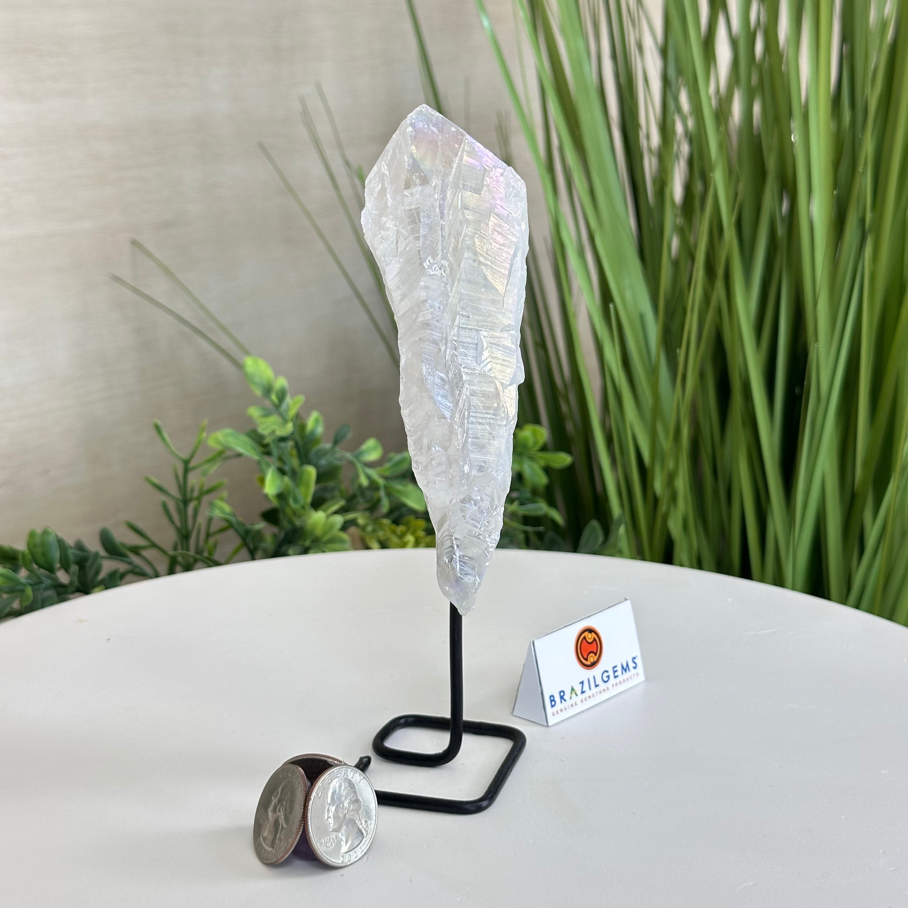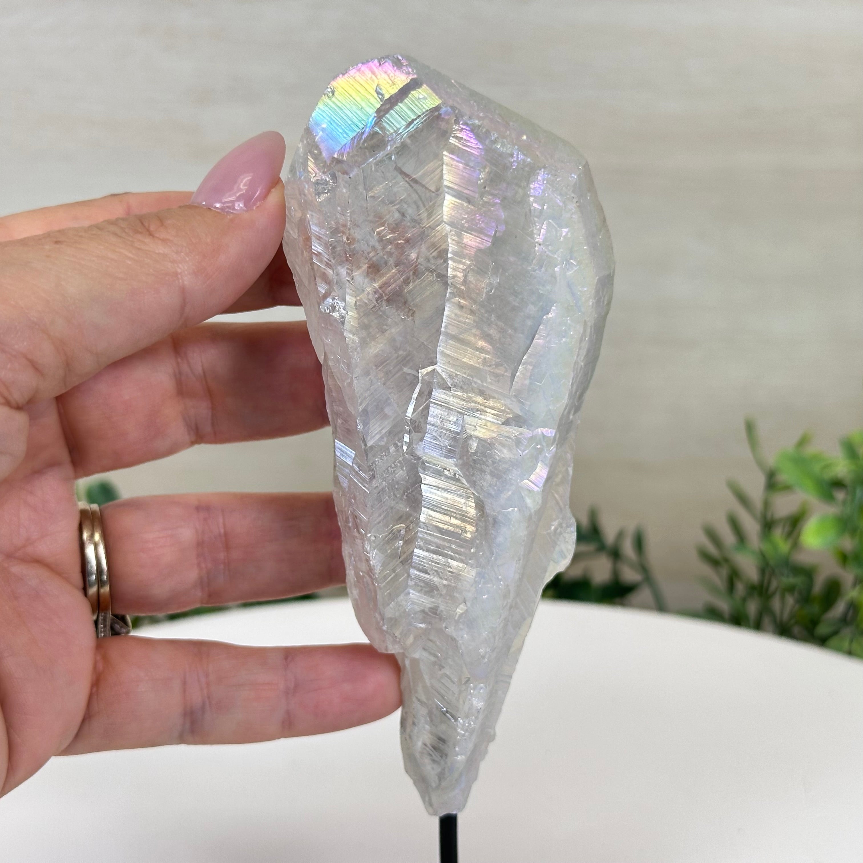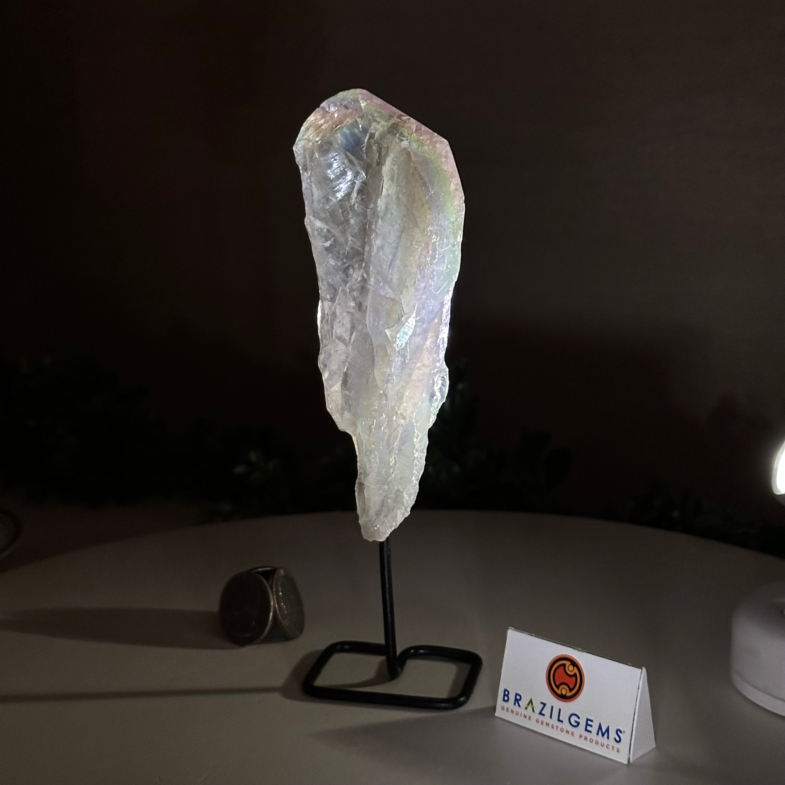 Enhance your home or sacred space with the multi-faceted beauty of this Angel Aura Quartz Point on a metal stand. This iridescent crystal has rough edges and a bright and captivating glow.