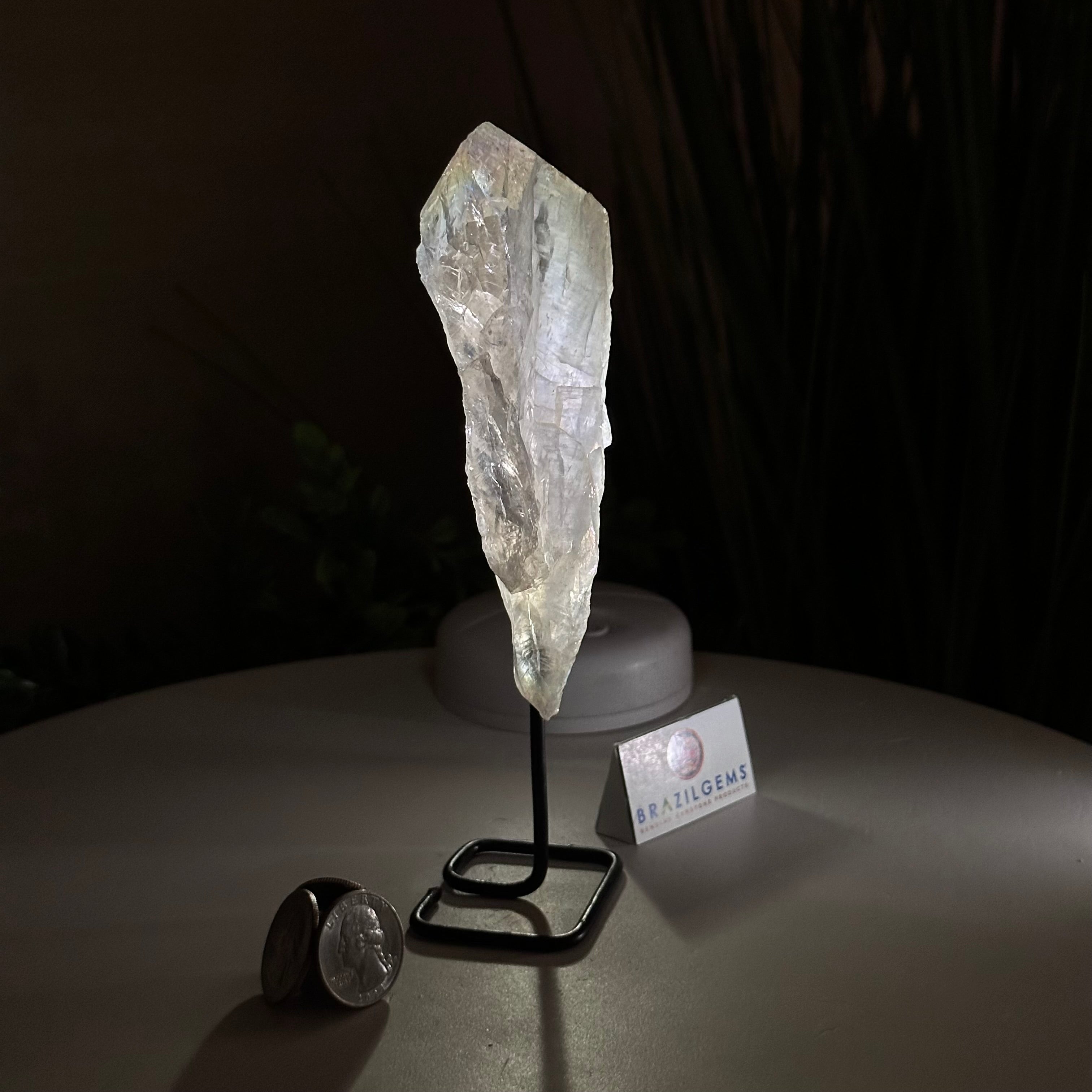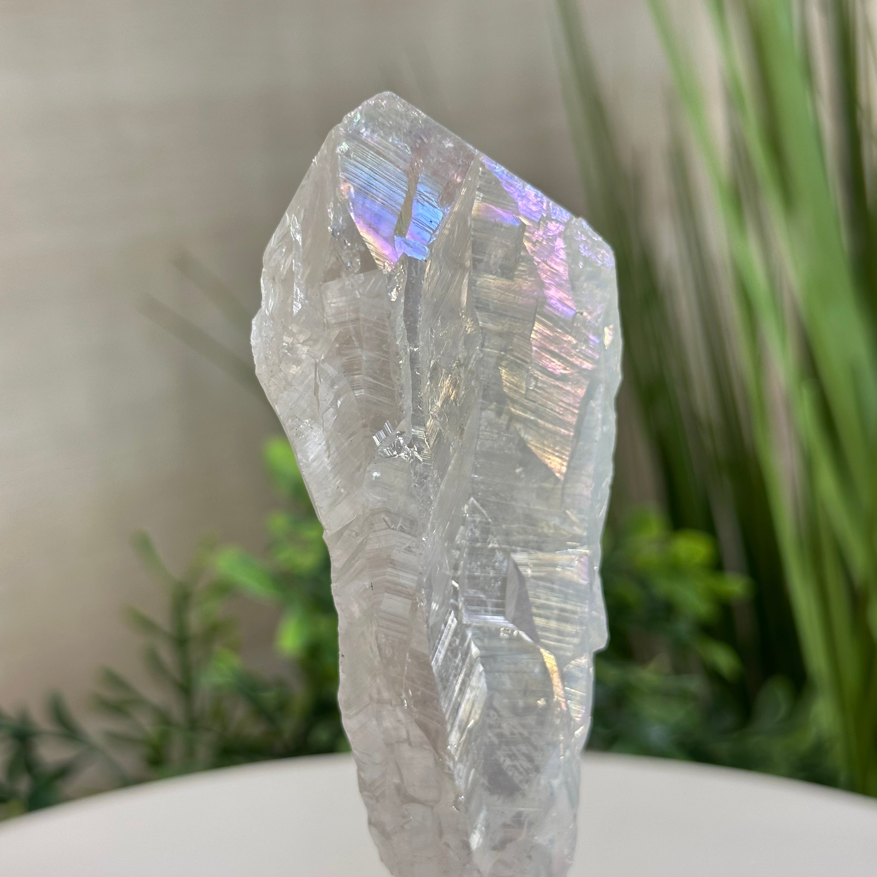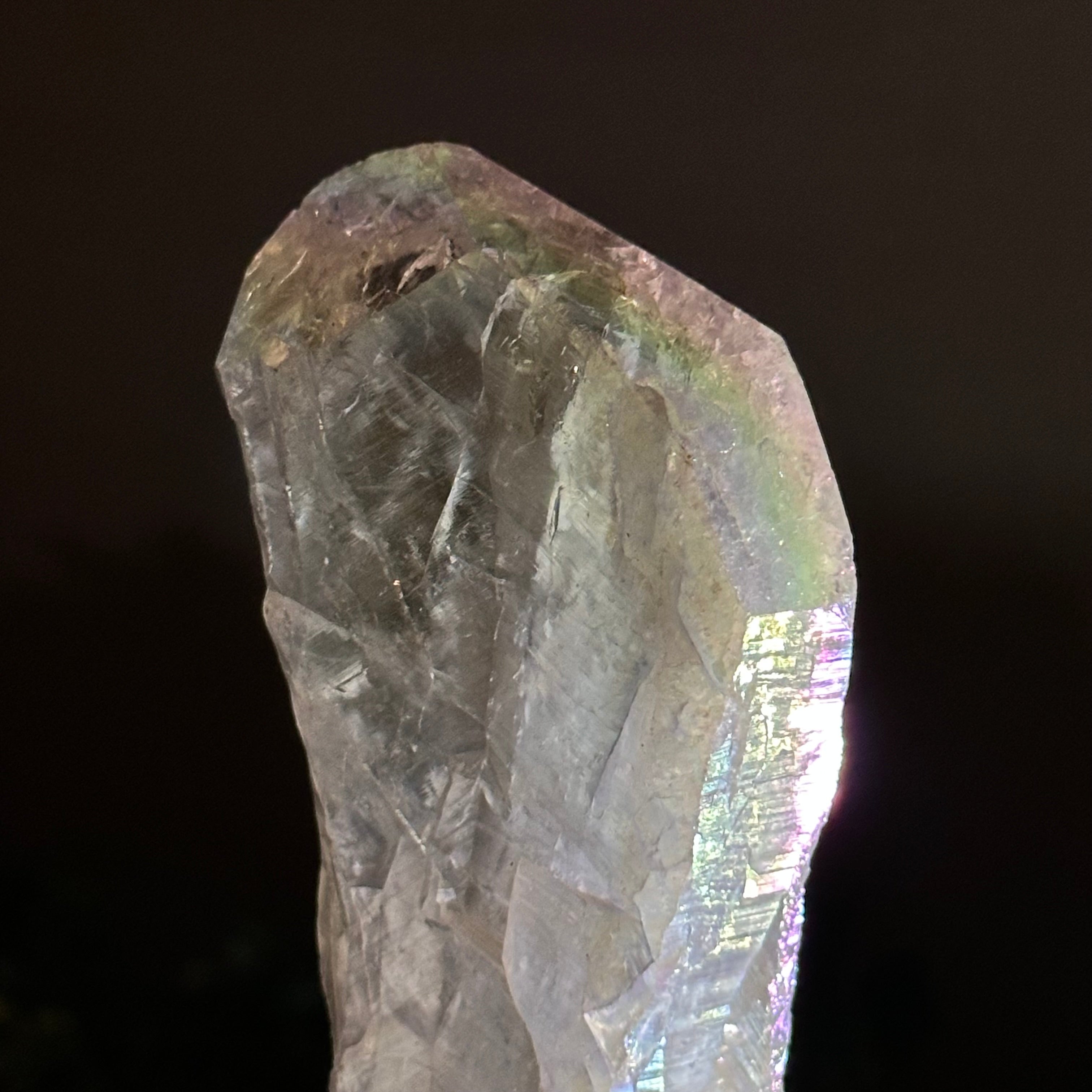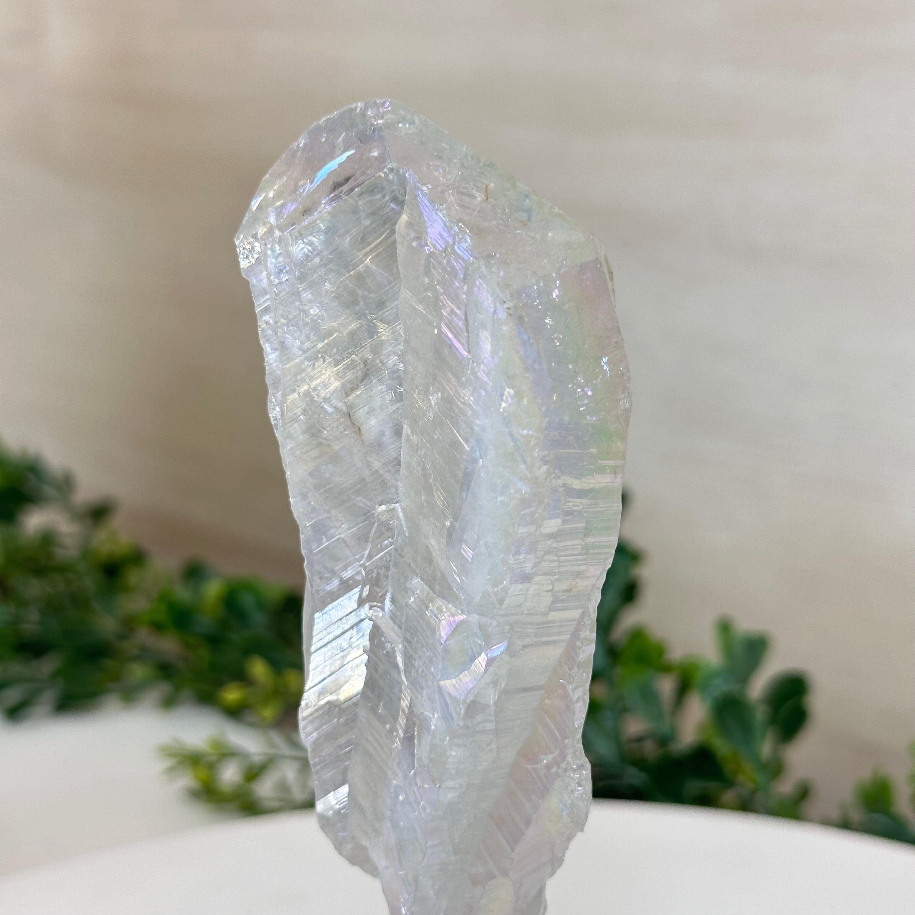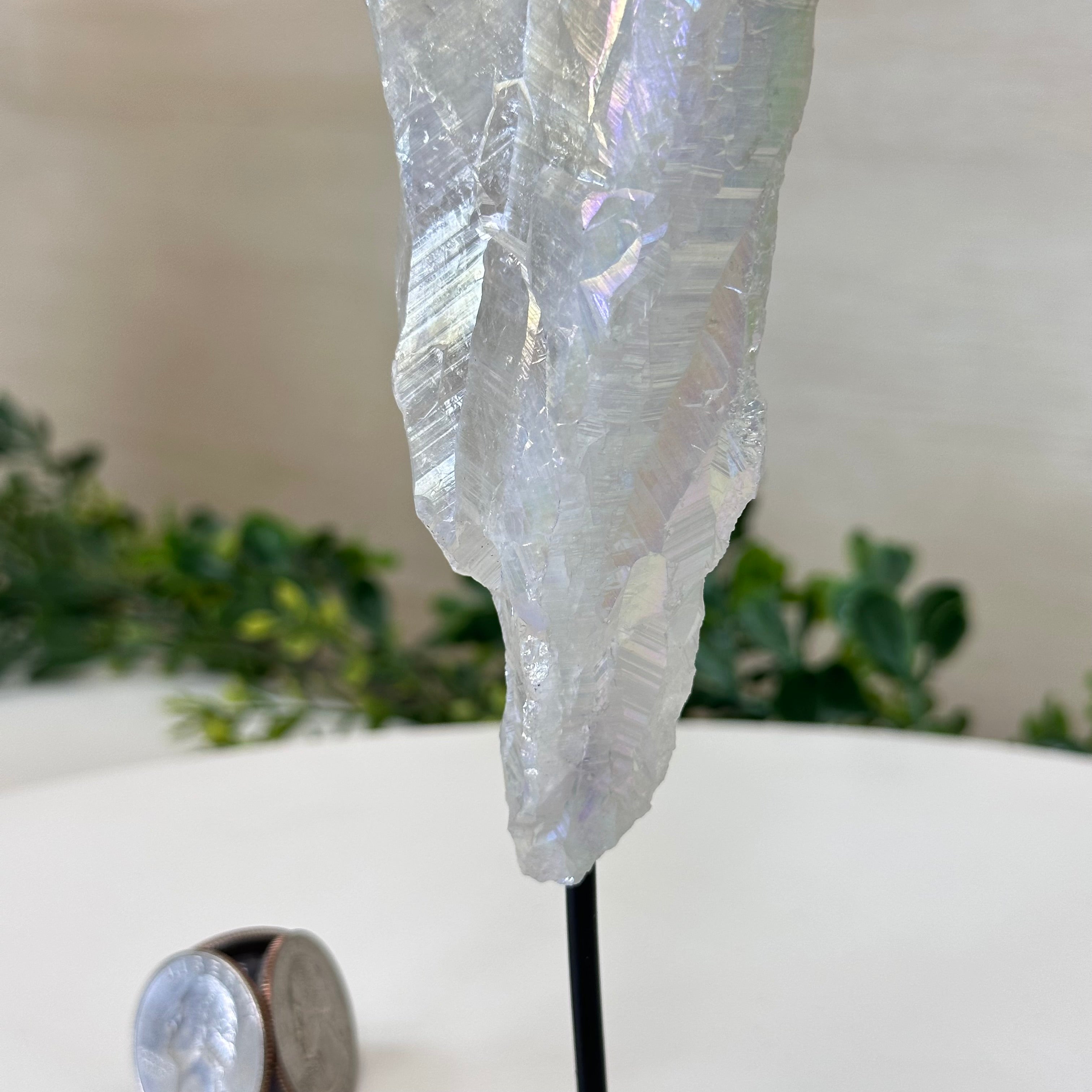 Enhance your home or sacred space with the multi-faceted beauty of this Angel Aura Quartz Point on a metal stand. This iridescent crystal has rough edges and a bright and captivating glow.