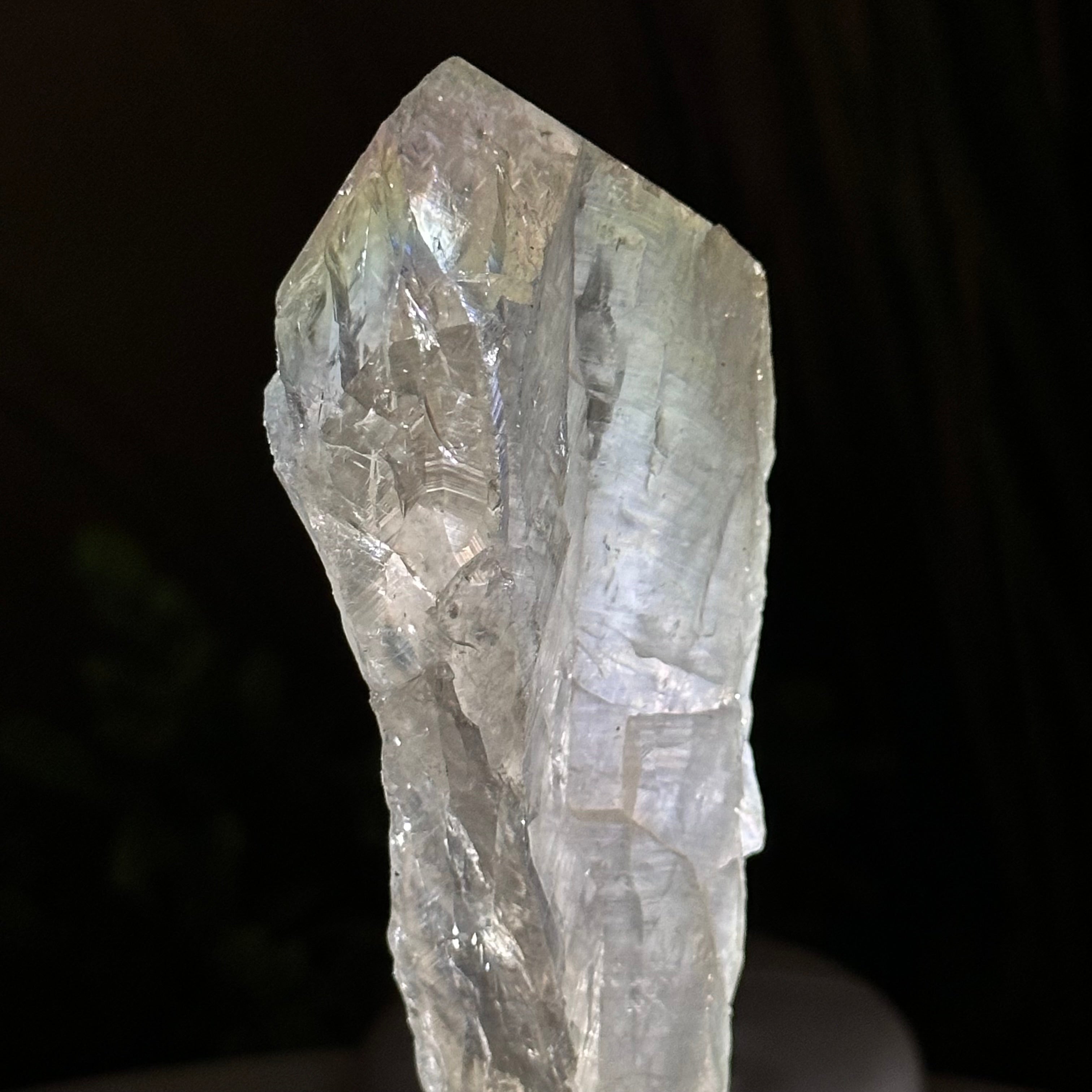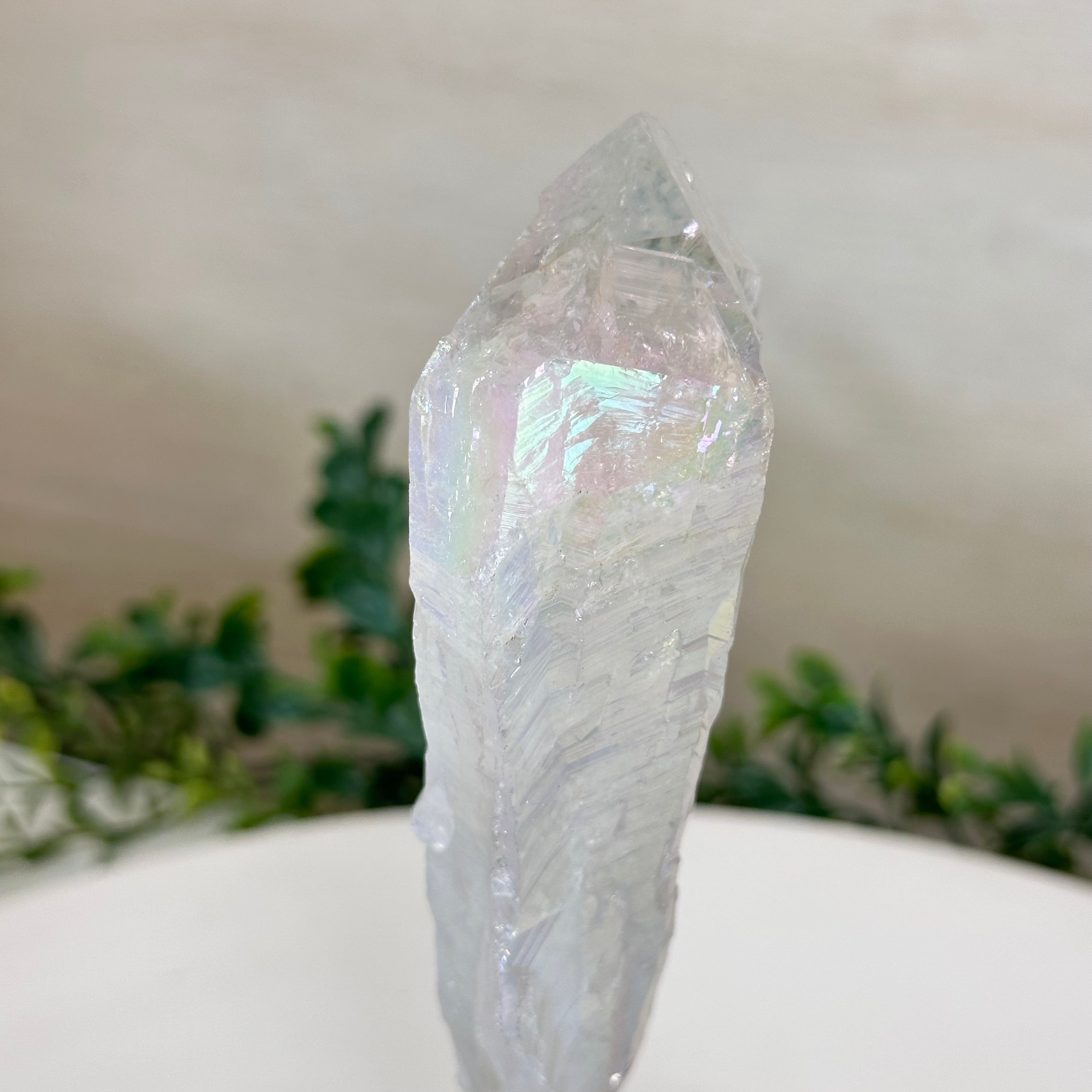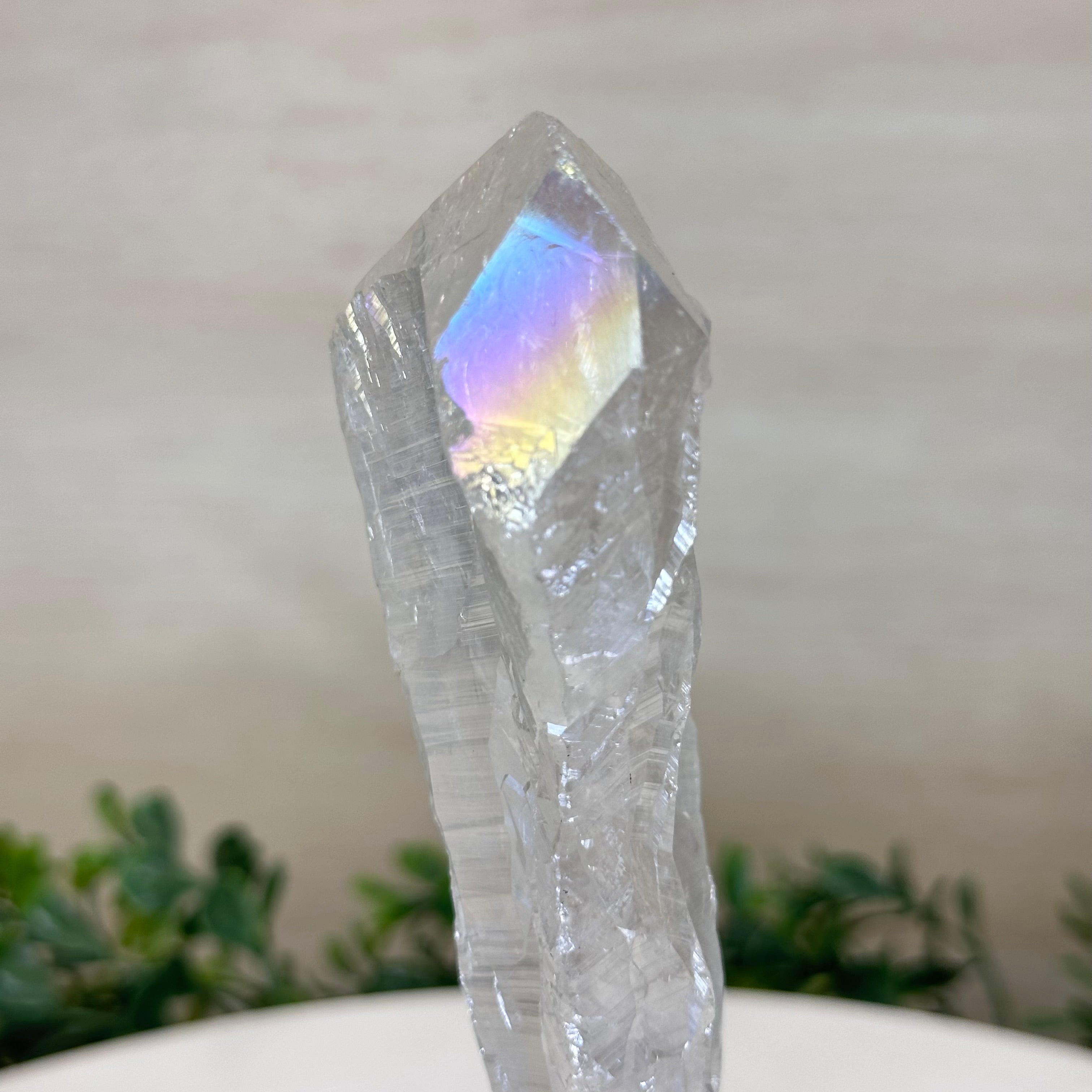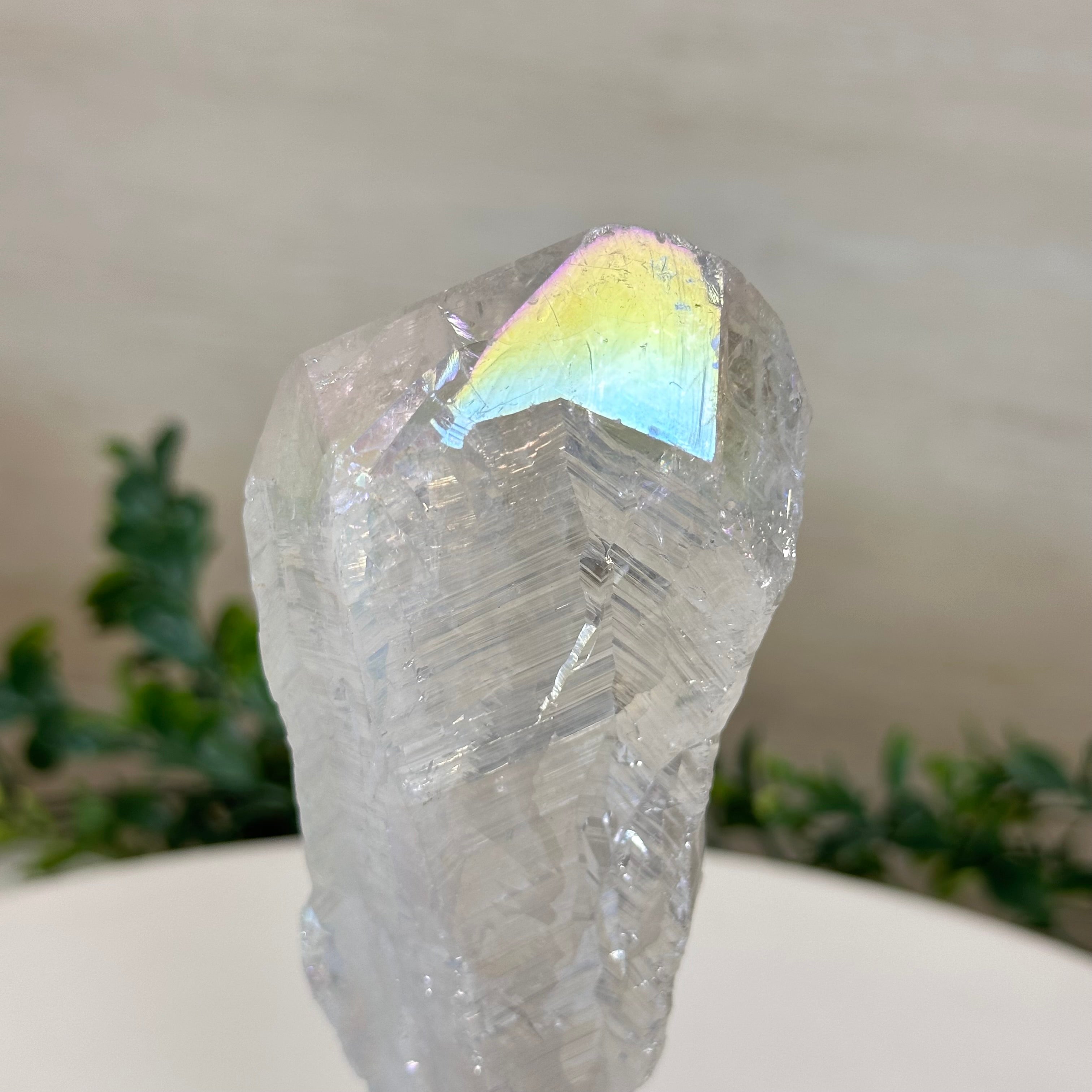 Enhance your home or sacred space with the multi-faceted beauty of this Angel Aura Quartz Point on a metal stand. This iridescent crystal has rough edges and a bright and captivating glow.