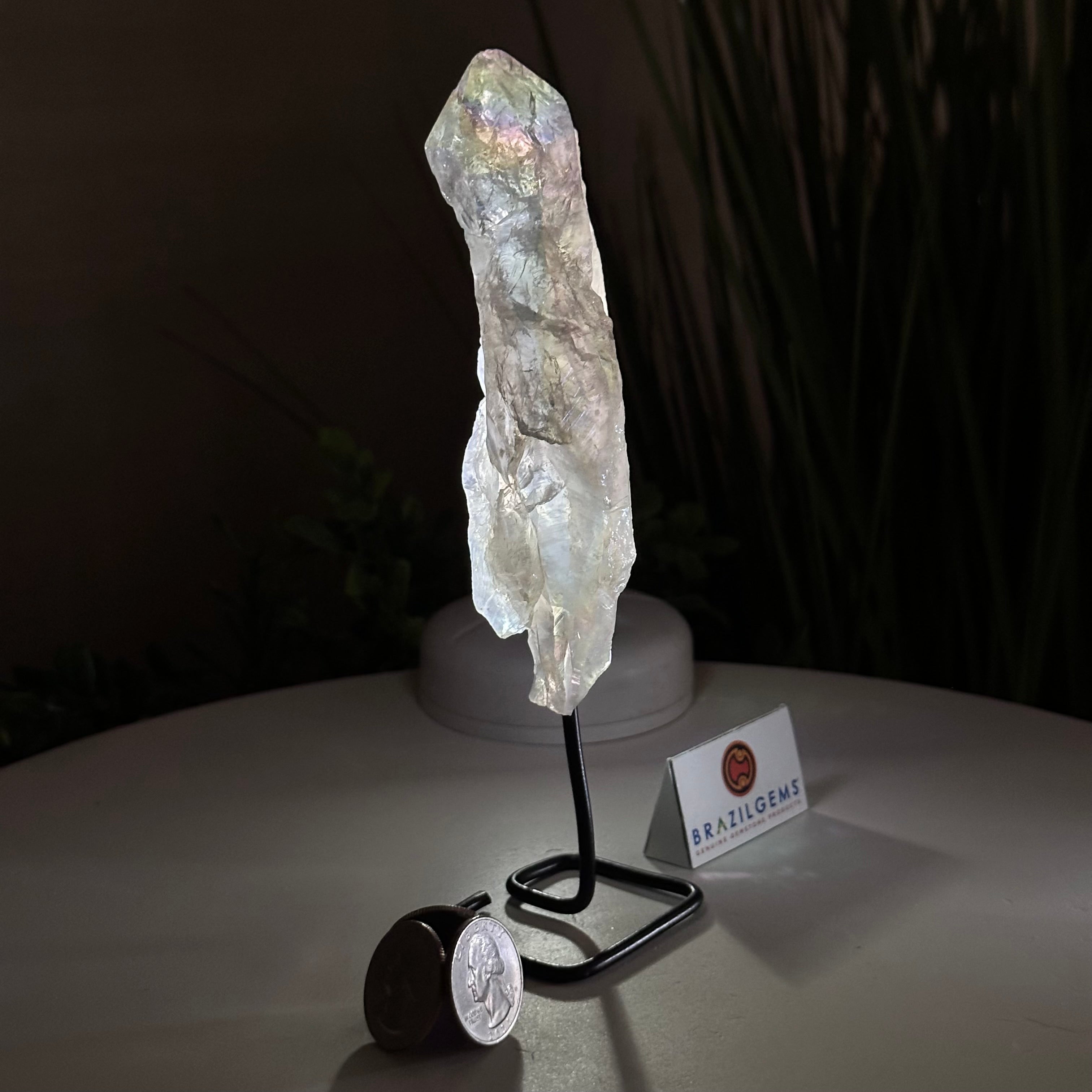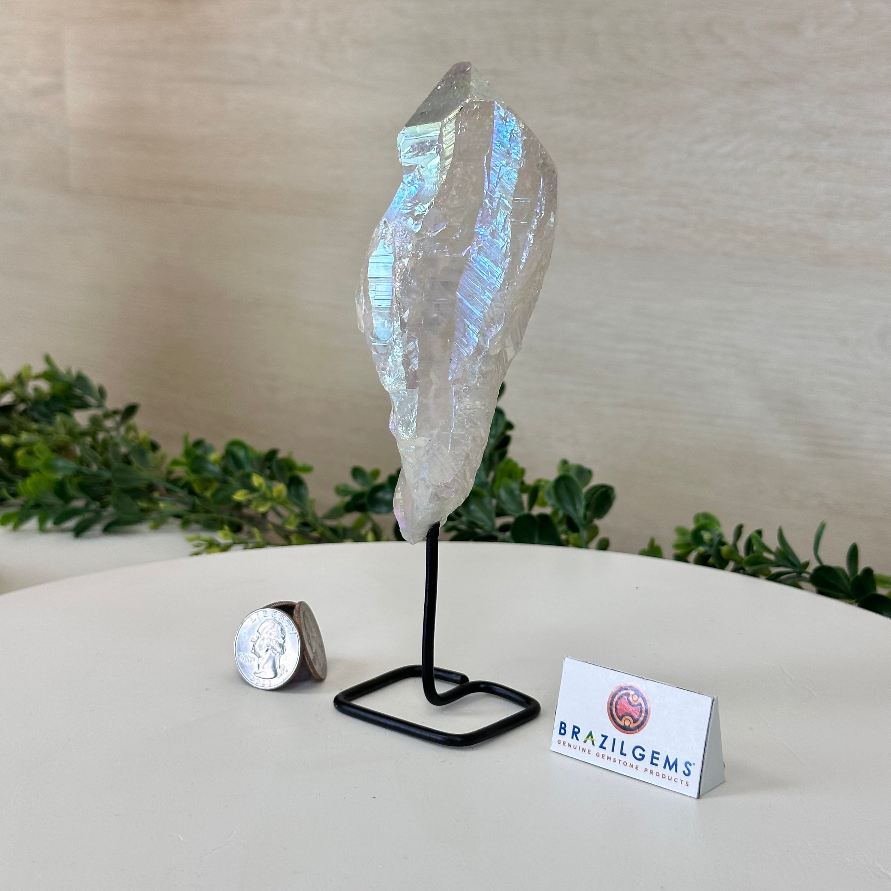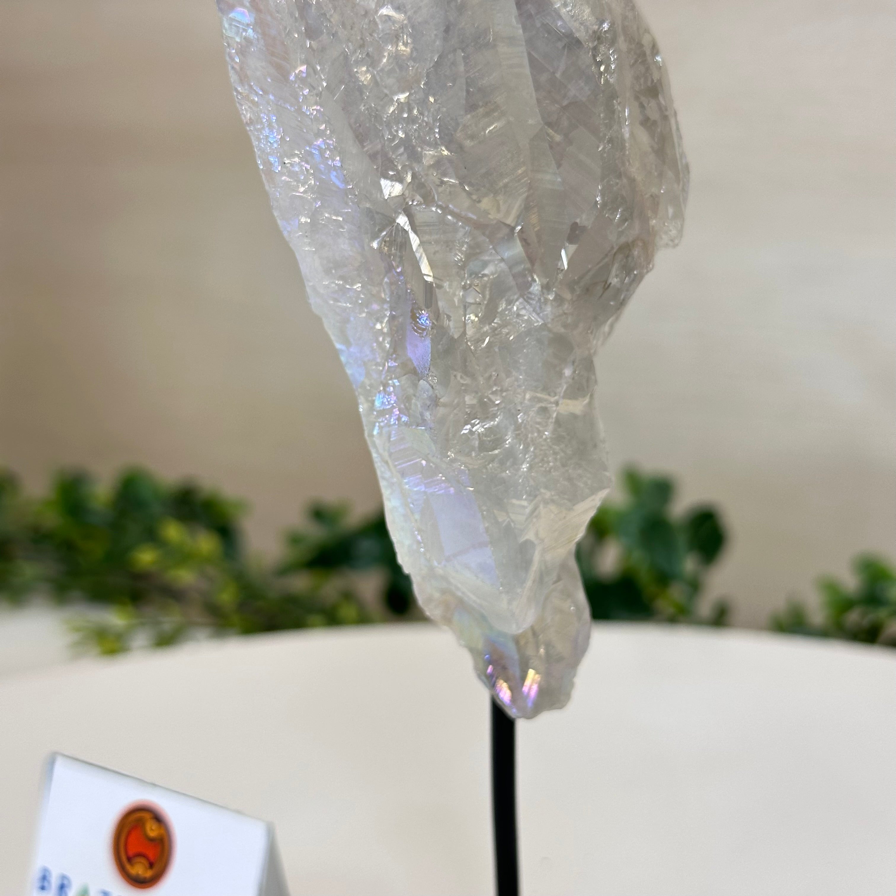 Enhance your home or sacred space with the multi-faceted beauty of this Angel Aura Quartz Point on a metal stand. This iridescent crystal has rough edges and a bright and captivating glow.