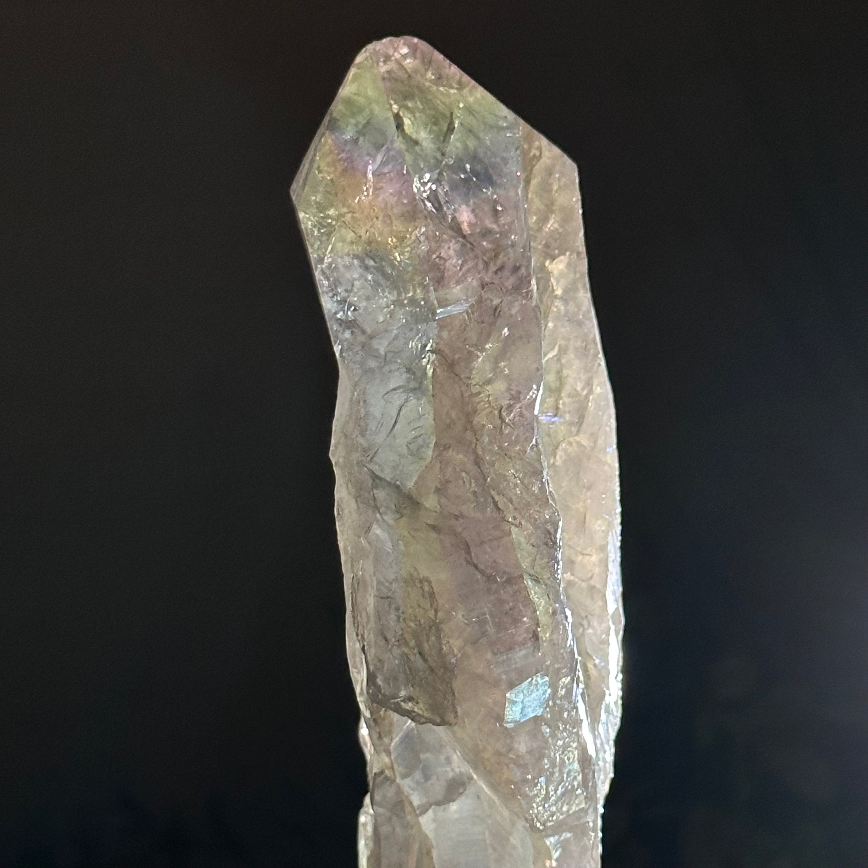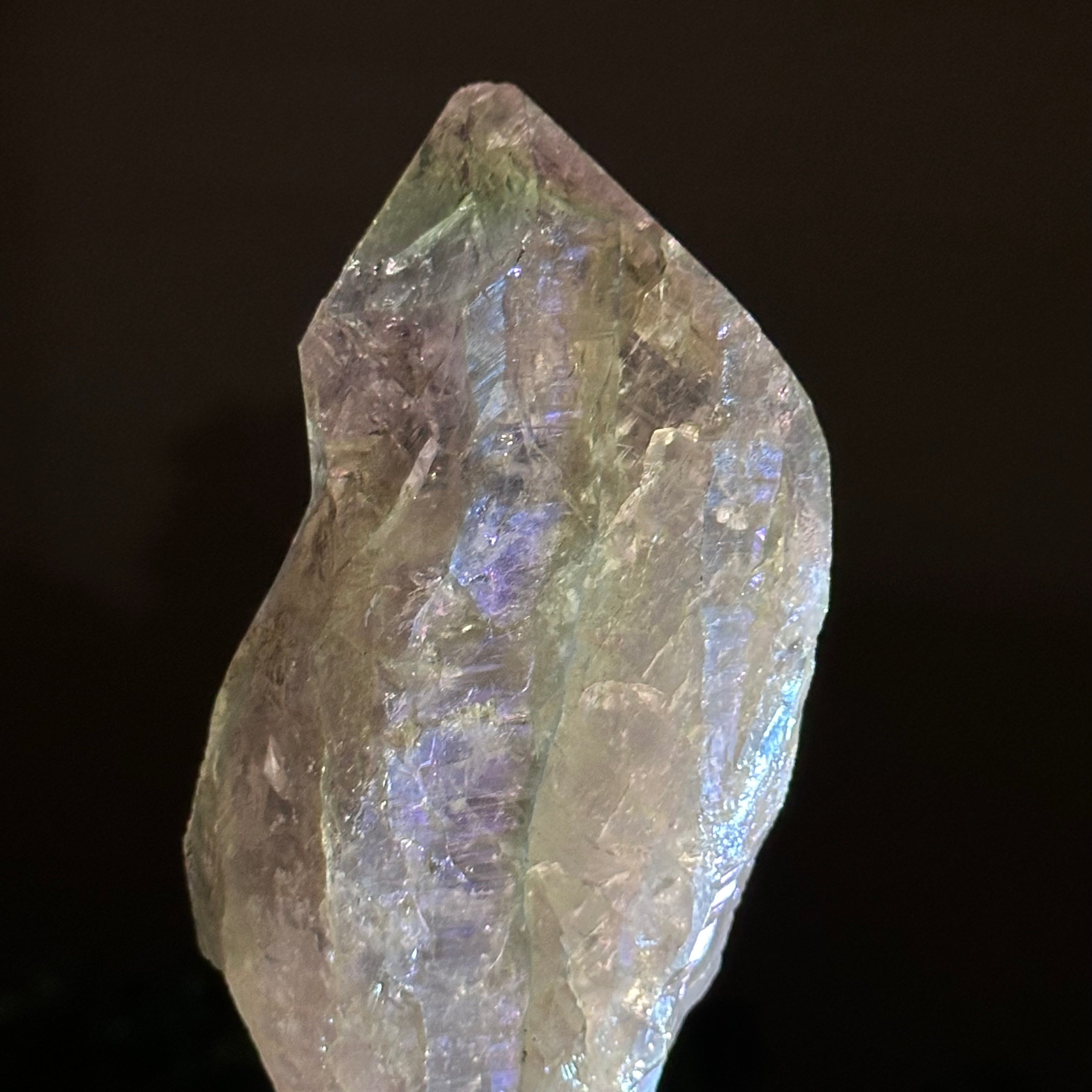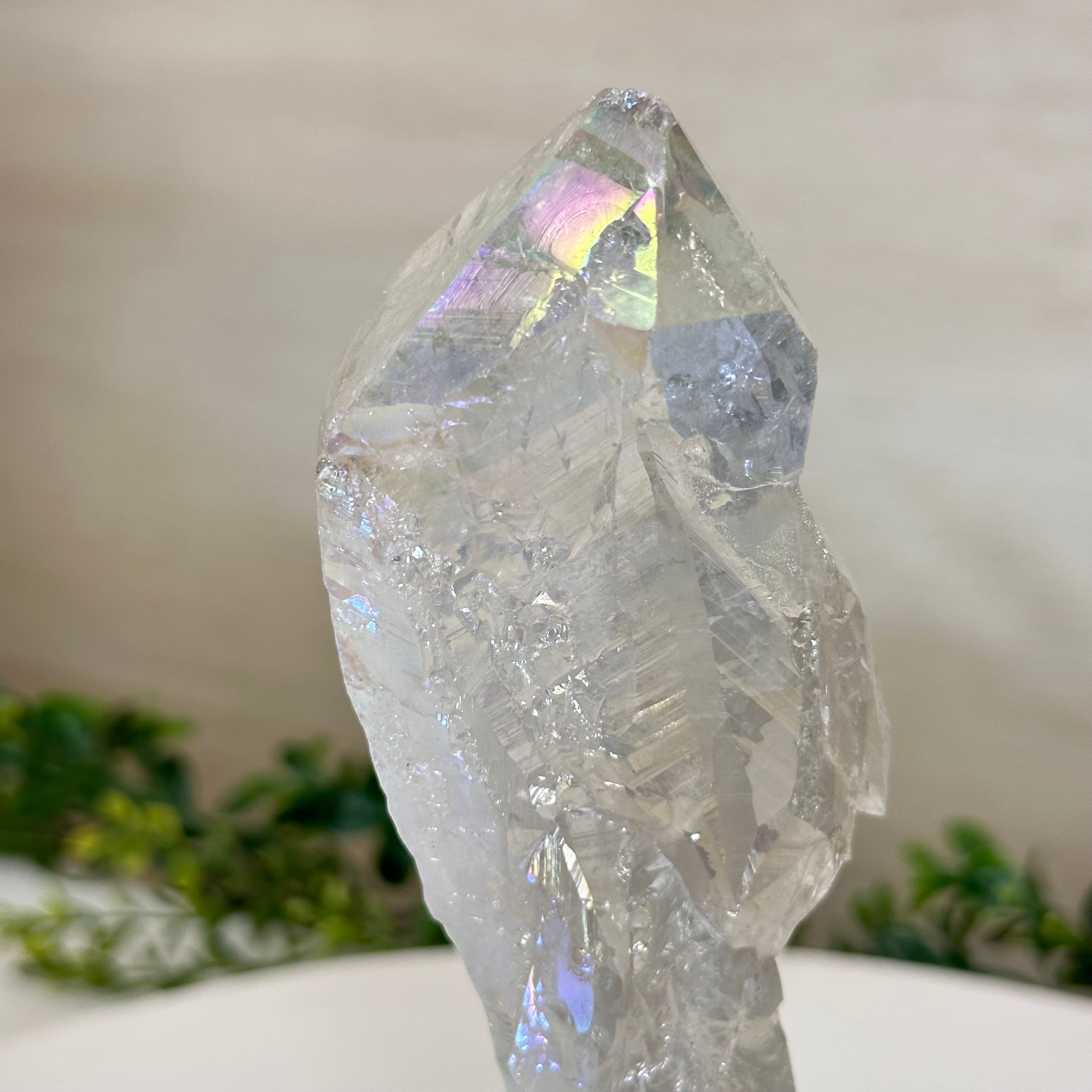 Enhance your home or sacred space with the multi-faceted beauty of this Angel Aura Quartz Point on a metal stand. This iridescent crystal has rough edges and a bright and captivating glow.